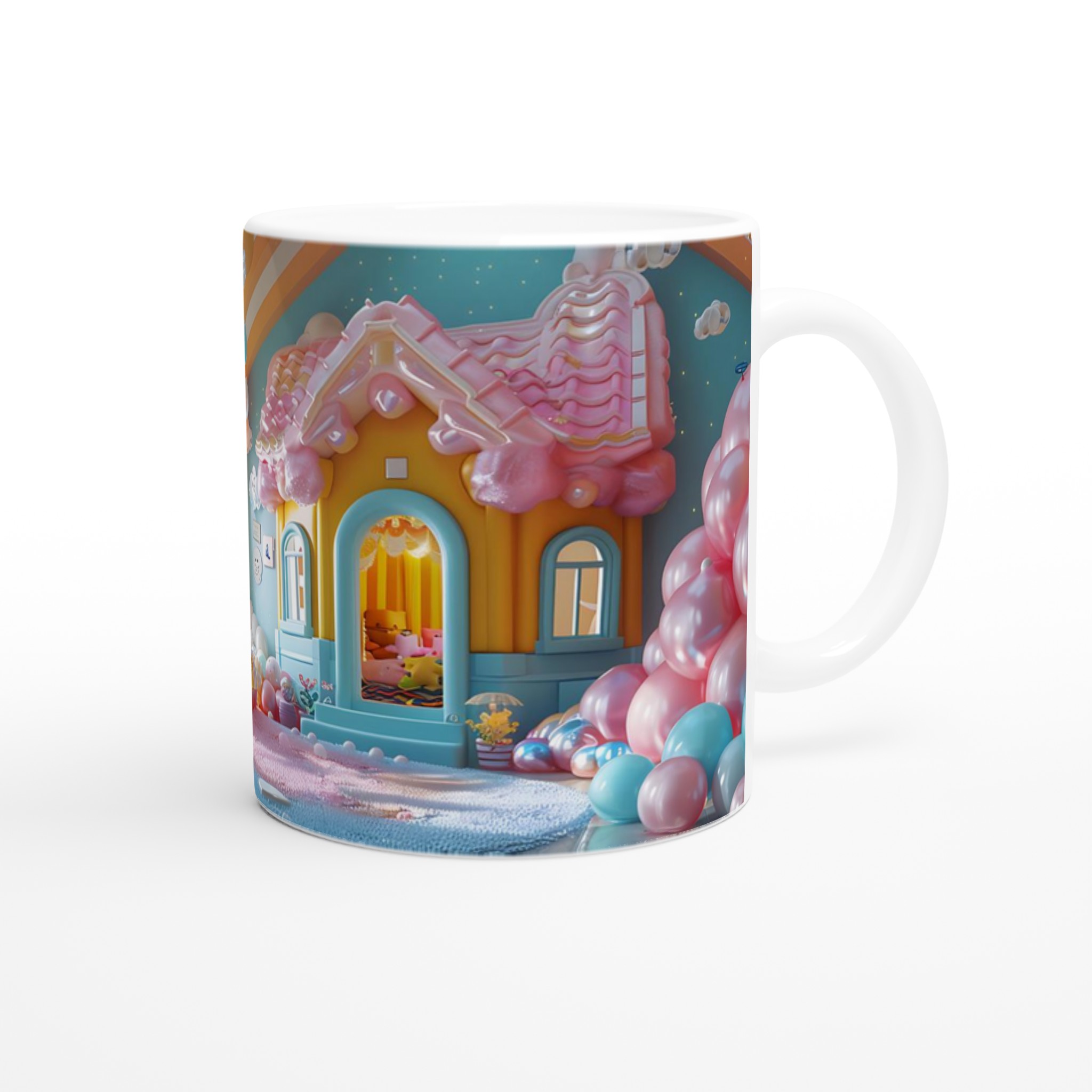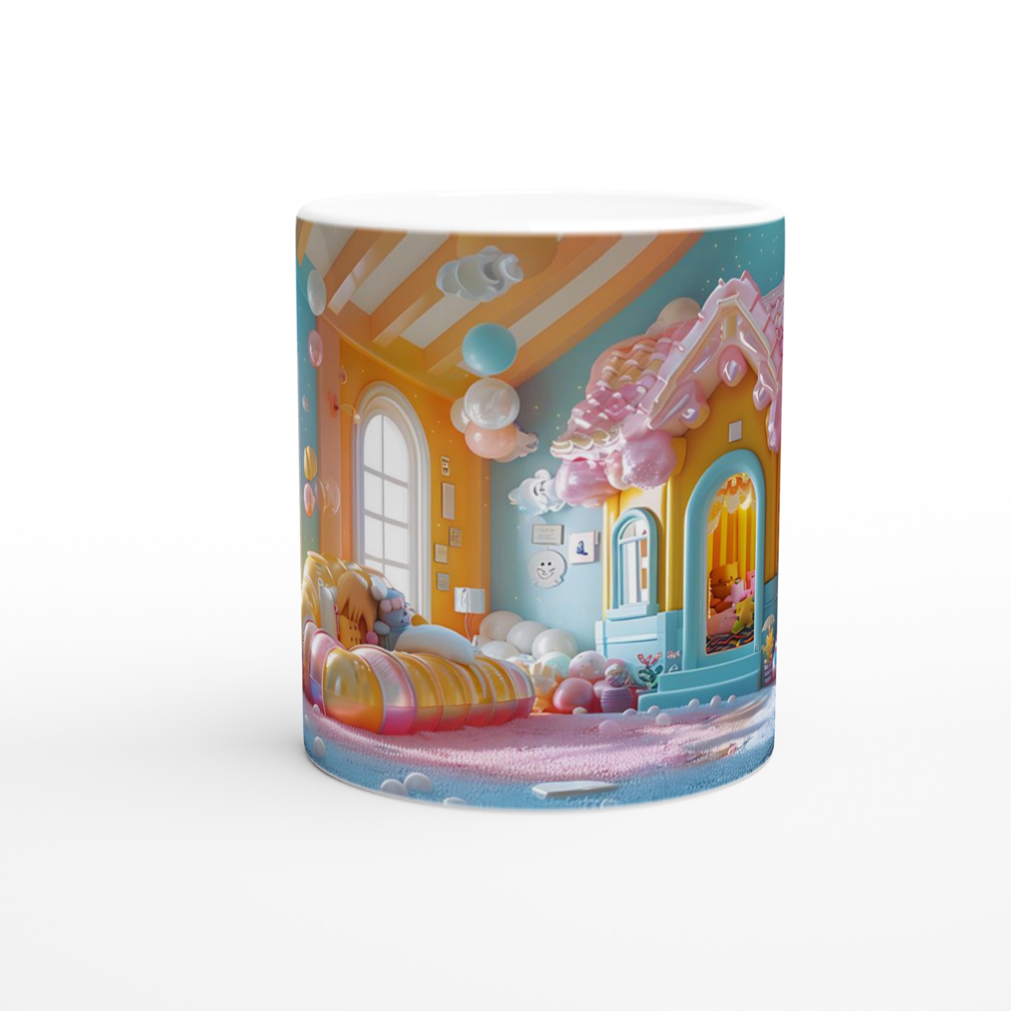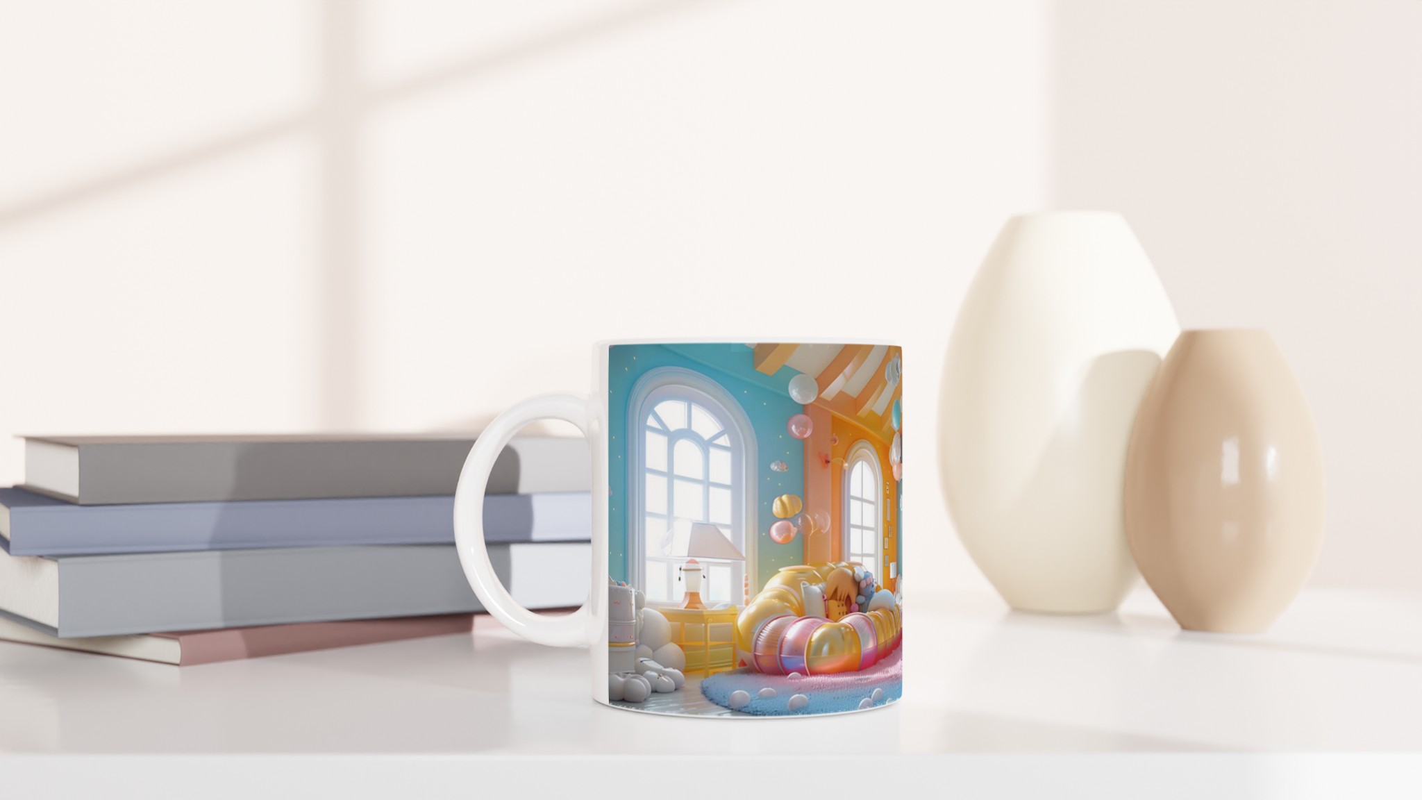 Stig in i en värld av pastellfärgad magi med vår charmiga 11oz keramiska mugg, inspirerad av fantasifulla lekrum och drömmiga färger. Denna stilrena och vackra keramikmugg är perfekt för alla dagens stunder – morgonkaffet, en värmande kopp te eller en härlig varm choklad. Den blanka ytan gör att trycken framträder klart och färgstarkt, vilket gör muggen till en riktig favorit i vardagen. Varje klunk blir en liten flykt till en värld av lugn och glädje, precis som att vistas i ett rum fyllt av mjuka ballonger och fluffiga moln.