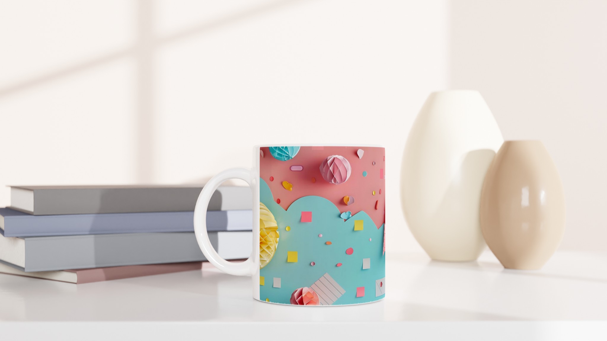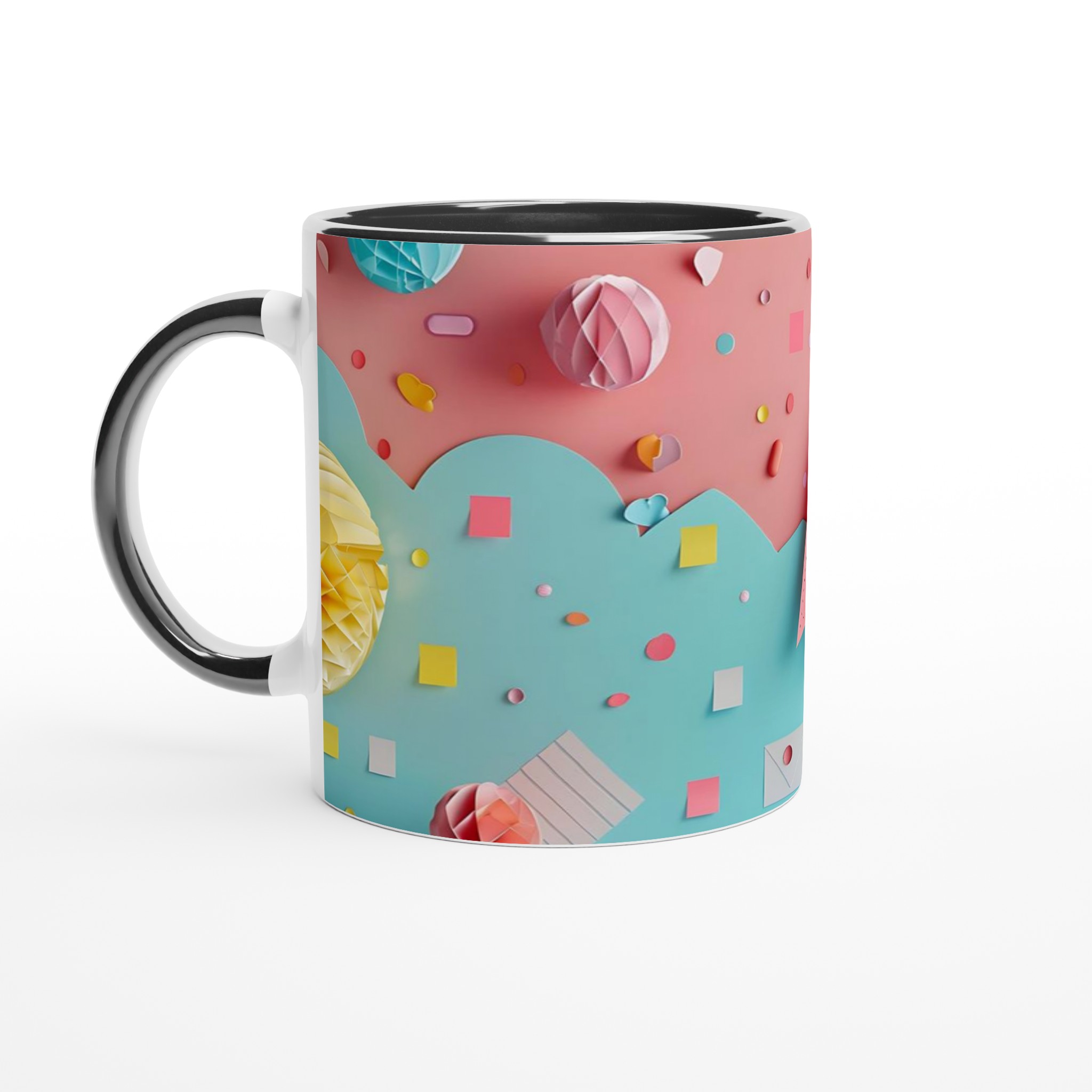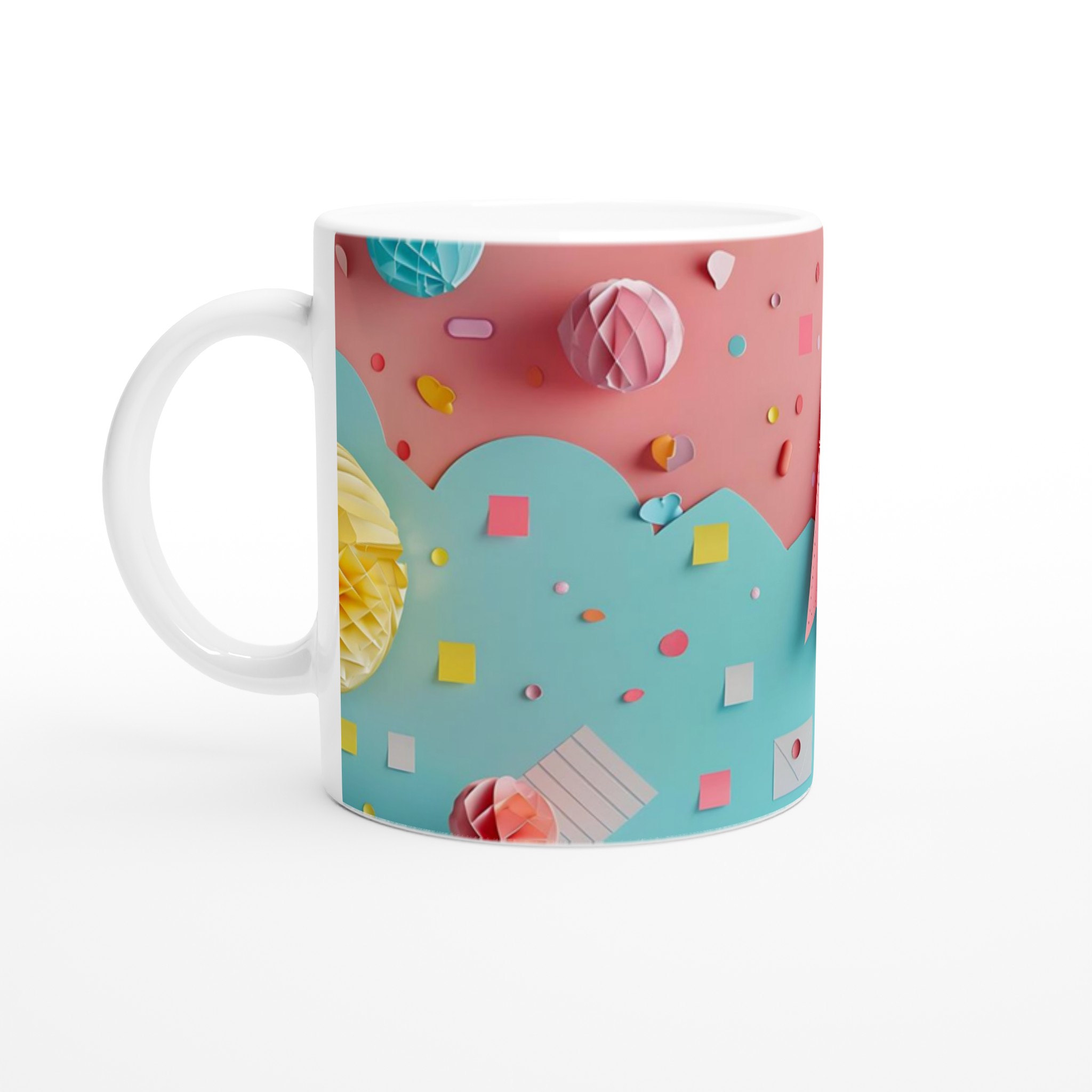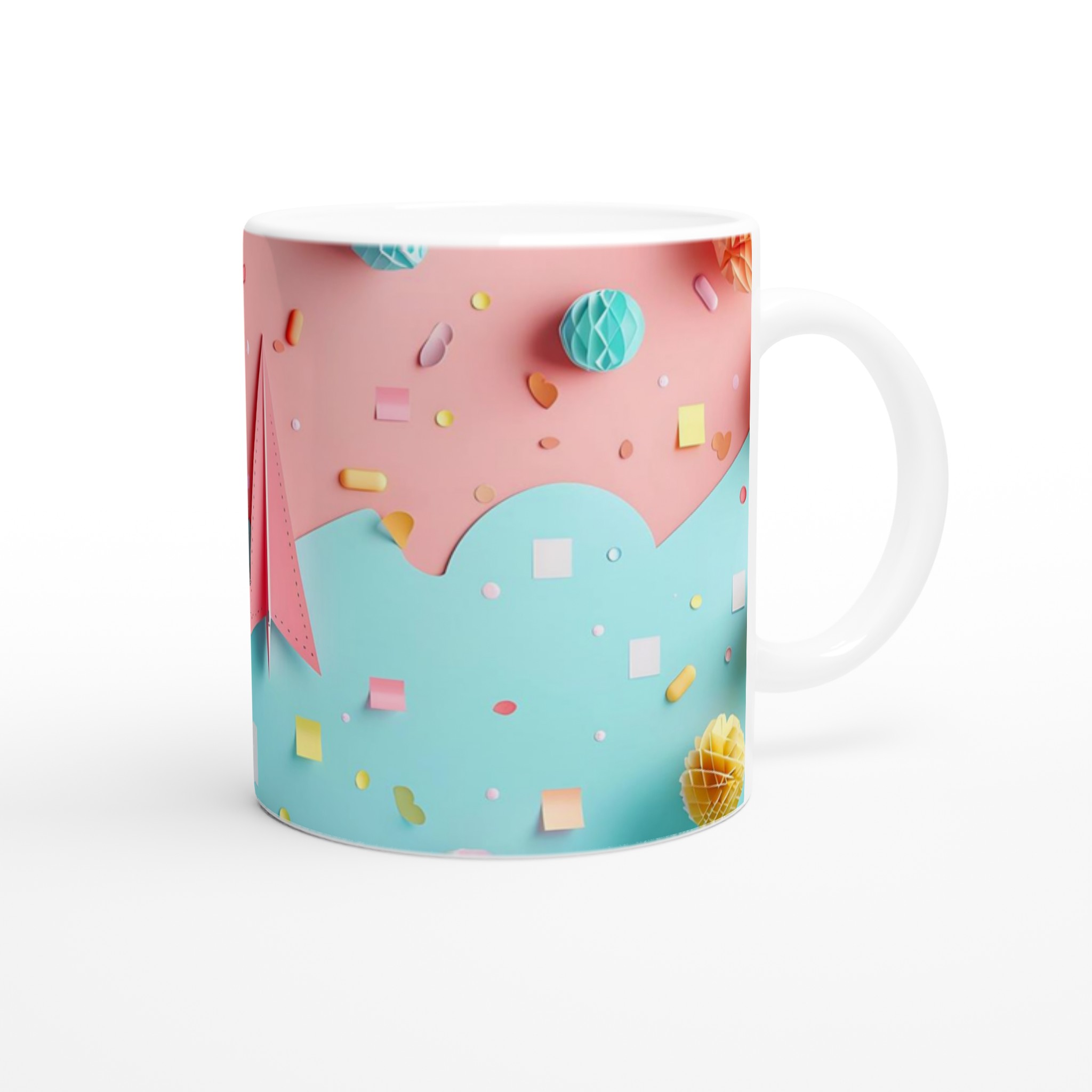 Lyft din fikastund med denna underbara keramiska mugg, inspirerad av lekfulla pastellfärger och glada former. Denna mugg är mer än bara en kopp – den är en daglig påminnelse om glädje och lättsamhet, perfekt för ditt morgonkaffe, en mysig kvälls-choklad eller när du bara vill njuta av en kopp te i en glad förpackning. Den blanka vita ytan gör att trycken framhävs med klara och levande färger, som håller sig fina även efter många turer i mikron och diskmaskinen.