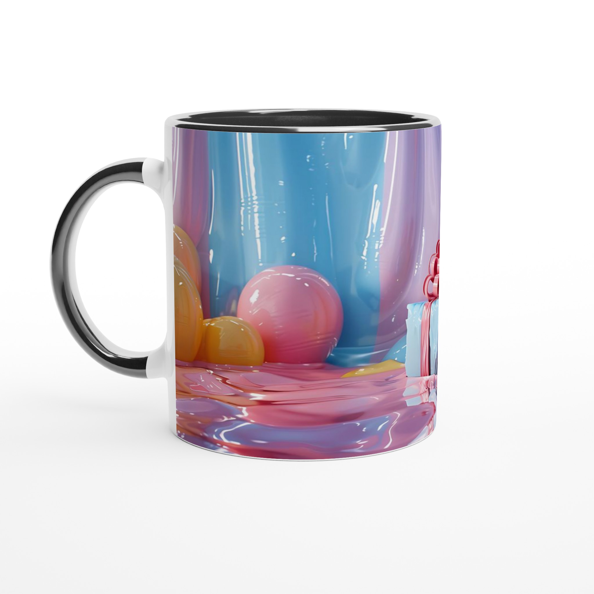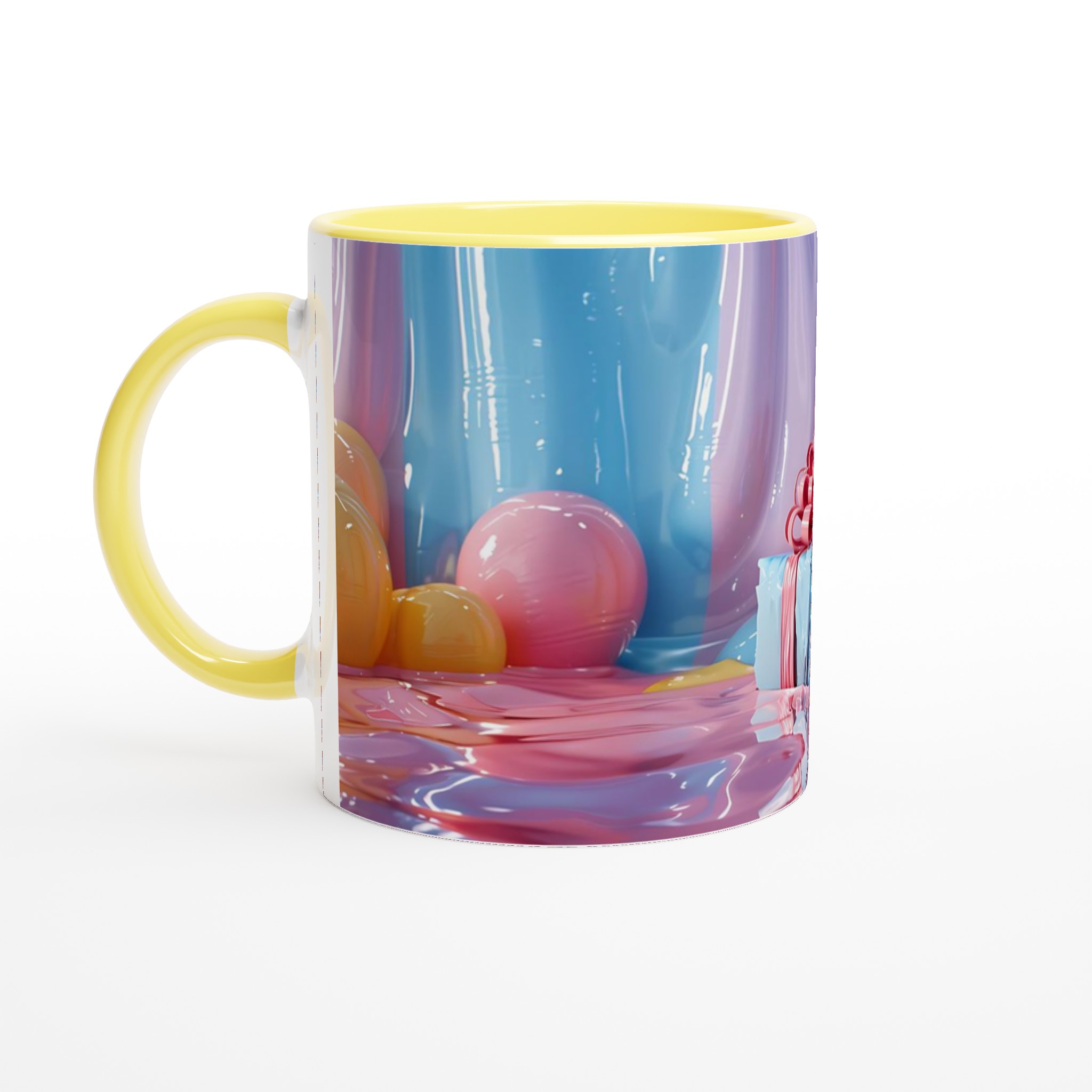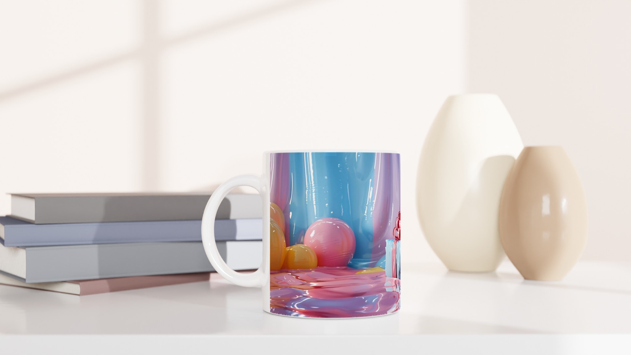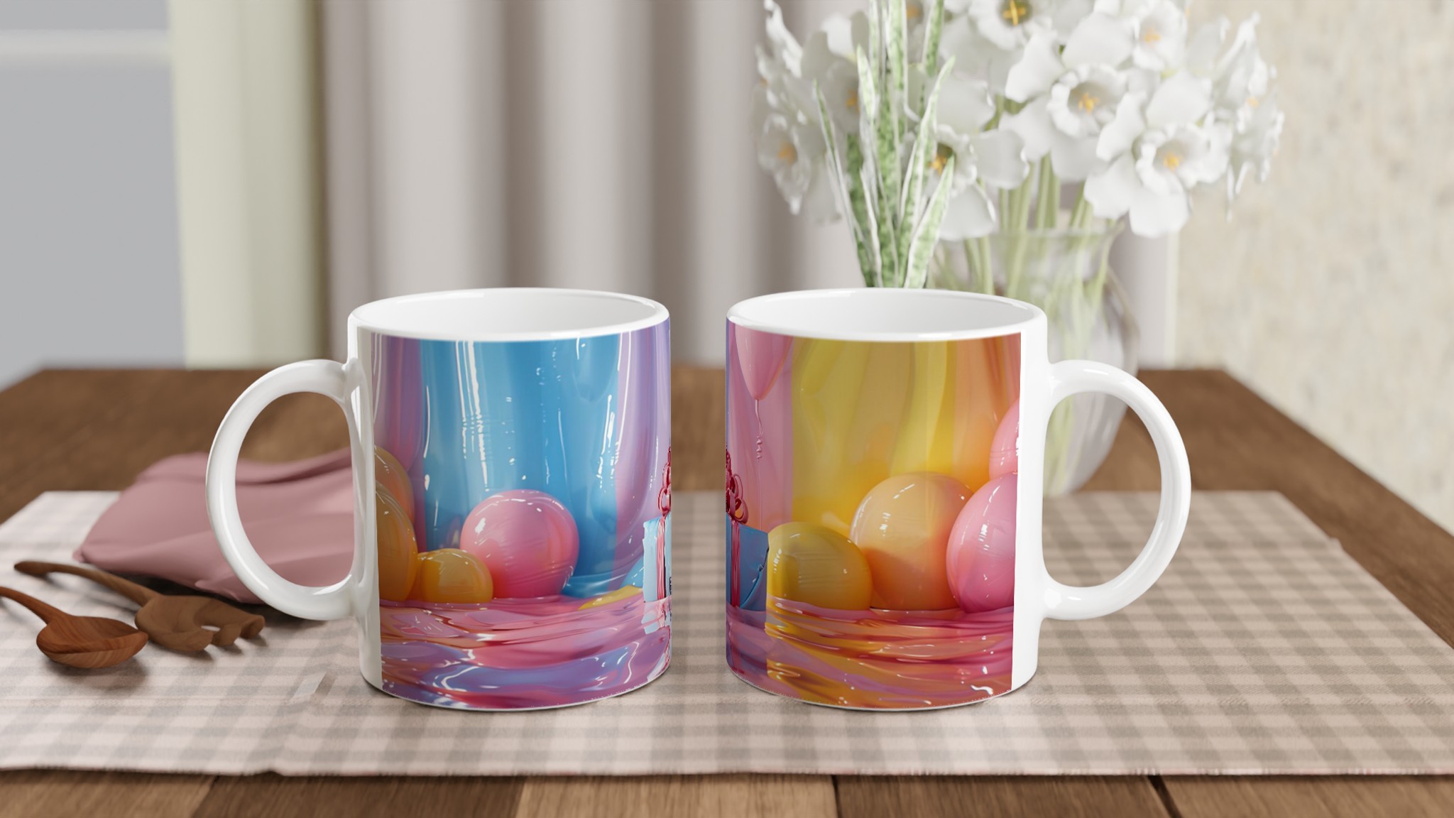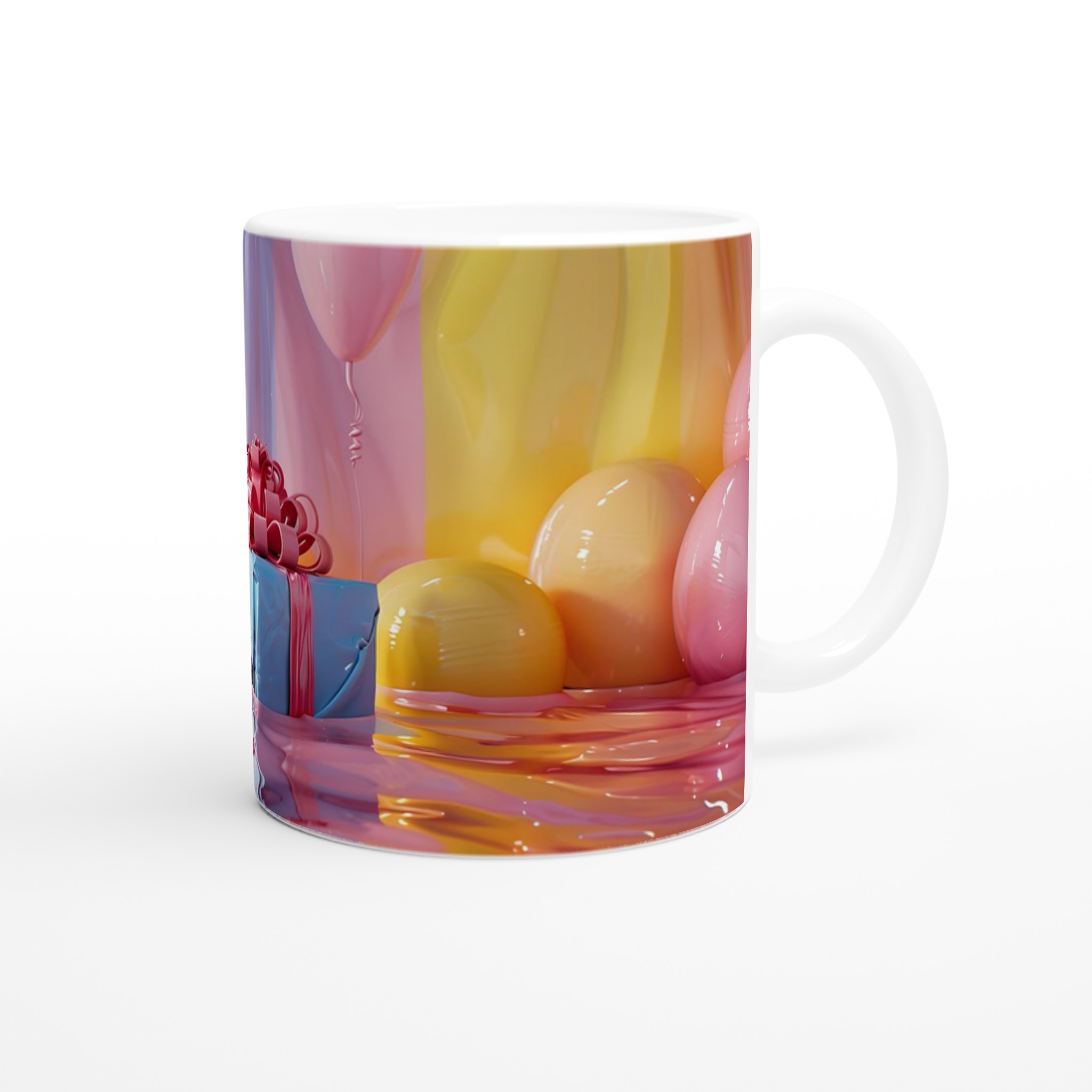 Fånga dagens ljusaste stunder med denna förtrollande keramiska mugg, inspirerad av bildens drömska pastellpalett. Den blir snabbt en vardagsfavorit, perfekt för morgonkaffet, kvällens varma choklad eller när du bara vill njuta av en kopp te. Den blanka ytan får dina tryck att framhävas med klara och levande färger som håller sig fina även efter många turer i mikron och diskmaskinen, precis som de glänsande godbitarna i bilden.