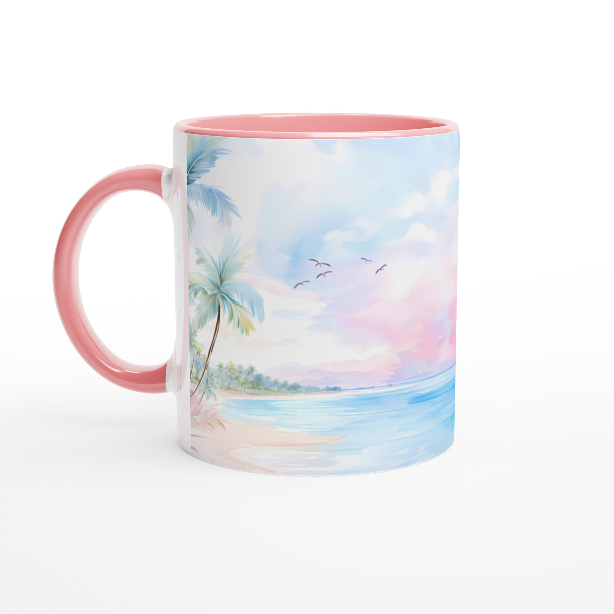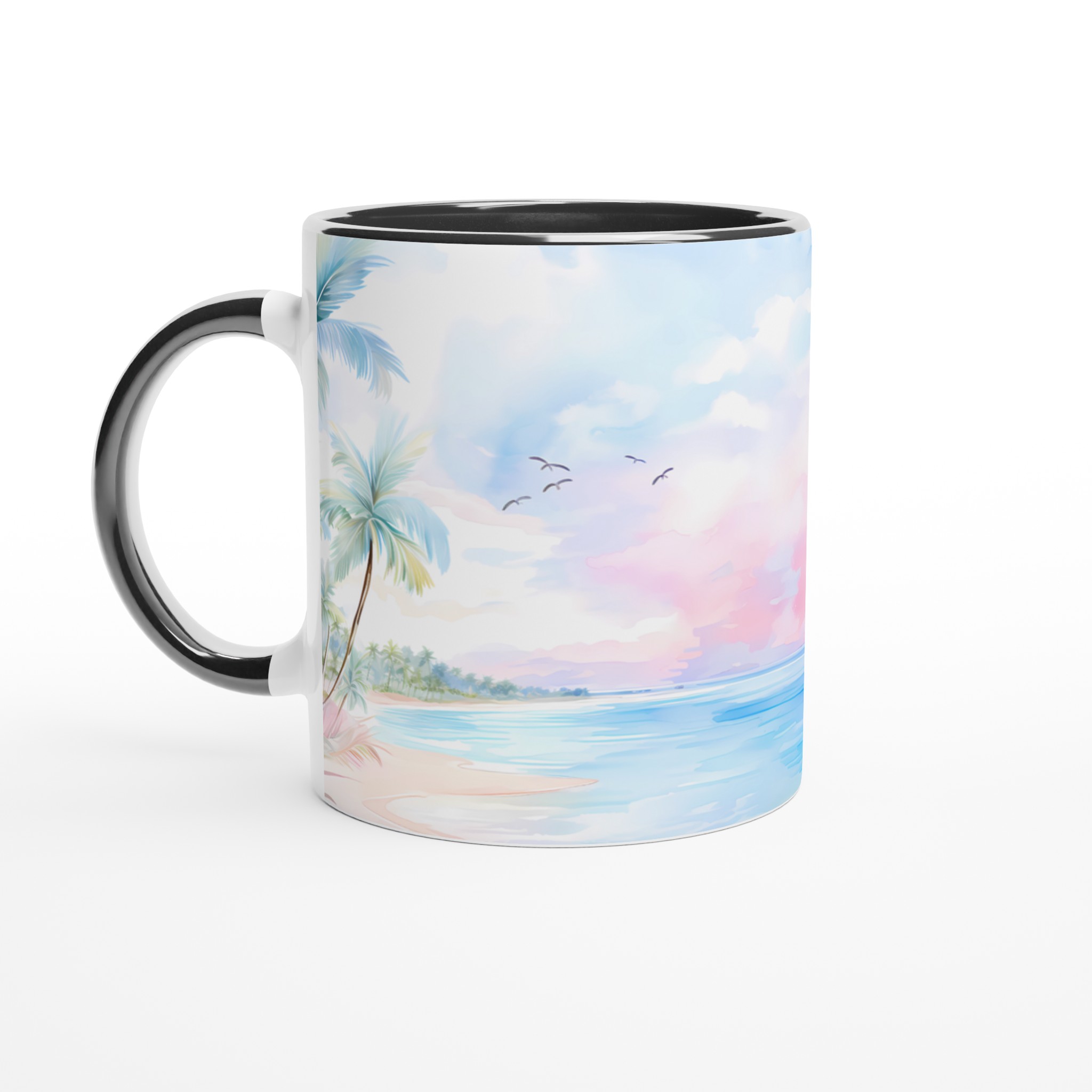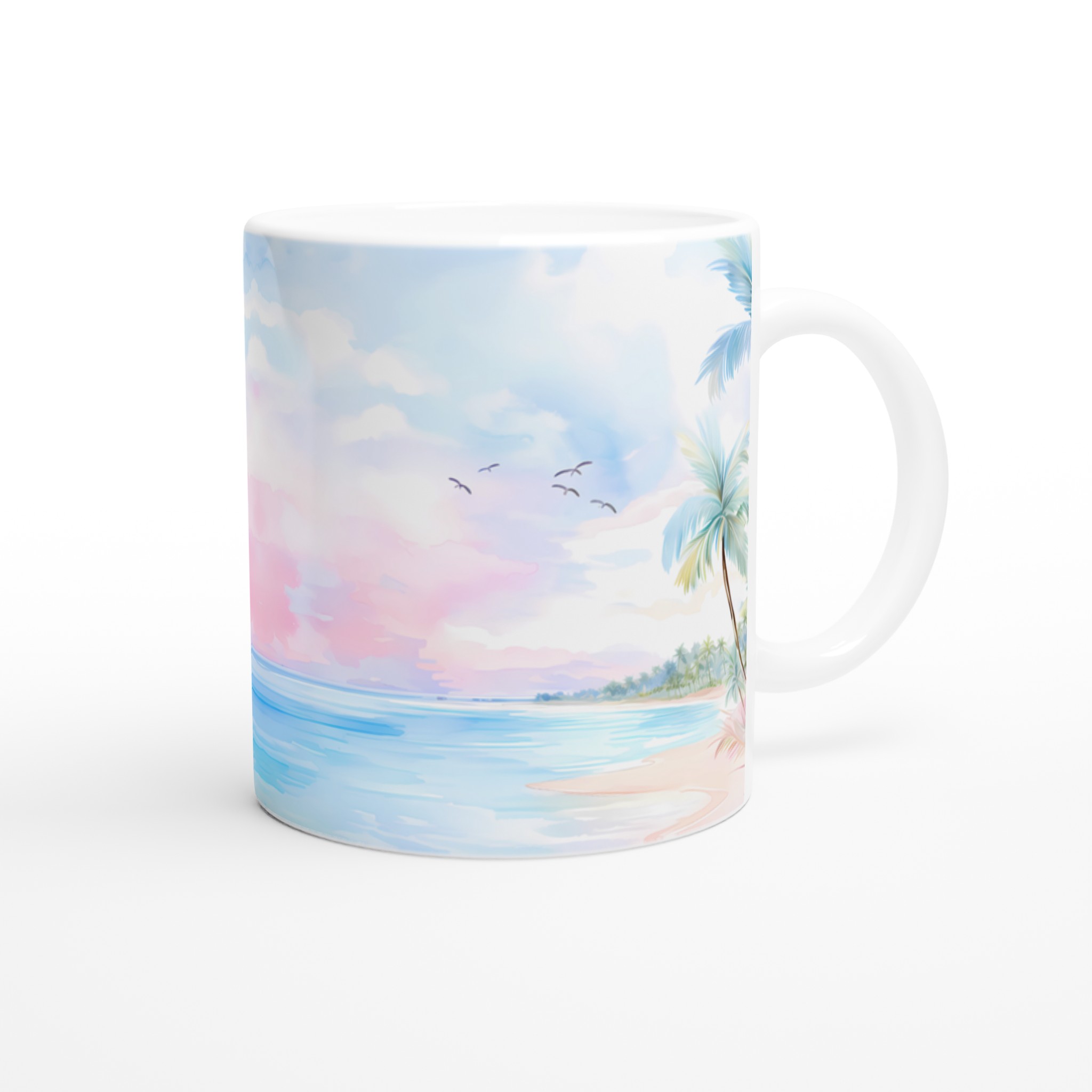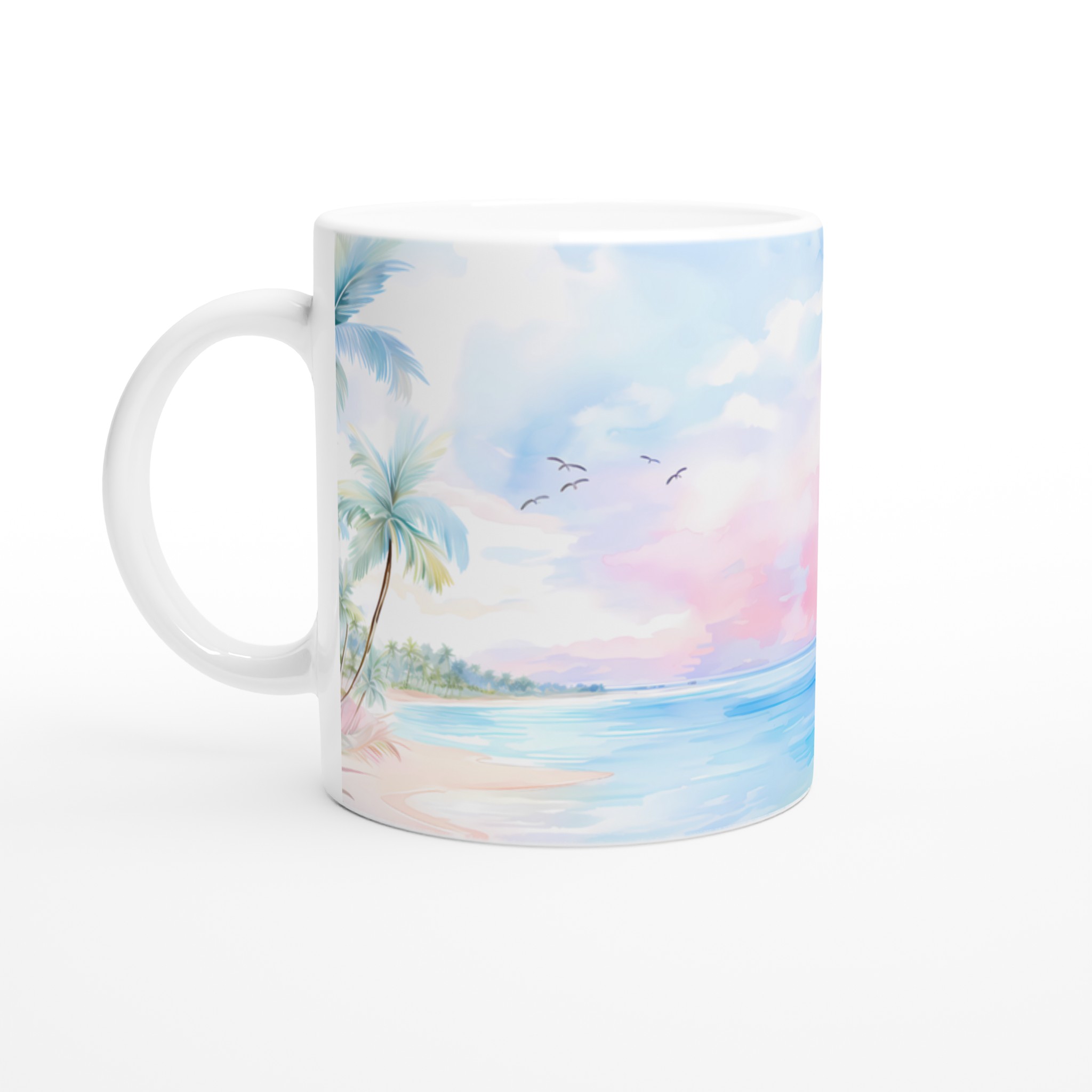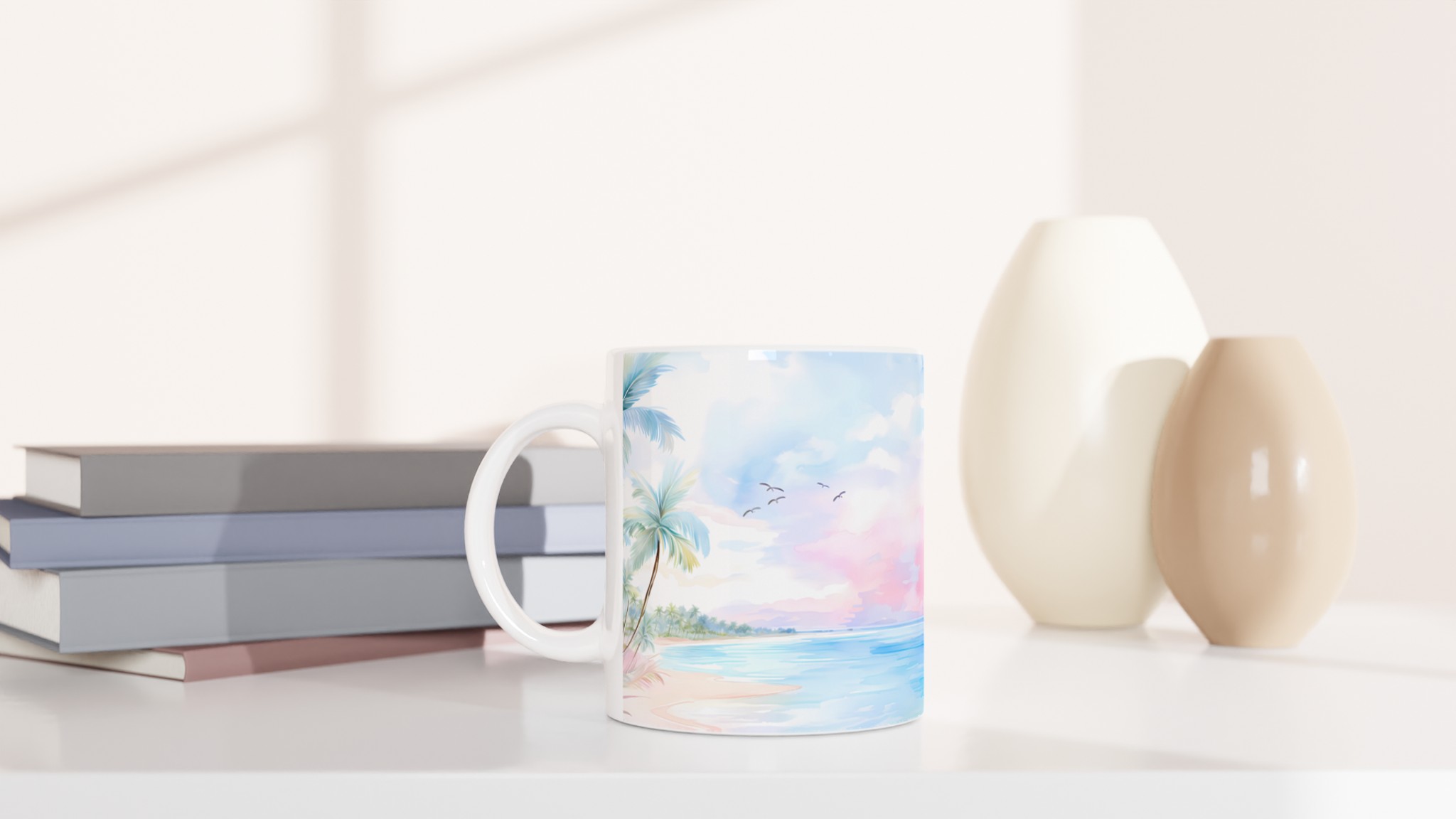 Föreställ dig en lugn stund vid havet varje gång du tar en klunk. Denna underbara keramiska mugg fångar den fridfulla skönheten av en tropisk solnedgång, med mjuka pastellfärger som smälter samman i en drömlik akvarellstil. Palmer ramar in en lugn strand med skimrande rosa och blåa nyanser på himlen, vilket skapar en avkopplande atmosfär perfekt för dina dagliga ritualer. Den blir snabbt en favorit, oavsett om det är för morgonkaffet, kvällens varma choklad eller när du bara vill njuta av en kopp te. Den blanka vita ytan ser till att trycken framhävs med klara och levande färger, som håller sig fina även efter många turer i mikron och diskmaskinen.