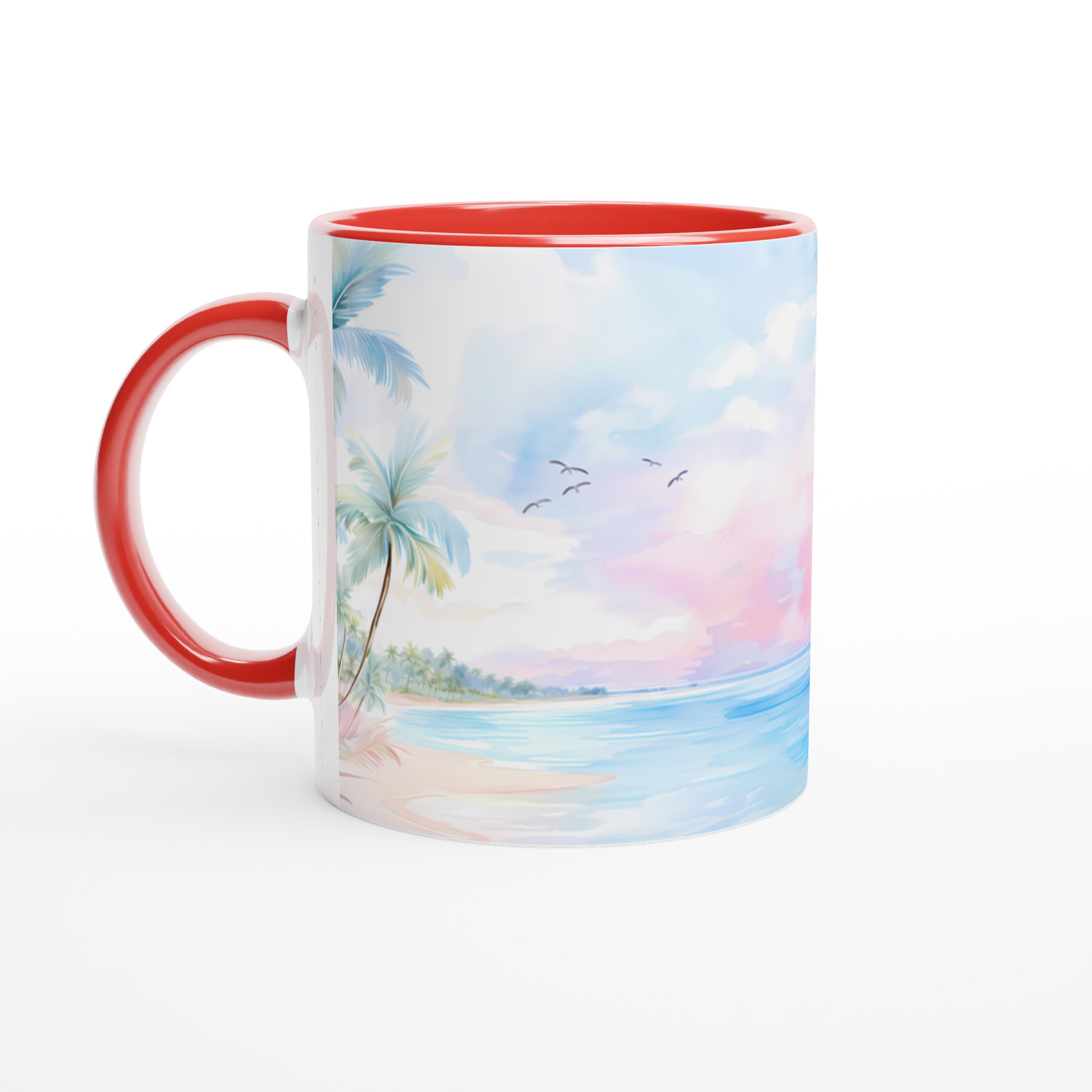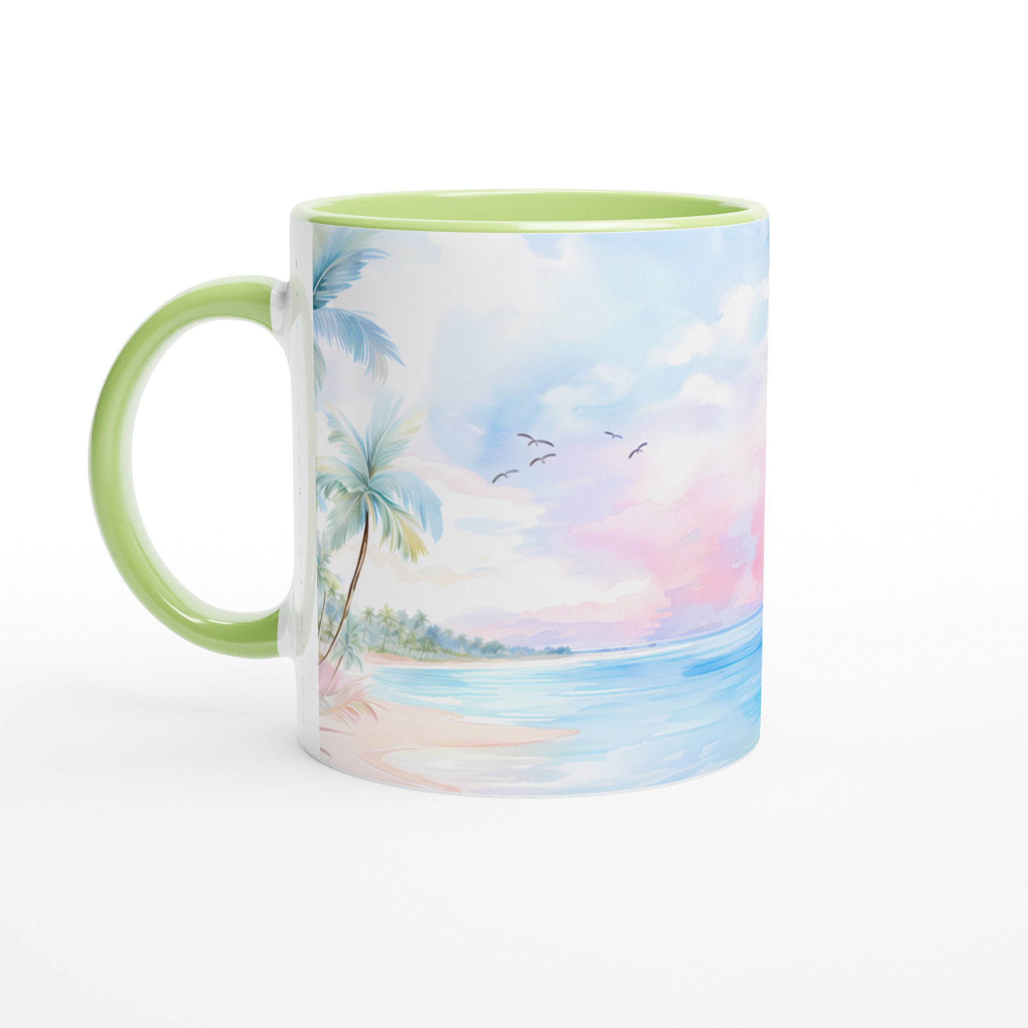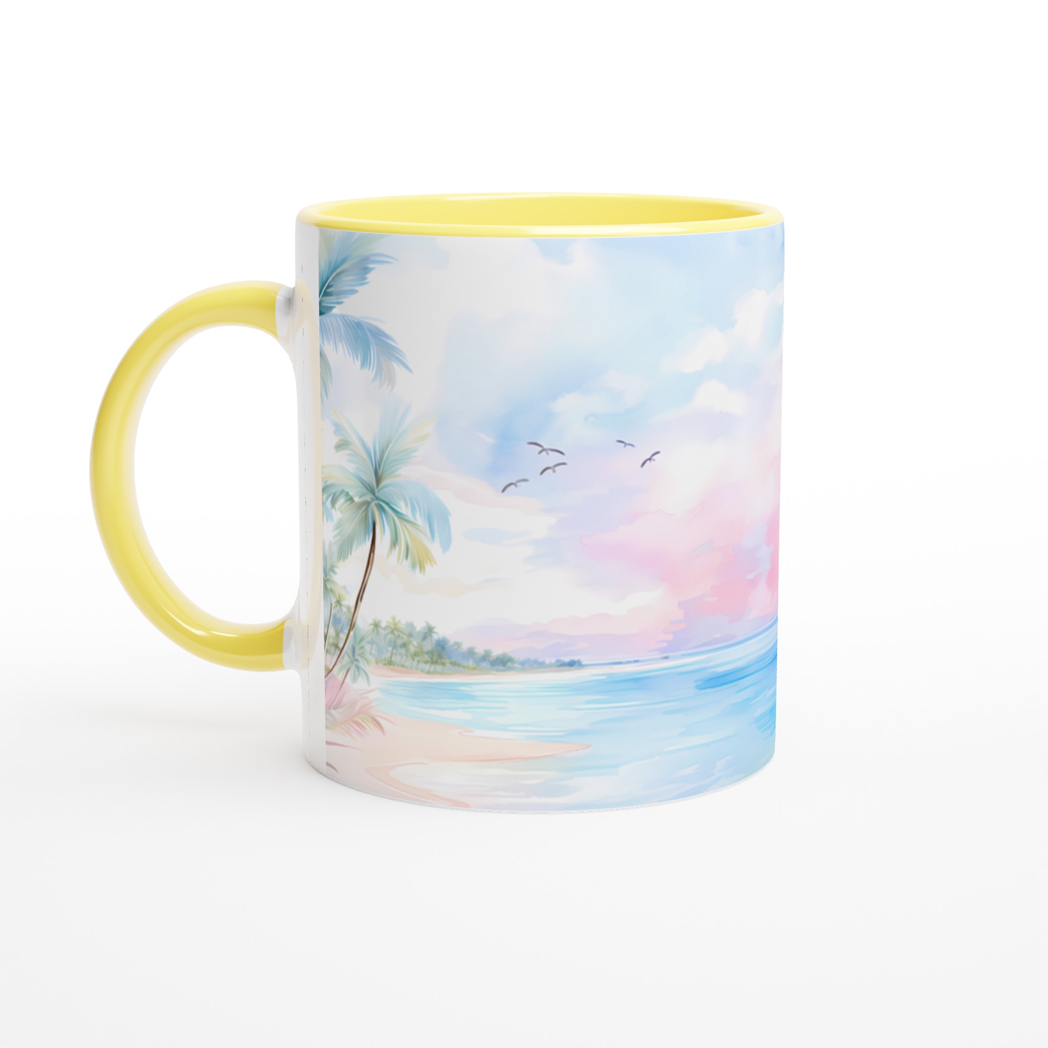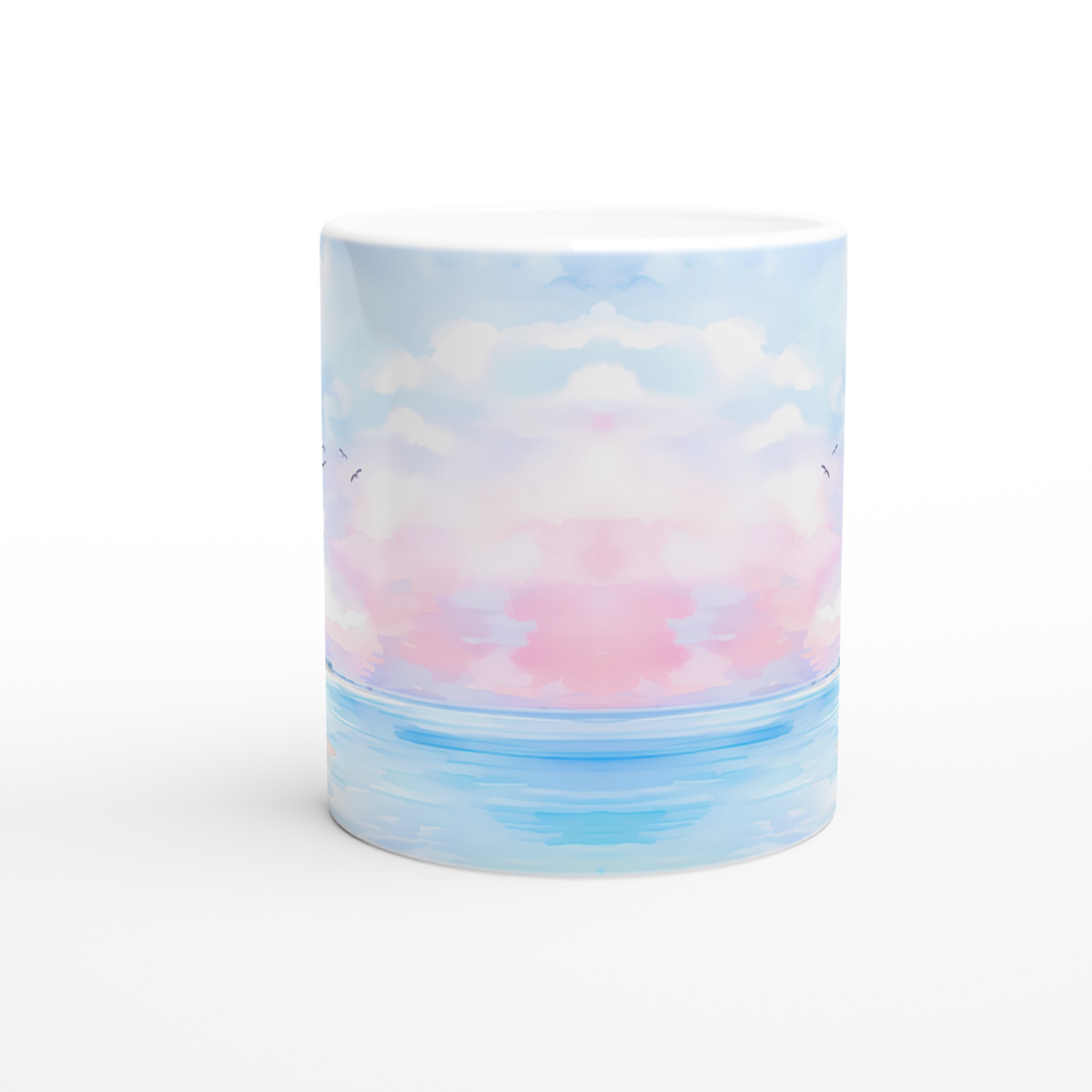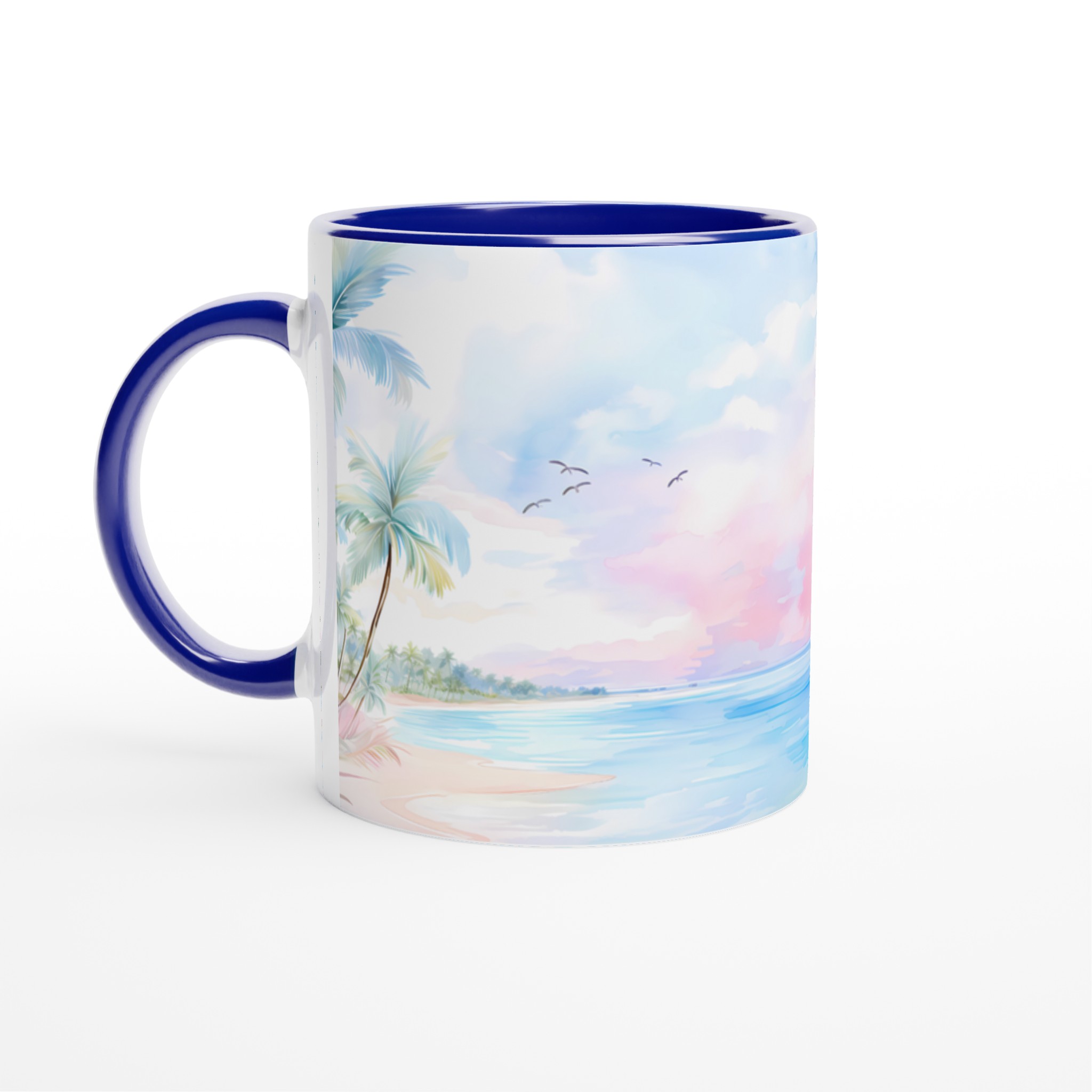 Föreställ dig en lugn stund vid havet varje gång du tar en klunk. Denna underbara keramiska mugg fångar den fridfulla skönheten av en tropisk solnedgång, med mjuka pastellfärger som smälter samman i en drömlik akvarellstil. Palmer ramar in en lugn strand med skimrande rosa och blåa nyanser på himlen, vilket skapar en avkopplande atmosfär perfekt för dina dagliga ritualer. Den blir snabbt en favorit, oavsett om det är för morgonkaffet, kvällens varma choklad eller när du bara vill njuta av en kopp te. Den blanka vita ytan ser till att trycken framhävs med klara och levande färger, som håller sig fina även efter många turer i mikron och diskmaskinen.