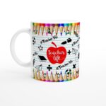 Fånga den glädjefyllda ”Teacher Life”-andan med denna charmiga keramiska mugg! Perfekt för alla pedagoger, studenter eller bokälskare som vill fira sin passion för kunskap. Föreställ dig hur ditt morgonkaffe eller kvällste smakar ännu bättre i denna mugg, som lyser upp varje paus med sina livfulla och lekfulla motiv av glada böcker och en entusiastisk lärare.