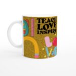 Fira världens bästa lärare med denna livfulla keramiska mugg, designad för att inspirera och muntra upp varje skoldag! Med dess lekfulla citat och glada estetik är den mer än bara en mugg – det är en hyllning till de otroliga pedagoger som formar våra framtider. Perfekt för morgonkaffet, kvällens varma choklad eller när du bara vill njuta av en kopp te. Den blanka vita ytan gör att trycken framhävs med klara och levande färger, som håller sig fina även efter många turer i mikron och diskmaskinen.