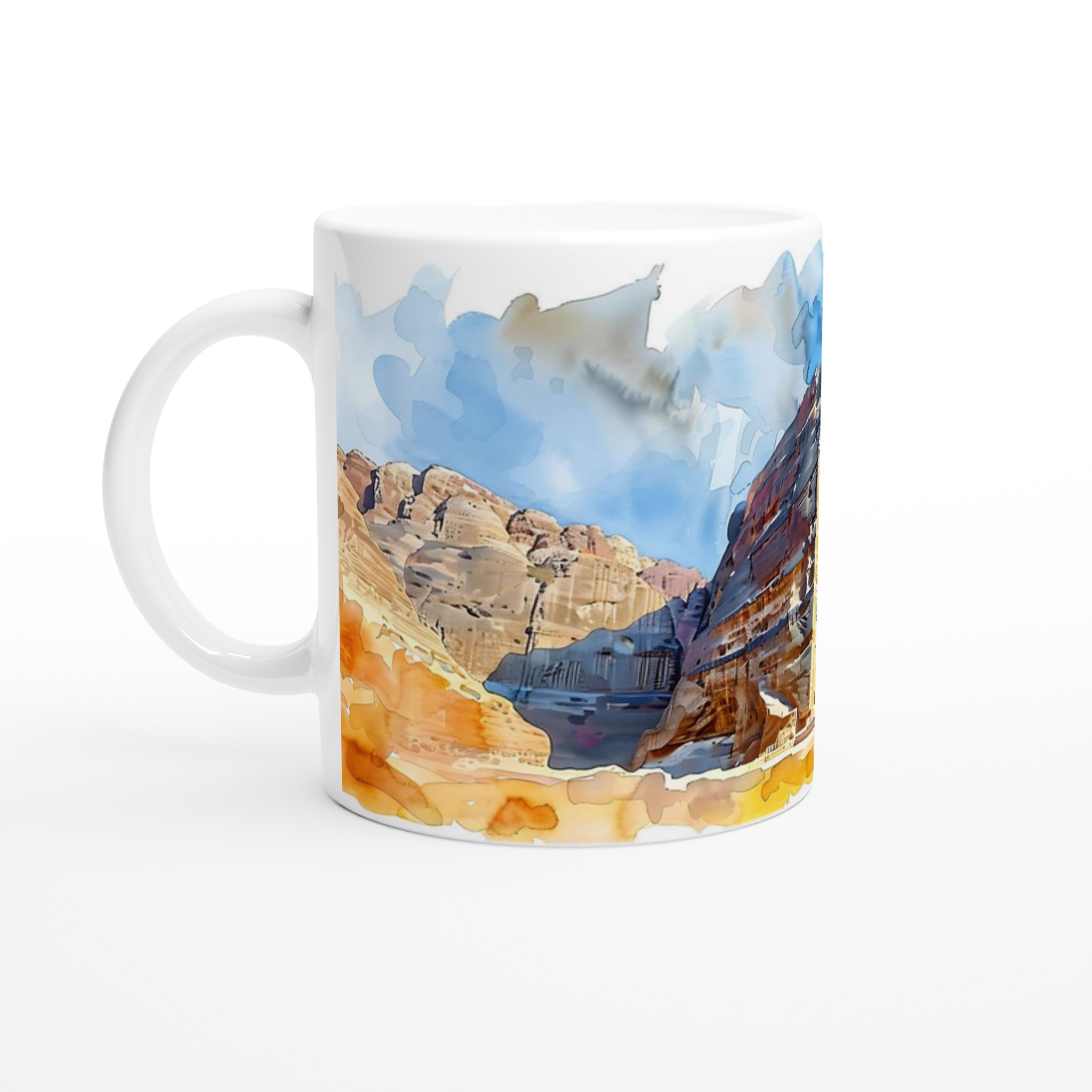 Denna exklusiva keramikmugg förvandlar din dryckesupplevelse till en resa genom historien, med ett konstnärligt akvarelltryck av den ikoniska skattkammaren Al-Khazneh i Petra, Jordanien. De varma sandfärgade tonerna och den drömska blå himlen fångar mystiken och prakten i denna antika stad, vilket gör varje klunk till en stunds eftertanke och skönhet.