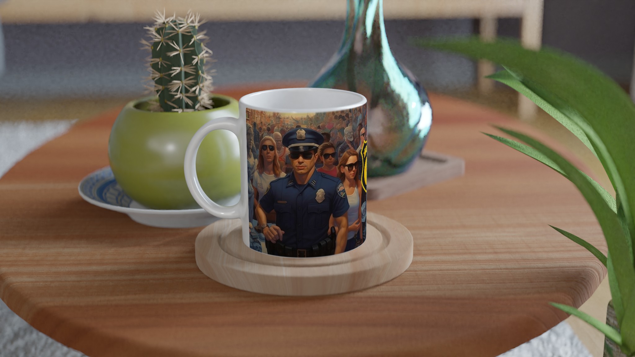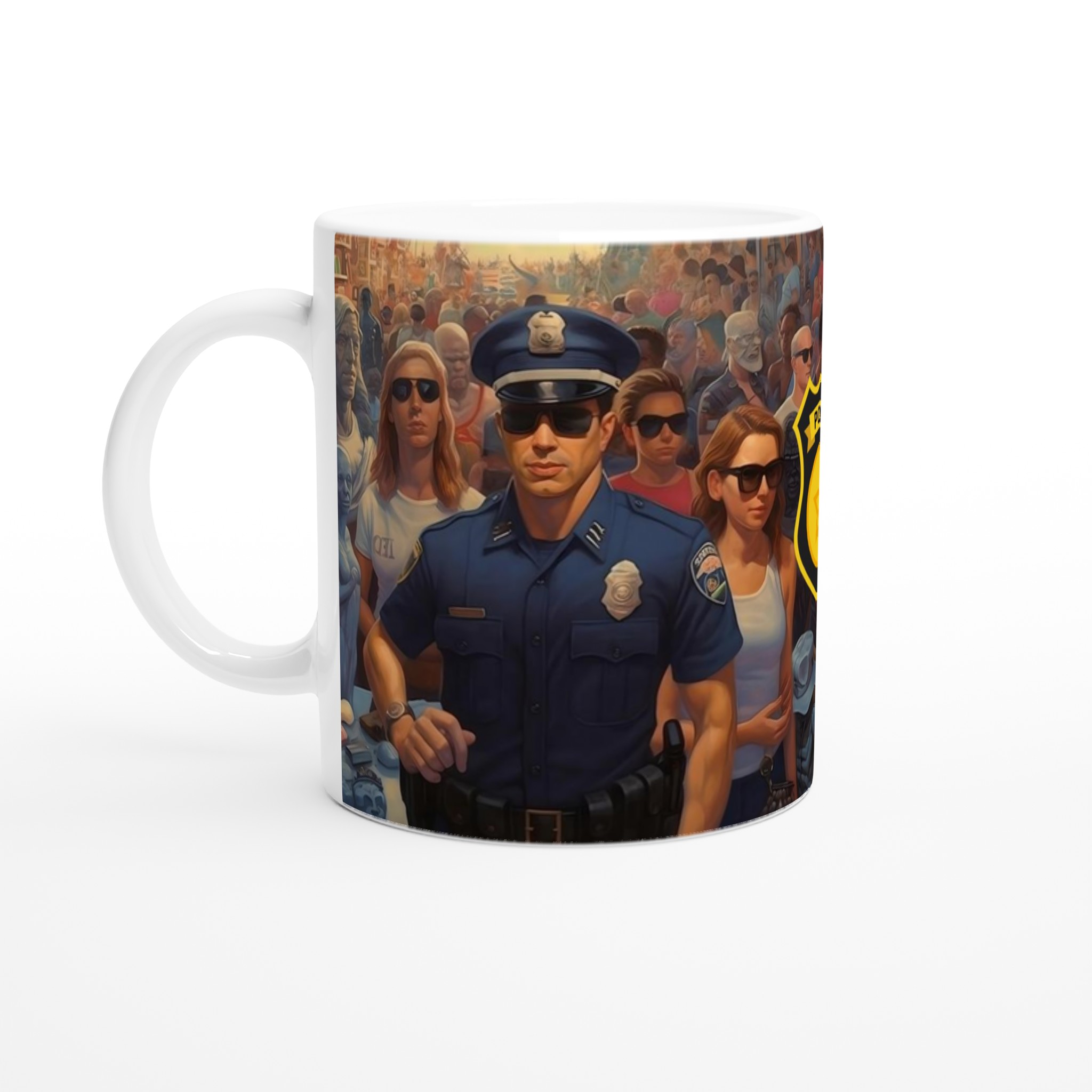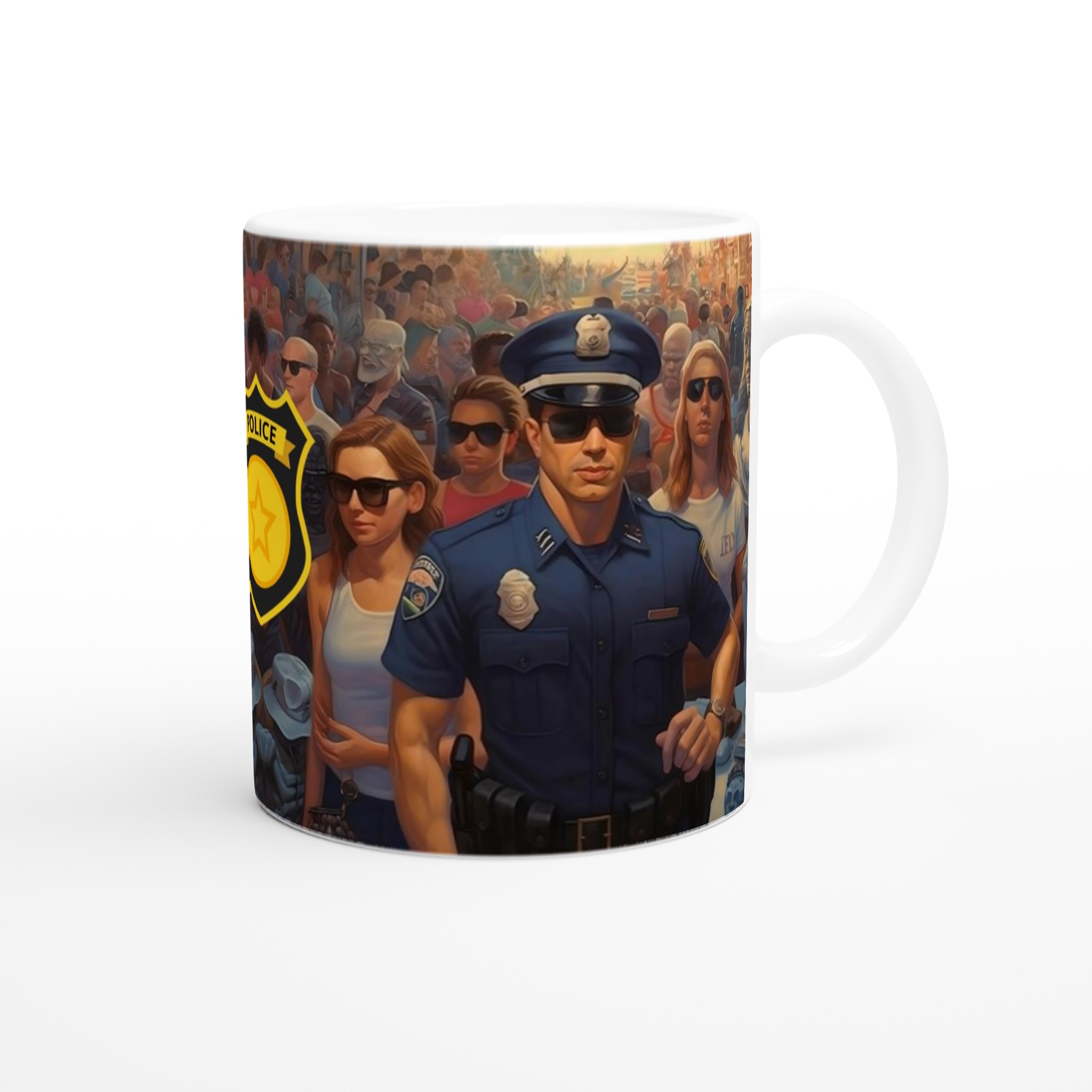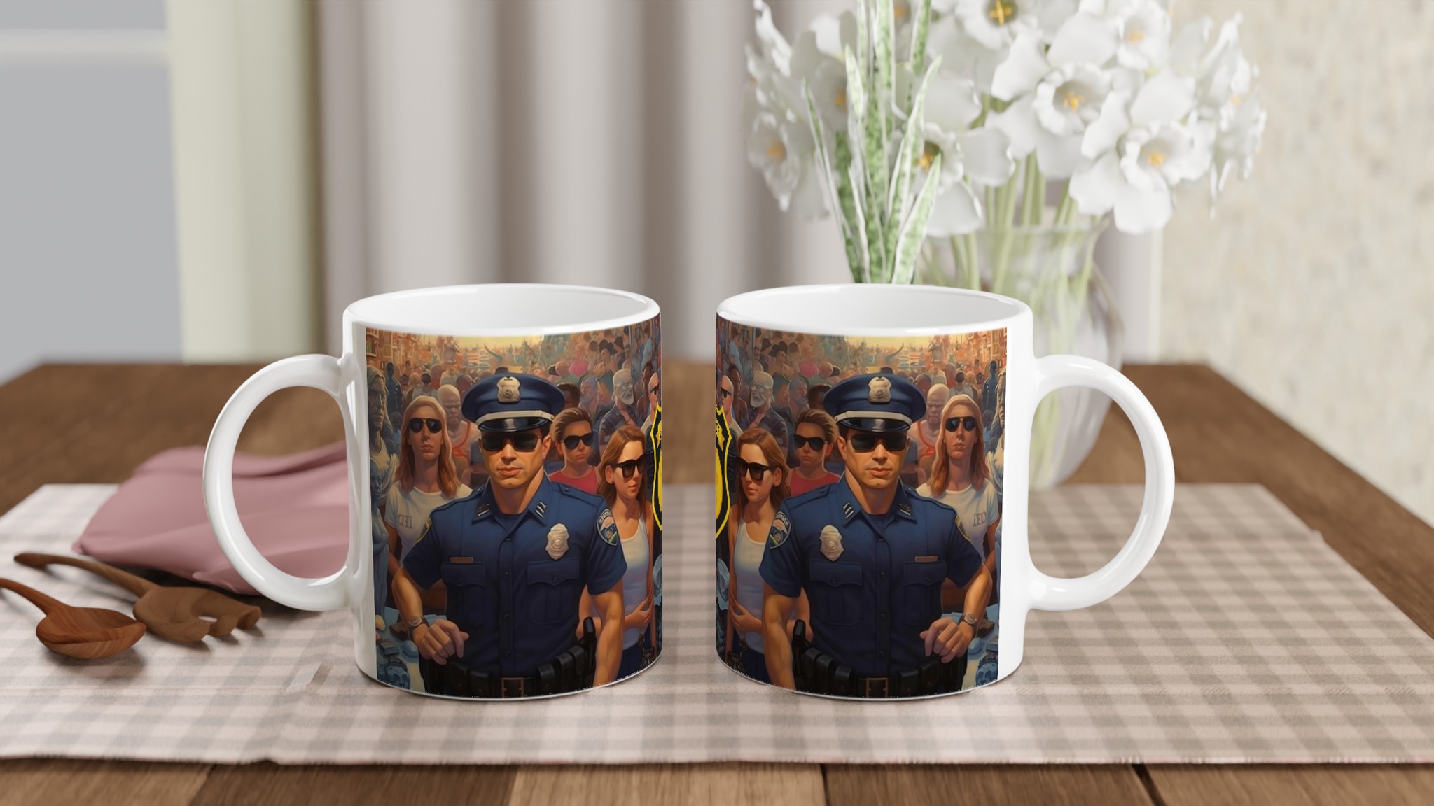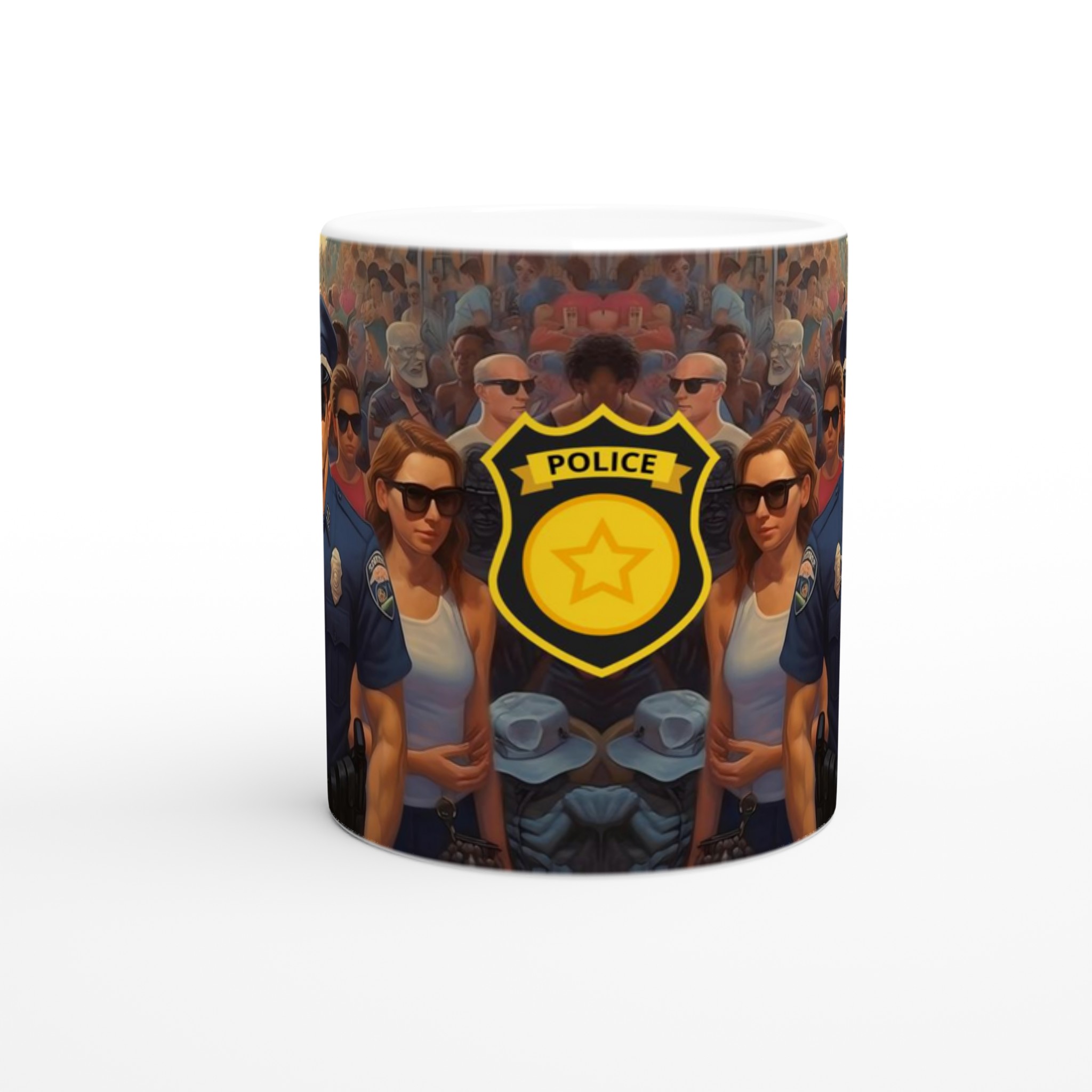 Den här stilrena keramiska muggen blir snabbt en vardagsfavorit. Perfekt för morgonkaffet, kvällens varma choklad eller när du bara vill njuta av en kopp te. Med sitt unika, konstnärliga motiv av poliser och folkmassor, ger denna mugg en distinkt och tankeväckande touch till din dryckesupplevelse. Den blanka vita ytan gör att trycken framhävs med klara och levande färger, som håller sig fina även efter många turer i mikron och diskmaskinen.