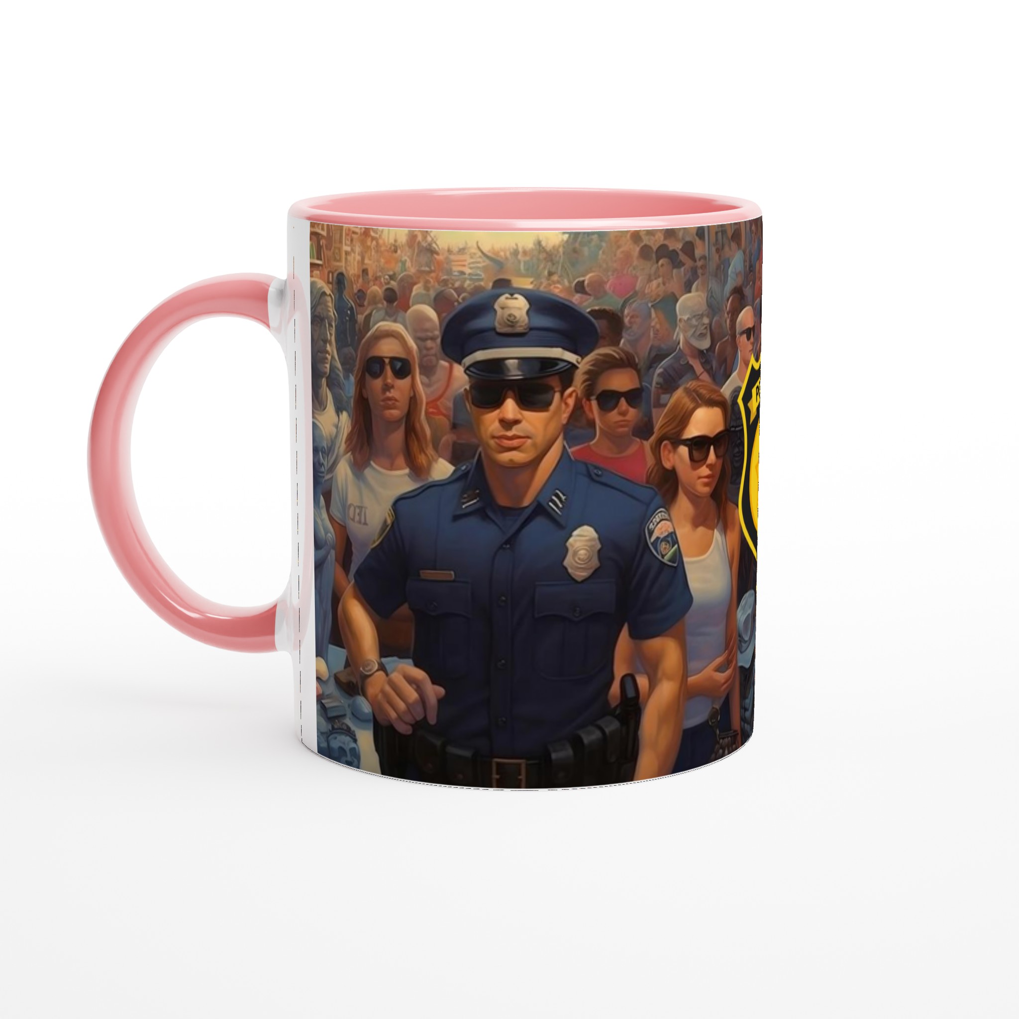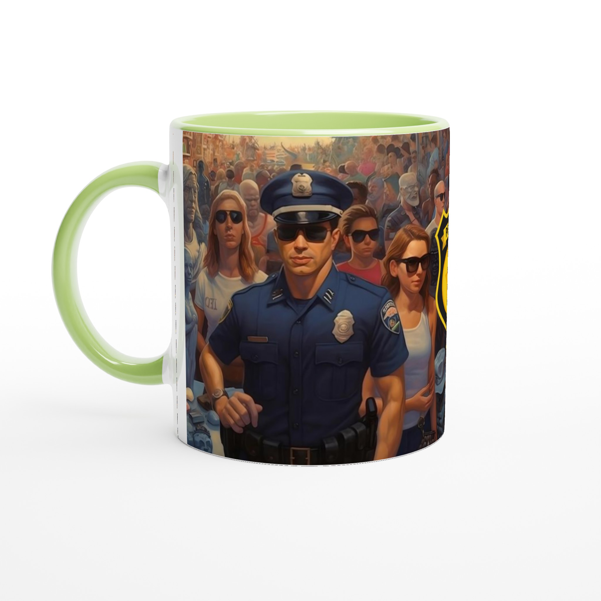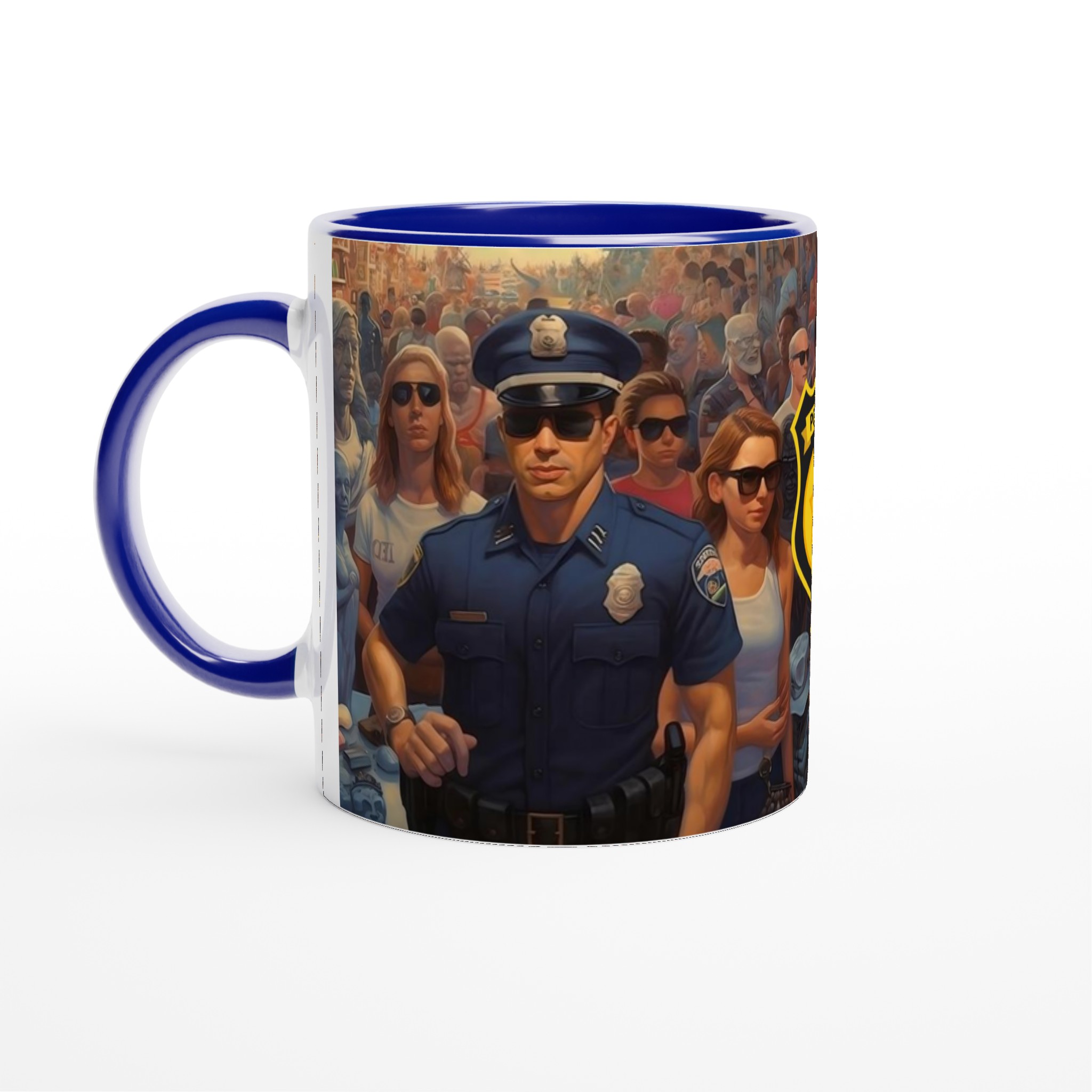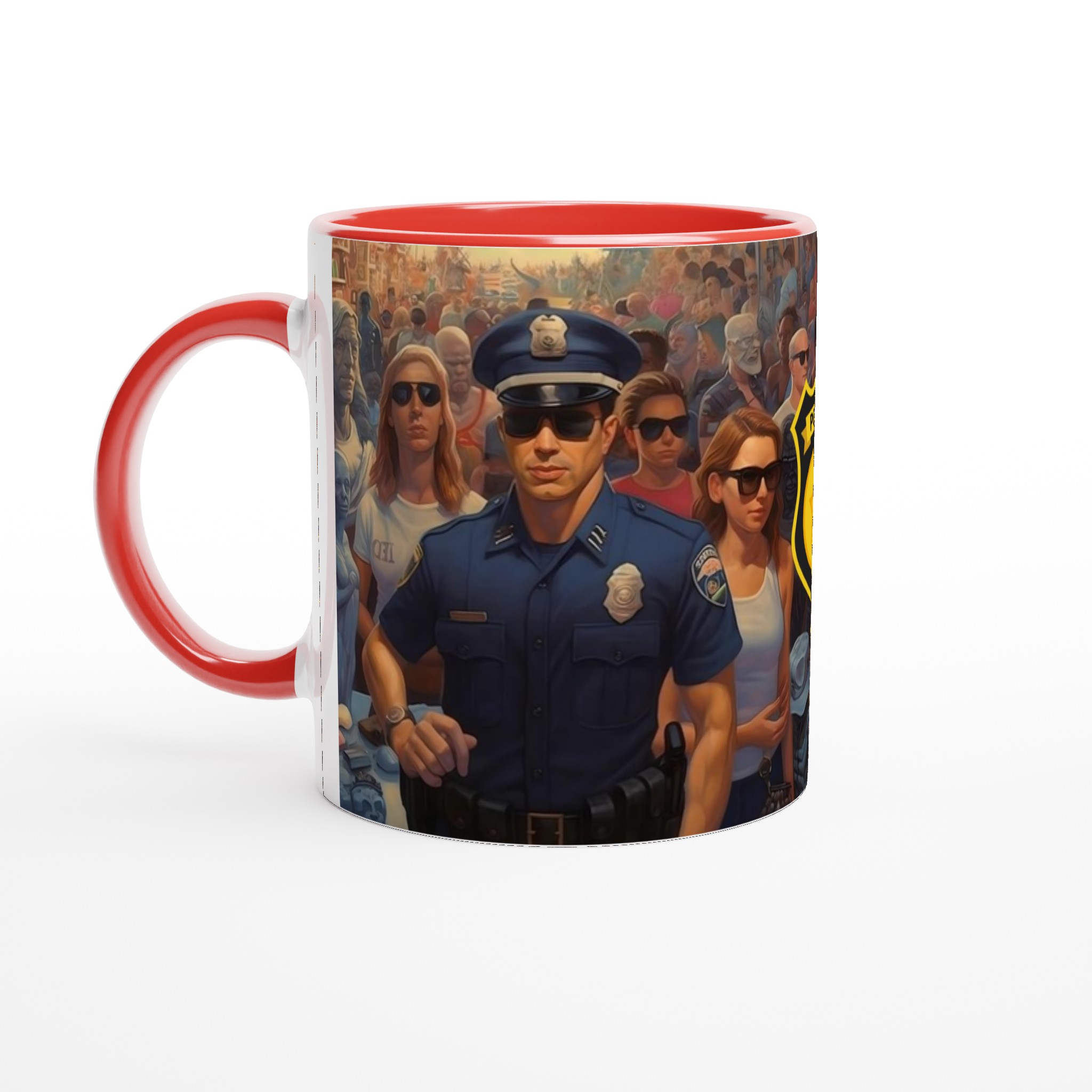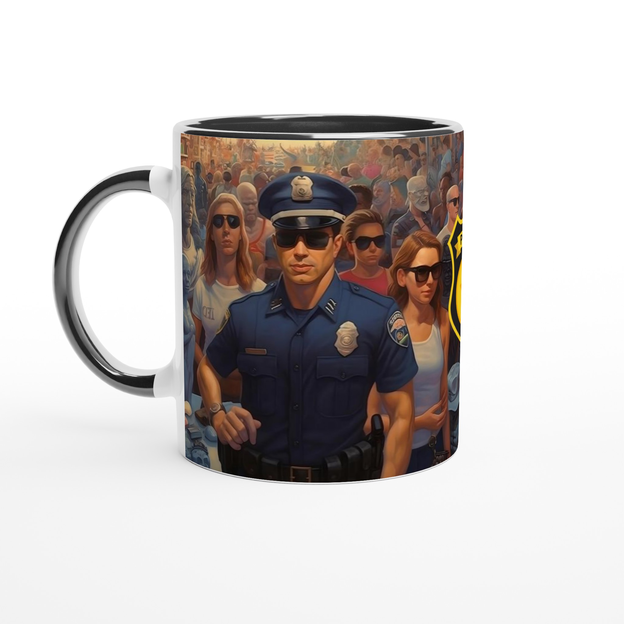 Den här stilrena keramiska muggen blir snabbt en vardagsfavorit. Perfekt för morgonkaffet, kvällens varma choklad eller när du bara vill njuta av en kopp te. Med sitt unika, konstnärliga motiv av poliser och folkmassor, ger denna mugg en distinkt och tankeväckande touch till din dryckesupplevelse. Den blanka vita ytan gör att trycken framhävs med klara och levande färger, som håller sig fina även efter många turer i mikron och diskmaskinen.