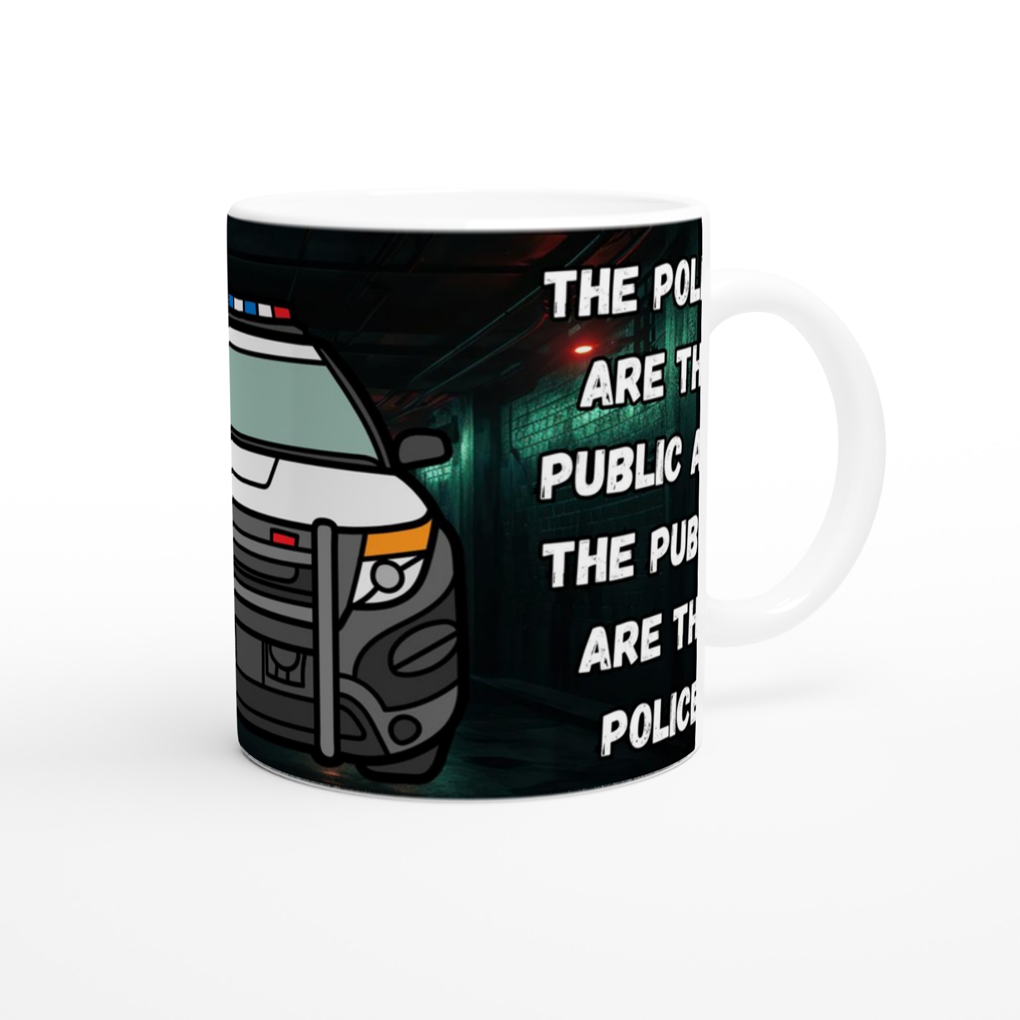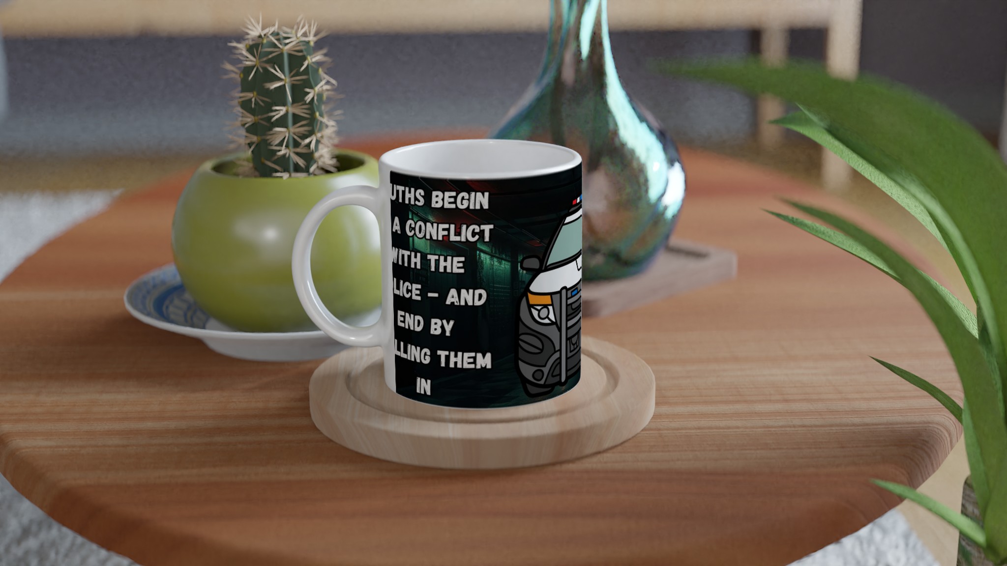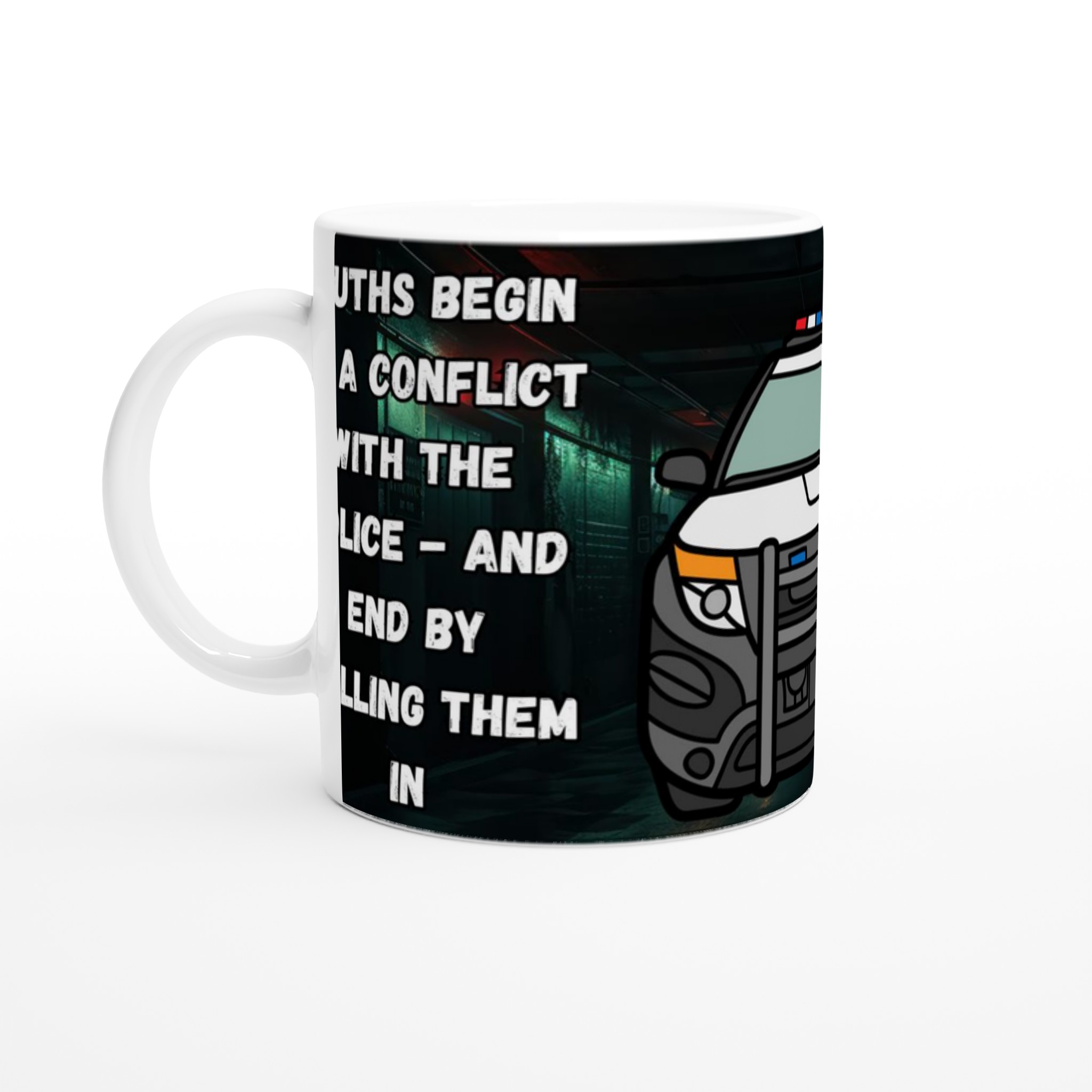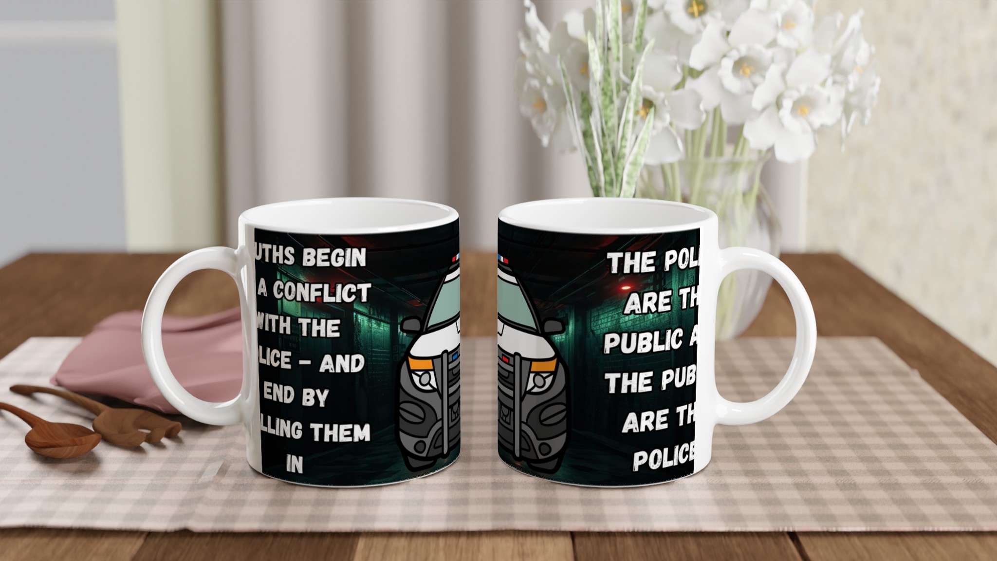 Den här stilrena keramiska muggen blir snabbt en vardagsfavorit, perfekt för dig som uppskattar både funktion och tankeväckande design. Föreställ dig att starta dagen med morgonkaffet eller varva ner med kvällens varma choklad, med ett budskap som inbjuder till reflektion. Den framträdande polisbilsdesignen, omgiven av ett skarpt citat i en urban, något mystisk grönaktig miljö, ger muggen en unik karaktär. Den blanka vita ytan gör att trycket framhävs med klara och levande färger, som håller sig fina även efter många turer i mikron och diskmaskinen.