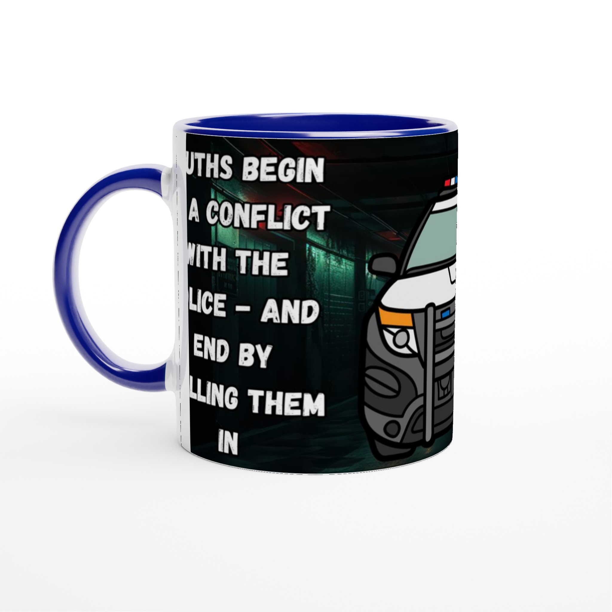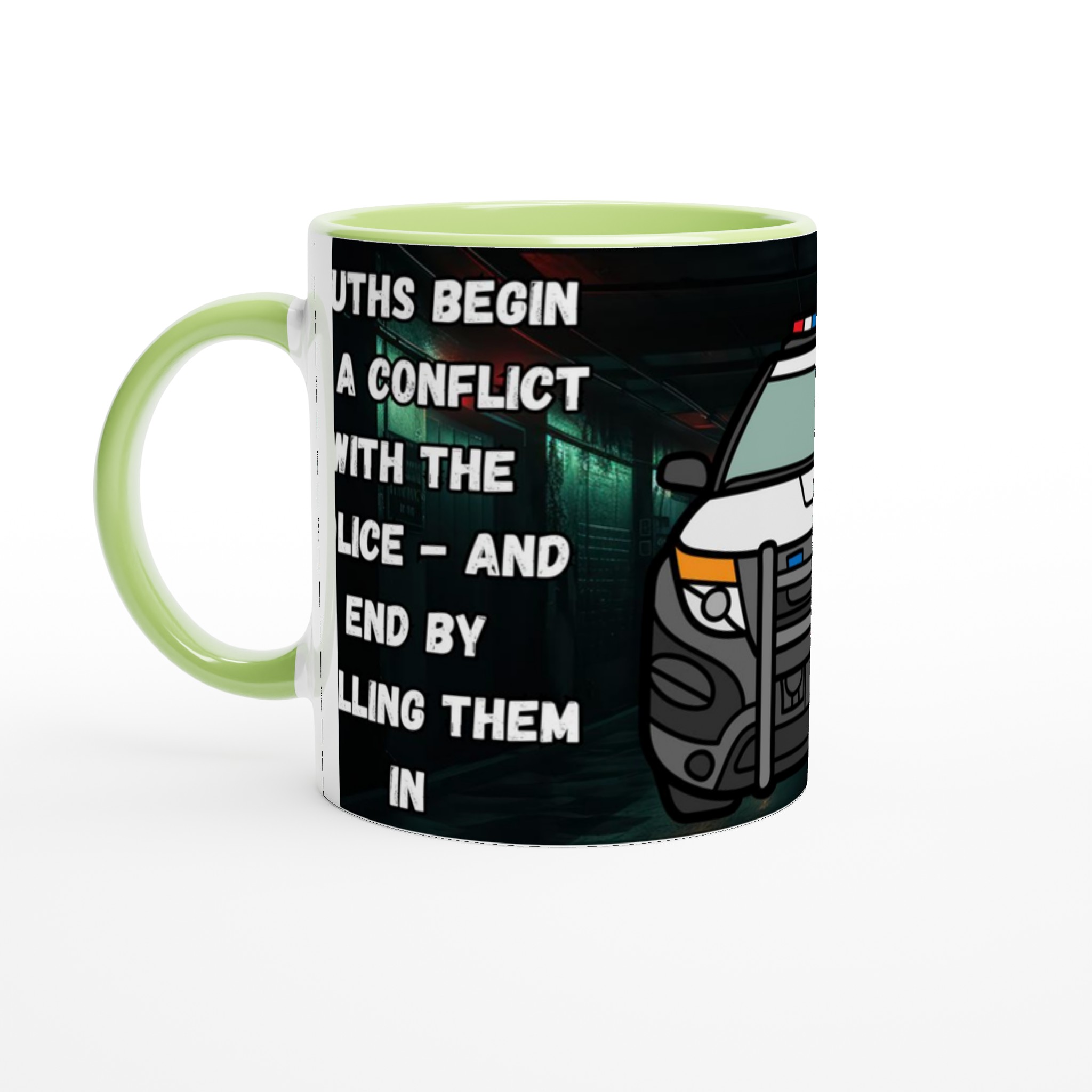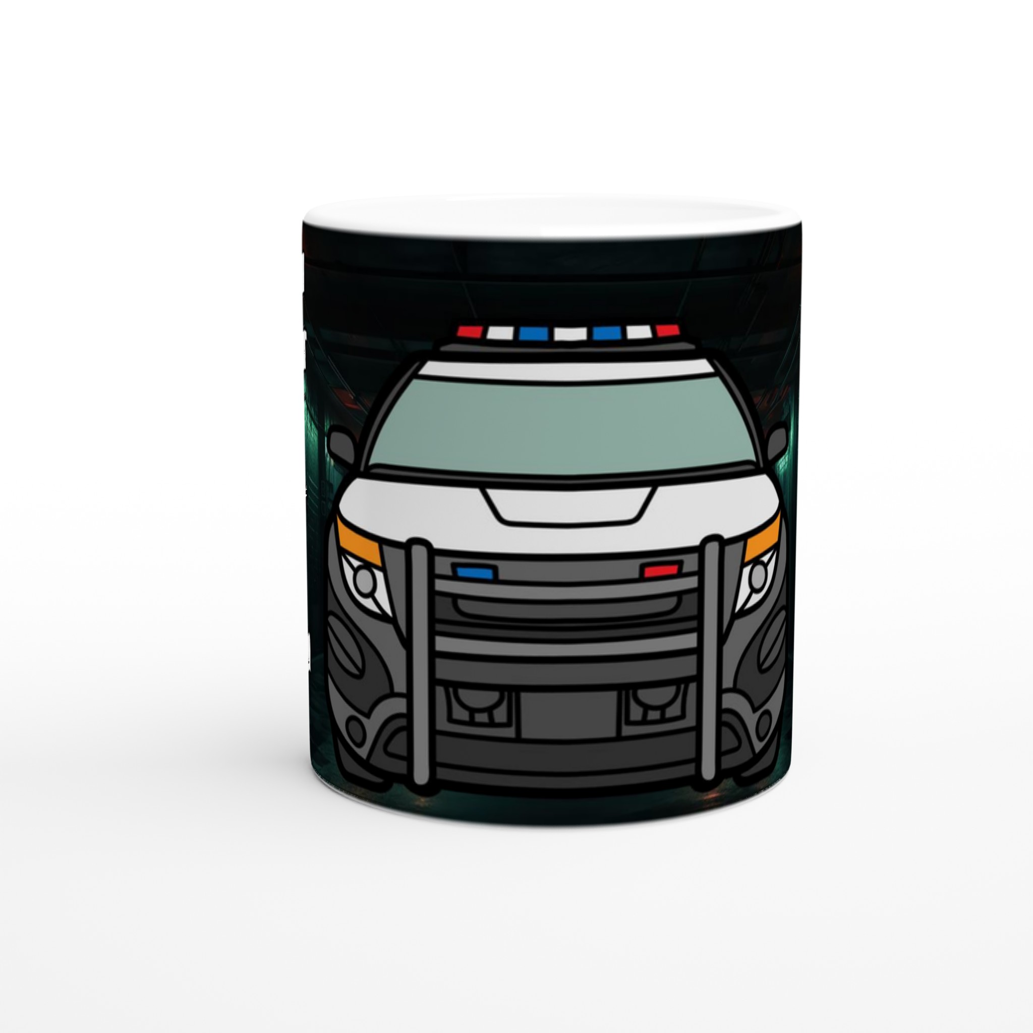 Den här stilrena keramiska muggen blir snabbt en vardagsfavorit, perfekt för dig som uppskattar både funktion och tankeväckande design. Föreställ dig att starta dagen med morgonkaffet eller varva ner med kvällens varma choklad, med ett budskap som inbjuder till reflektion. Den framträdande polisbilsdesignen, omgiven av ett skarpt citat i en urban, något mystisk grönaktig miljö, ger muggen en unik karaktär. Den blanka vita ytan gör att trycket framhävs med klara och levande färger, som håller sig fina även efter många turer i mikron och diskmaskinen.