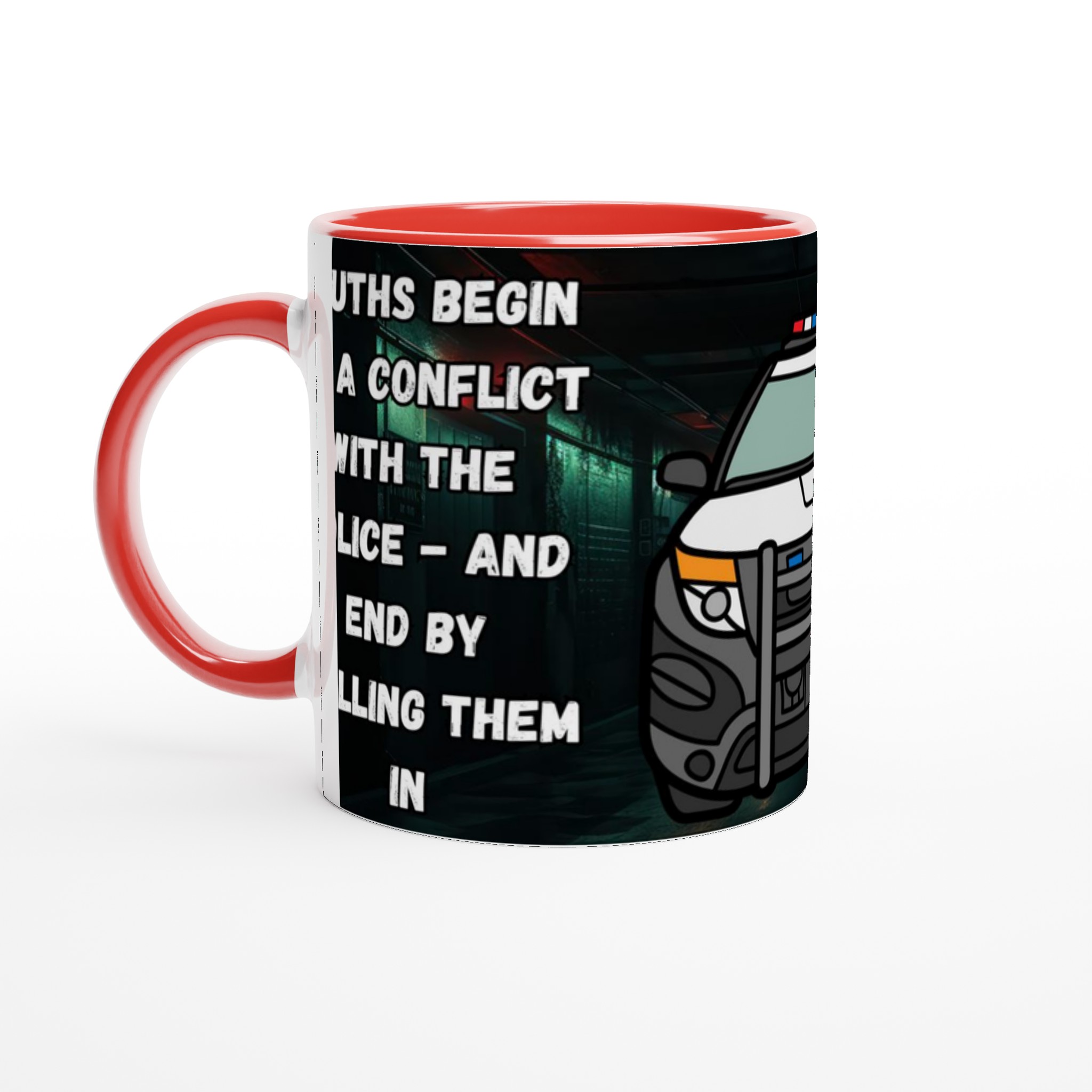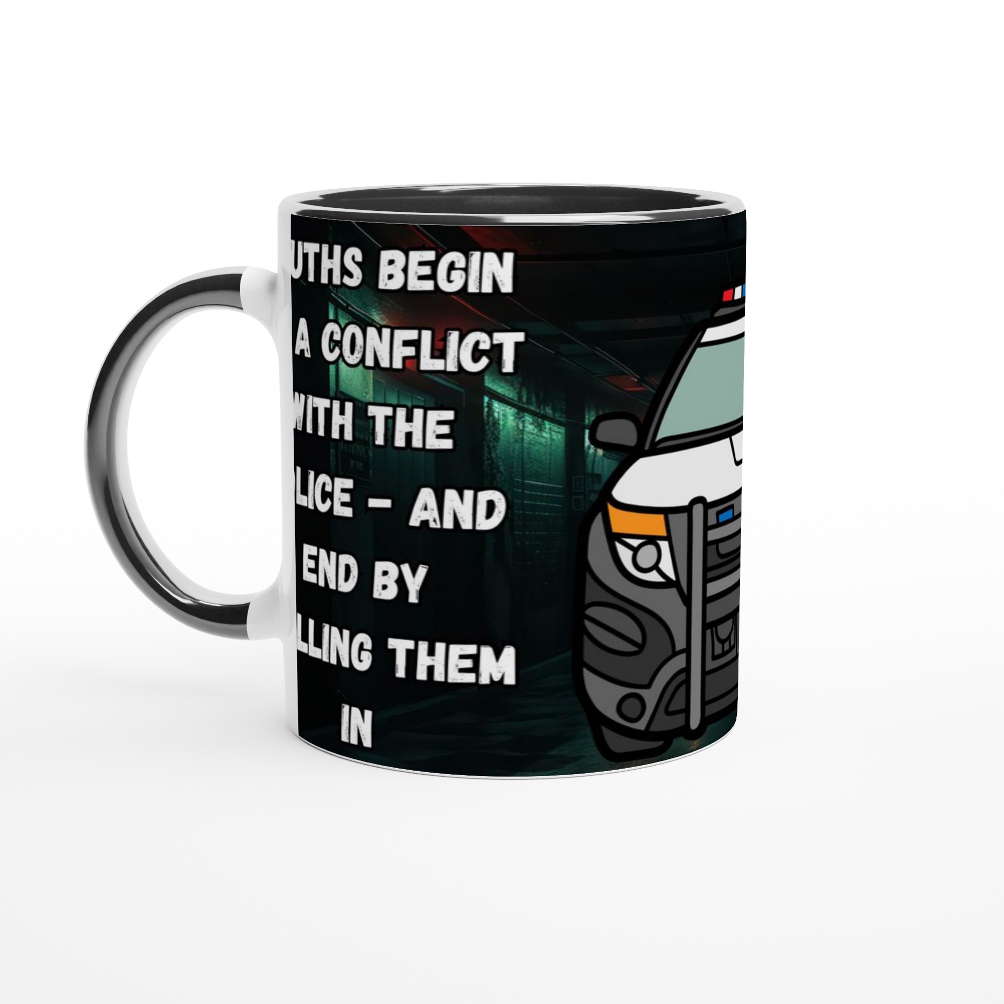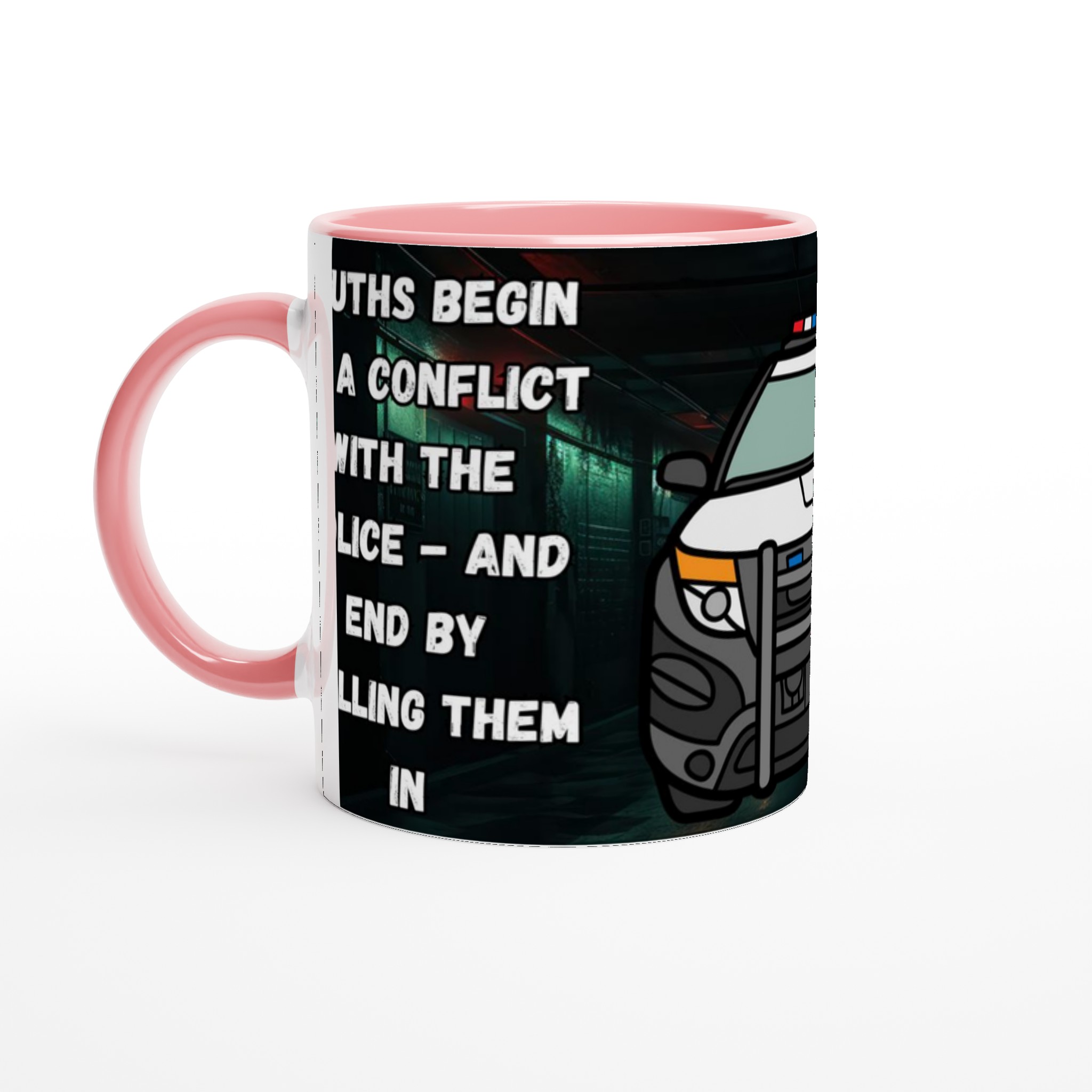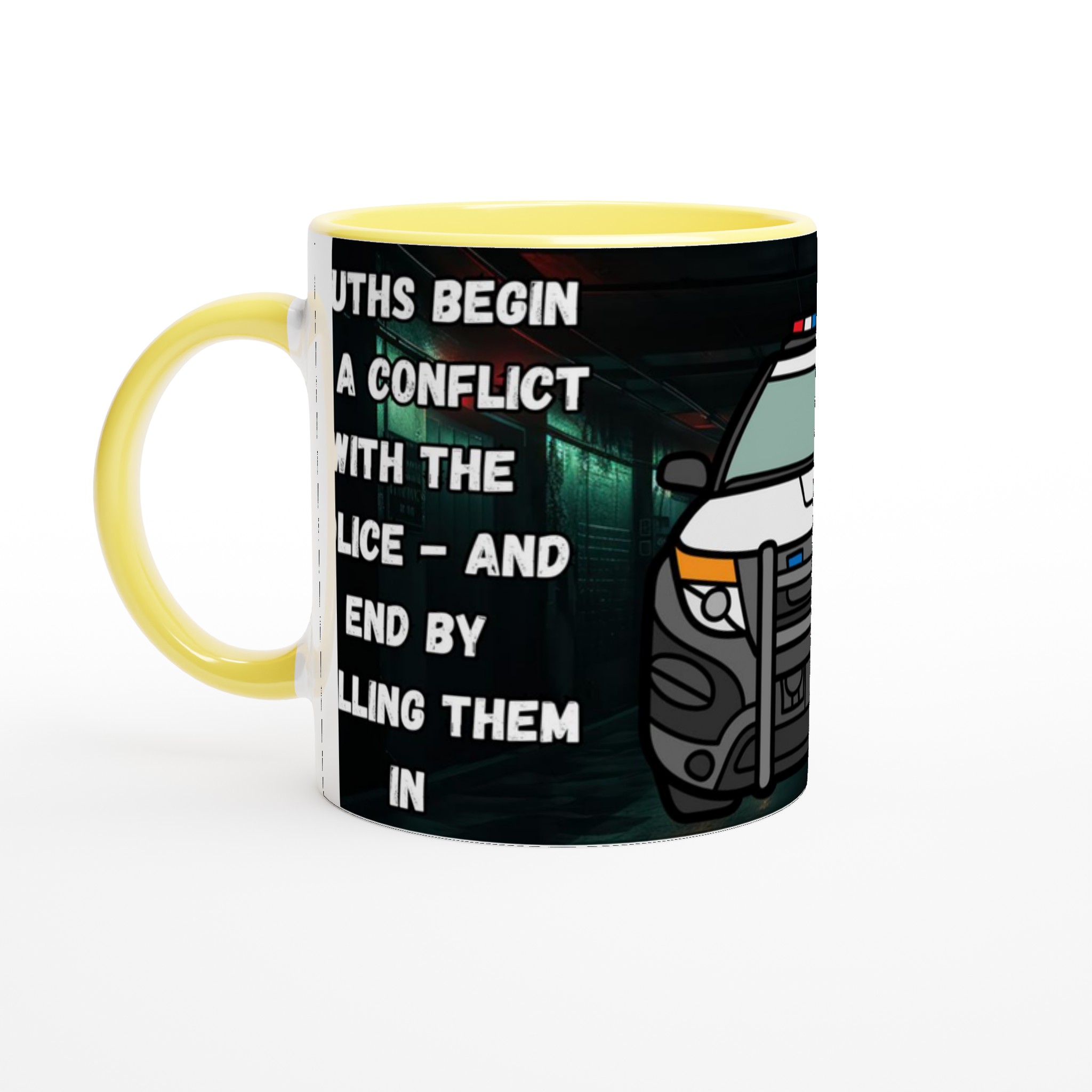 Den här stilrena keramiska muggen blir snabbt en vardagsfavorit, perfekt för dig som uppskattar både funktion och tankeväckande design. Föreställ dig att starta dagen med morgonkaffet eller varva ner med kvällens varma choklad, med ett budskap som inbjuder till reflektion. Den framträdande polisbilsdesignen, omgiven av ett skarpt citat i en urban, något mystisk grönaktig miljö, ger muggen en unik karaktär. Den blanka vita ytan gör att trycket framhävs med klara och levande färger, som håller sig fina även efter många turer i mikron och diskmaskinen.