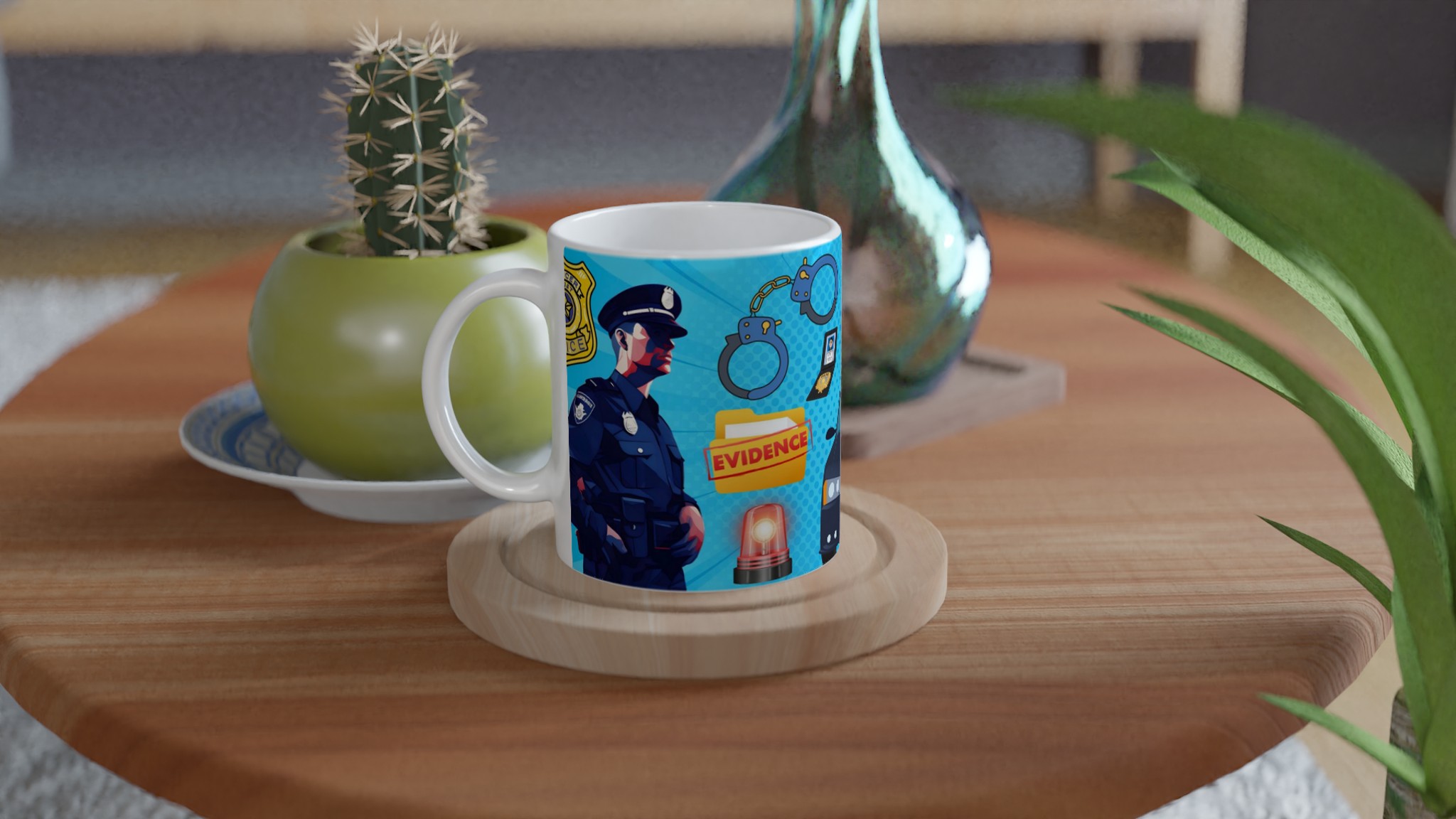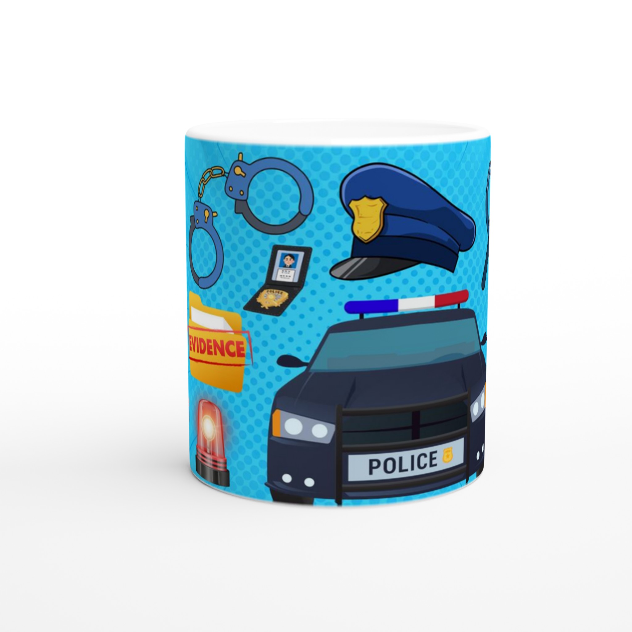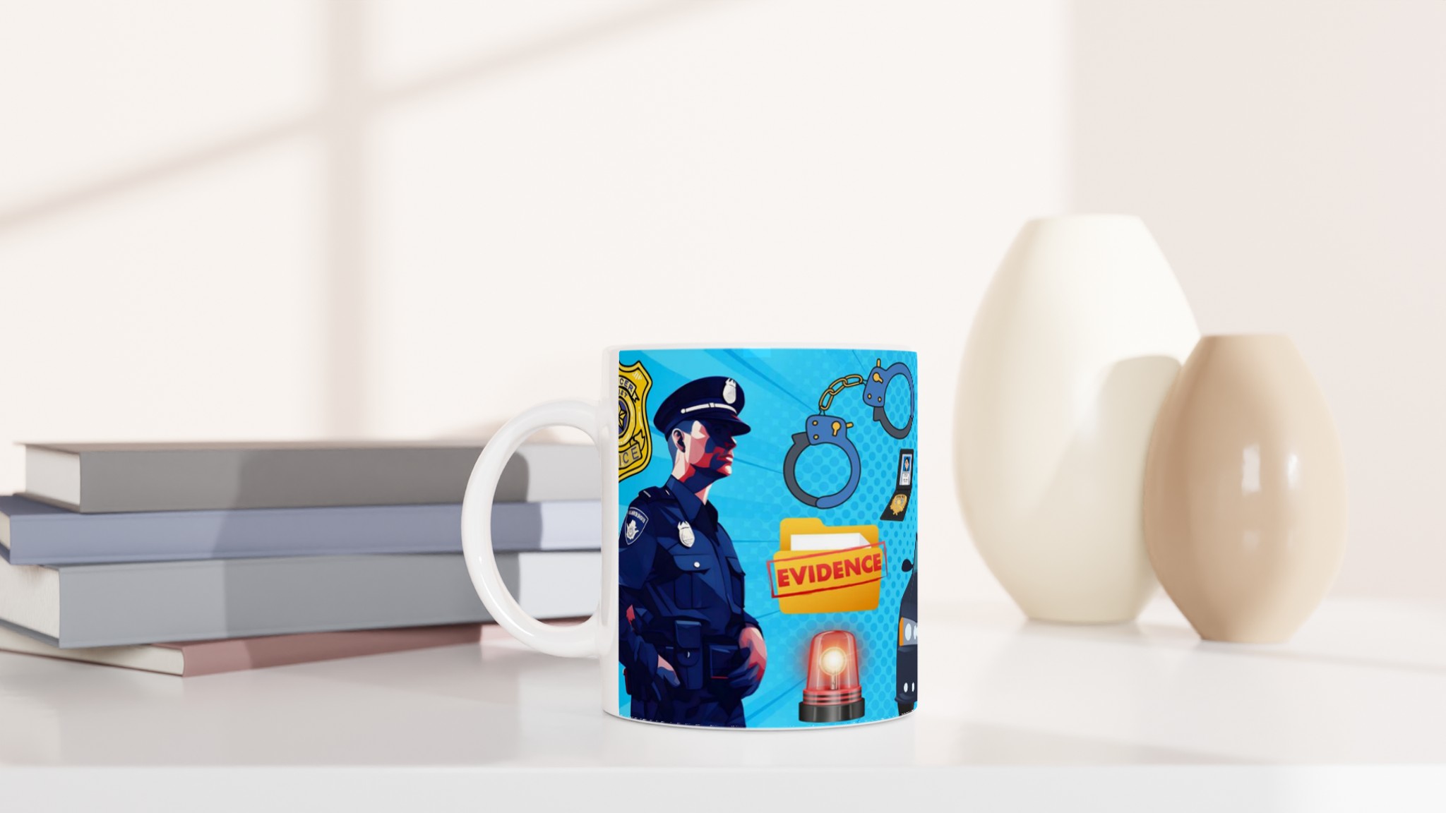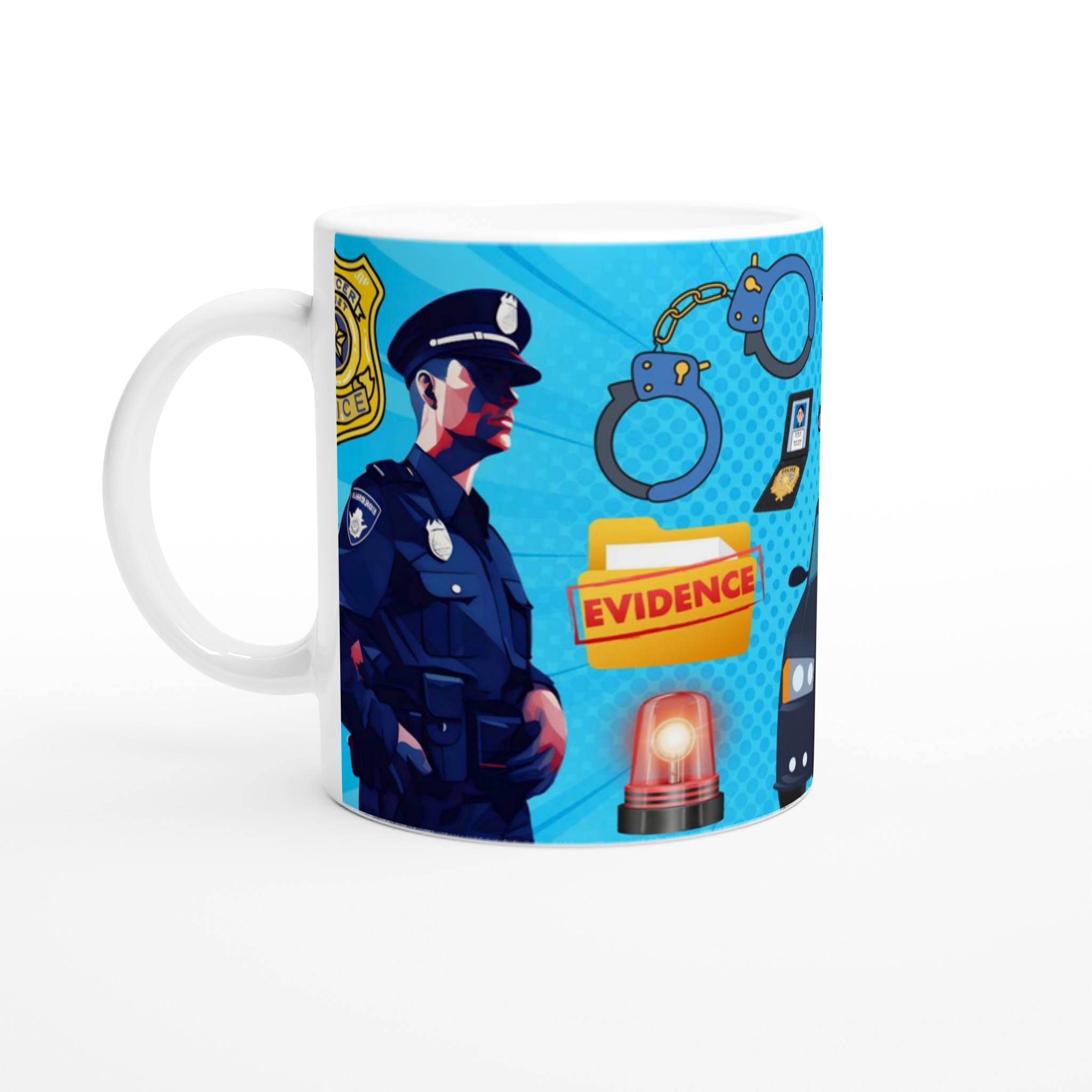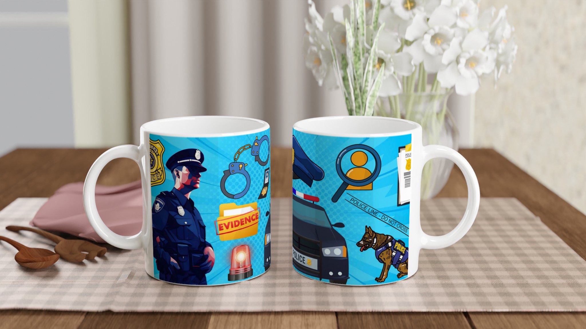 Den här stilrena keramiska muggen blir snabbt en vardagsfavorit. Perfekt för morgonkaffet, kvällens varma choklad eller när du bara vill njuta av en kopp te. Med sitt livfulla ”Police Heroes”-tema, som fångar en officers modiga vardag med stiliserade ikoner som polisbilen, handfängsel och polishunden, blir varje klunk en hyllning till samhällshjältarna. Den blanka vita ytan gör att trycken framhävs med klara och levande färger, som håller sig fina även efter många turer i mikron och diskmaskinen.