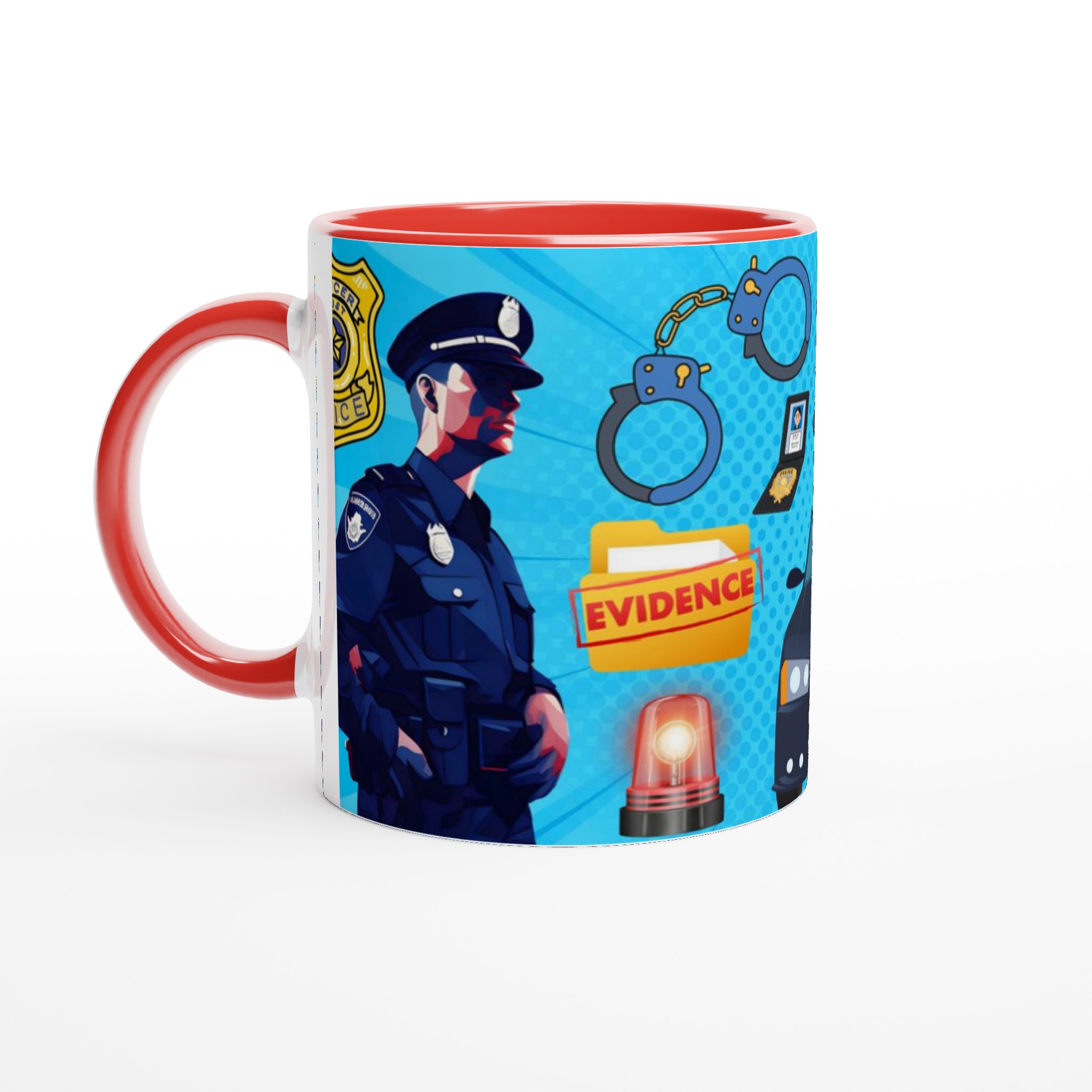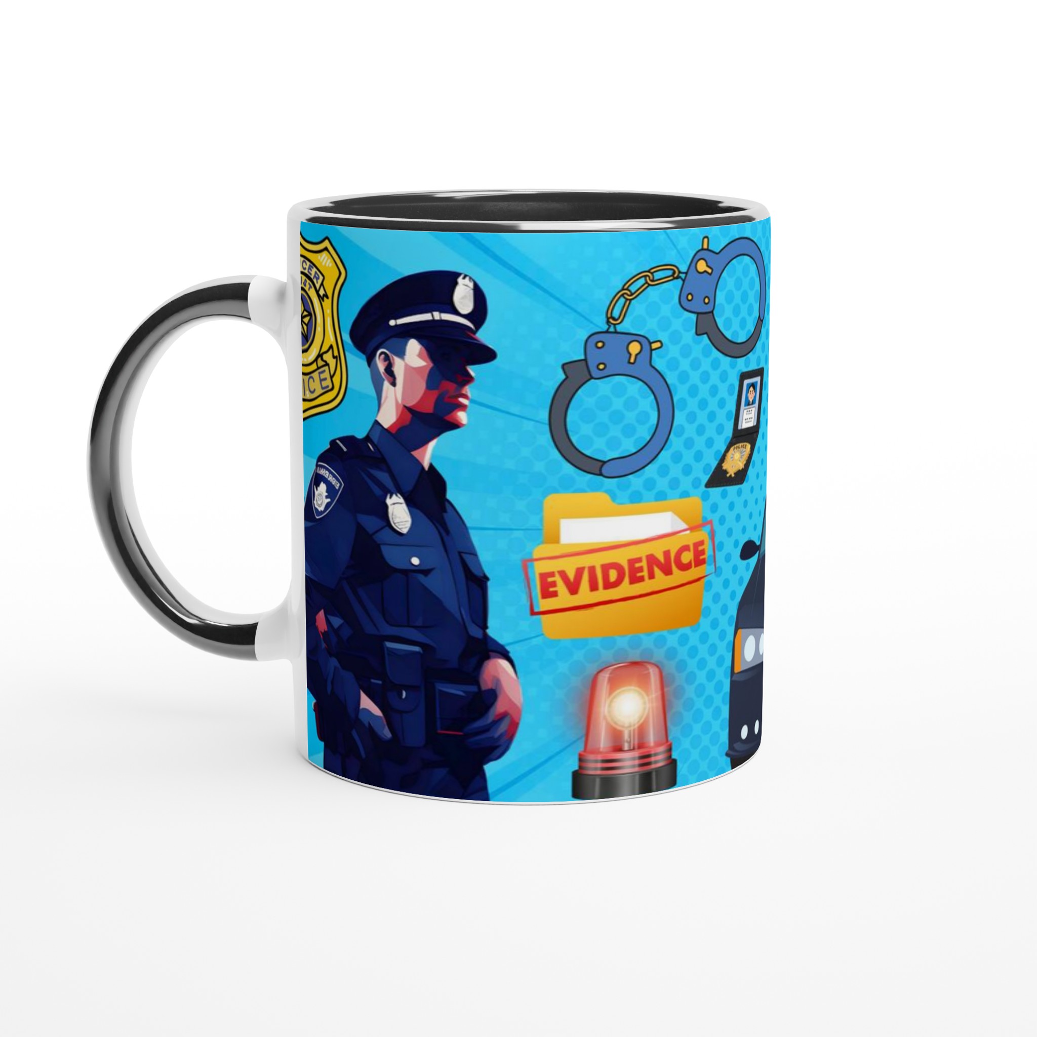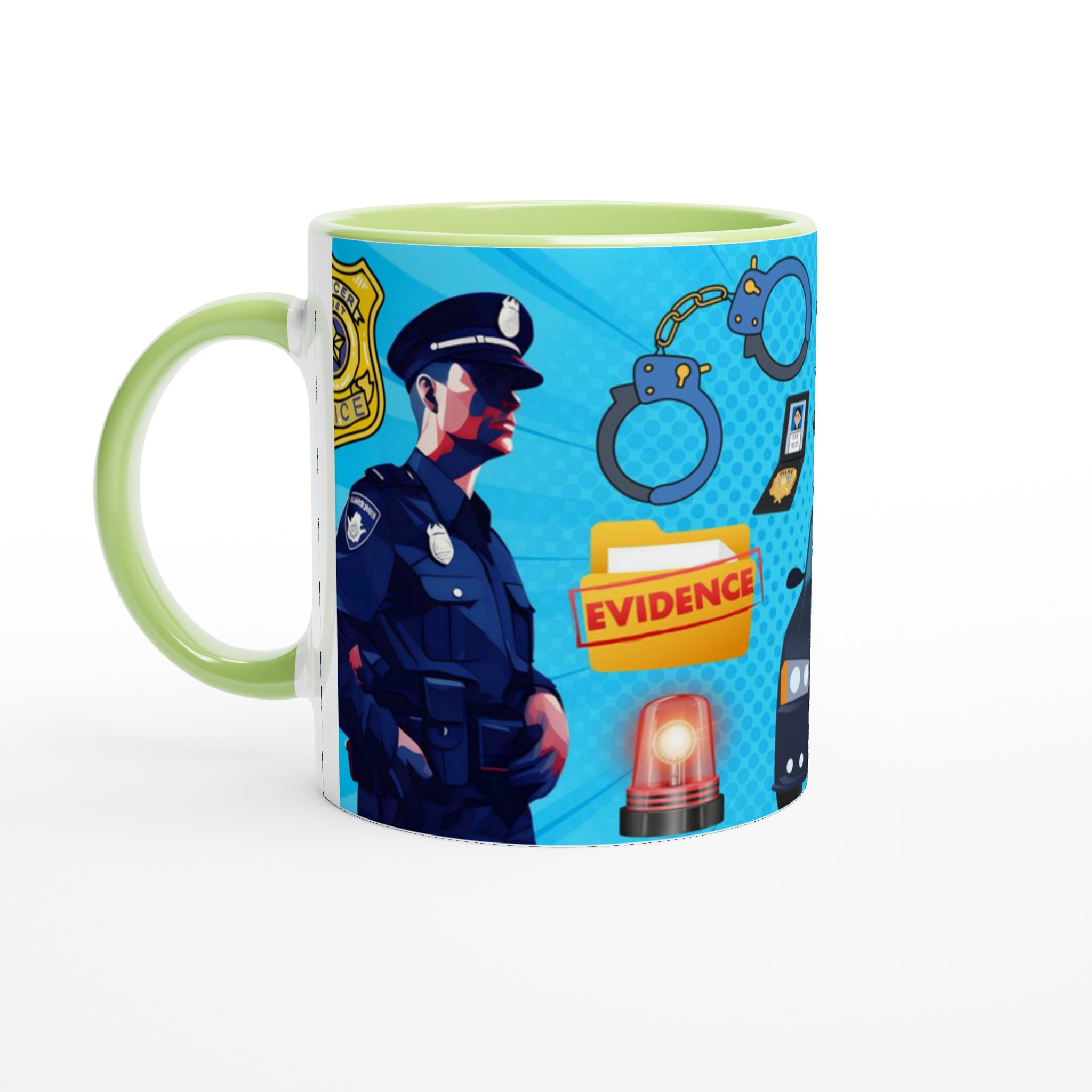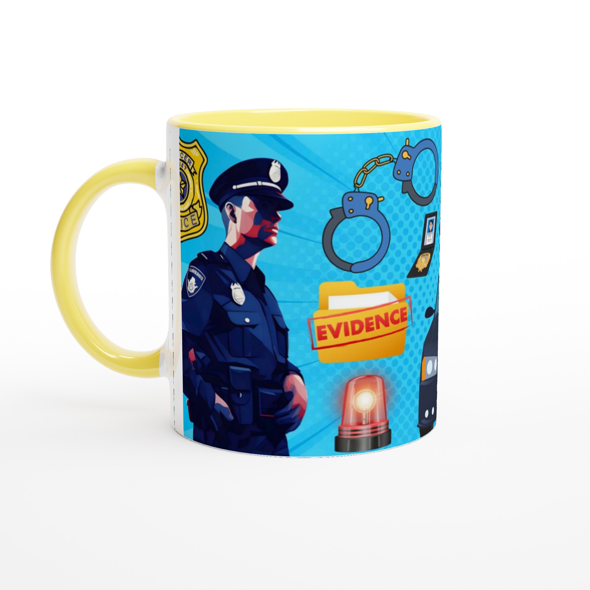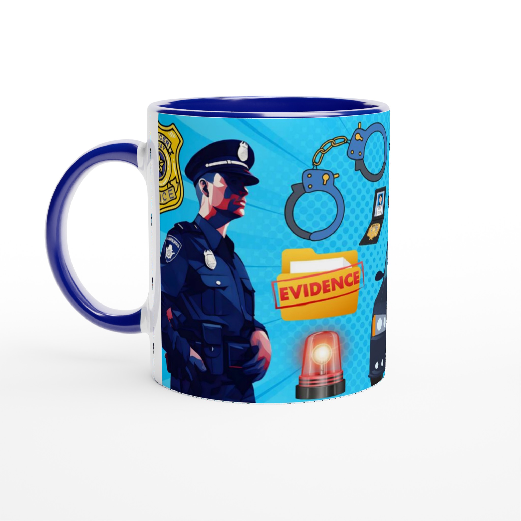 Den här stilrena keramiska muggen blir snabbt en vardagsfavorit. Perfekt för morgonkaffet, kvällens varma choklad eller när du bara vill njuta av en kopp te. Med sitt livfulla ”Police Heroes”-tema, som fångar en officers modiga vardag med stiliserade ikoner som polisbilen, handfängsel och polishunden, blir varje klunk en hyllning till samhällshjältarna. Den blanka vita ytan gör att trycken framhävs med klara och levande färger, som håller sig fina även efter många turer i mikron och diskmaskinen.