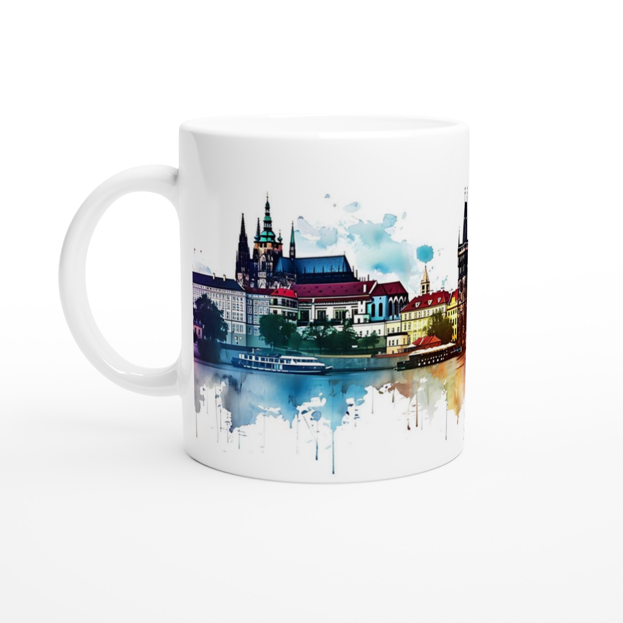 Inspirerad av den drömlika akvarellkonsten som avbildar Prags ikoniska skyline, tar denna mugg med sig stadens magi direkt till ditt kök. Den blanka vita ytan ger ett skarpt och levande tryck som verkligen sticker ut, oavsett om det är en personlig design, ett roligt citat eller en present till någon du tycker om.