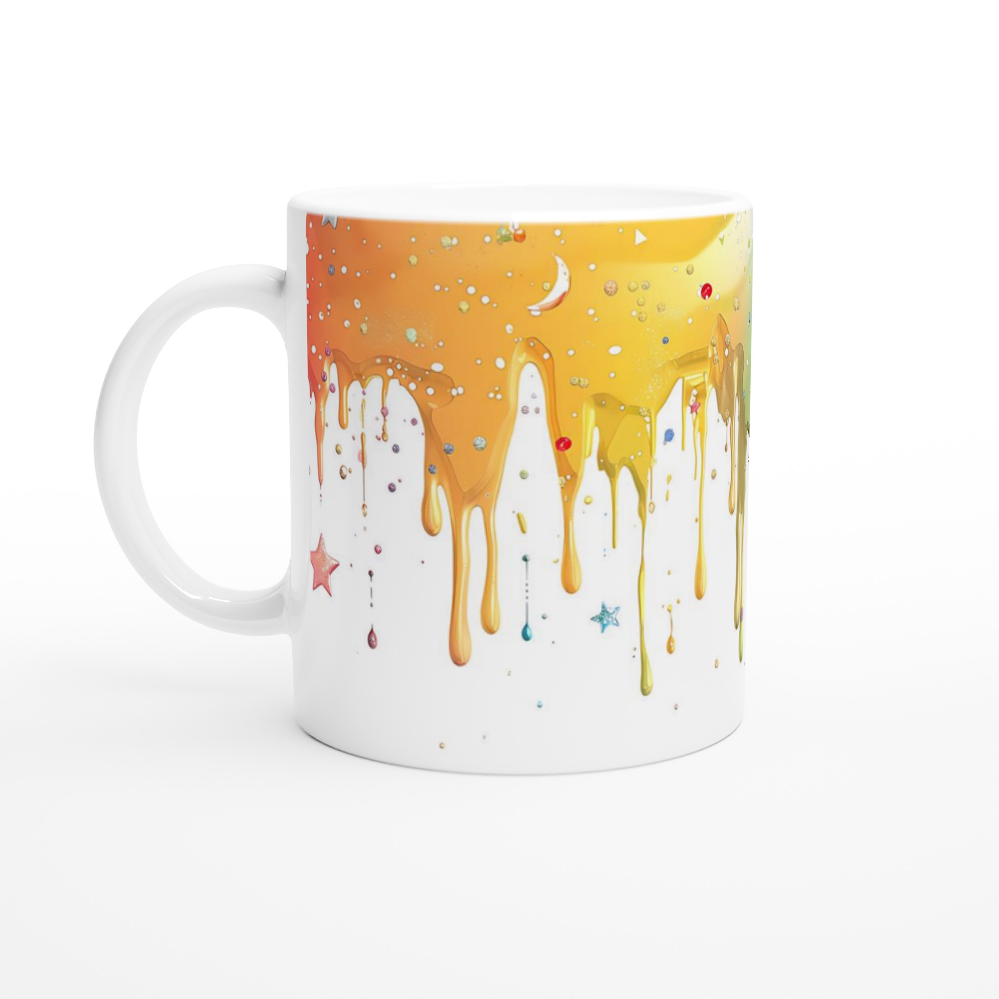 Låt varje kaffestund förvandlas till en färgdröm! Med vår 11 oz keramikmugg bjuder du in regnbågens skimrande droppar och stjärnornas gnistrande magi till din vardag. Den blanka vita ytan lyfter fram knivskarpa, livfulla tryck – från personliga citat och konstverk till glada hälsningar som sprider leenden.