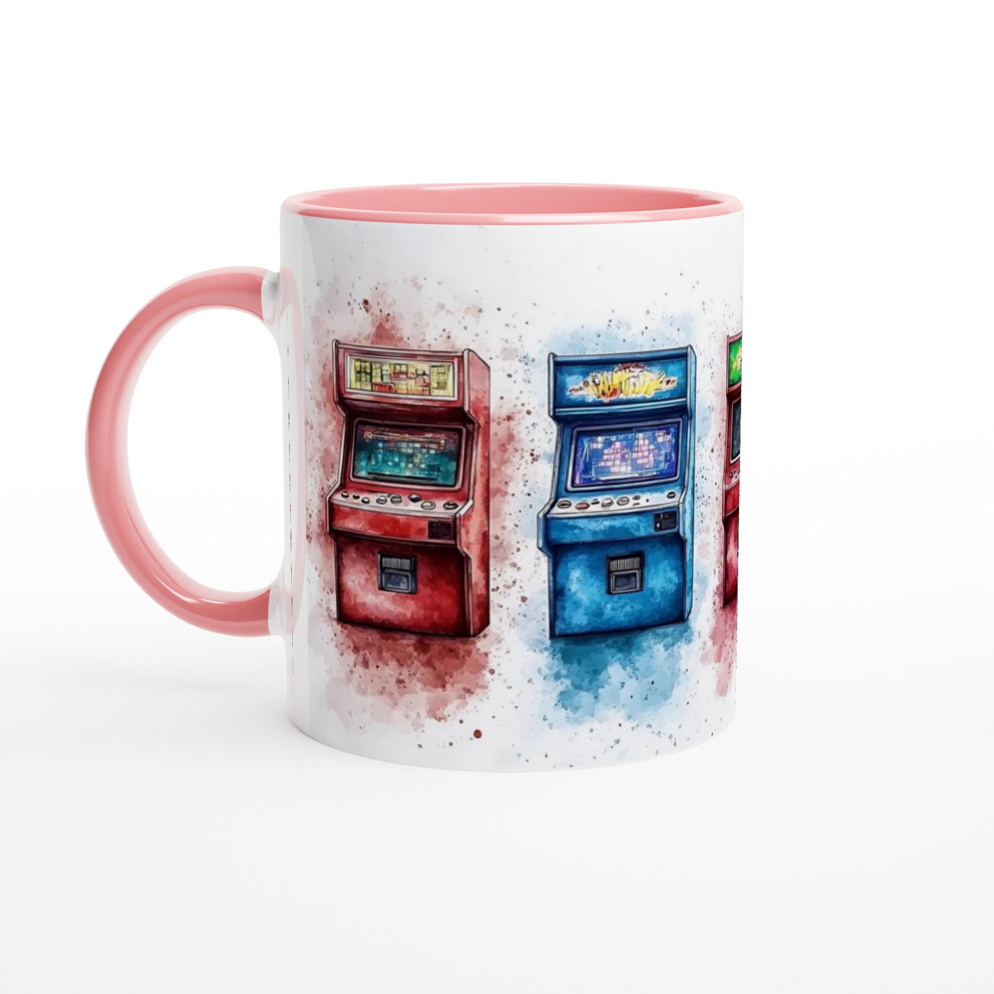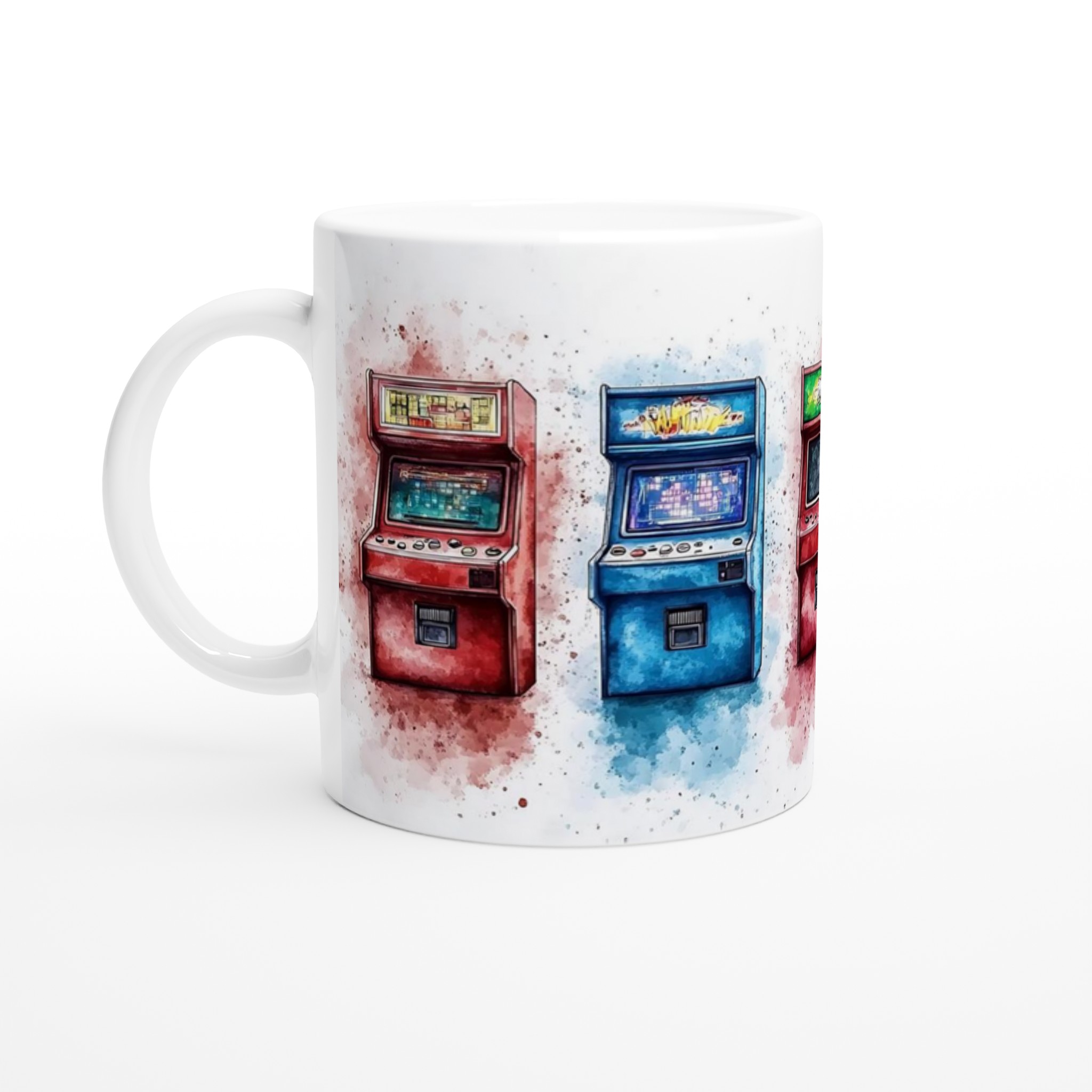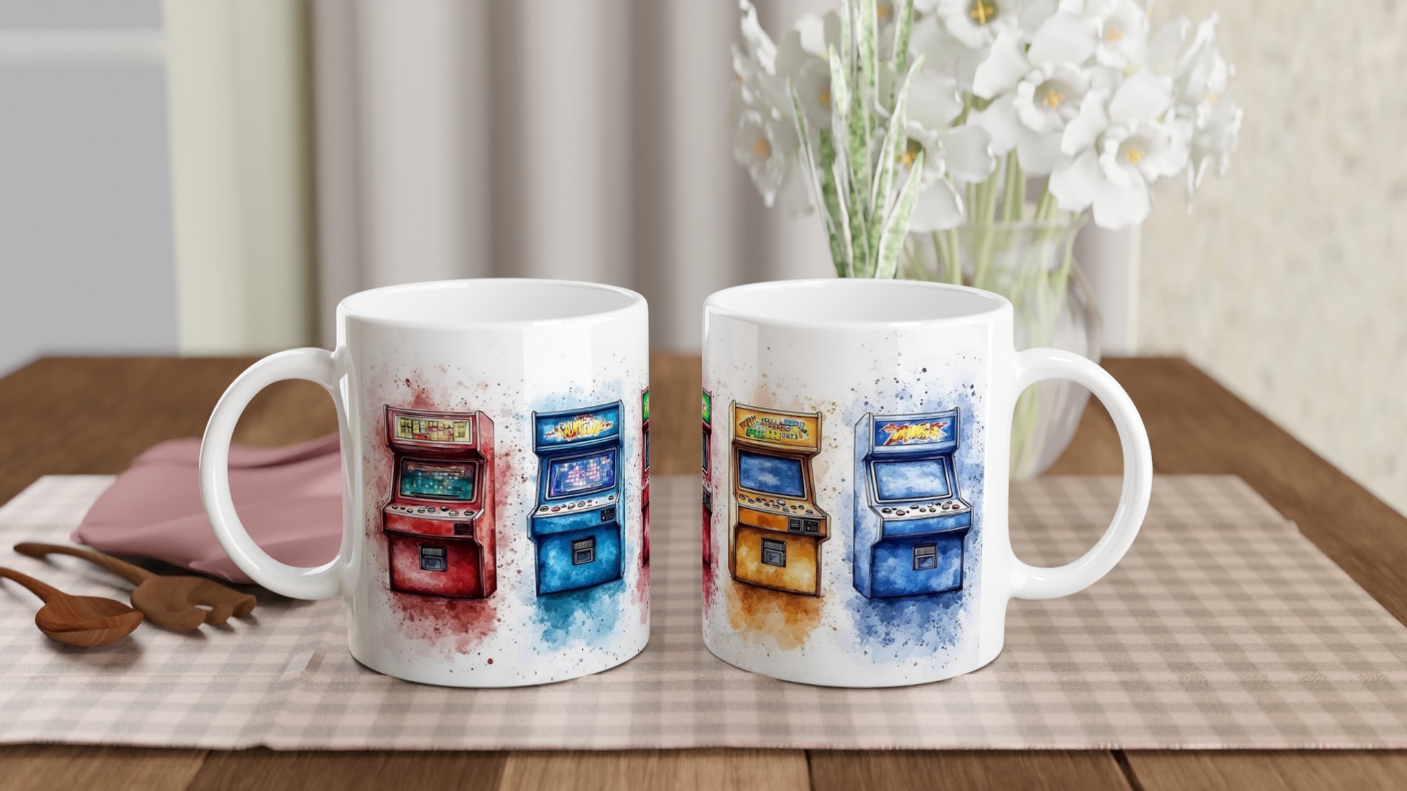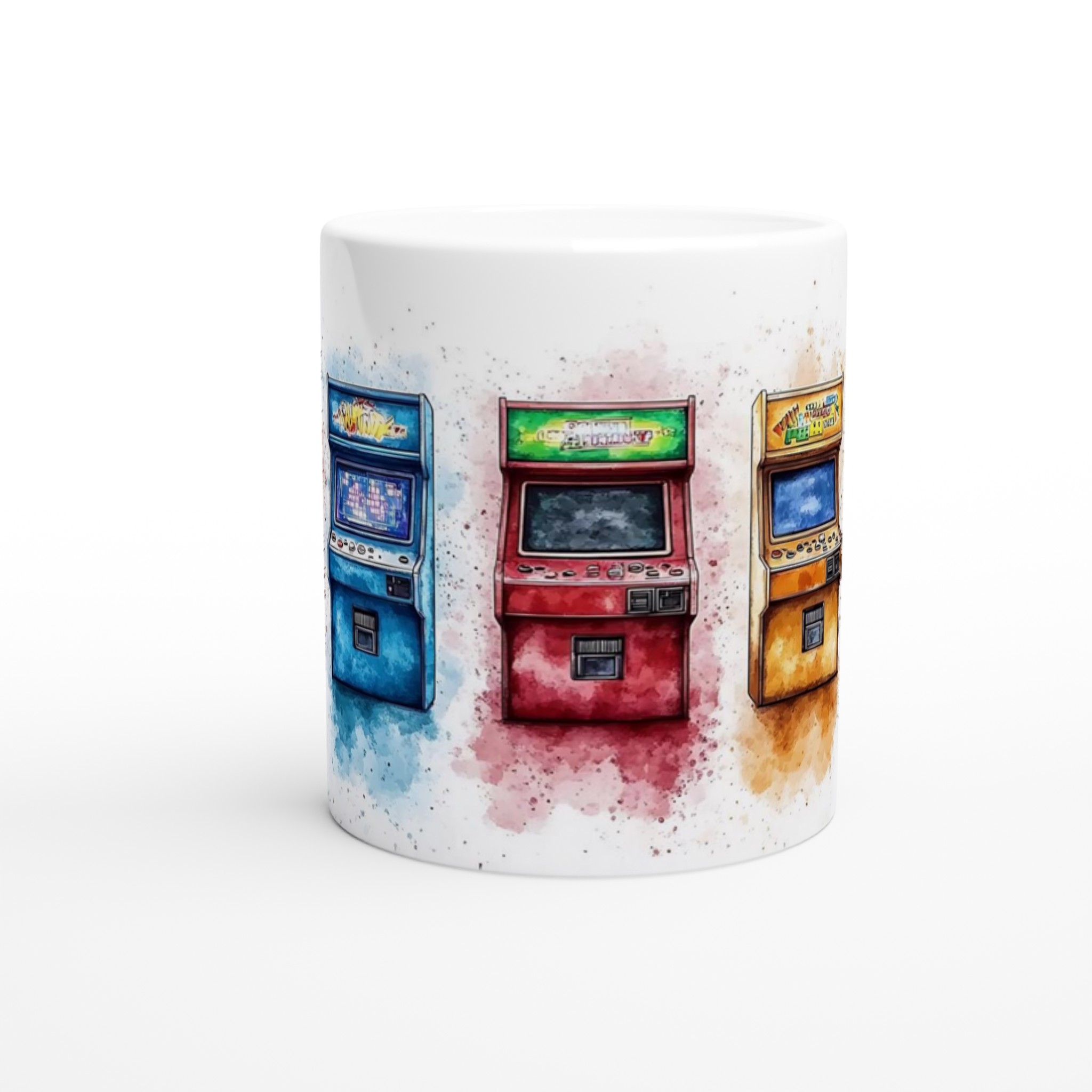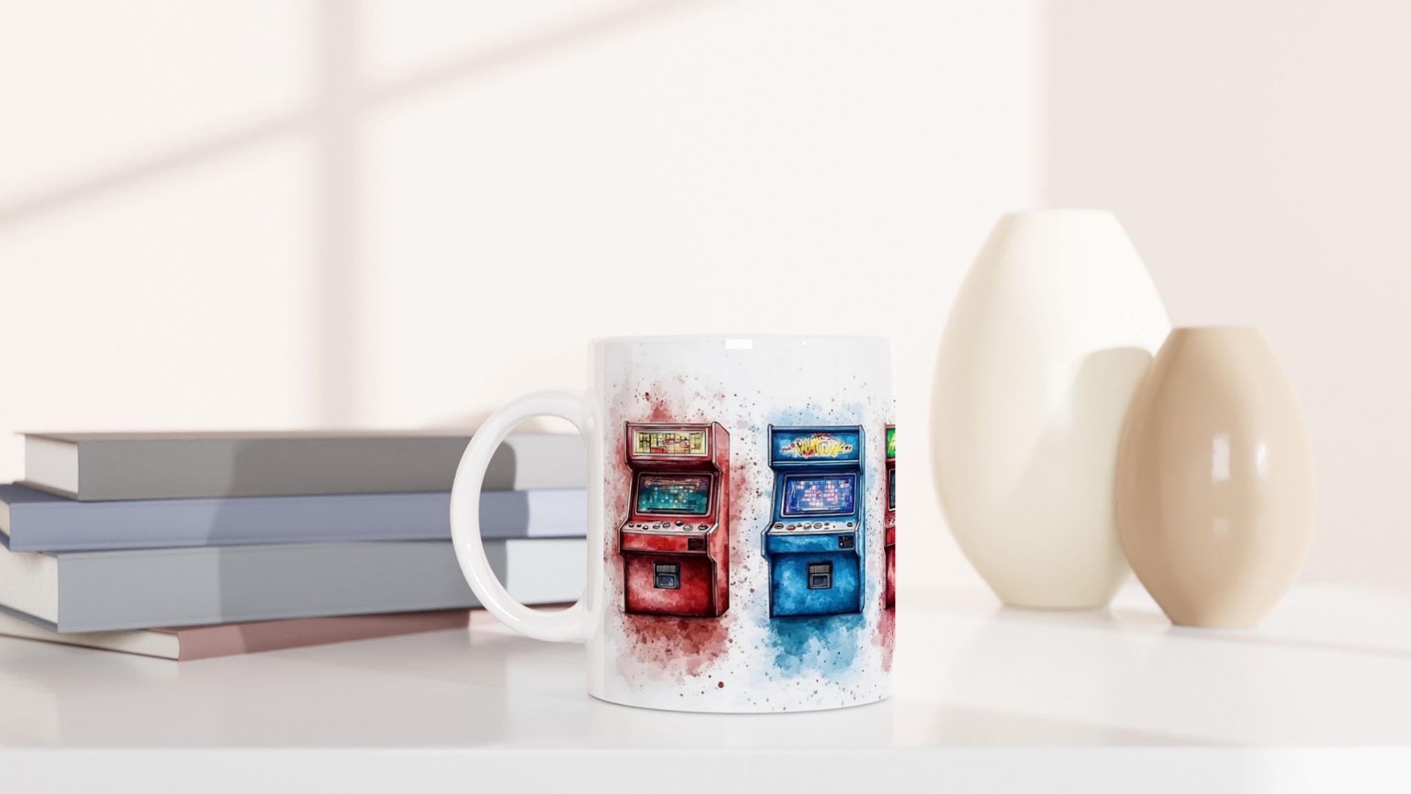 Den blanka vita ytan ger ett skarpt och levande tryck som verkligen sticker ut, oavsett om det är en personlig design, ett roligt citat eller en present till någon du tycker om. Inspirerad av de ikoniska arkadspelen från förr, ger denna mugg en touch av nostalgisk lekfullhet till din vardag. Med en färgstark akvarelldesign av klassiska arkadmaskiner är den perfekt för alla retro-entusiaster och gamers.