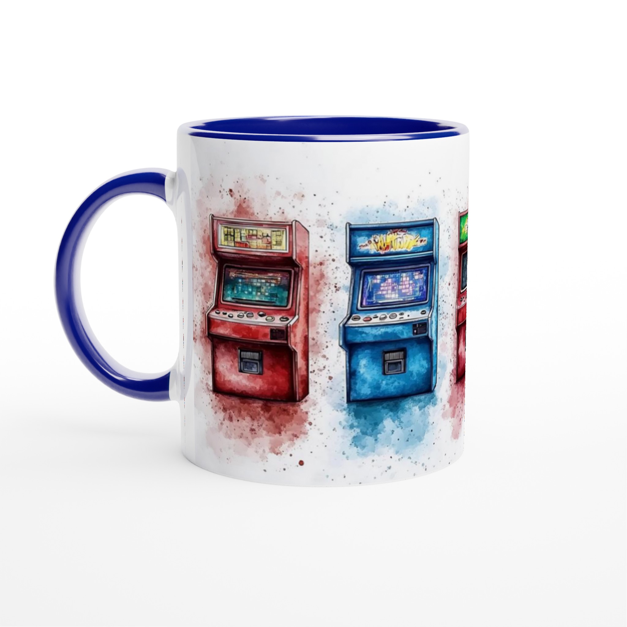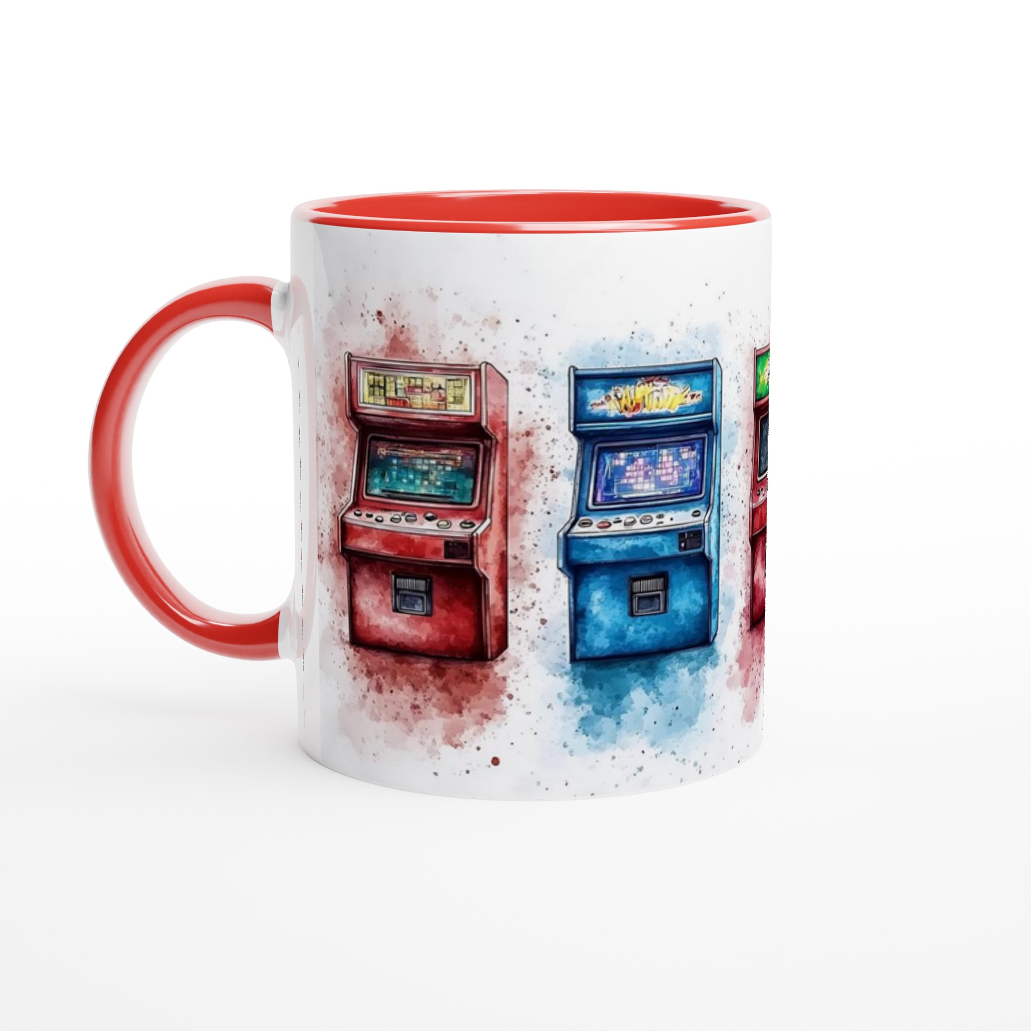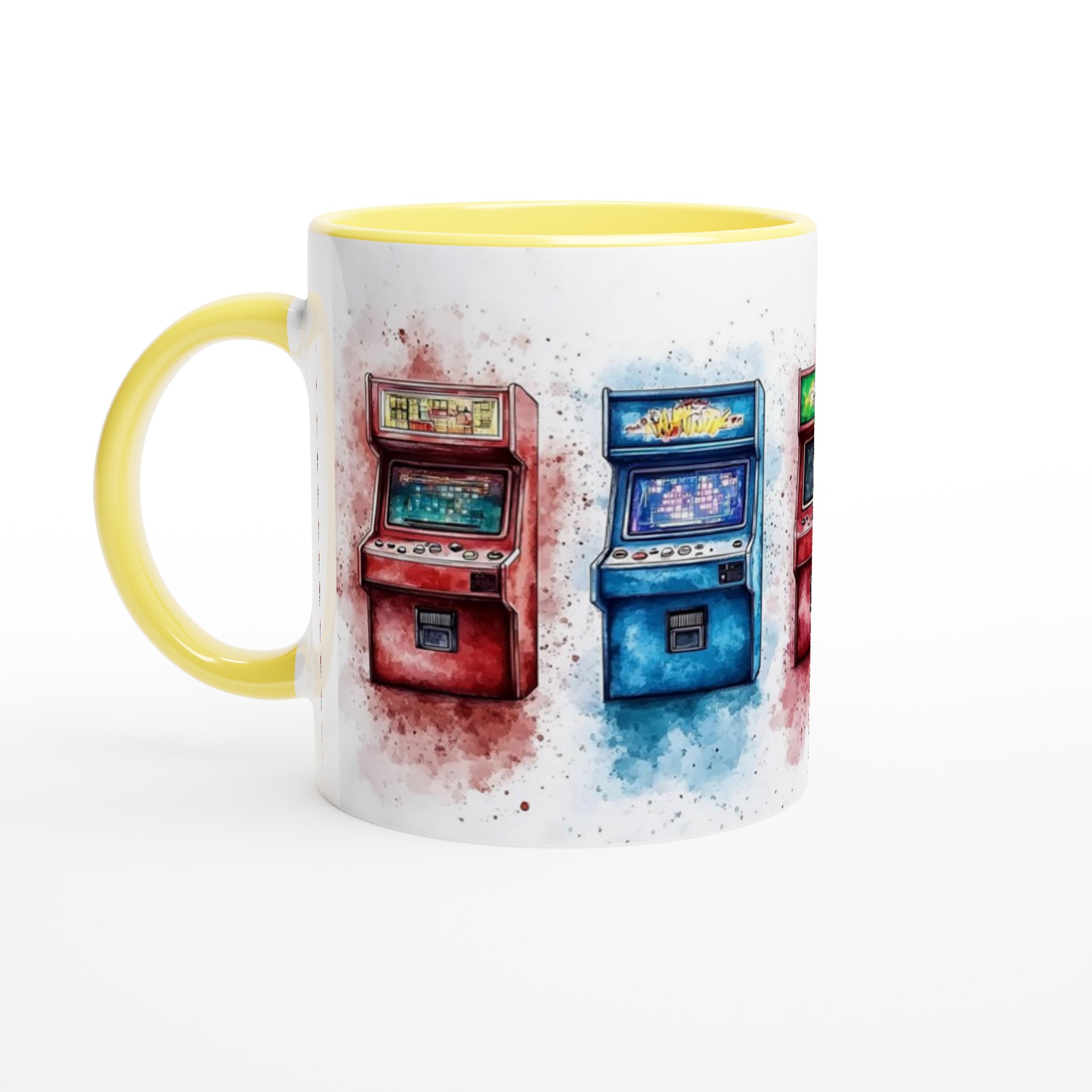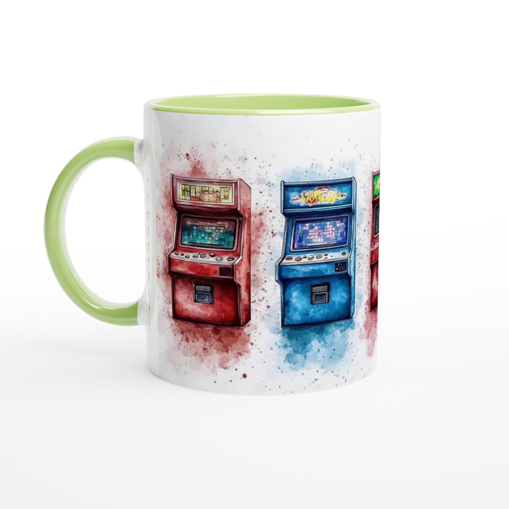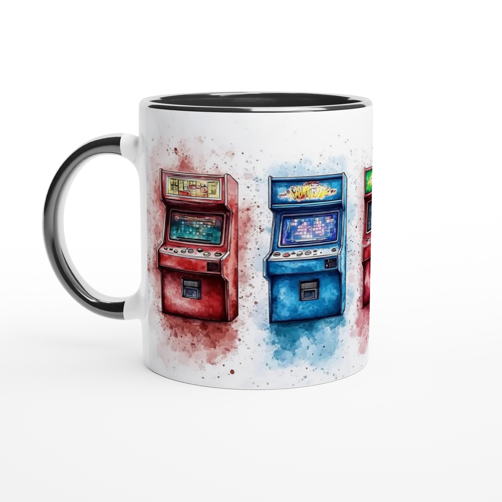 Den blanka vita ytan ger ett skarpt och levande tryck som verkligen sticker ut, oavsett om det är en personlig design, ett roligt citat eller en present till någon du tycker om. Inspirerad av de ikoniska arkadspelen från förr, ger denna mugg en touch av nostalgisk lekfullhet till din vardag. Med en färgstark akvarelldesign av klassiska arkadmaskiner är den perfekt för alla retro-entusiaster och gamers.
