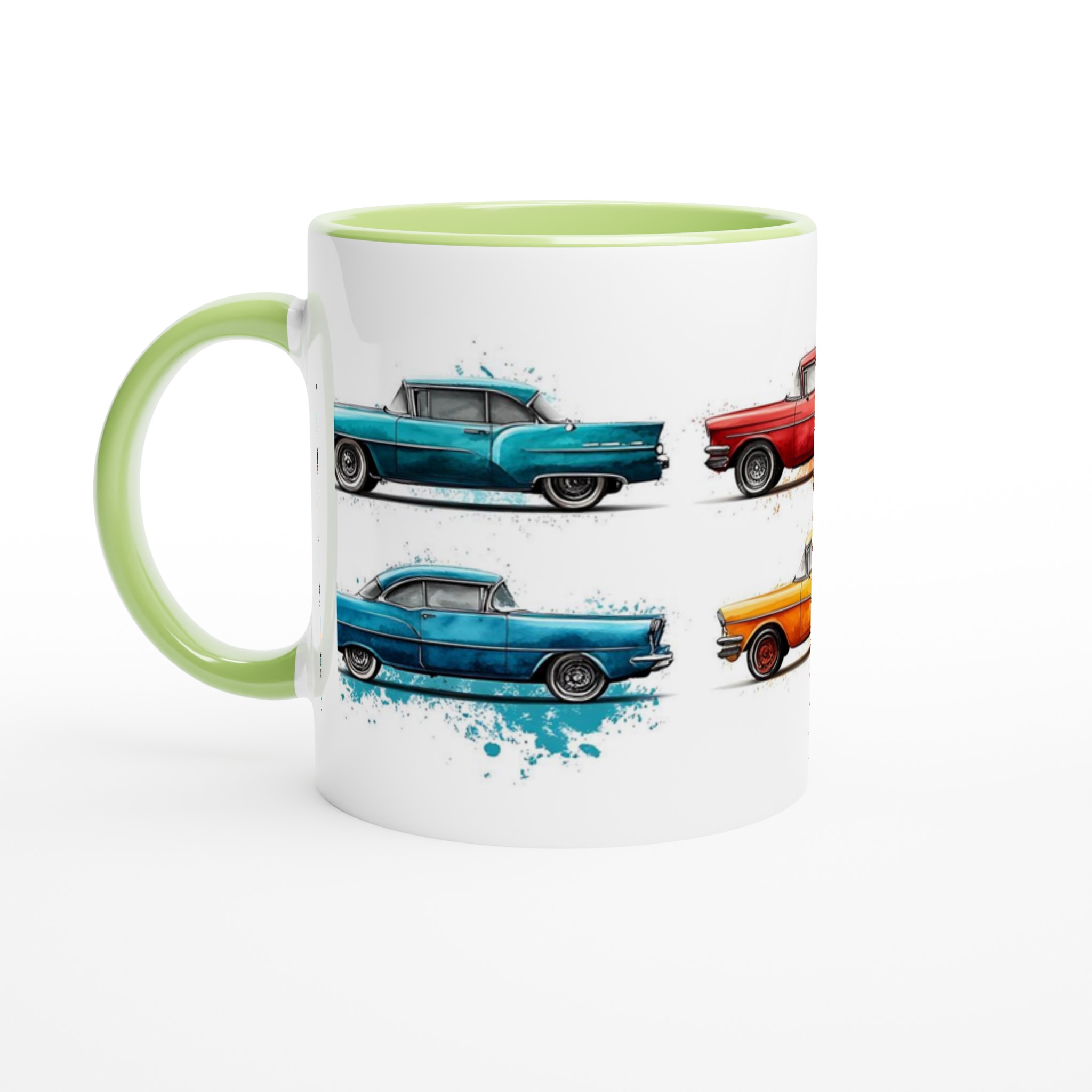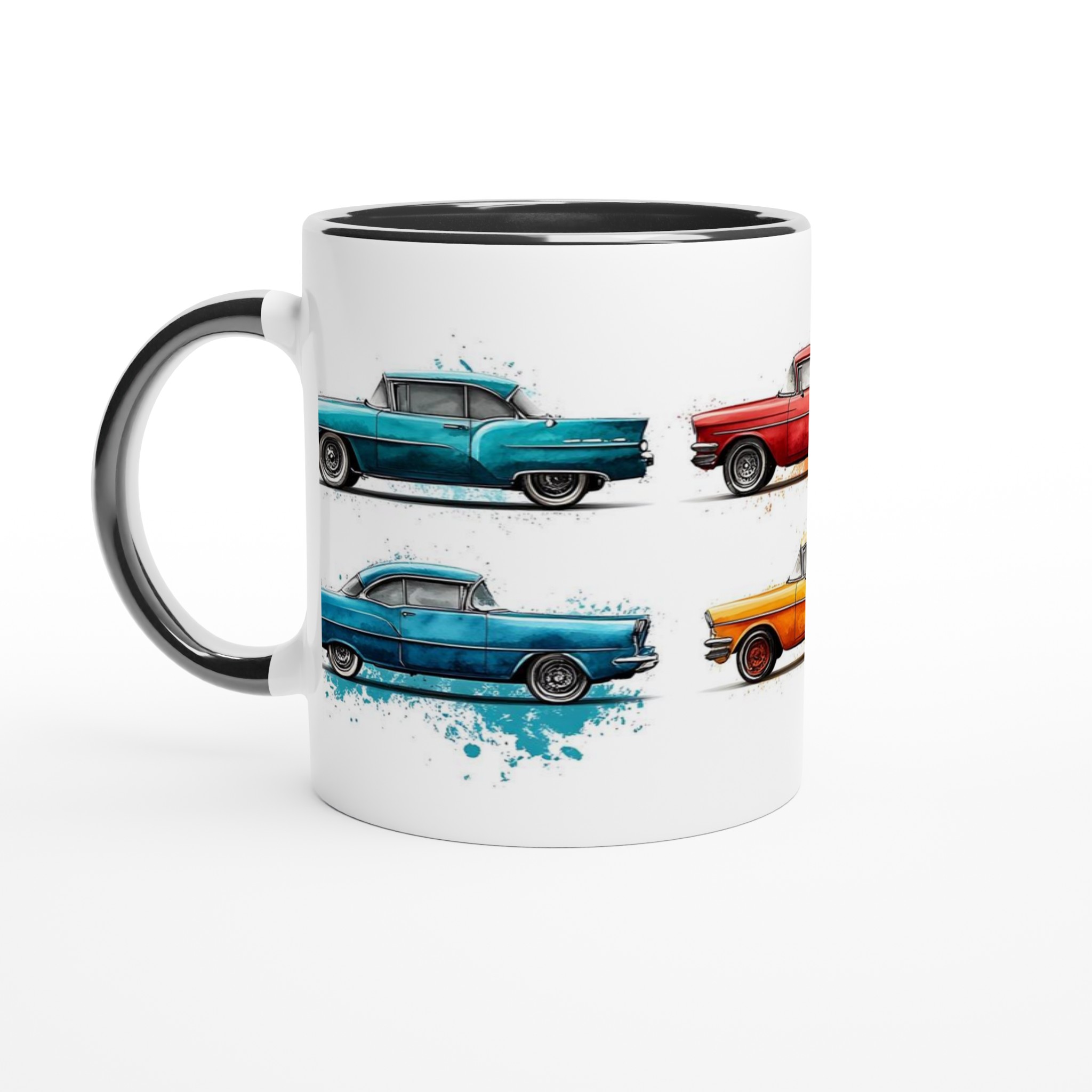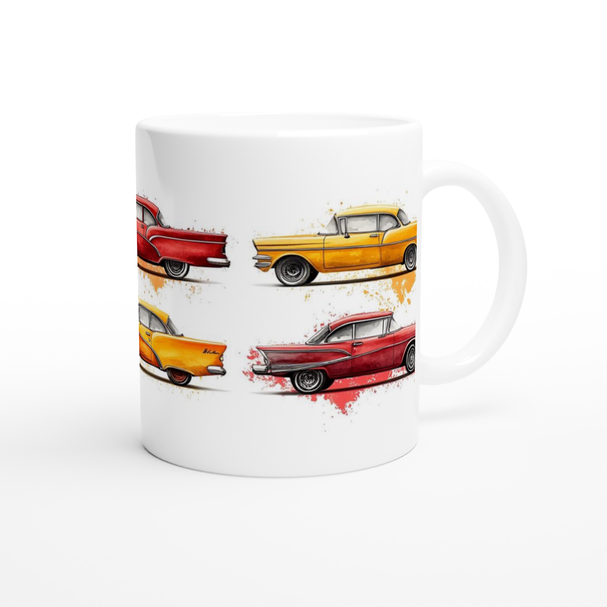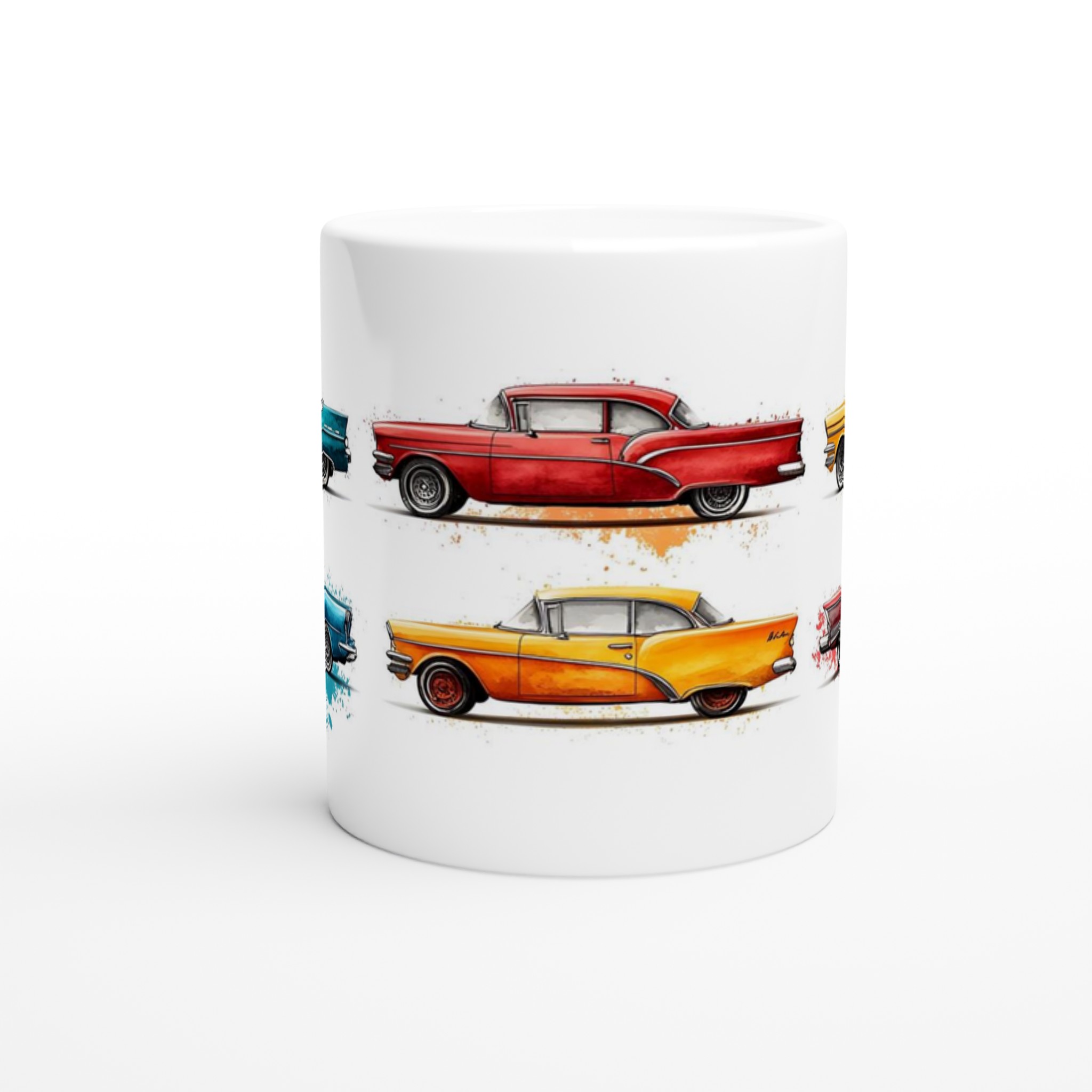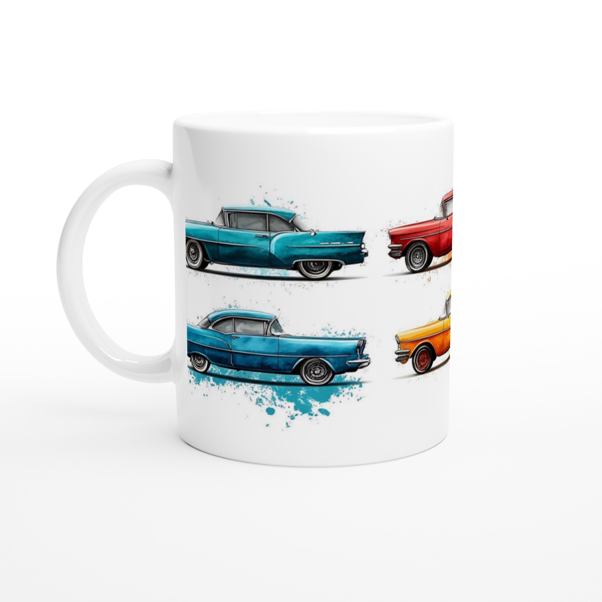 Fånga den nostalgiska charmen från 50-talet varje gång du tar en klunk med vår Retro Bil Keramikmugg! Denna unika mugg pryds av klassiska vintagebilar, levandegjorda med en konstnärlig akvarellkänsla och stänk av färg som ger varje bil sin egen personlighet. Perfekt för morgonkaffet, kvällens varma choklad eller när du bara vill njuta av en kopp te.