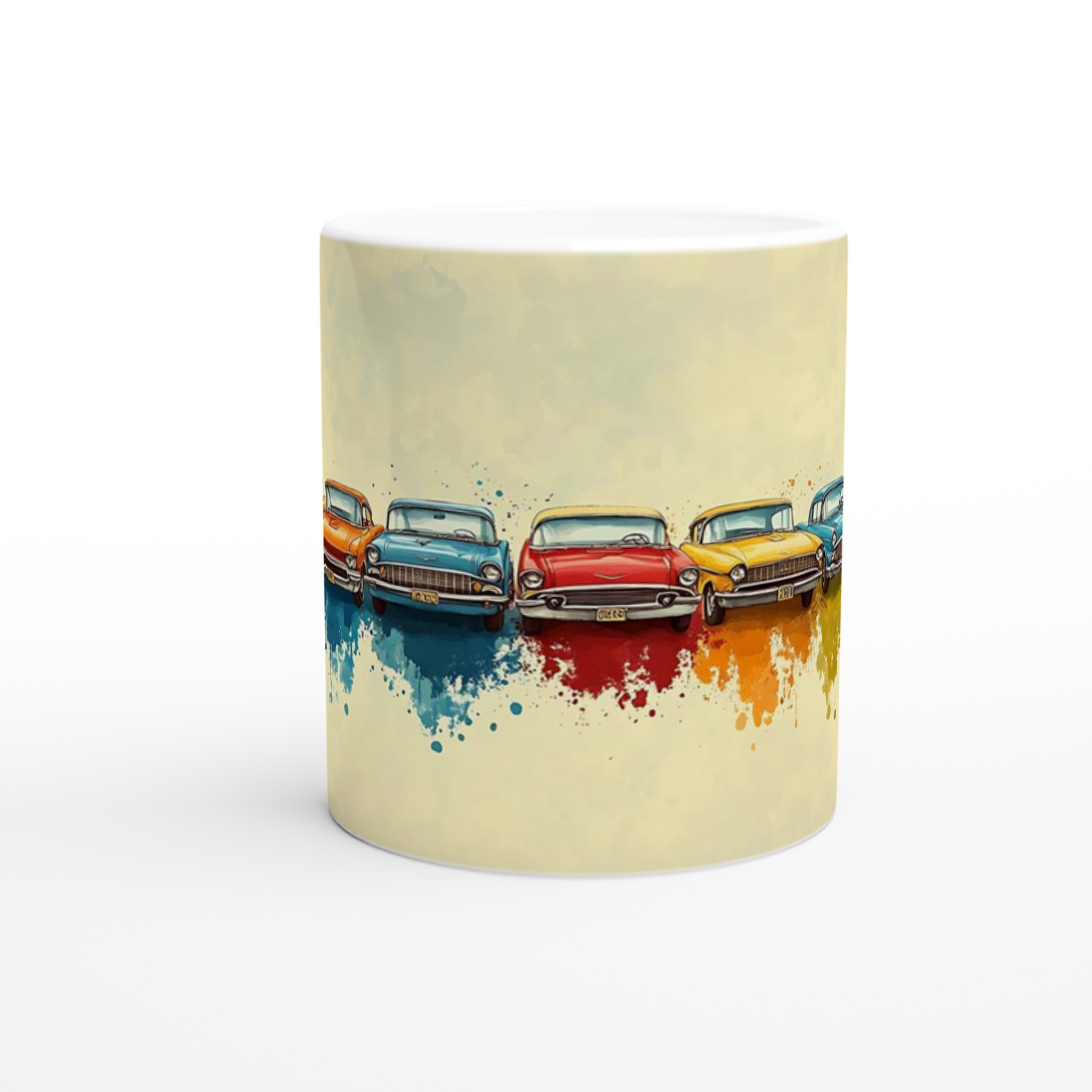 Inspirerad av den livfulla retrokänslan från ikoniska bilar, fångar denna mugg ögonblicket med en akvarell-stil som sprudlar av färg. Den blanka vita ytan ger ett skarpt och levande tryck som verkligen sticker ut, oavsett om det är en personlig design, ett roligt citat eller en present till någon du tycker om.