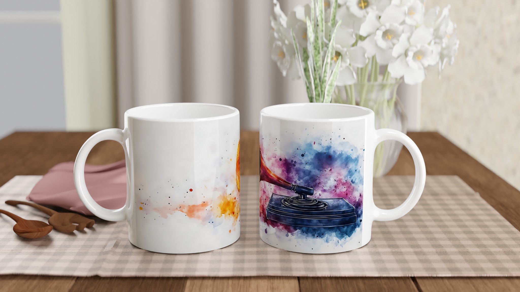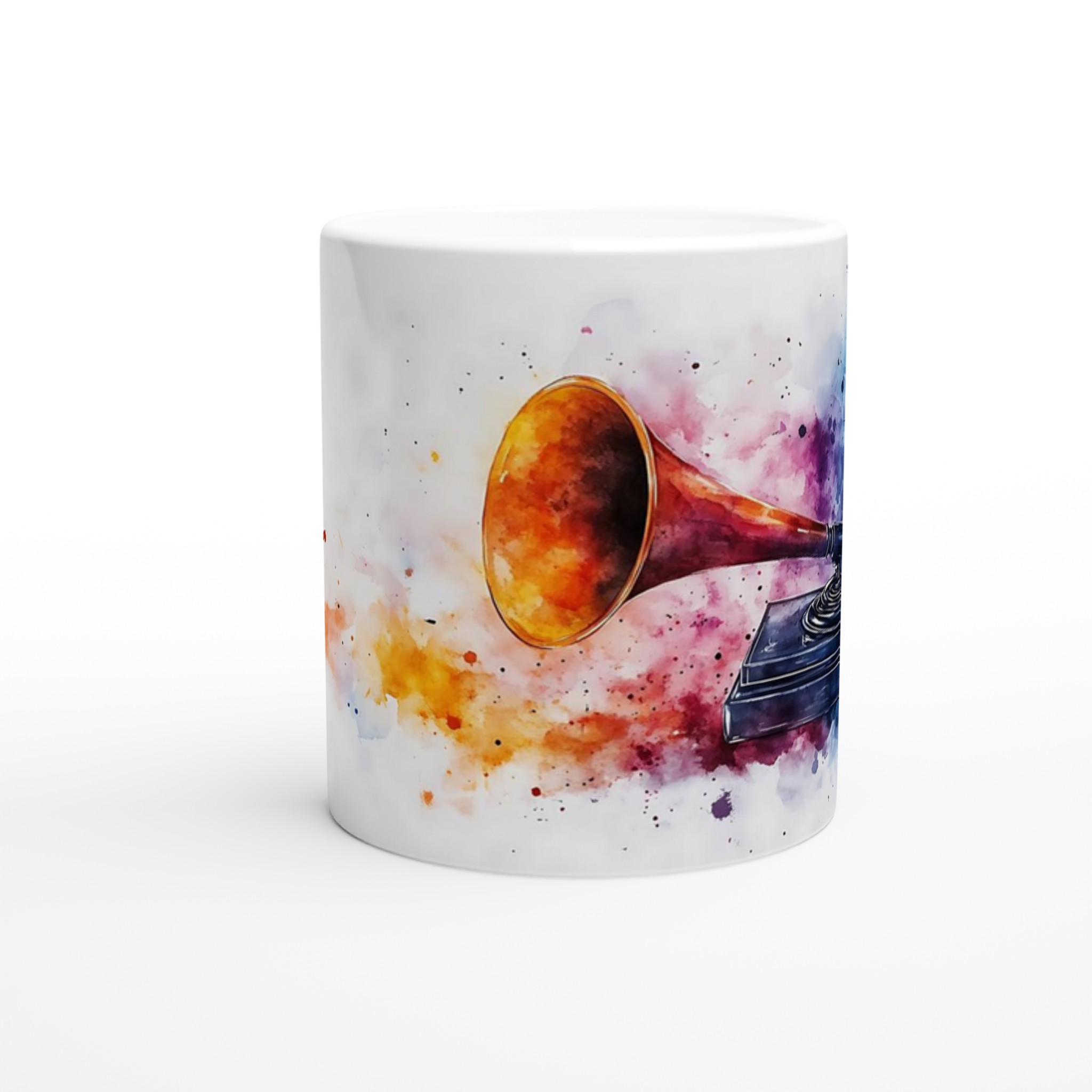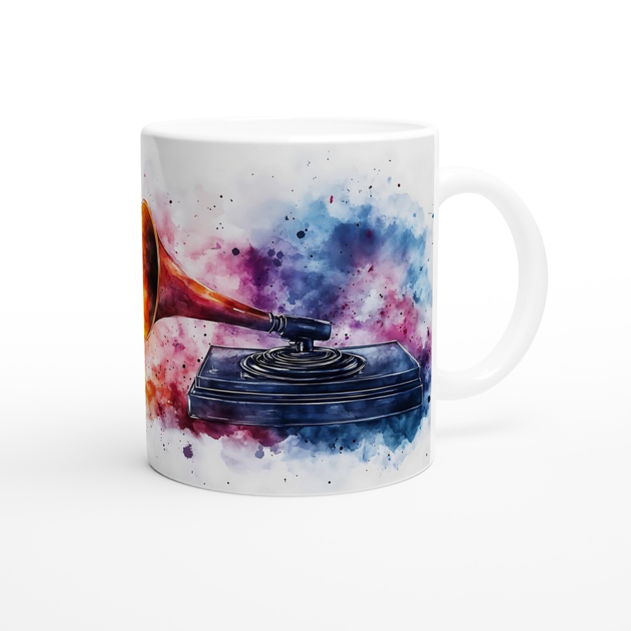 Fånga musiken och konsten i ett ögonblick med vår unika retro grammofon keramiska mugg. Denna stilrena mugg är mer än bara en kopp – den är en konstnärlig hyllning till ljudets gyllene era, omgiven av en levande explosion av akvarellfärger som fångar ögat och värmer själen. Perfekt för morgonkaffet, kvällens varma choklad eller när du bara vill njuta av en kopp te medan du drömmer dig bort till svunna tiders toner.
