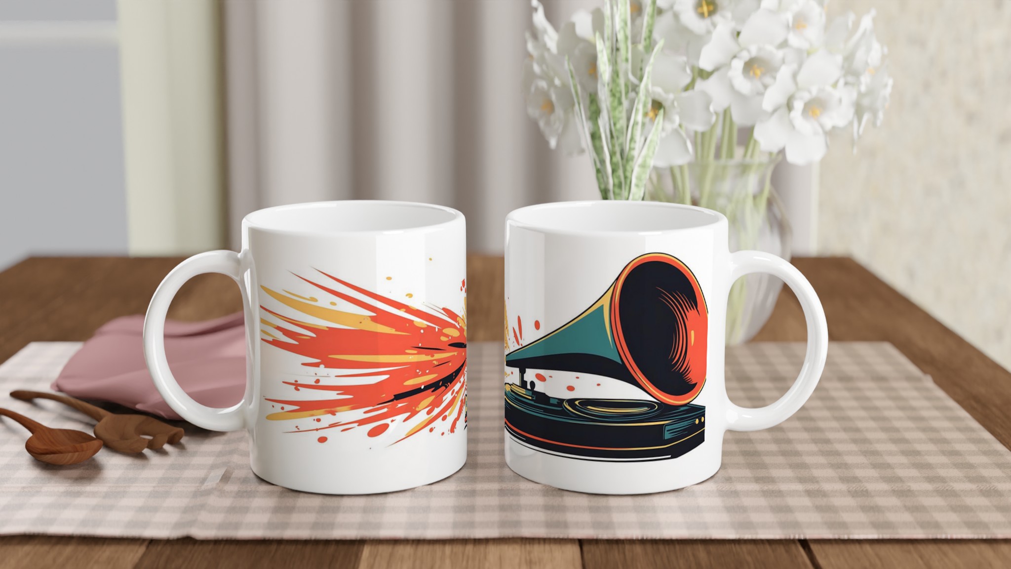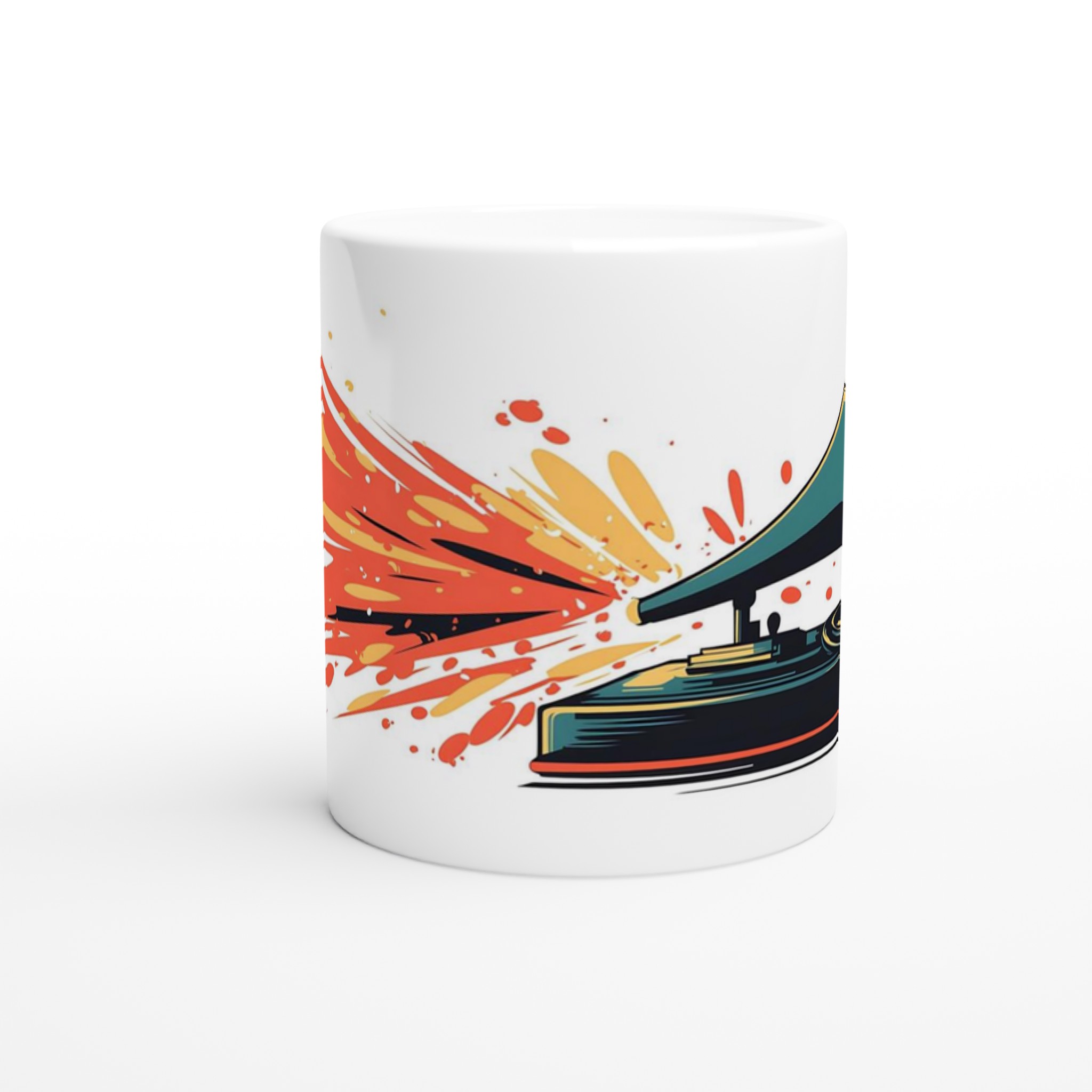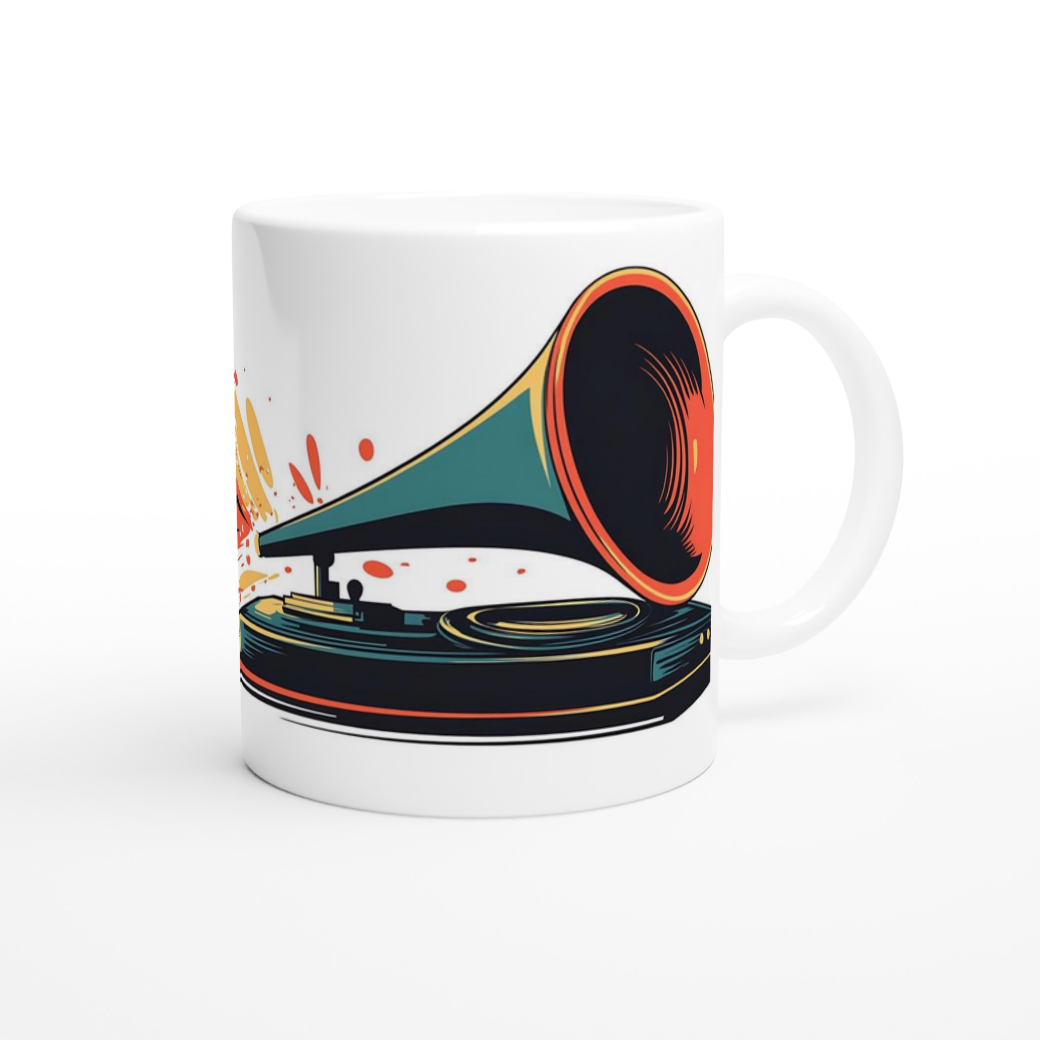 Fånga den nostalgiska charmen och de pulserande färgerna med denna unika keramiska mugg, prydd med en livlig retro grammofon som sprutar ut musikaliska explosioner av rött, orange och gult. Den här stilrena keramiska muggen blir snabbt en vardagsfavorit. Perfekt för morgonkaffet, kvällens varma choklad eller när du bara vill njuta av en kopp te. Den blanka vita ytan gör att trycken framhävs med klara och levande färger, som håller sig fina även efter många turer i mikron och diskmaskinen.