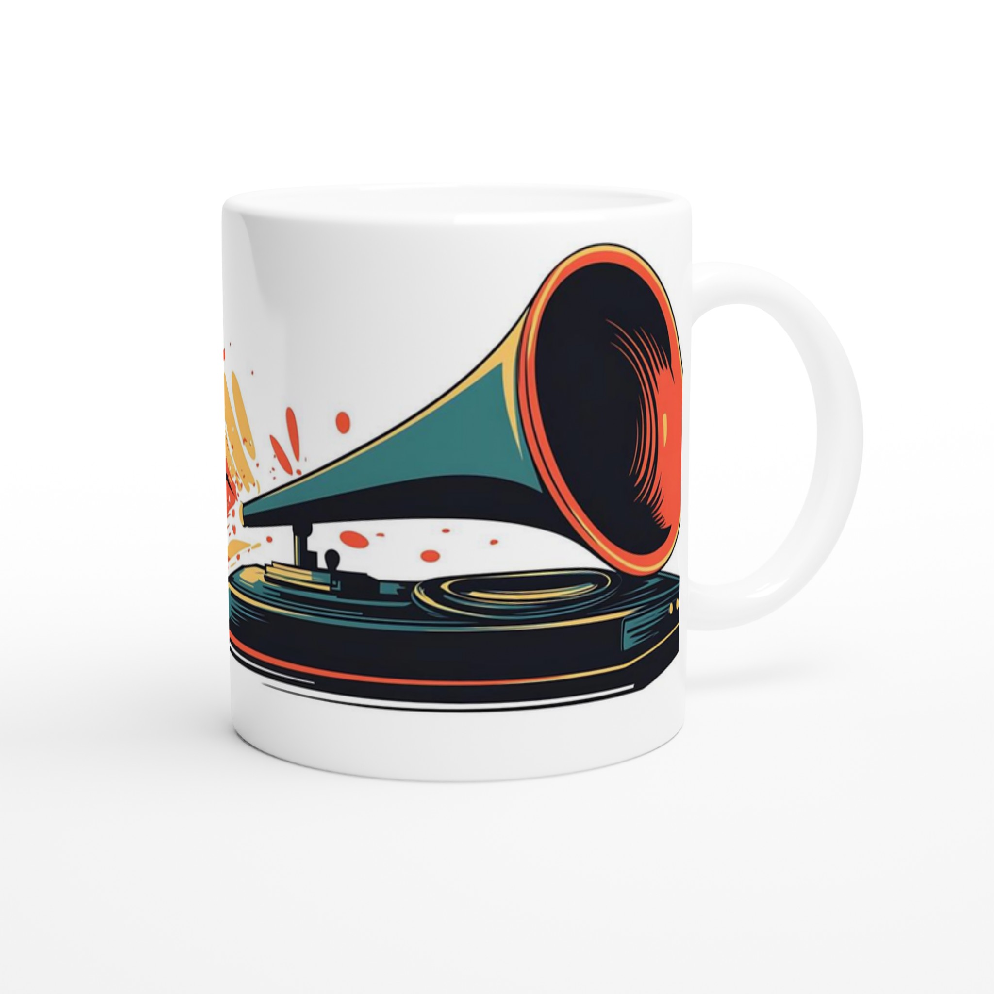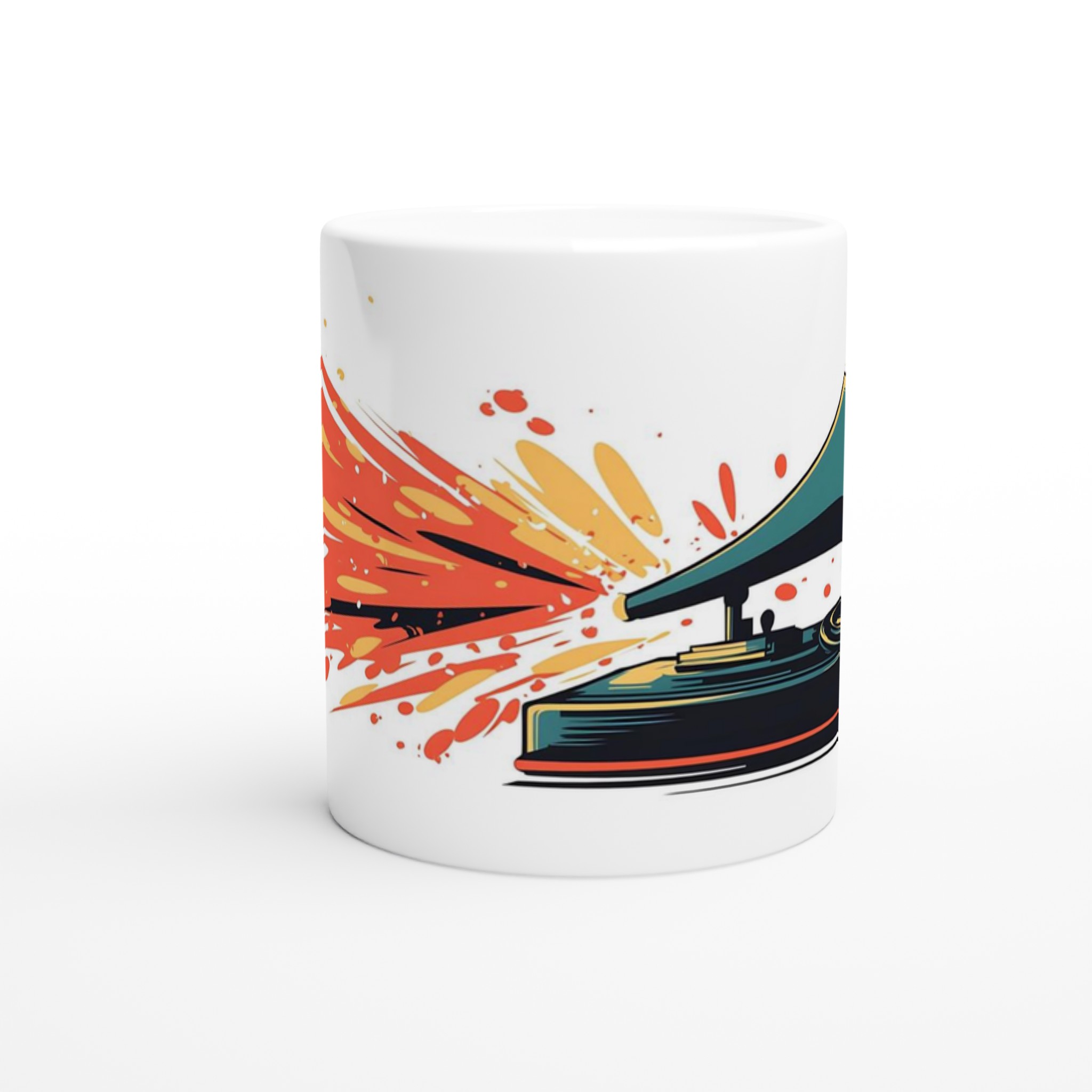 Låt musiken flöda och färgerna explodera med vår unika mugg som fångar energin från en retro grammofon i full gång. Denna design, med sina ljusstarka och dynamiska färger som ”strålar” ut från grammofonen, är perfekt för musikälskaren eller den som uppskattar en touch av retrokänsla och lekfullhet i vardagen. Den blanka vita ytan ger ett skarpt och levande tryck som verkligen sticker ut, oavsett om det är en personlig design, ett roligt citat eller en present till någon du tycker om.