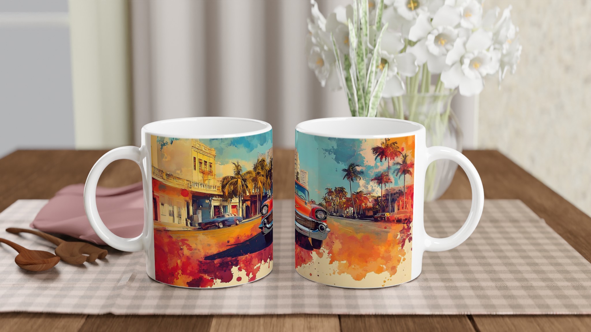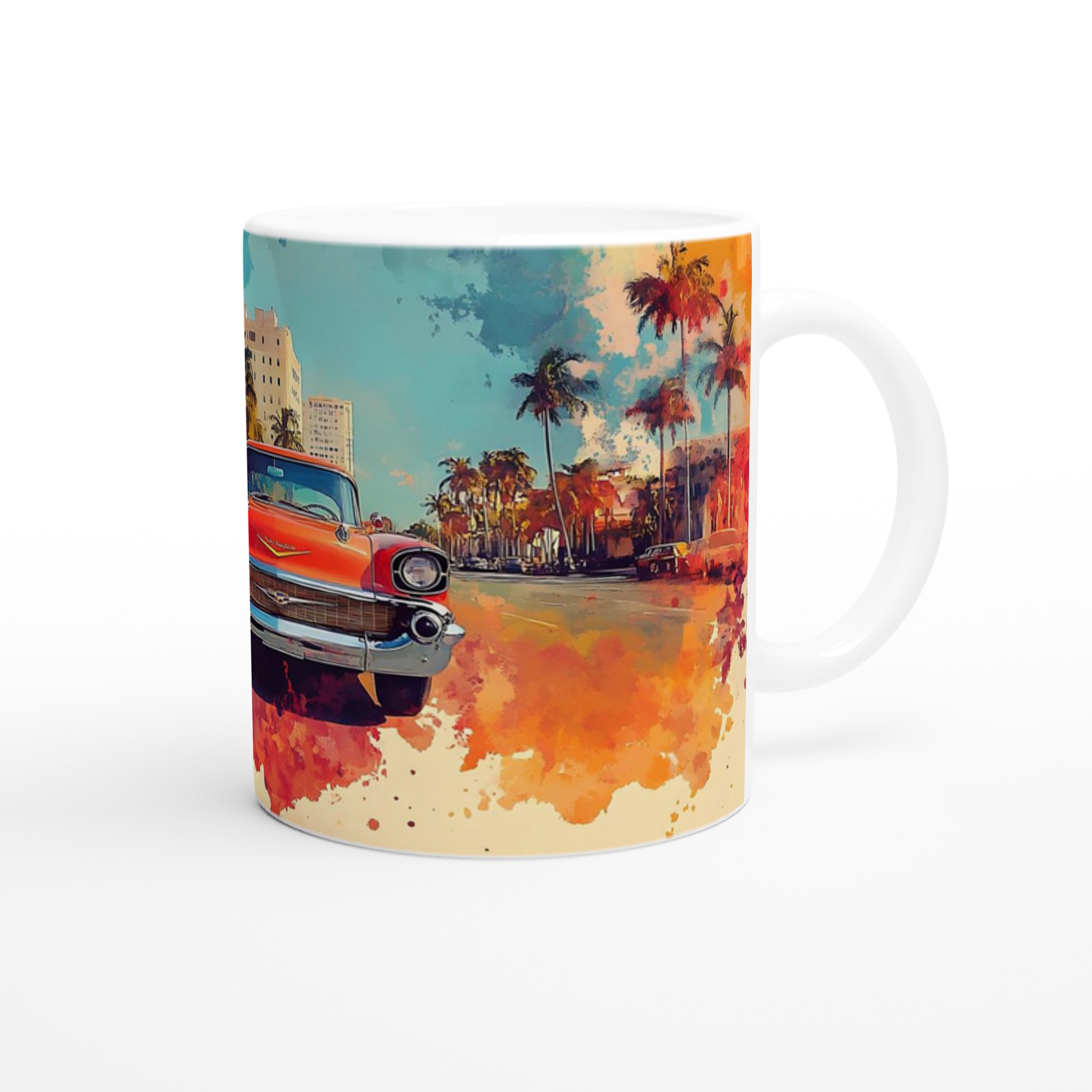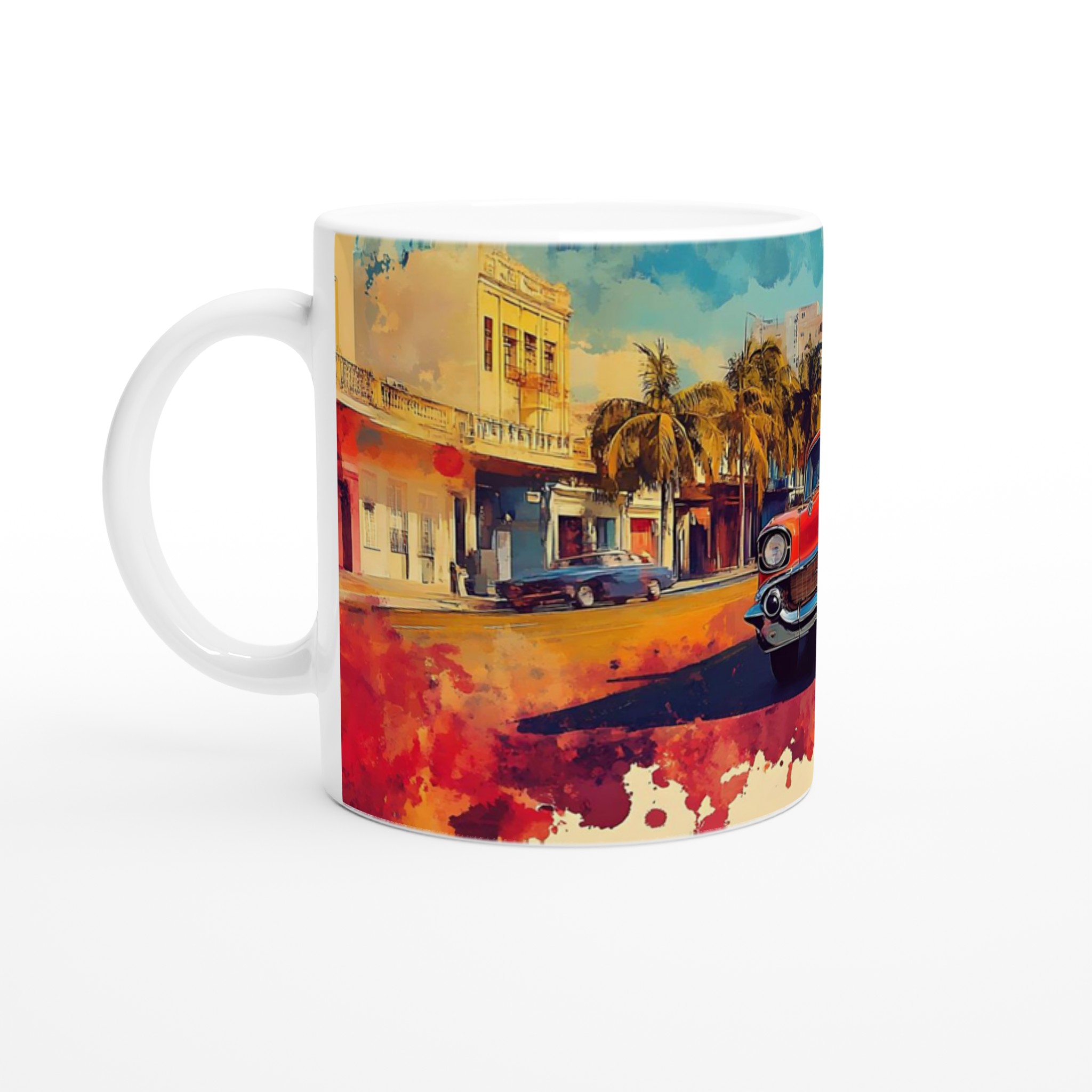 Fånga känslan av soliga gator och tidlös charm med vår keramiska mugg, prydd med en konstnärlig akvarellbild av en klassisk bil i en livlig stadsmiljö. Denna unika design, med sina varma nyanser och dynamiska penseldrag, förvandlar varje sipp till en liten resa. Den blir snabbt en vardagsfavorit – perfekt för morgonkaffet, kvällens varma choklad eller när du bara vill njuta av en kopp te.