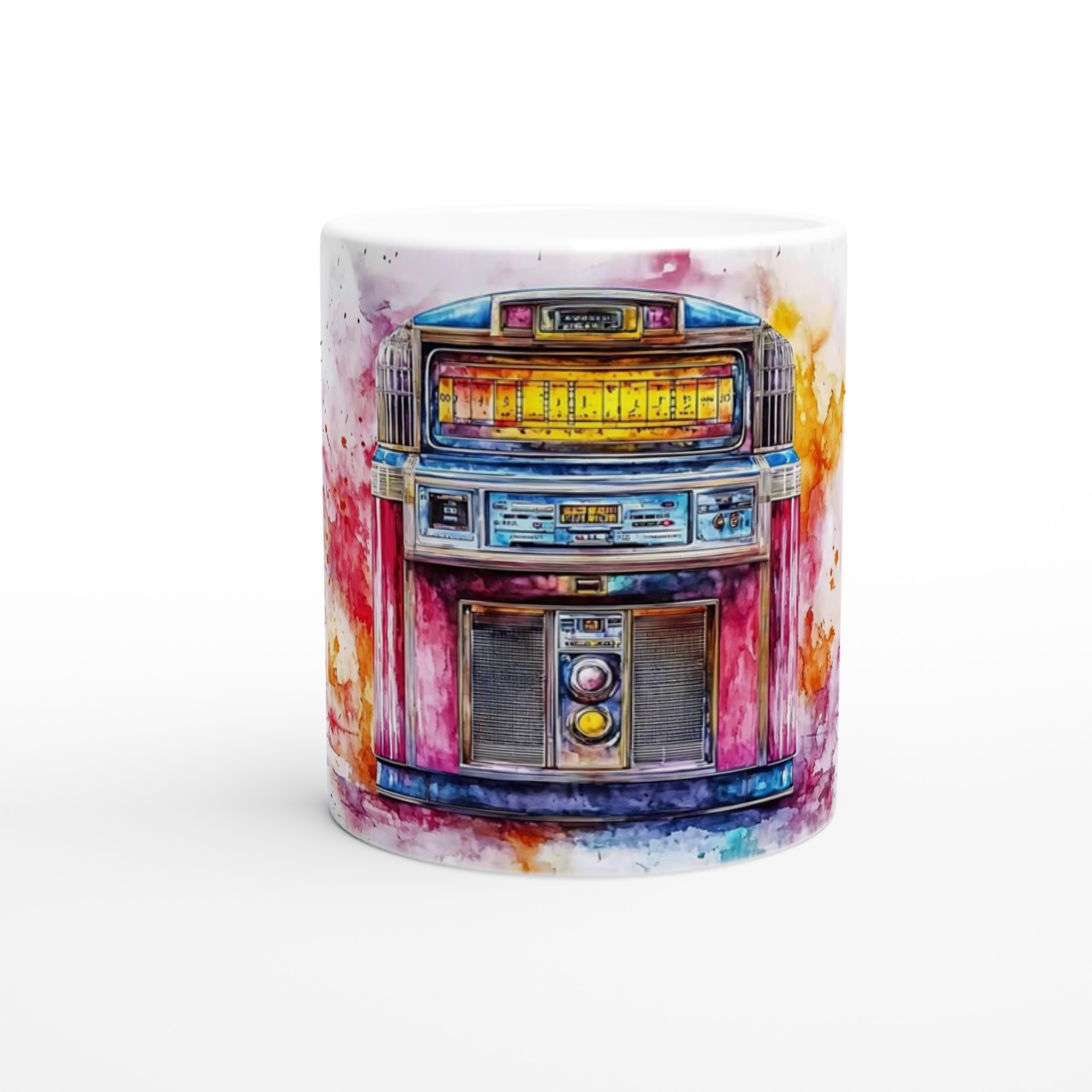Lyft varje kaffestund med vår premium keramikmugg – stilren, hållbar och skapad för att låta ditt motiv glänsa. Denna unika mugg fångar den nostalgiska charmen hos en klassisk jukebox, återgiven i en levande akvarellstil som sprudlar av färg och liv. Varje klunk blir en resa tillbaka till svunna tider, fylld med musik och glädje. Den blanka vita ytan ger ett skarpt och levande tryck som verkligen sticker ut, oavsett om det är en personlig design, ett roligt citat eller en present till någon du tycker om.