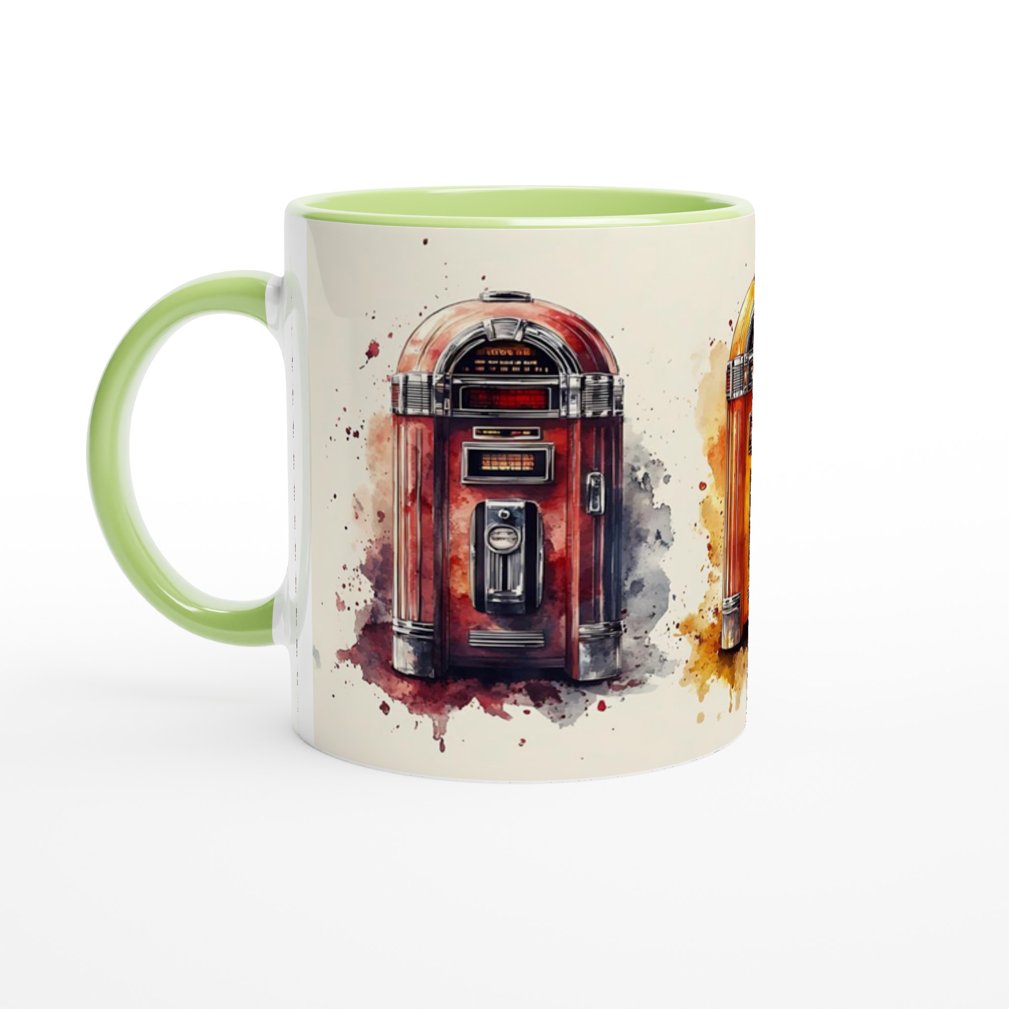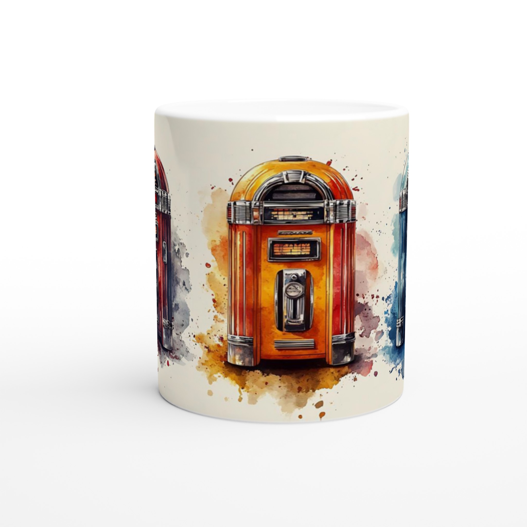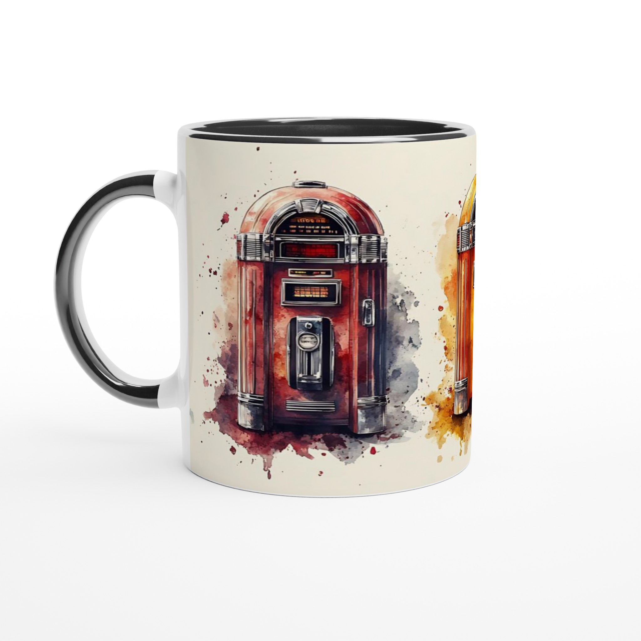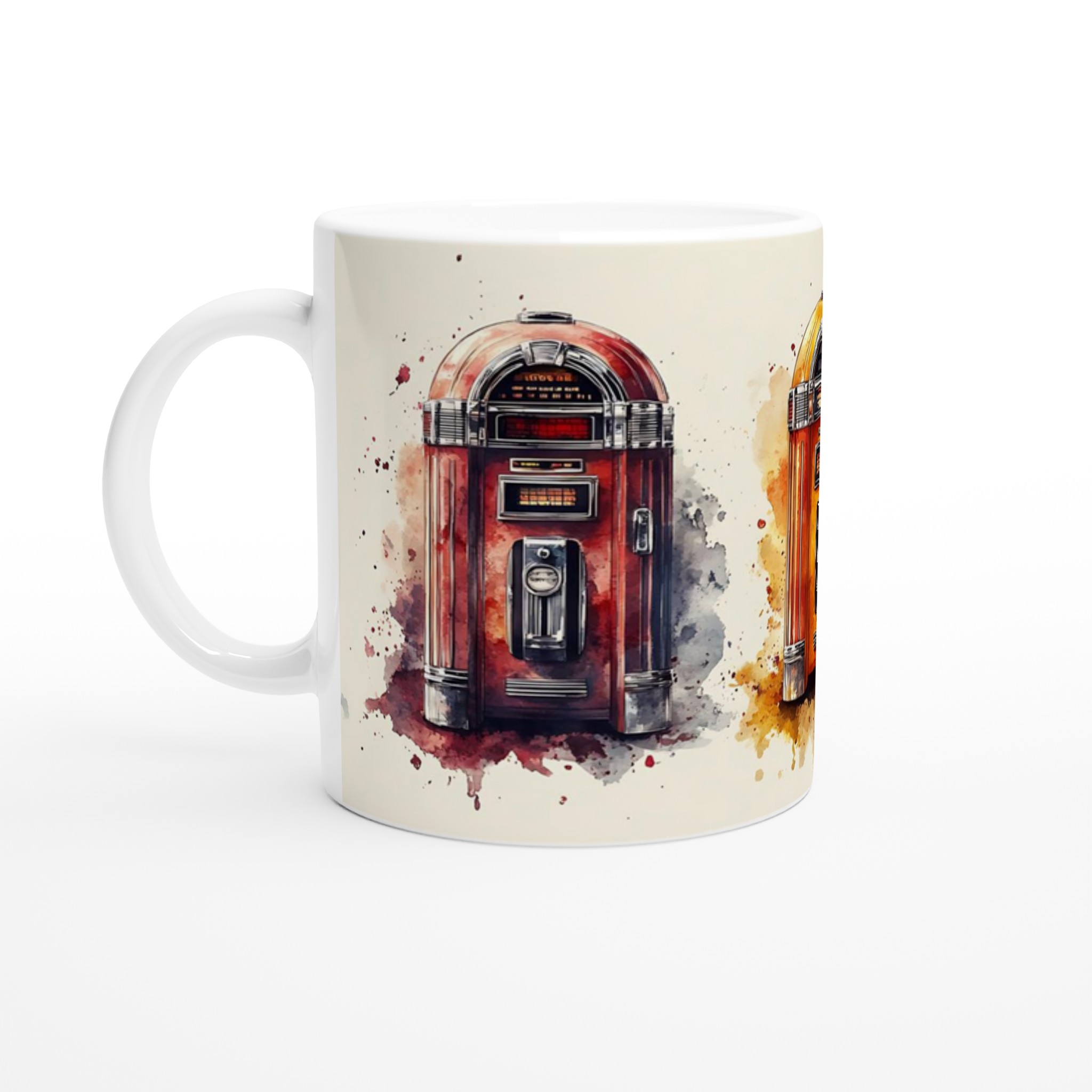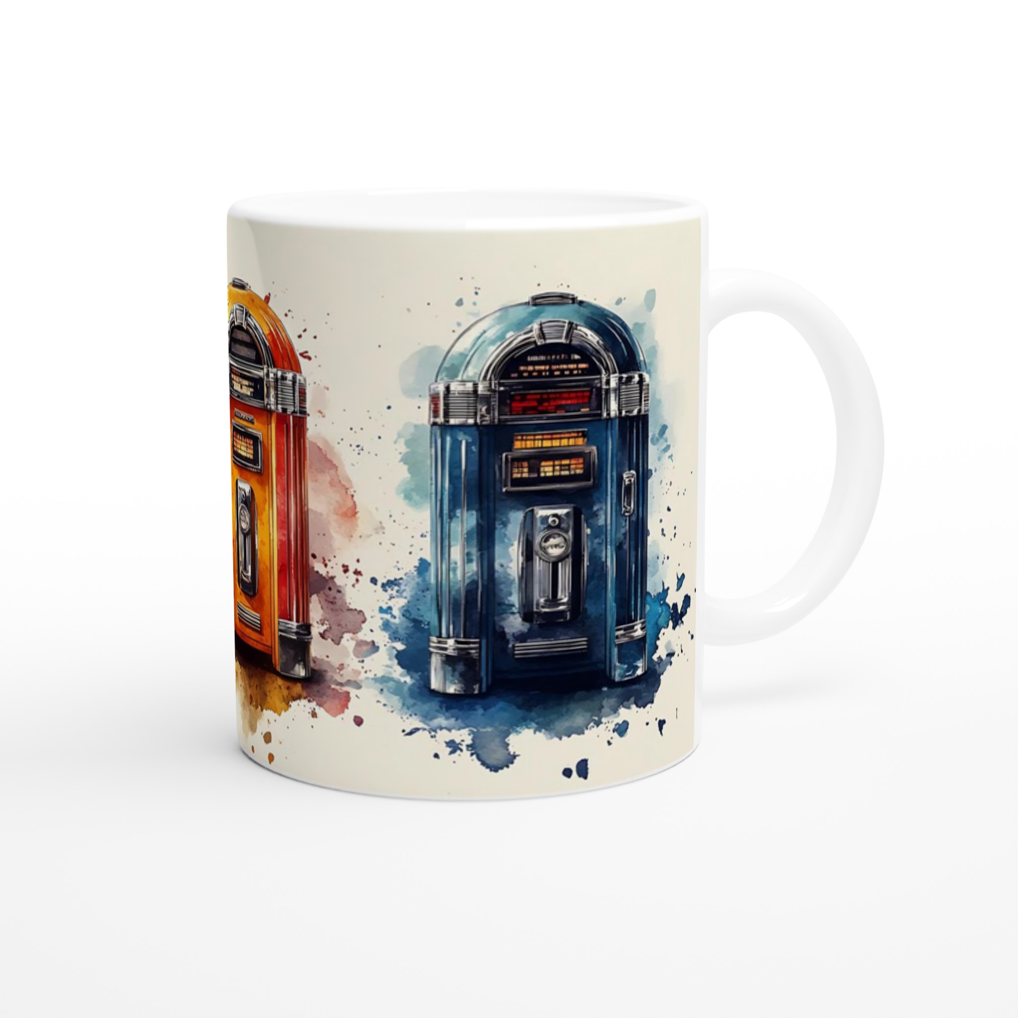 Ta en tidsresa tillbaka till ”Rock & Roll”-eran med denna unika keramiska mugg, inspirerad av klassiska jukeboxar i en livlig akvarellstil. Varje mugg är ett litet konstverk som fångar den nostalgiska charmen och de ikoniska färgerna från en svunnen tid, komplett med konstnärliga färgstänk som ger varje design en dynamisk känsla. Perfekt för morgonkaffet, kvällens varma choklad eller när du bara vill njuta av en kopp te. Den blanka vita ytan gör att trycken framhävs med klara och levande färger, som håller sig fina även efter många turer i mikron och diskmaskinen.