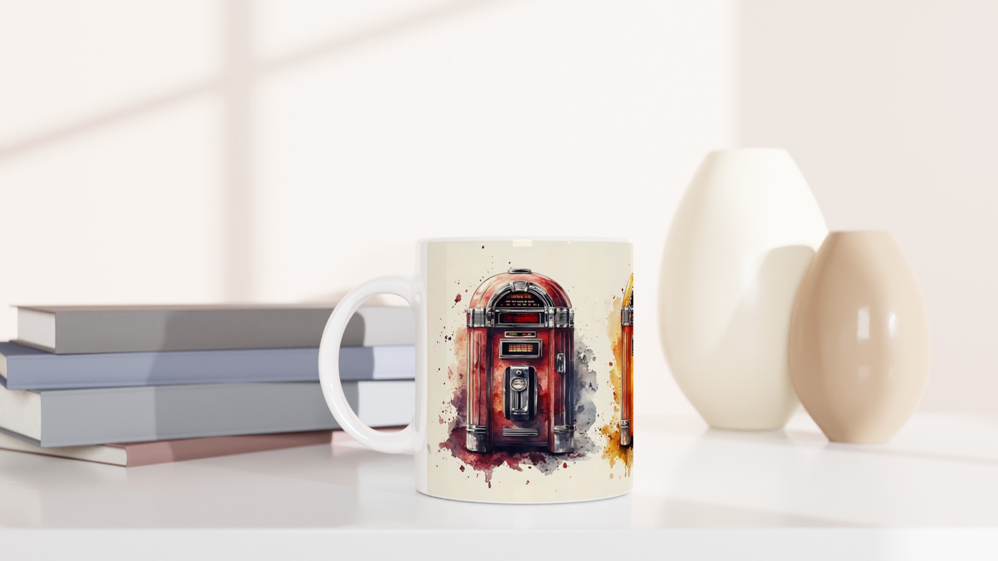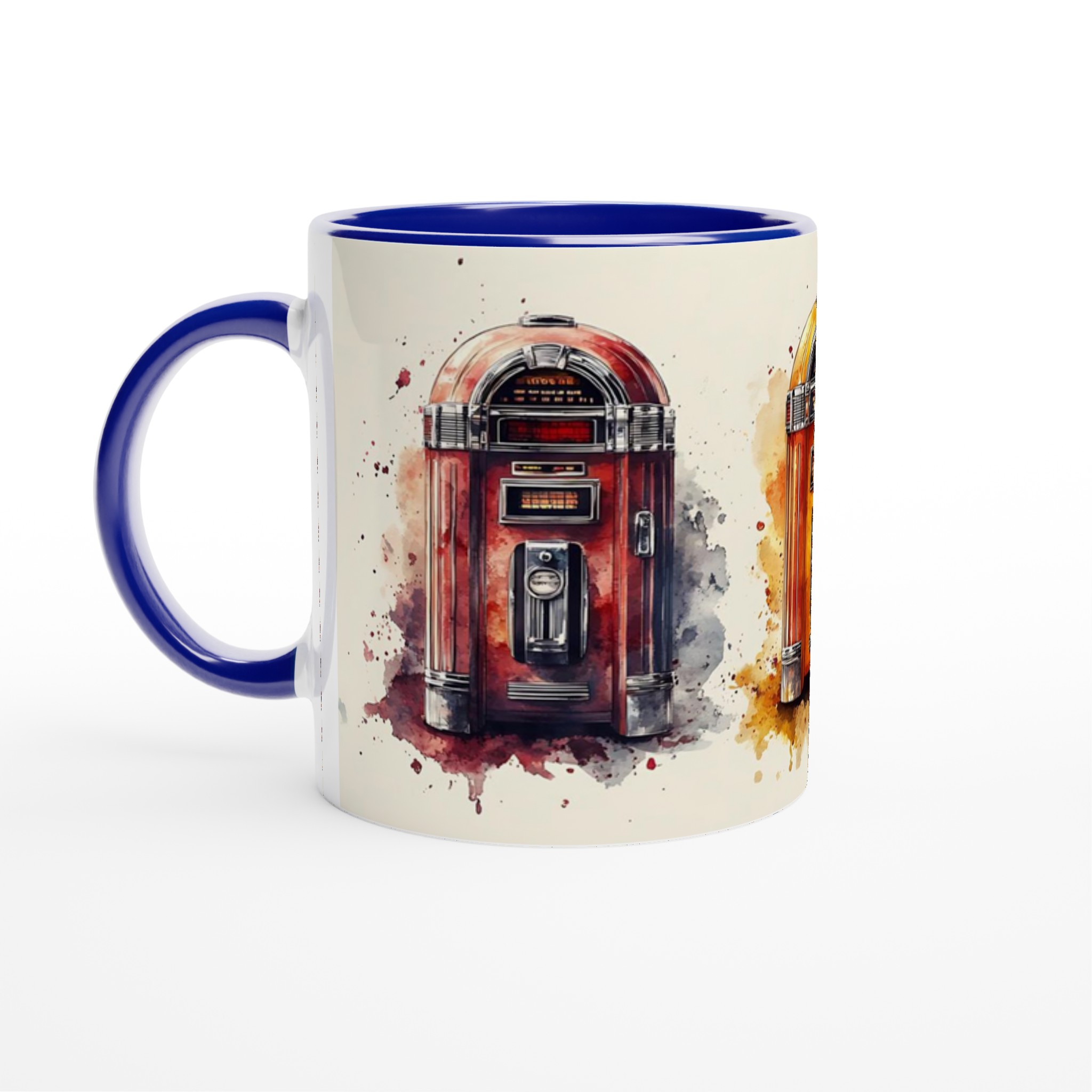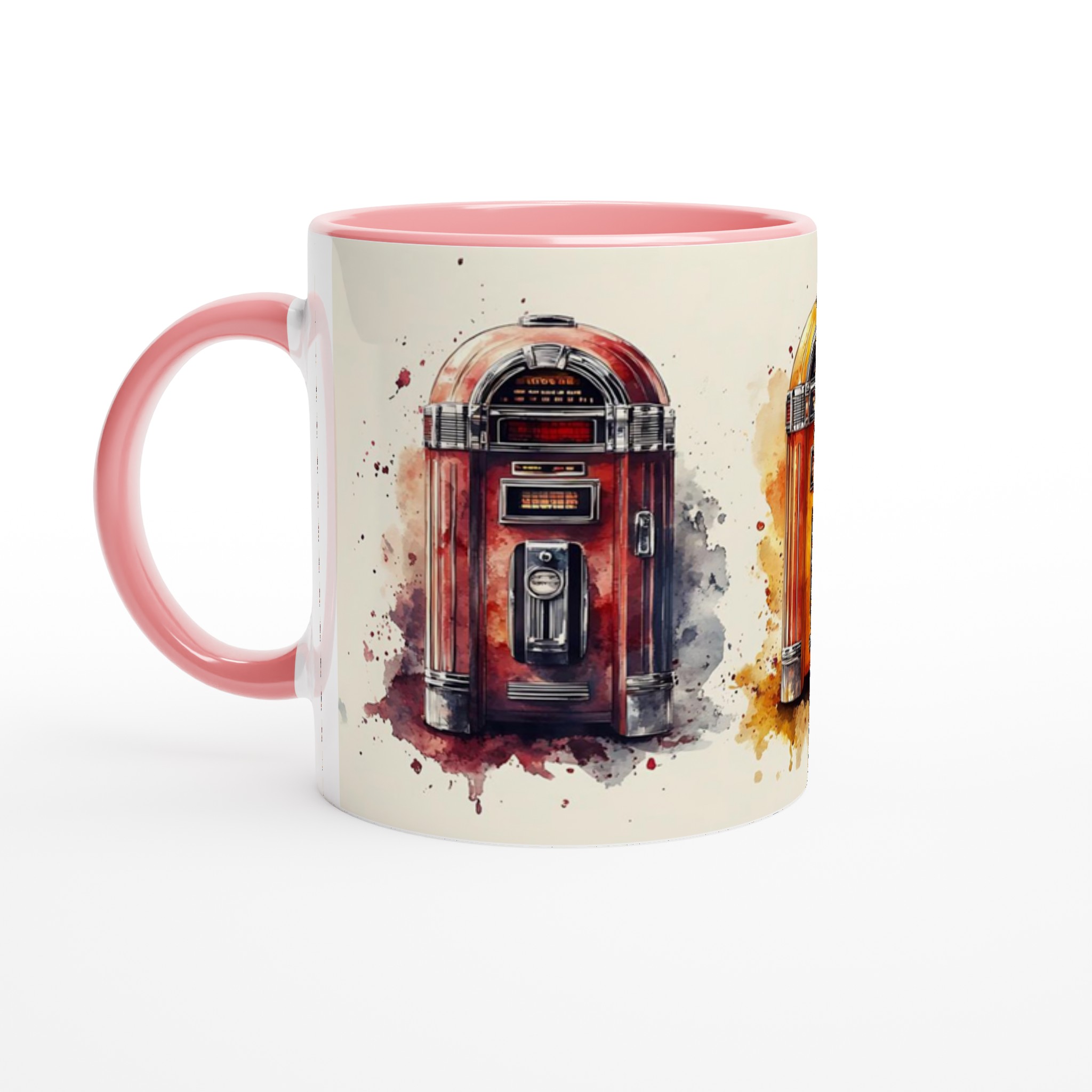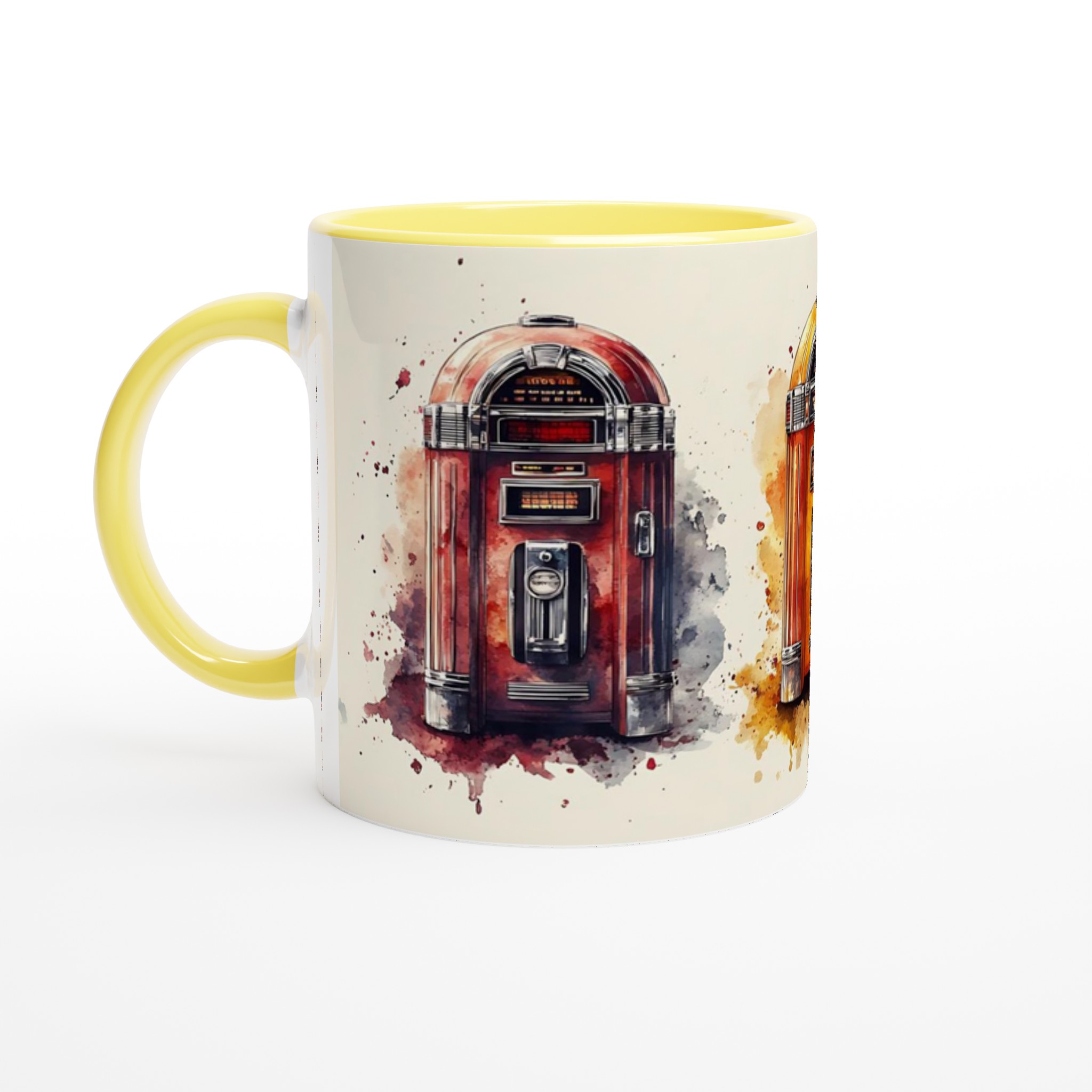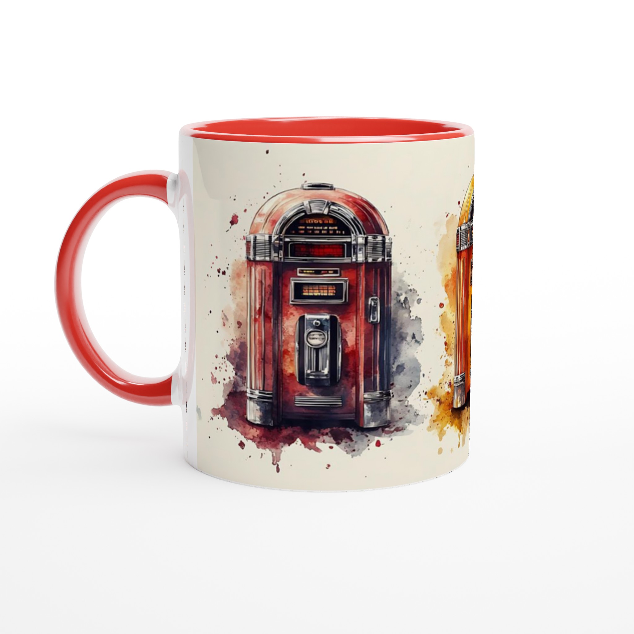 Ta en tidsresa tillbaka till ”Rock & Roll”-eran med denna unika keramiska mugg, inspirerad av klassiska jukeboxar i en livlig akvarellstil. Varje mugg är ett litet konstverk som fångar den nostalgiska charmen och de ikoniska färgerna från en svunnen tid, komplett med konstnärliga färgstänk som ger varje design en dynamisk känsla. Perfekt för morgonkaffet, kvällens varma choklad eller när du bara vill njuta av en kopp te. Den blanka vita ytan gör att trycken framhävs med klara och levande färger, som håller sig fina även efter många turer i mikron och diskmaskinen.