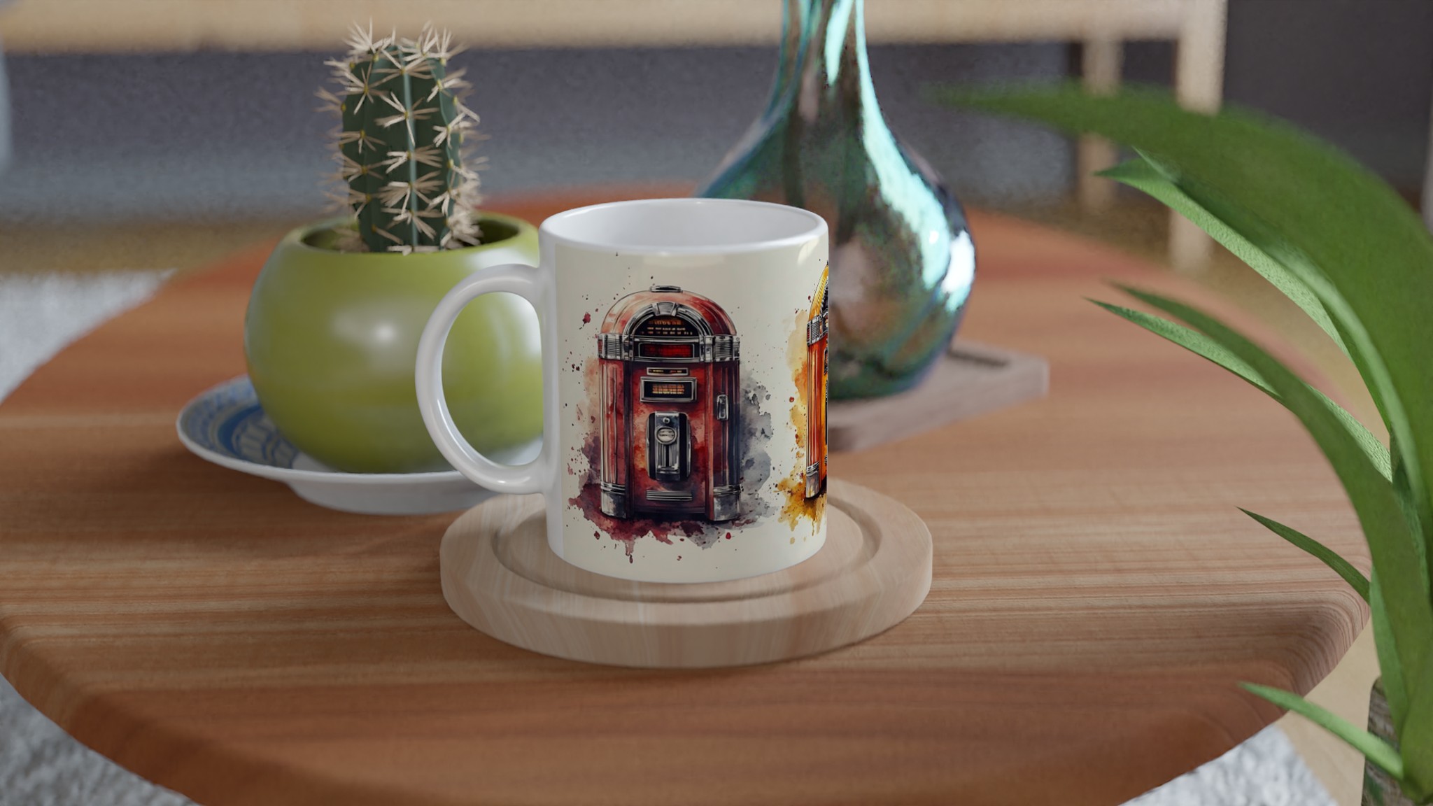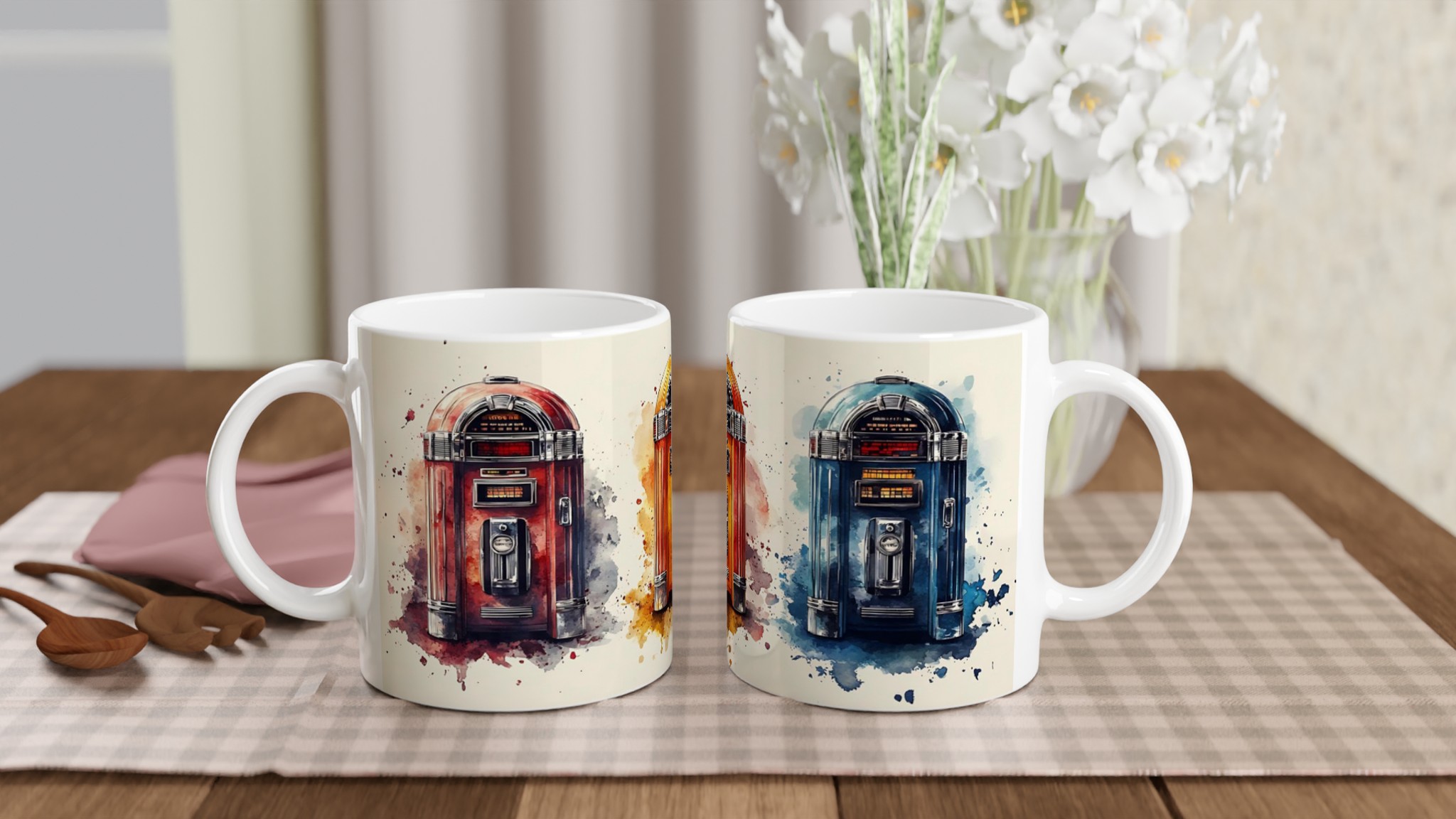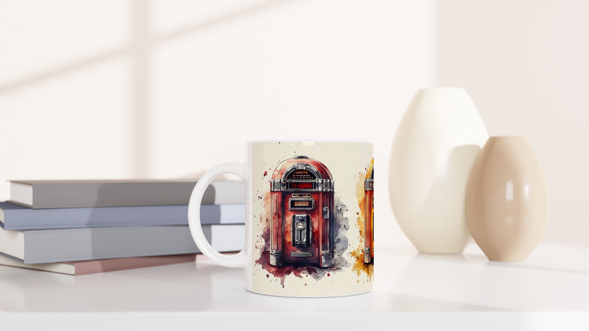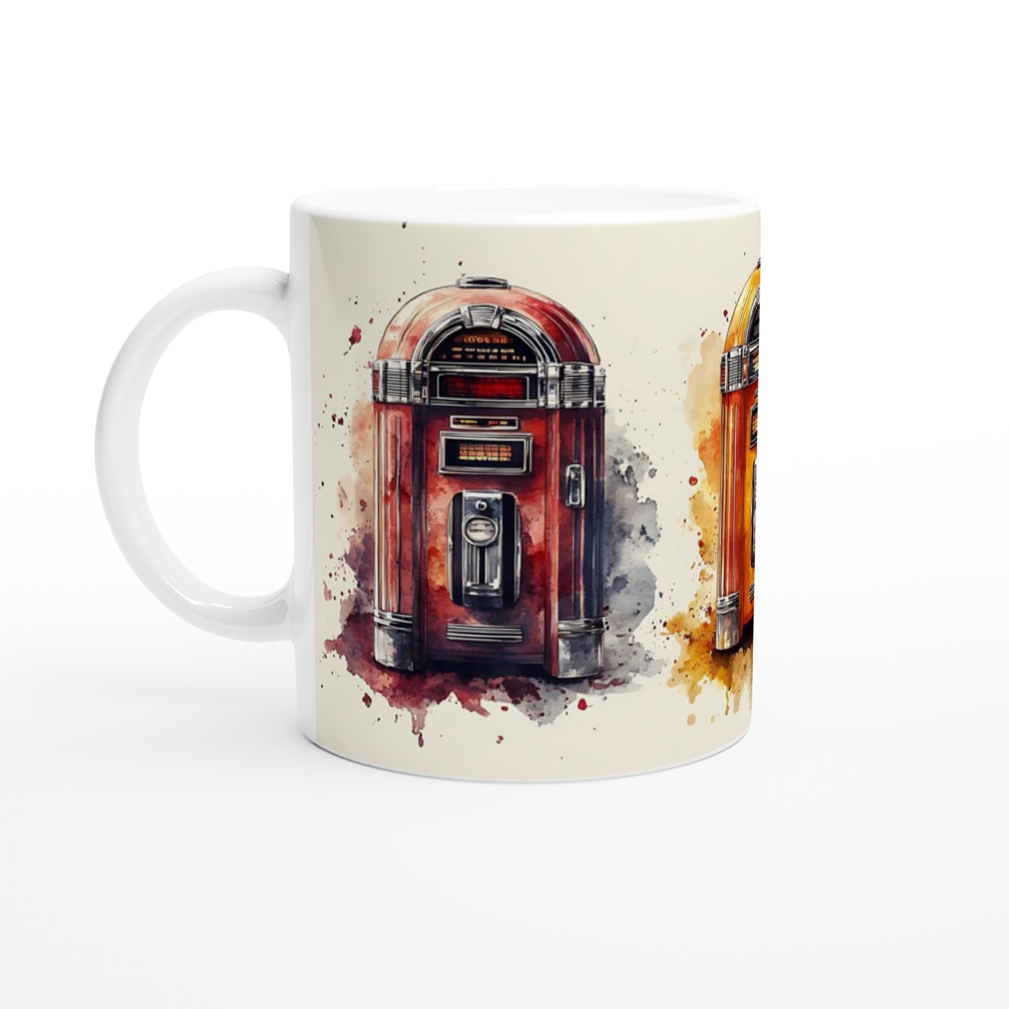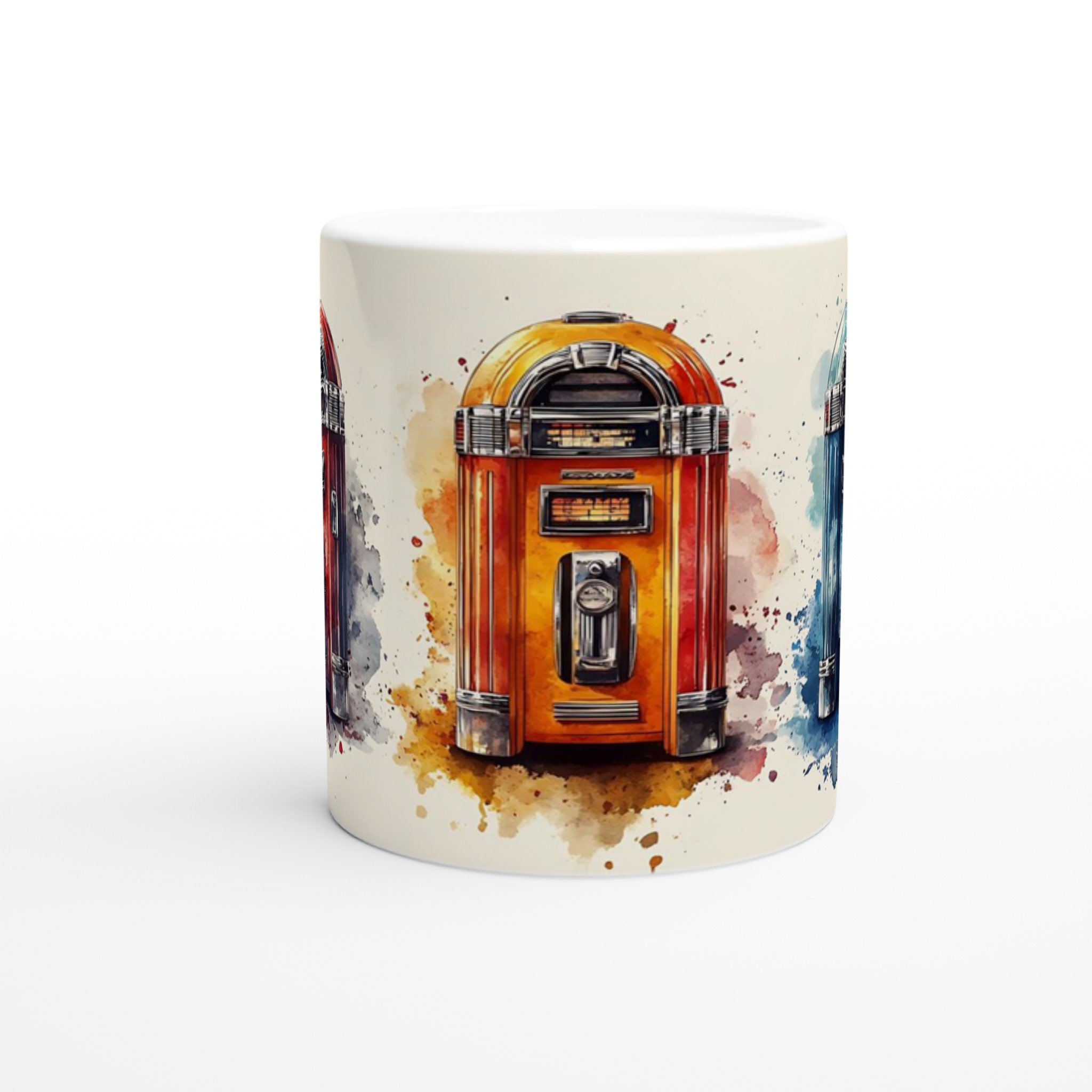 Inspirerad av den klassiska jukeboxens ikoniska charm och akvarellens konstnärliga flöde, ger denna mugg en touch av retroglamour till din dag. Varje färgstänk förmedlar en känsla av musik och nostalgi, och den blanka vita ytan ger ett skarpt och levande tryck som verkligen sticker ut, oavsett om det är en personlig design, ett roligt citat eller en present till någon du tycker om.
