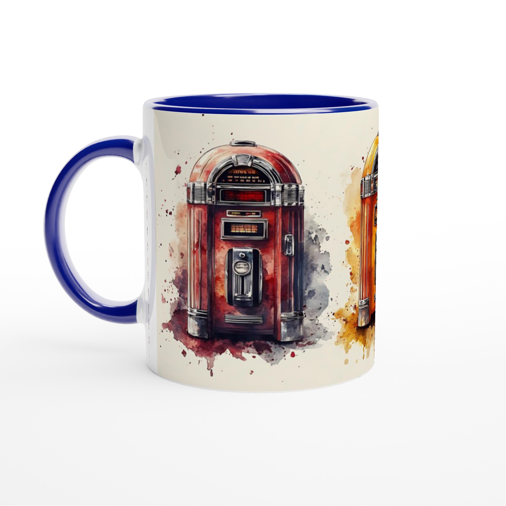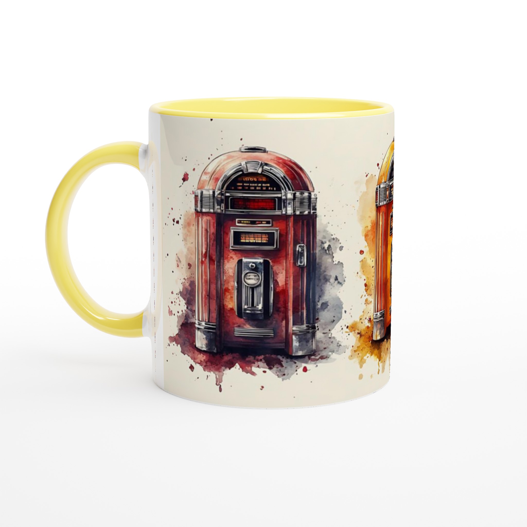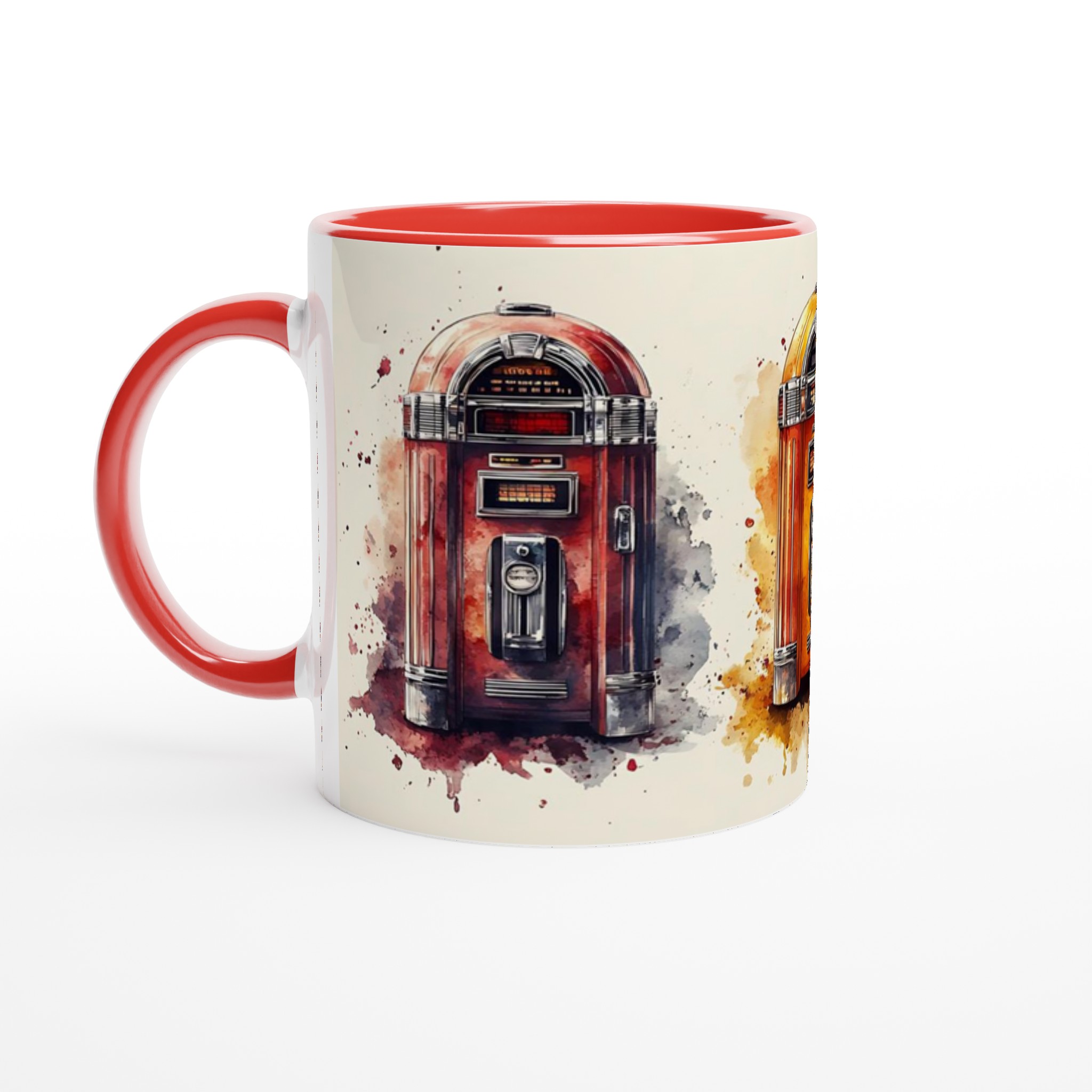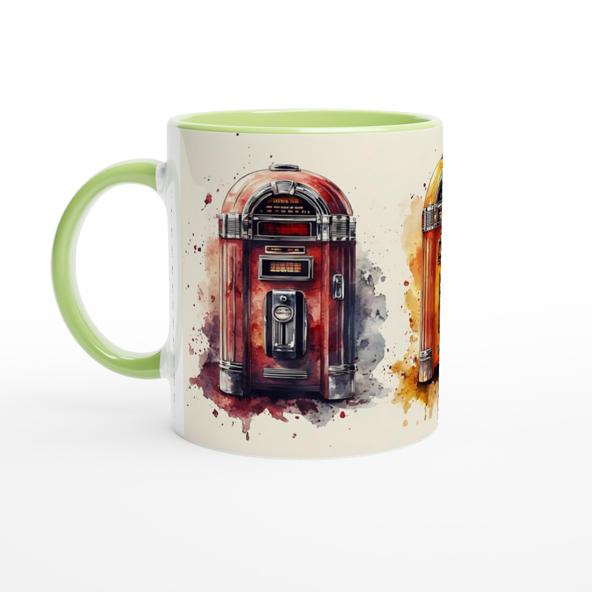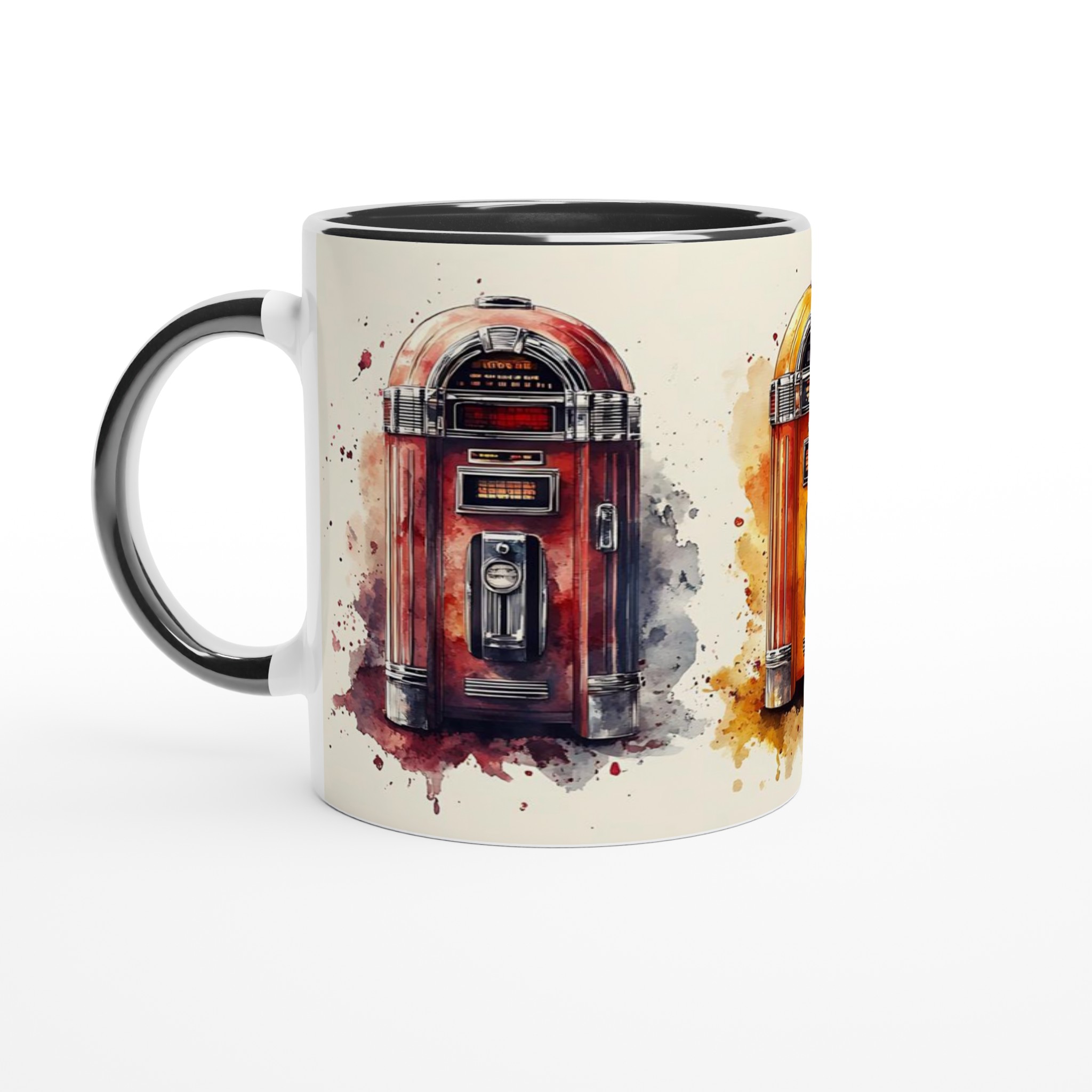 Inspirerad av den klassiska jukeboxens ikoniska charm och akvarellens konstnärliga flöde, ger denna mugg en touch av retroglamour till din dag. Varje färgstänk förmedlar en känsla av musik och nostalgi, och den blanka vita ytan ger ett skarpt och levande tryck som verkligen sticker ut, oavsett om det är en personlig design, ett roligt citat eller en present till någon du tycker om.