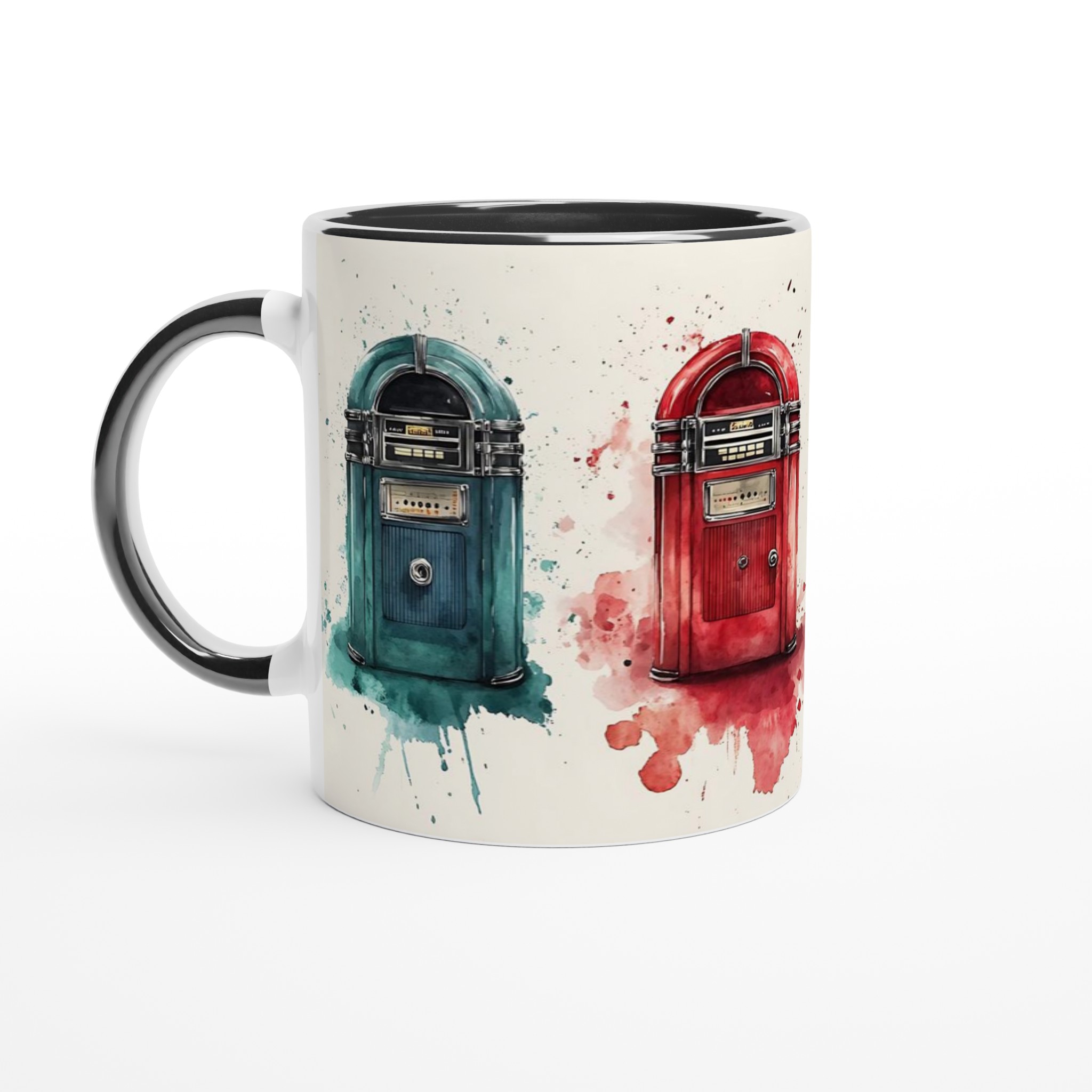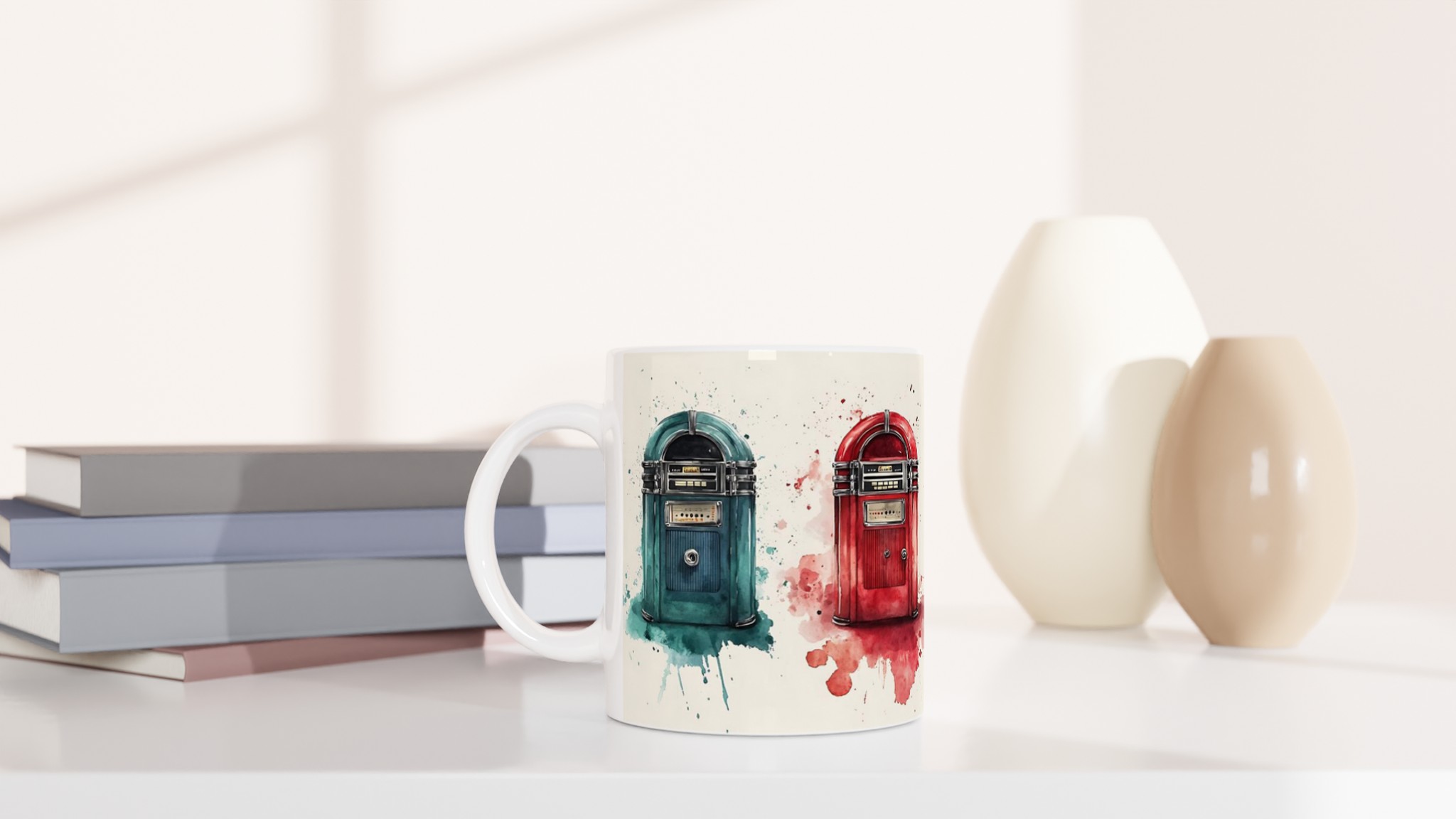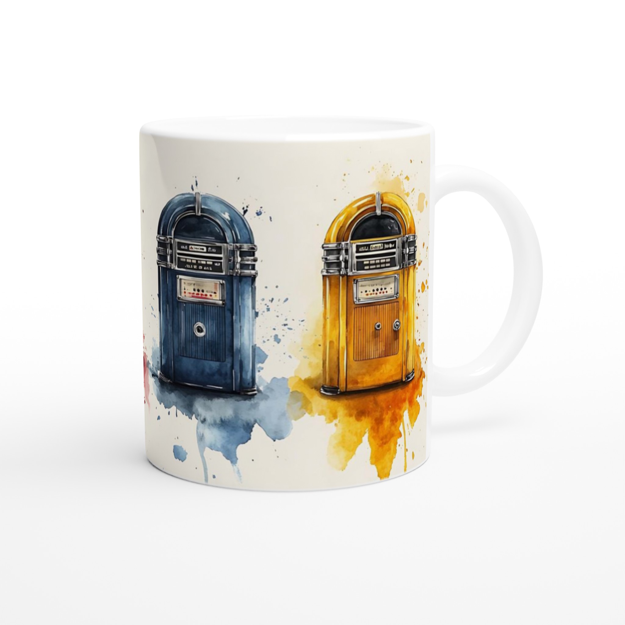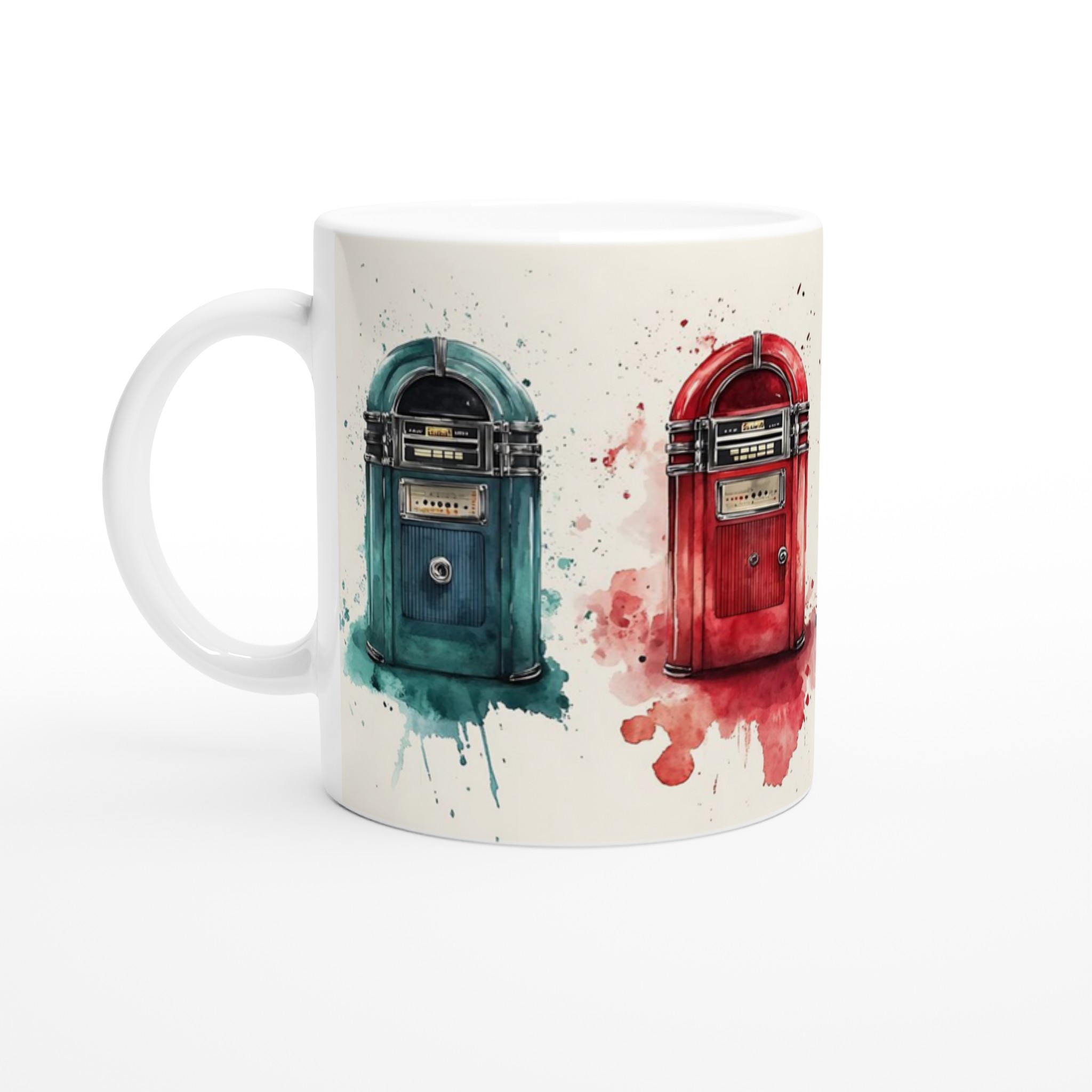 Väck liv i dina morgnar med denna retro-inspirerade keramiska mugg, som fångar charmen hos klassiska jukeboxar med en modern akvarellestetik. Den här stilrena muggen blir snabbt en vardagsfavorit, perfekt för morgonkaffet, kvällens varma choklad eller när du bara vill njuta av en kopp te. Den blanka vita ytan gör att trycken framhävs med klara och levande färger, som håller sig fina även efter många turer i mikron och diskmaskinen.