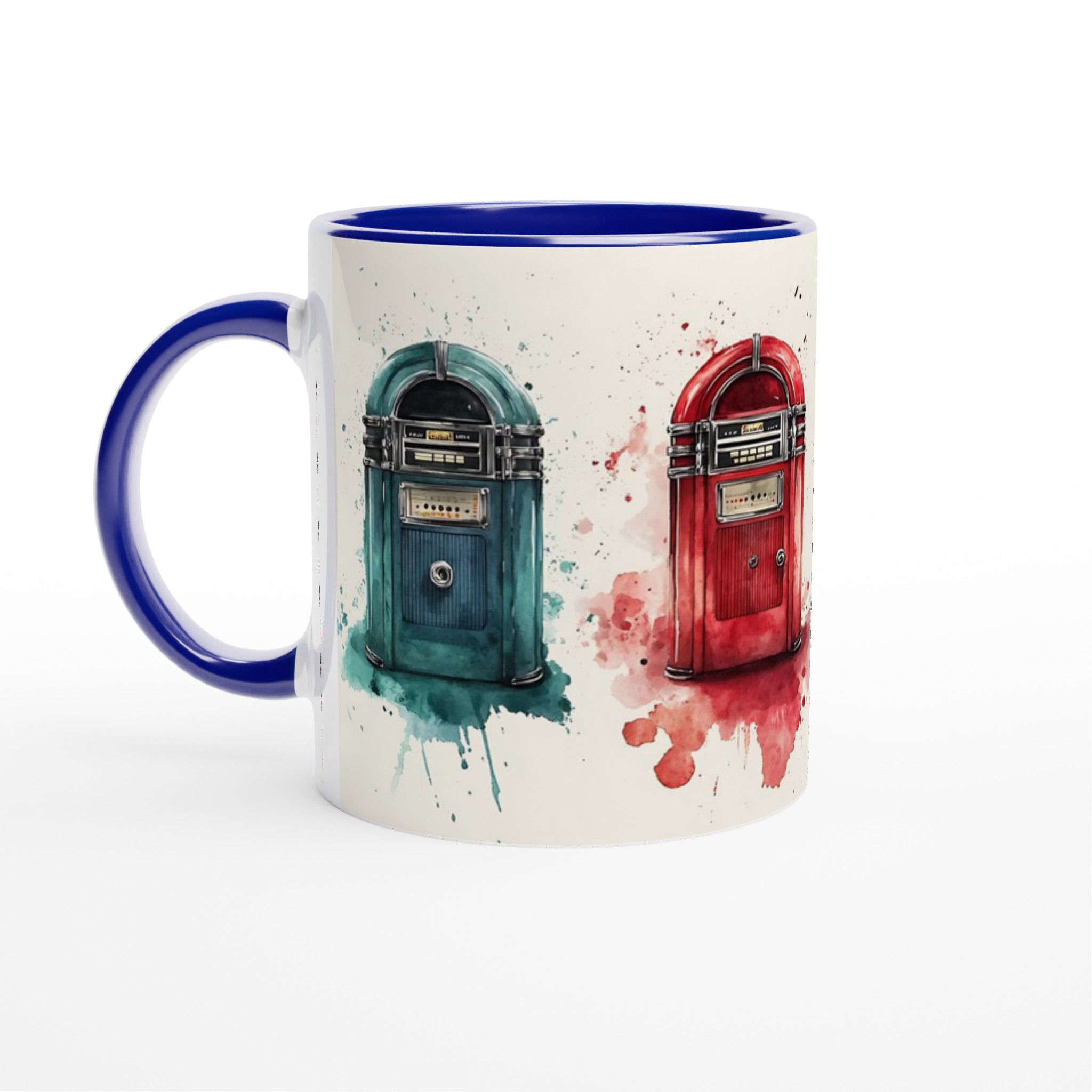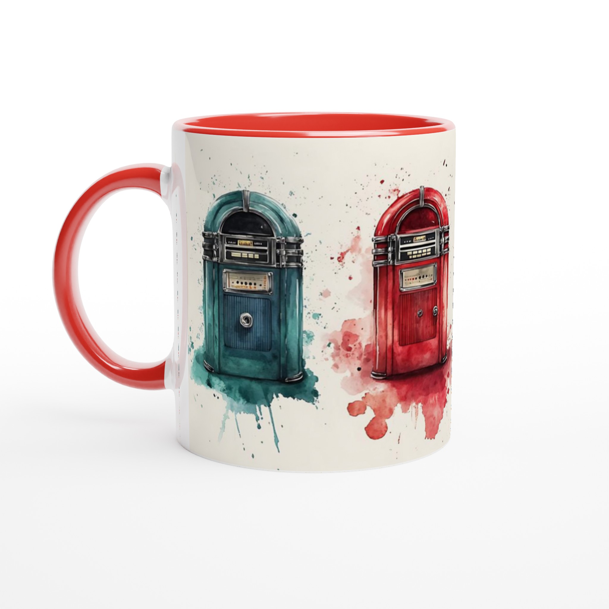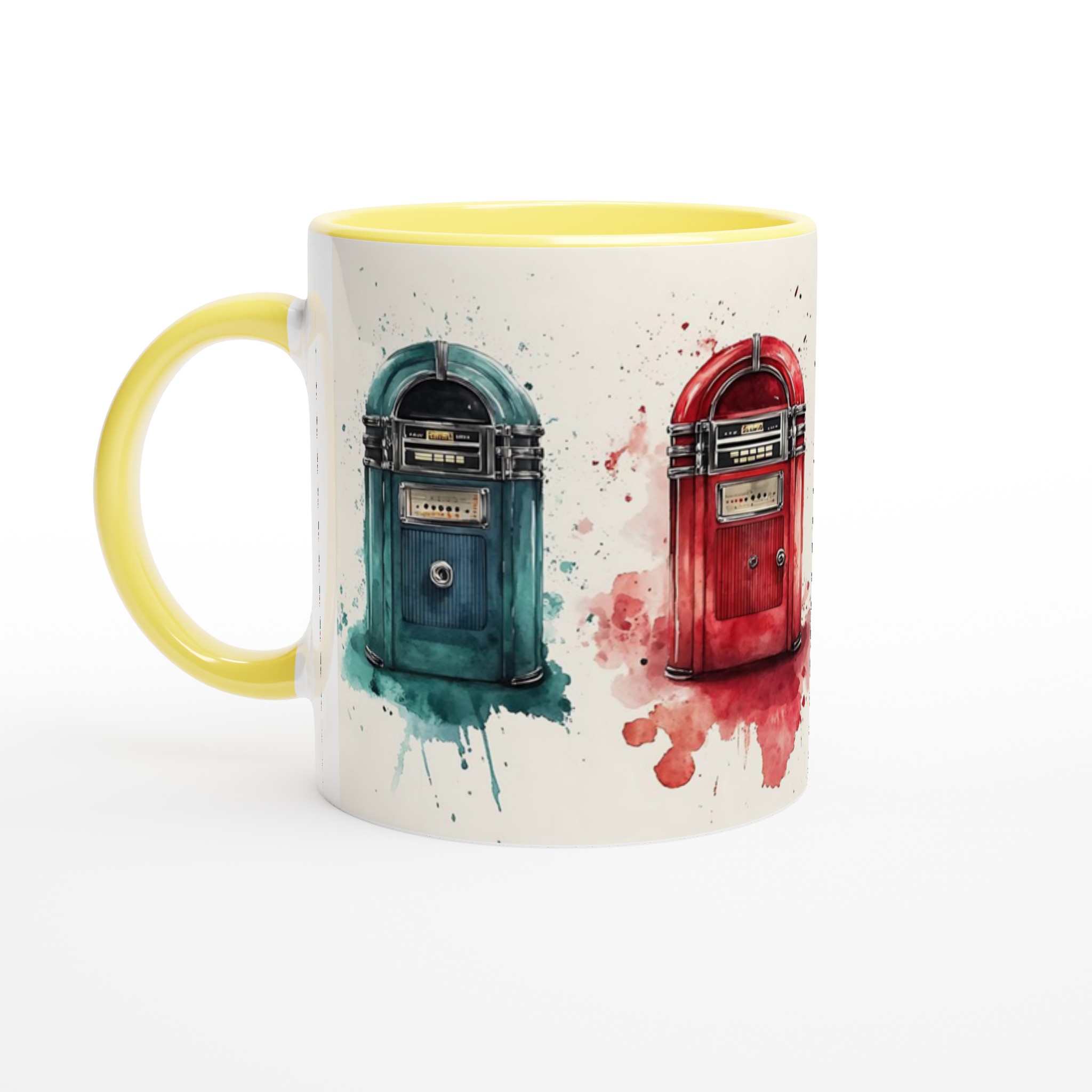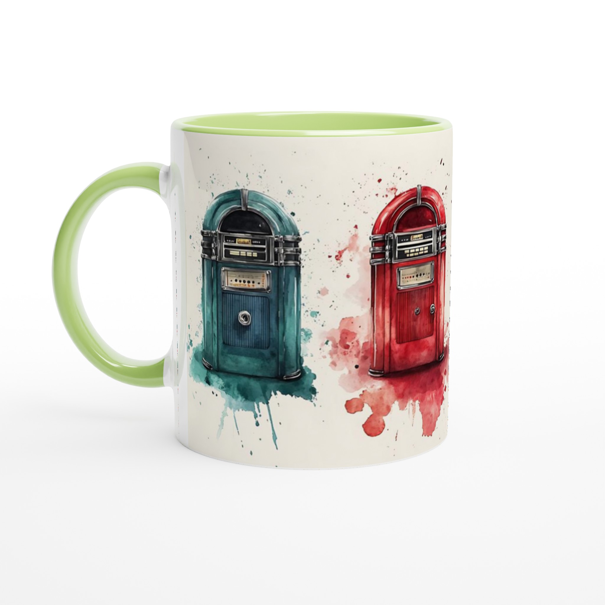 Väck liv i dina morgnar med denna retro-inspirerade keramiska mugg, som fångar charmen hos klassiska jukeboxar med en modern akvarellestetik. Den här stilrena muggen blir snabbt en vardagsfavorit, perfekt för morgonkaffet, kvällens varma choklad eller när du bara vill njuta av en kopp te. Den blanka vita ytan gör att trycken framhävs med klara och levande färger, som håller sig fina även efter många turer i mikron och diskmaskinen.