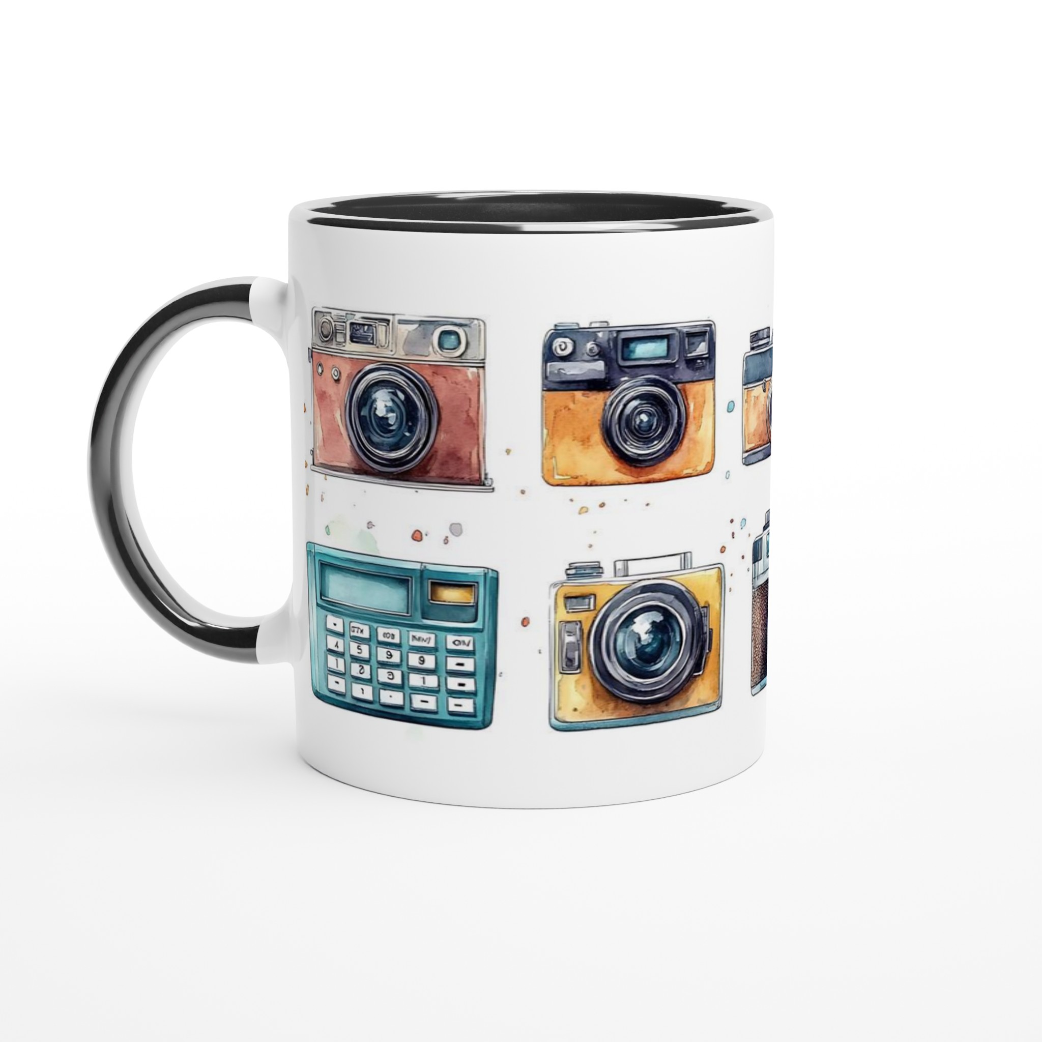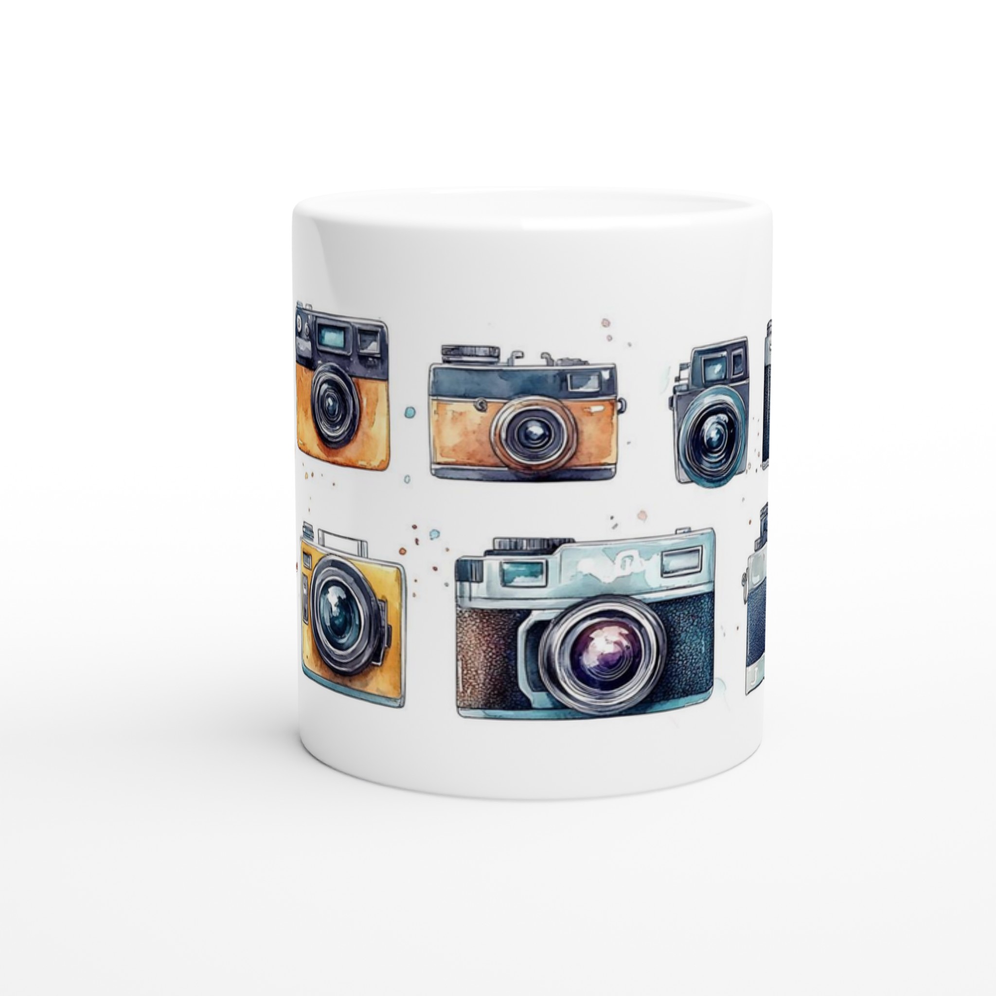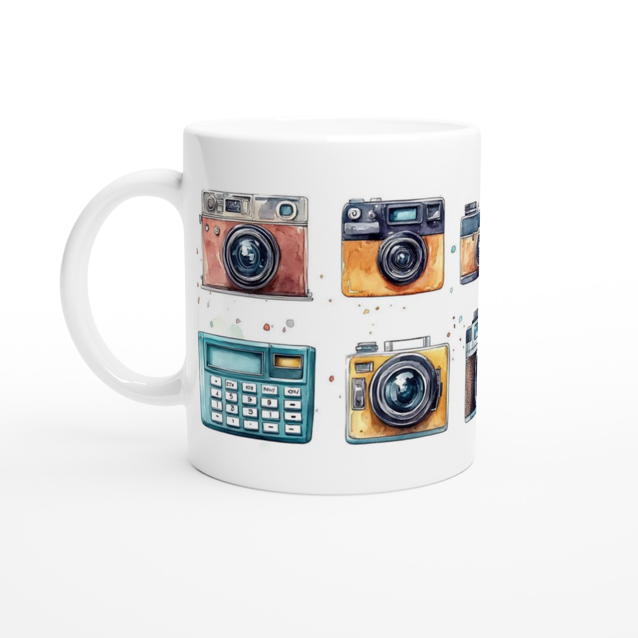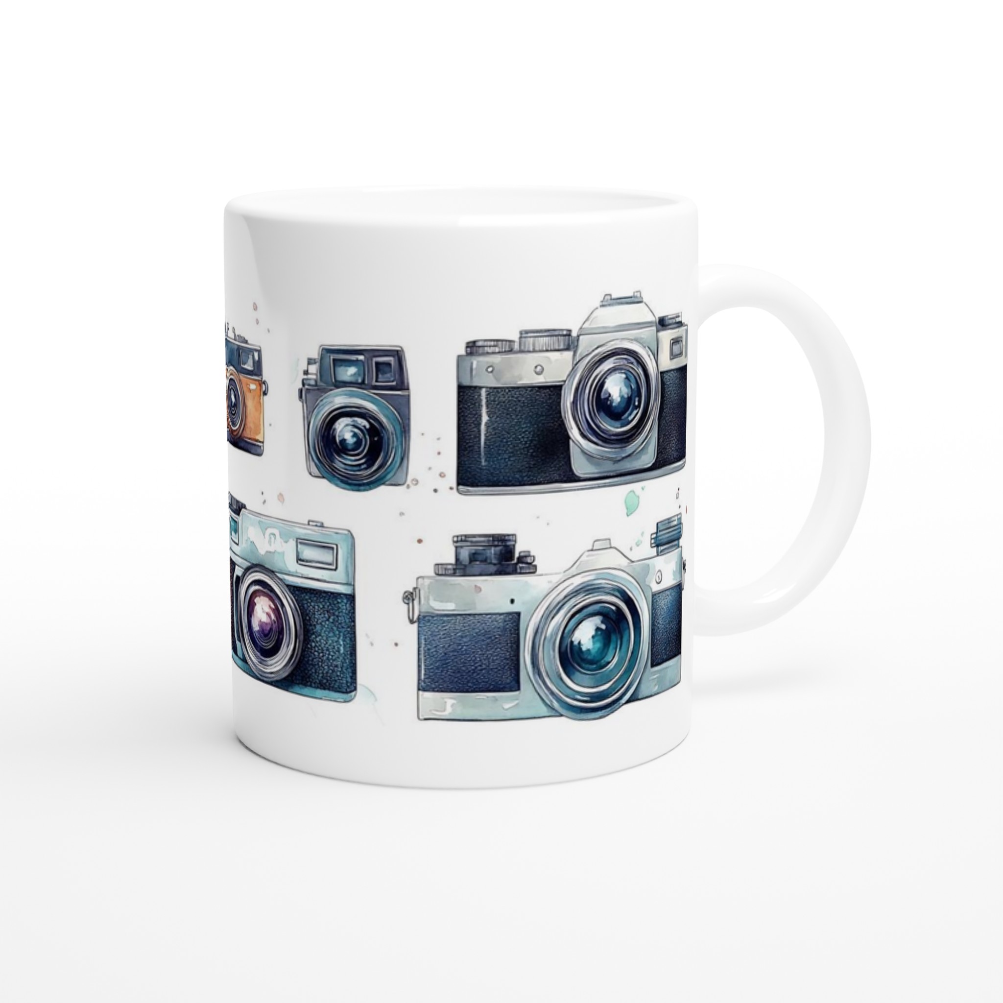 Nostalgi möter din morgonrutin med denna charmiga keramiska mugg, som stoltserar med en konstfull akvarellillustration av klassiska retrokameror. Varje sip blir en hyllning till tidlösa ögonblick och fotografins guldålder. Denna stilrena mugg blir snabbt en vardagsfavorit, perfekt för morgonkaffet, kvällens varma choklad eller när du bara vill njuta av en kopp te. Den blanka vita ytan ser till att trycken framhävs med klara och levande färger, som håller sig fina även efter många turer i mikron och diskmaskinen.