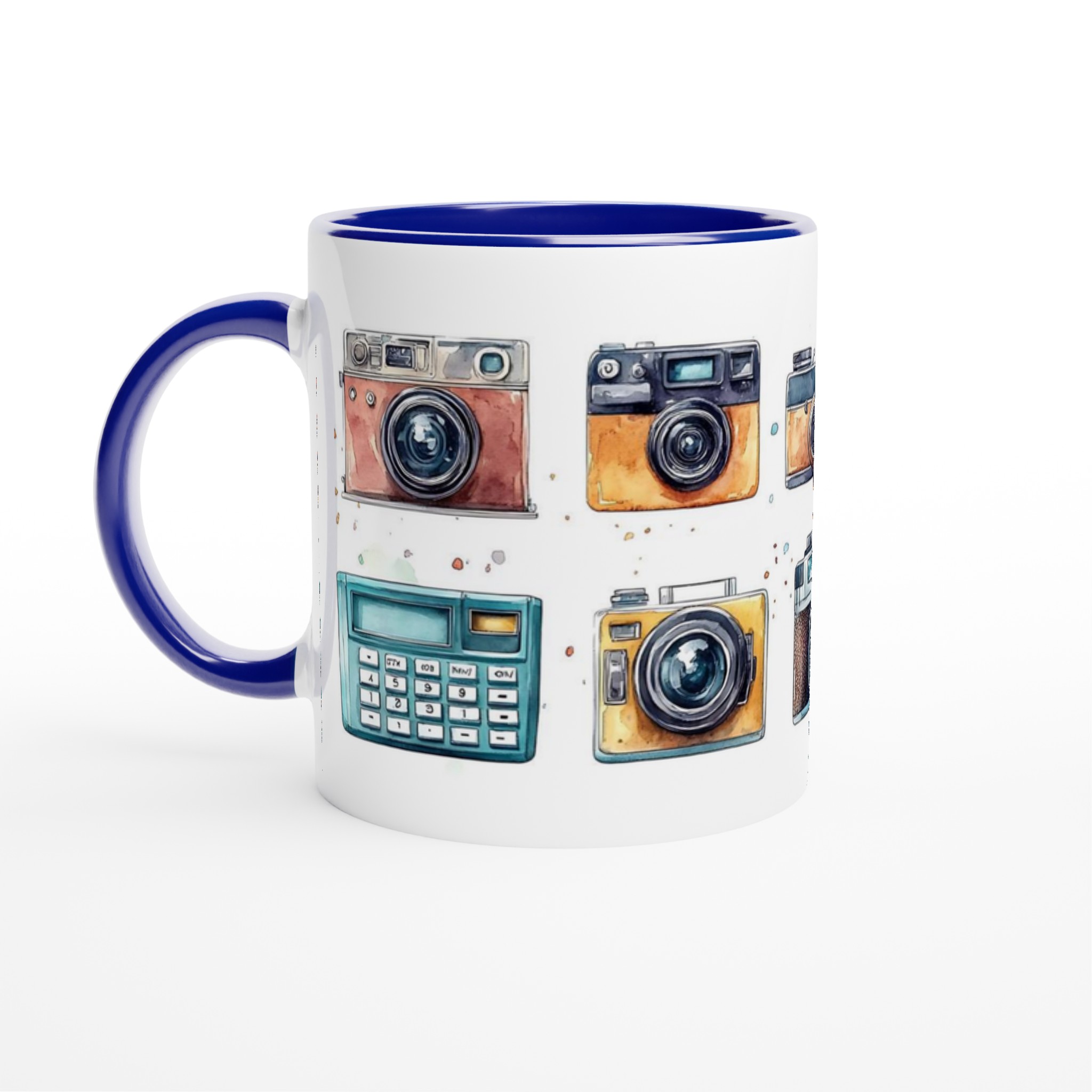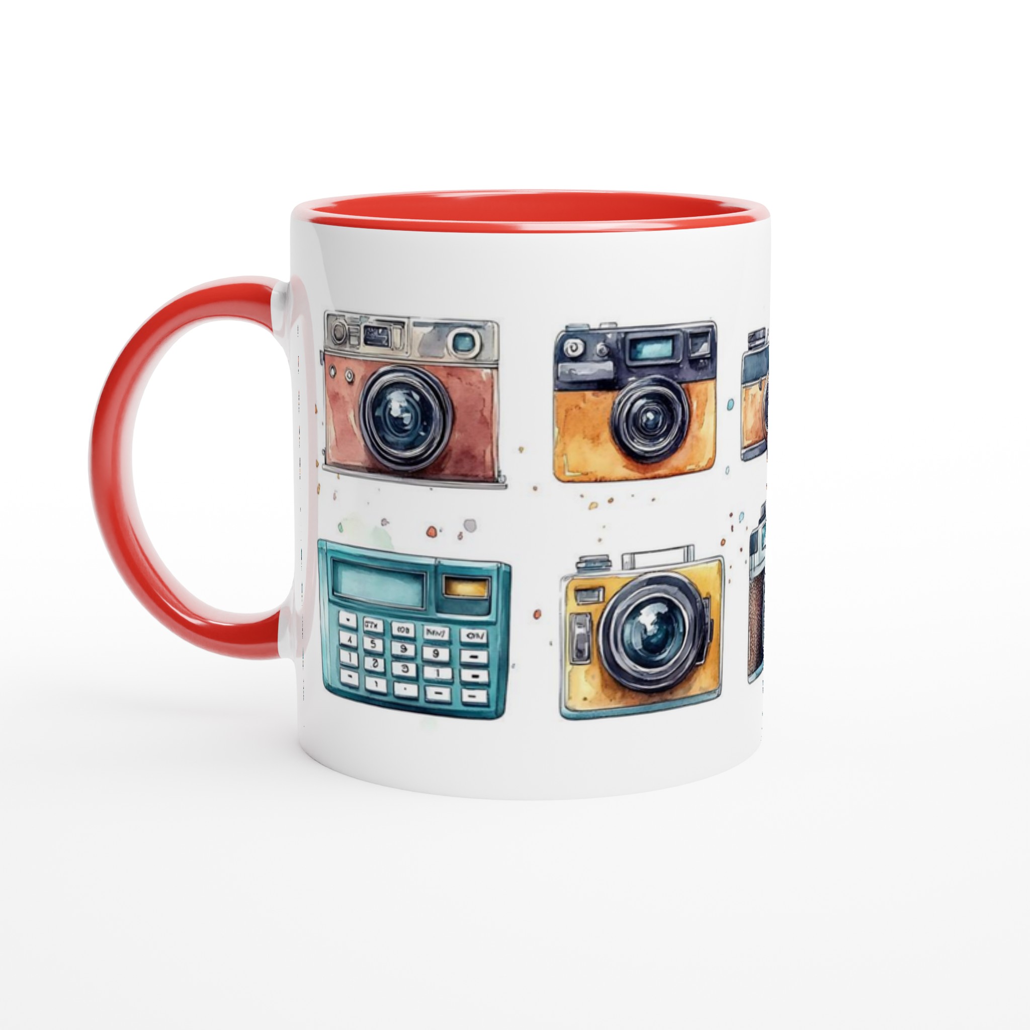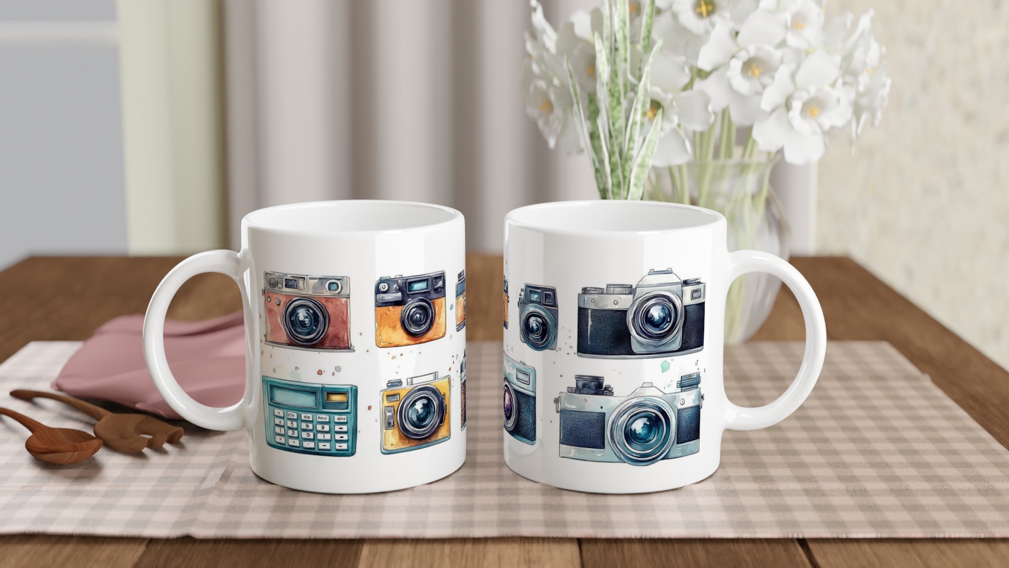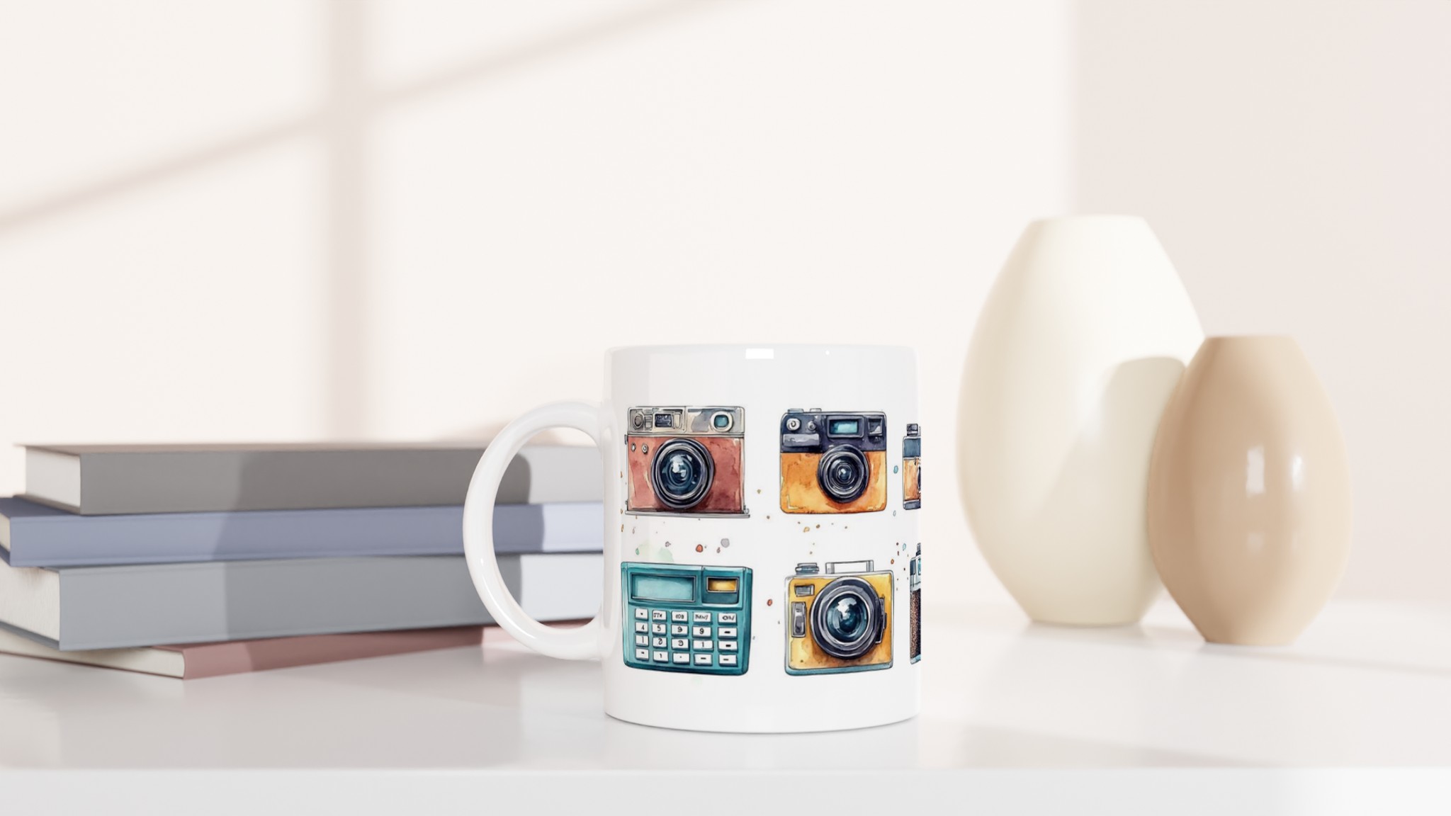 Nostalgi möter din morgonrutin med denna charmiga keramiska mugg, som stoltserar med en konstfull akvarellillustration av klassiska retrokameror. Varje sip blir en hyllning till tidlösa ögonblick och fotografins guldålder. Denna stilrena mugg blir snabbt en vardagsfavorit, perfekt för morgonkaffet, kvällens varma choklad eller när du bara vill njuta av en kopp te. Den blanka vita ytan ser till att trycken framhävs med klara och levande färger, som håller sig fina även efter många turer i mikron och diskmaskinen.
