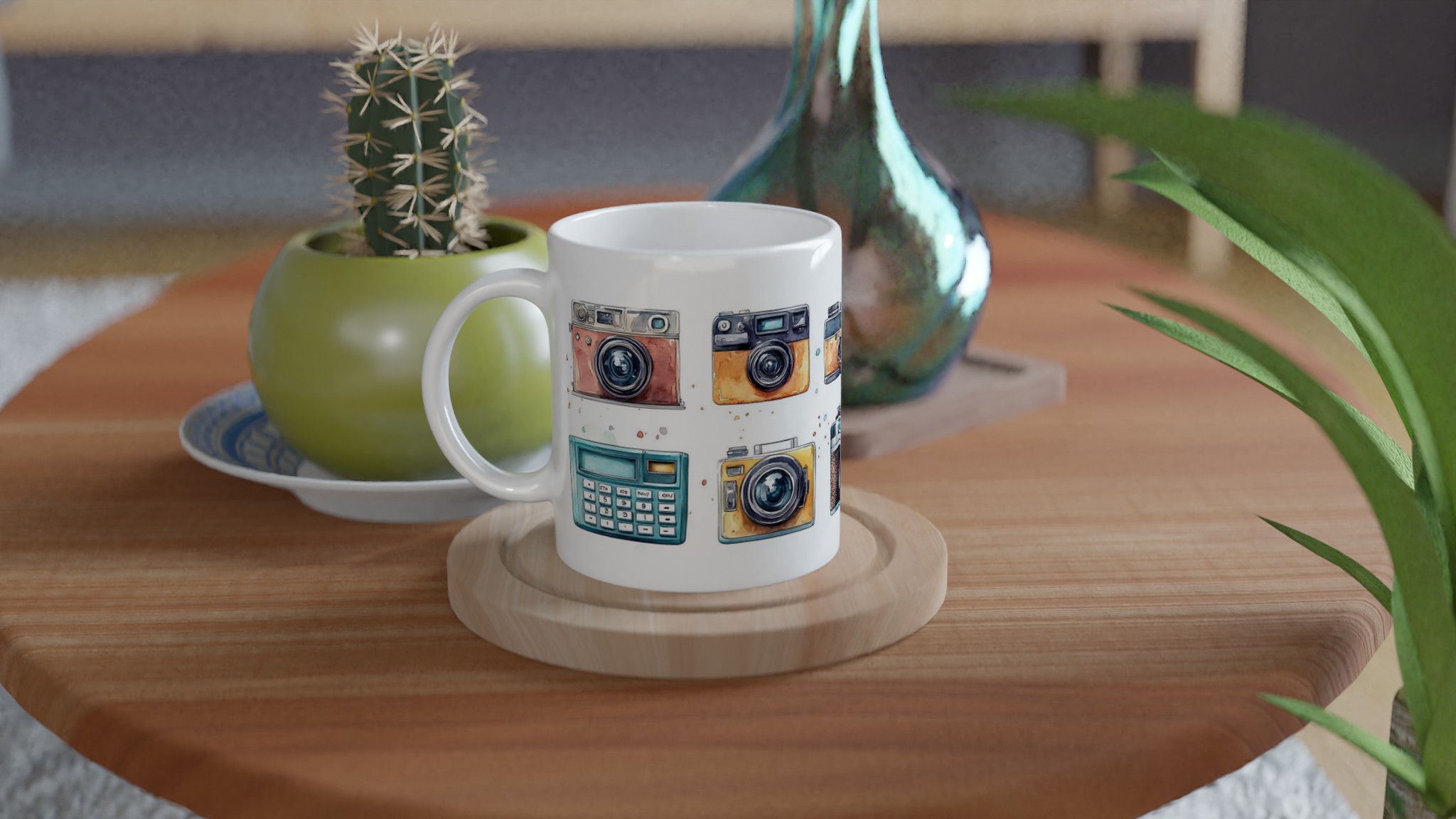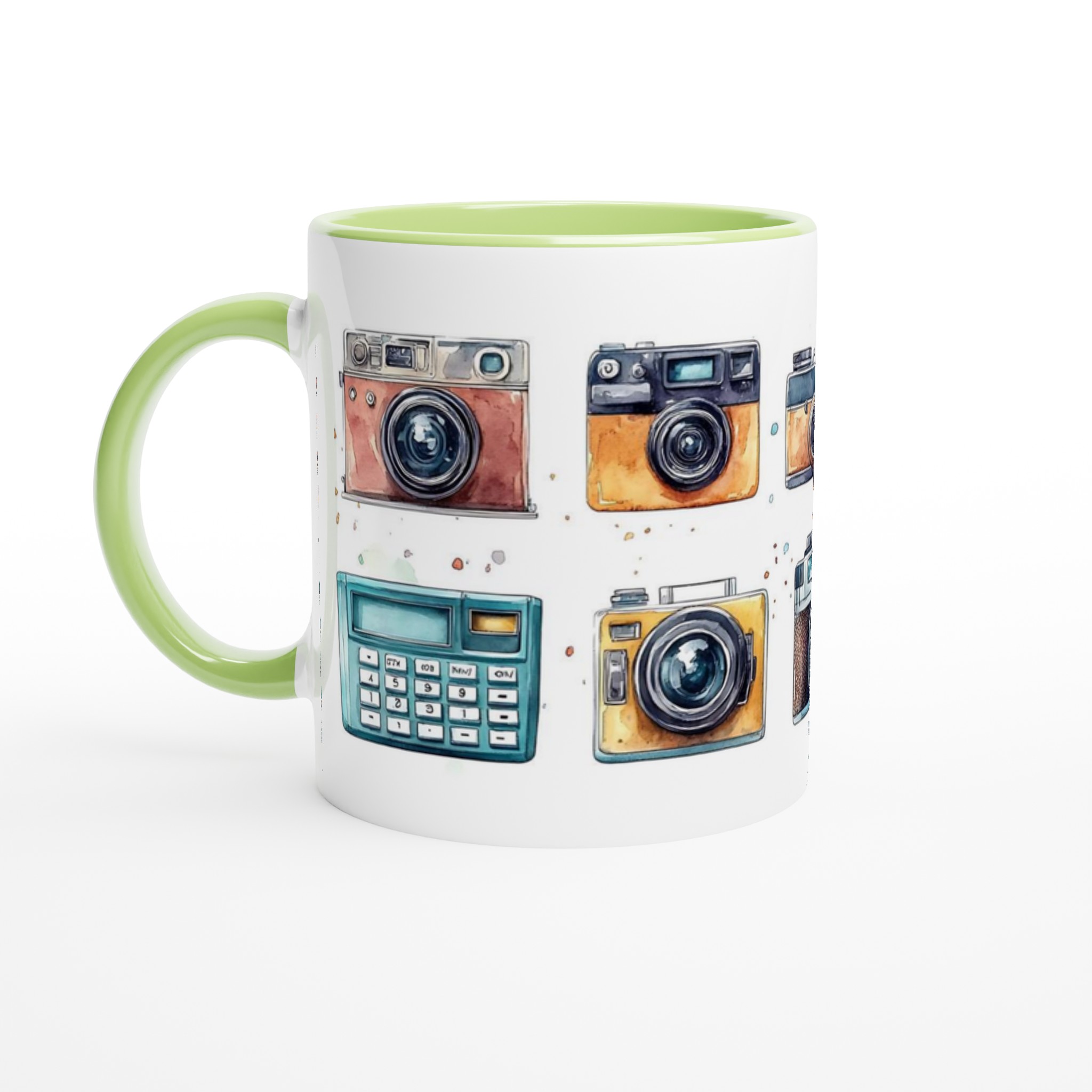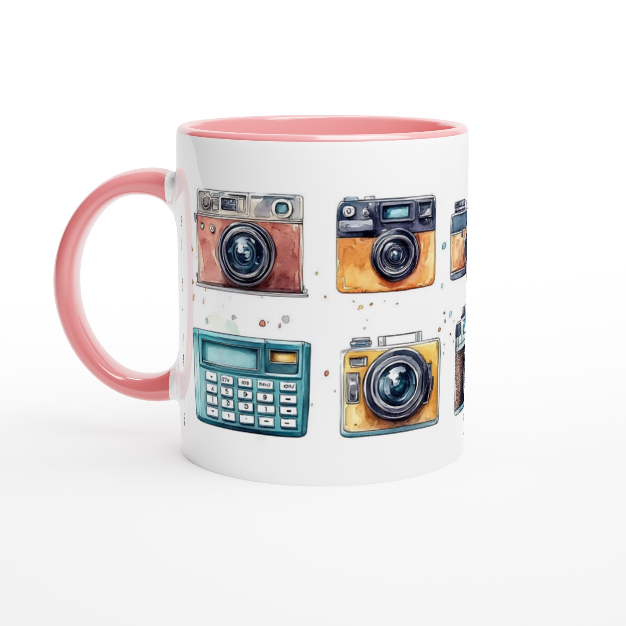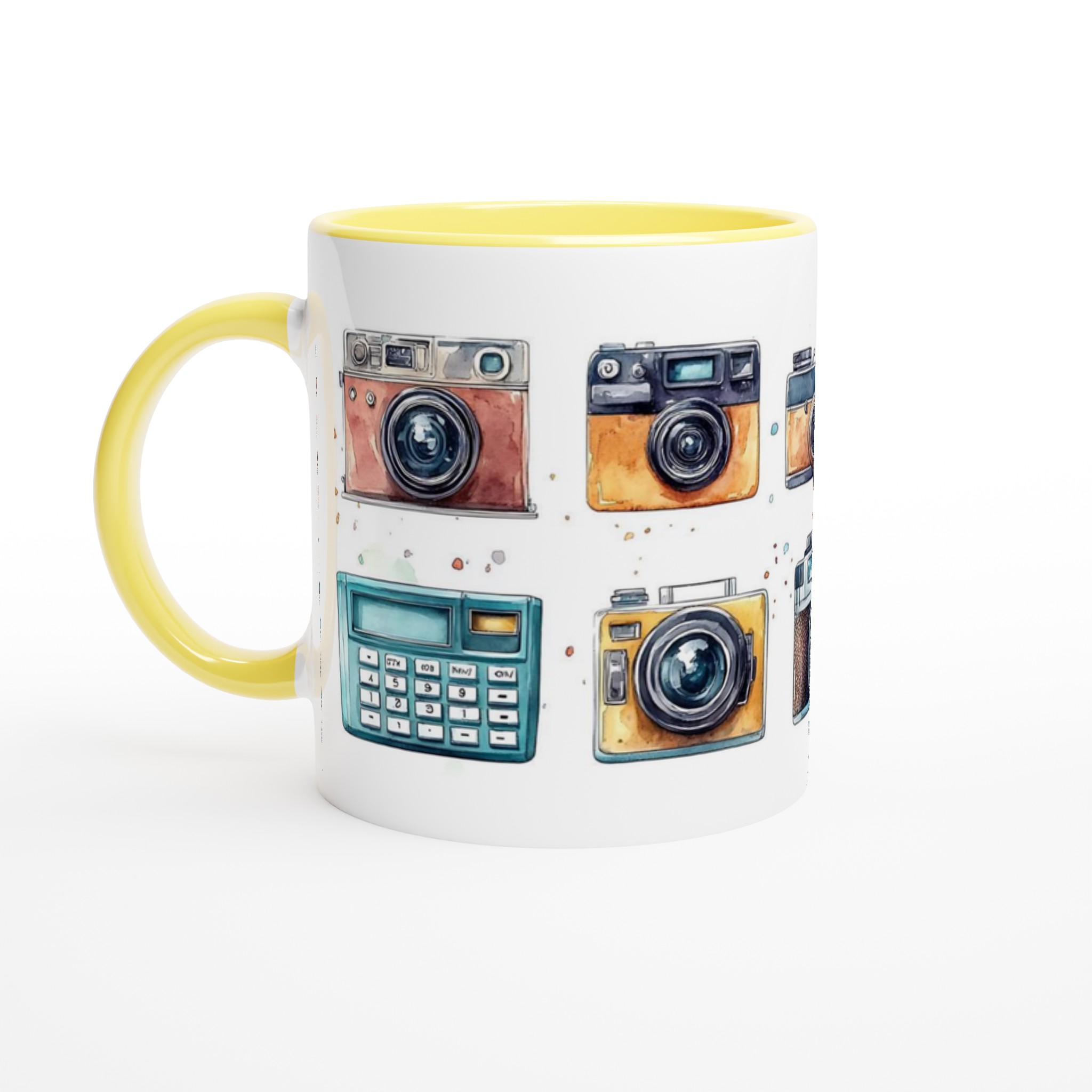 Nostalgi möter din morgonrutin med denna charmiga keramiska mugg, som stoltserar med en konstfull akvarellillustration av klassiska retrokameror. Varje sip blir en hyllning till tidlösa ögonblick och fotografins guldålder. Denna stilrena mugg blir snabbt en vardagsfavorit, perfekt för morgonkaffet, kvällens varma choklad eller när du bara vill njuta av en kopp te. Den blanka vita ytan ser till att trycken framhävs med klara och levande färger, som håller sig fina även efter många turer i mikron och diskmaskinen.