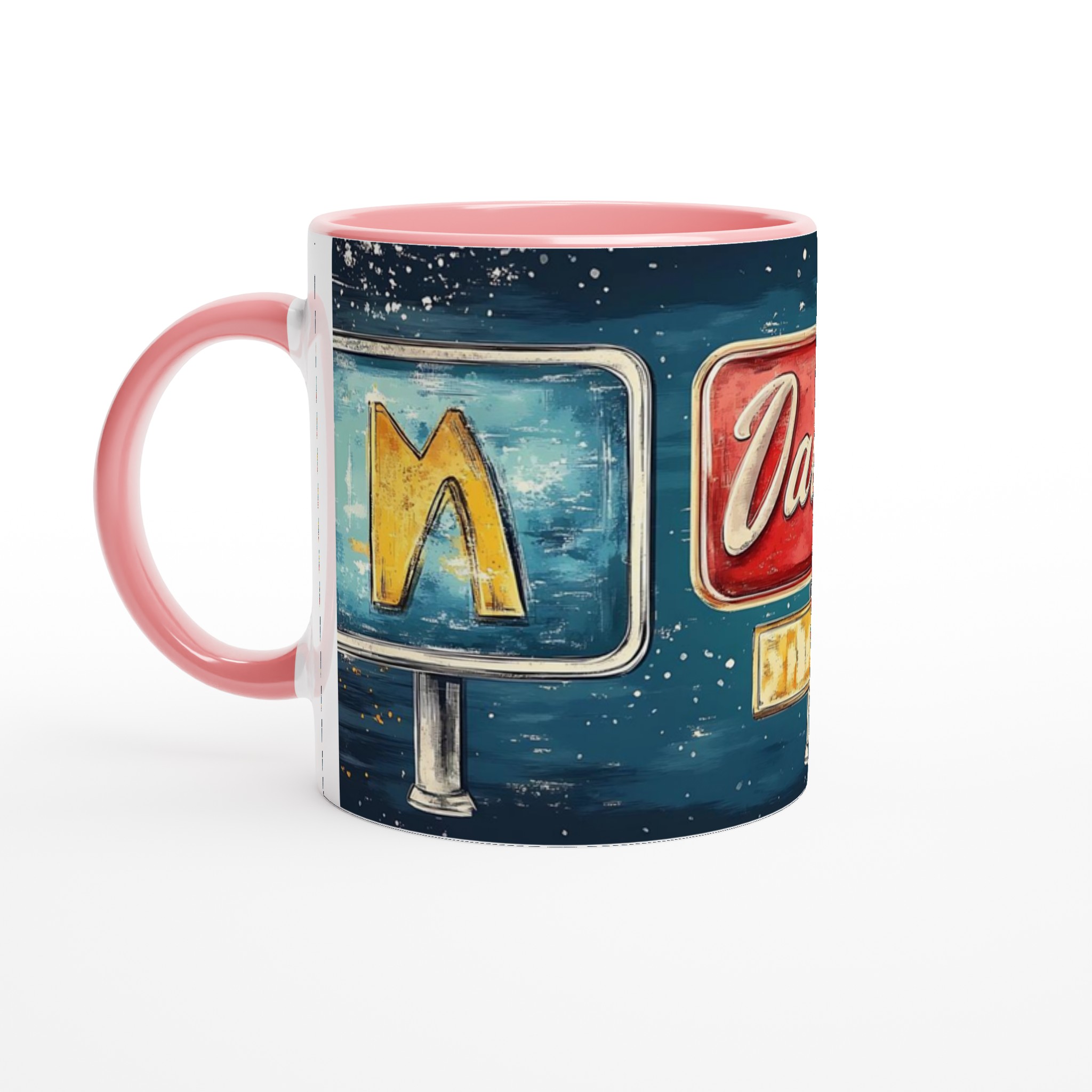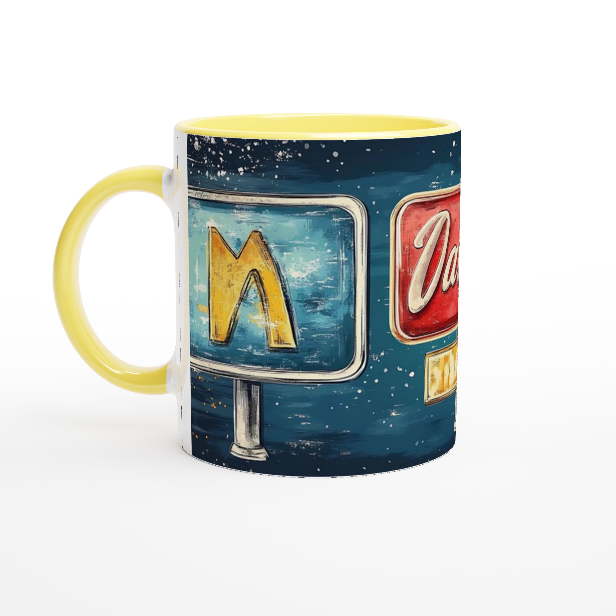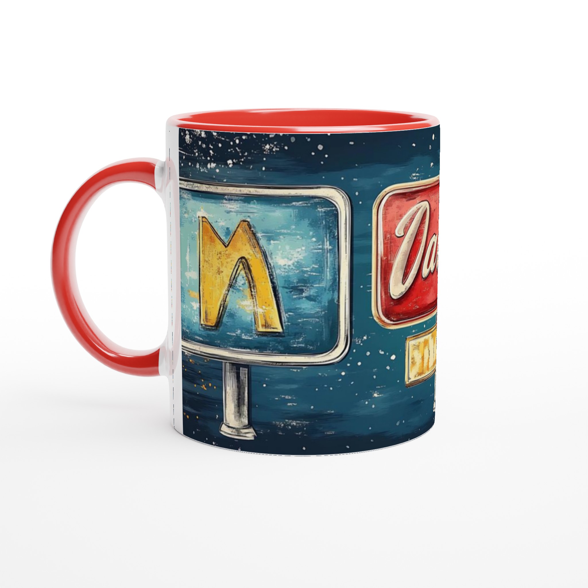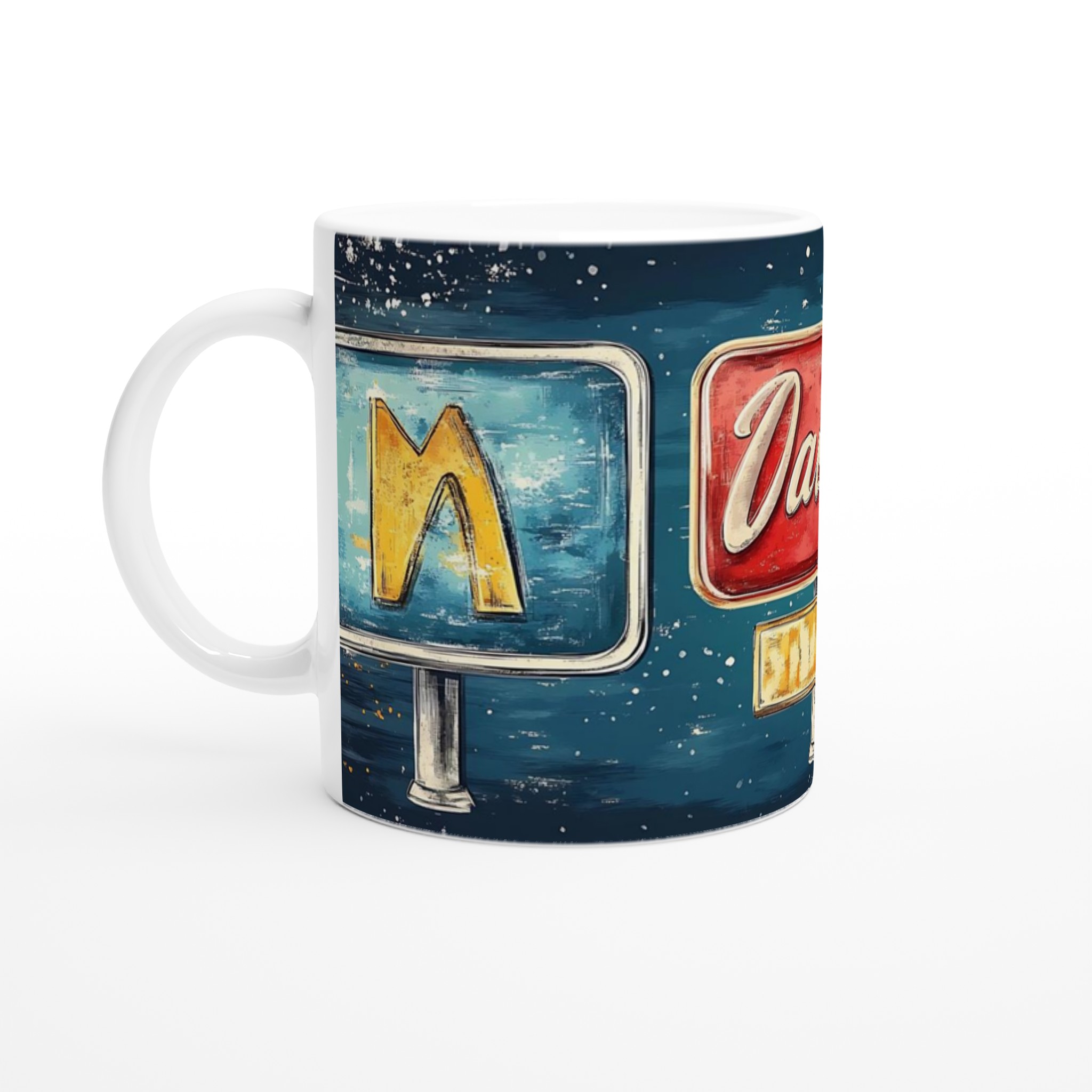 Inspirerad av klassiska amerikanska neonskyltar, ger denna mugg en lekfull och nostalgisk känsla till din dryckesupplevelse. Den blanka ytan ger ett skarpt och levande tryck som verkligen sticker ut, oavsett om det är en personlig design, ett roligt citat eller en present till någon du tycker om.