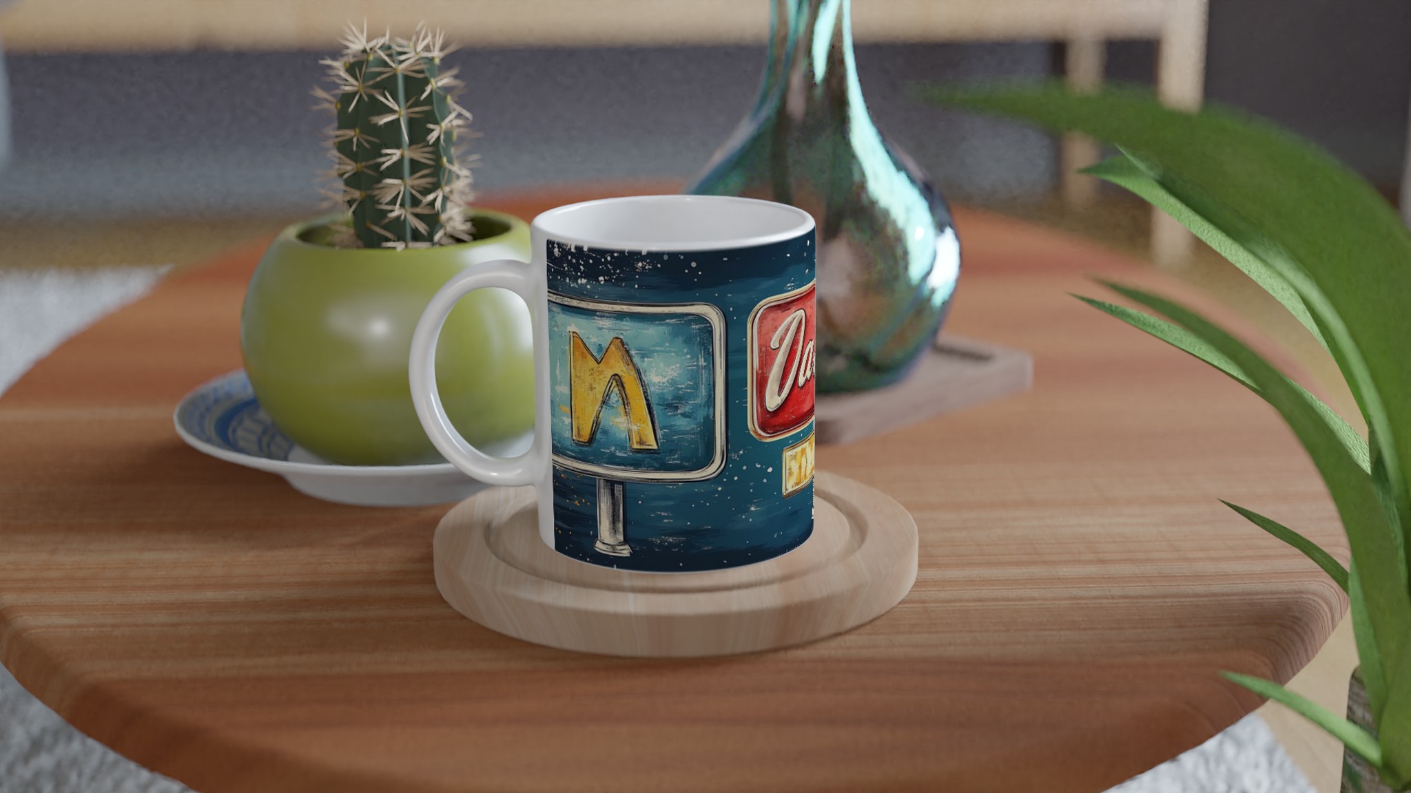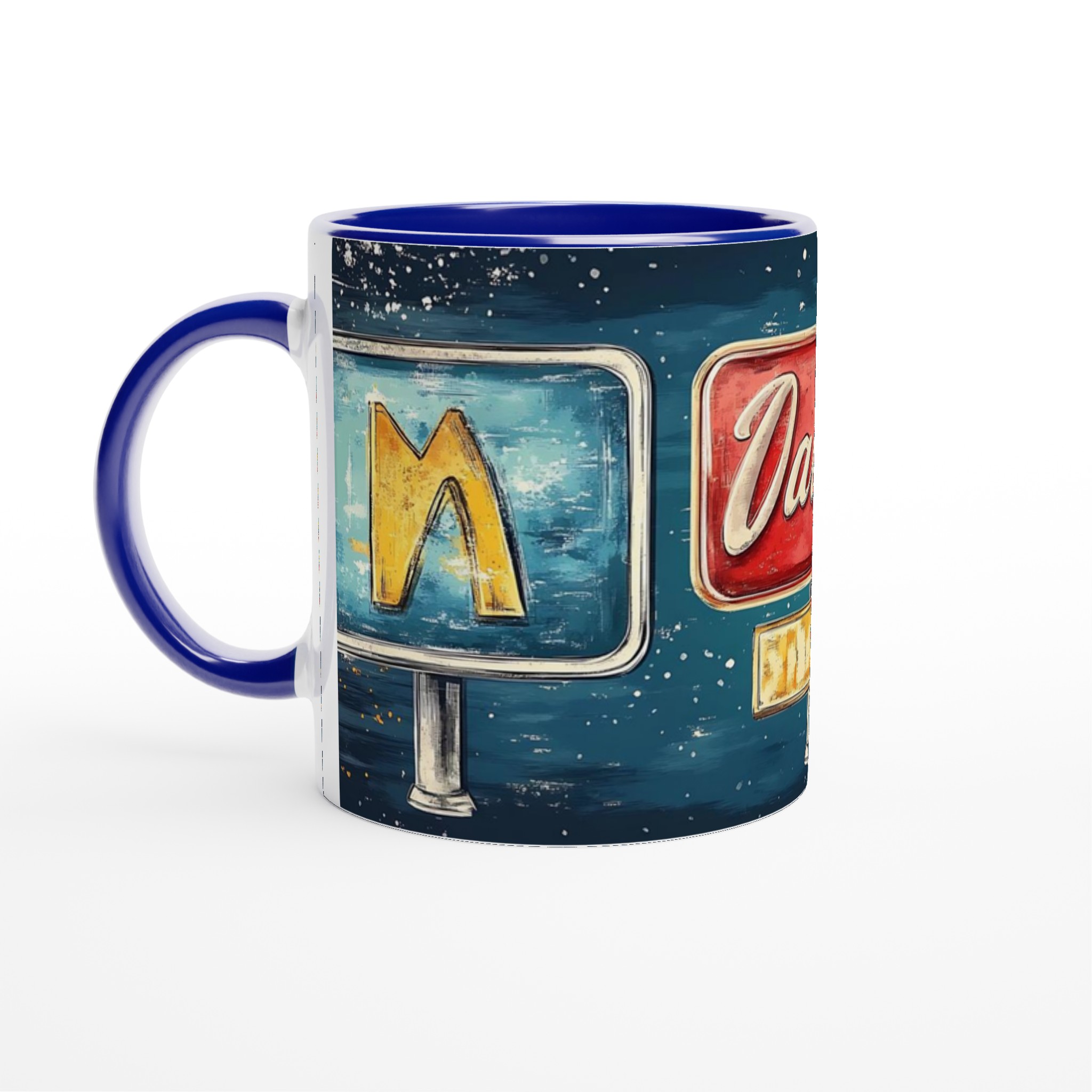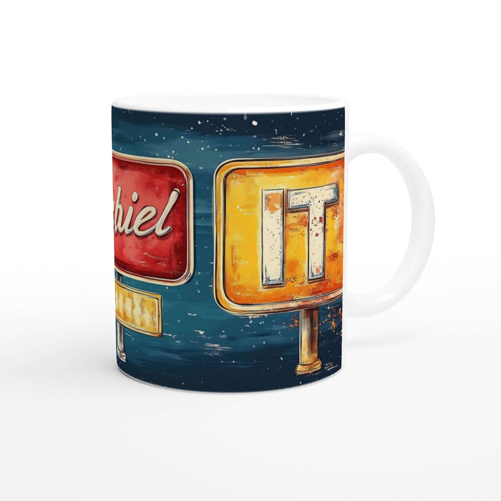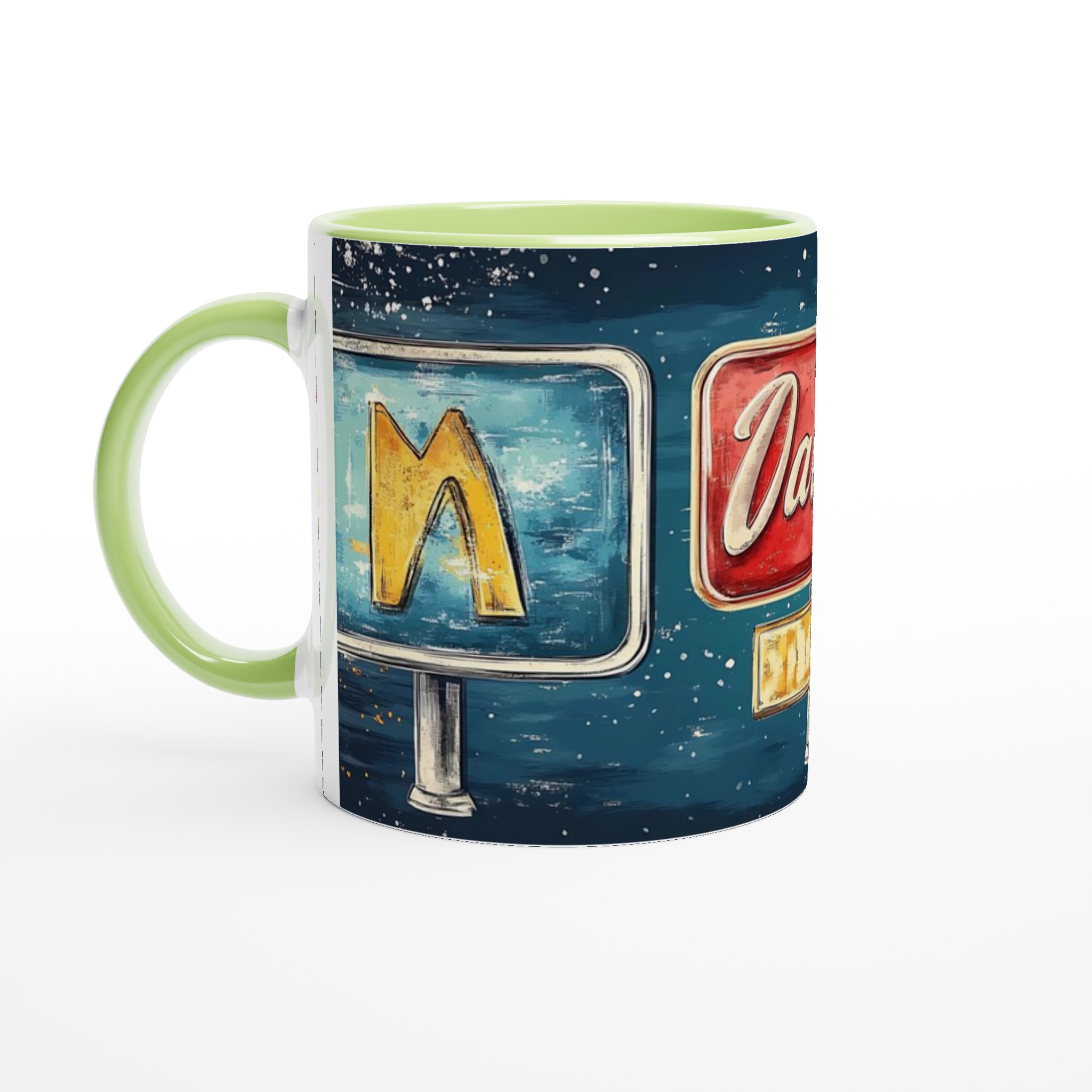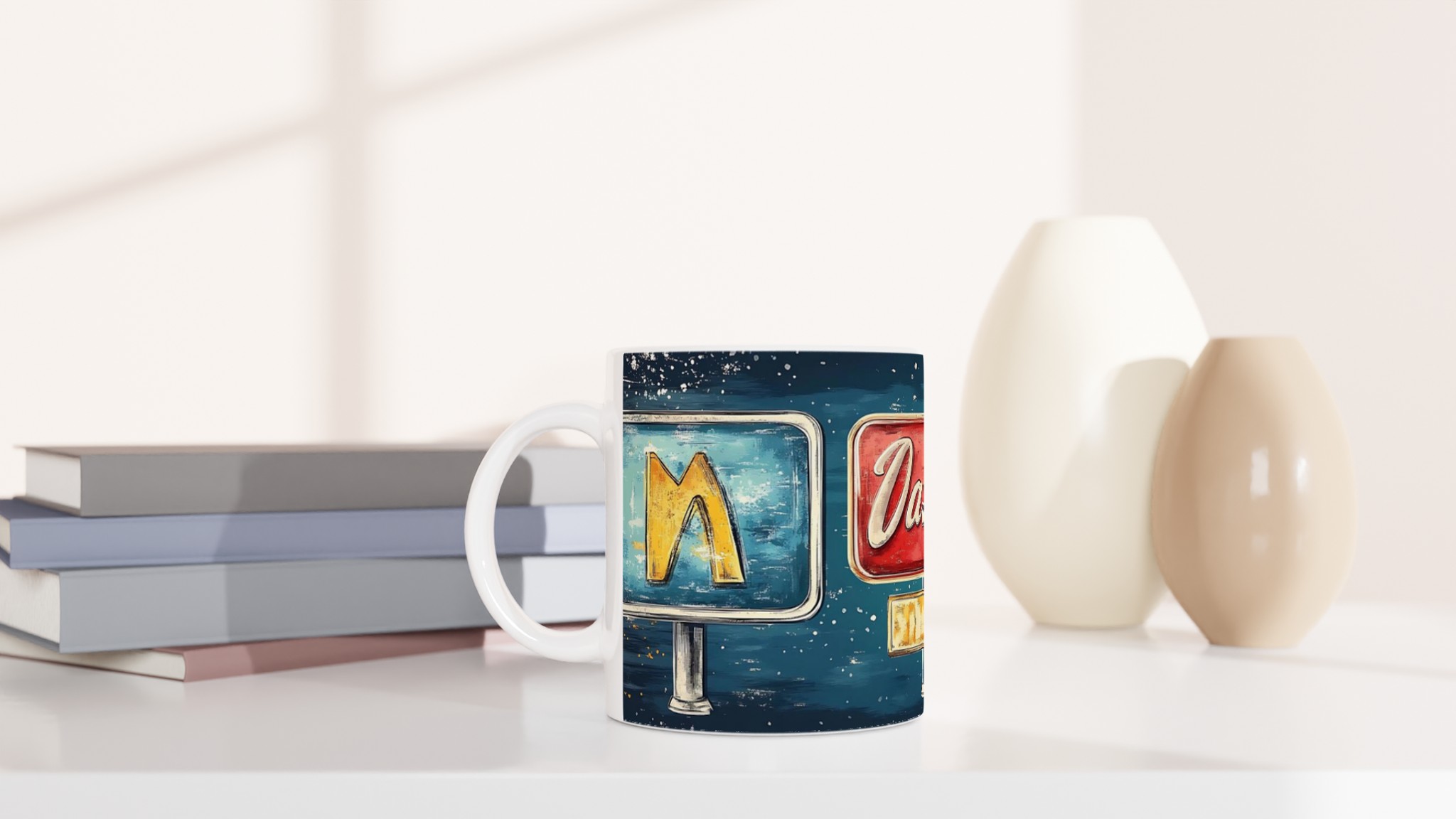 Inspirerad av klassiska amerikanska neonskyltar, ger denna mugg en lekfull och nostalgisk känsla till din dryckesupplevelse. Den blanka ytan ger ett skarpt och levande tryck som verkligen sticker ut, oavsett om det är en personlig design, ett roligt citat eller en present till någon du tycker om.