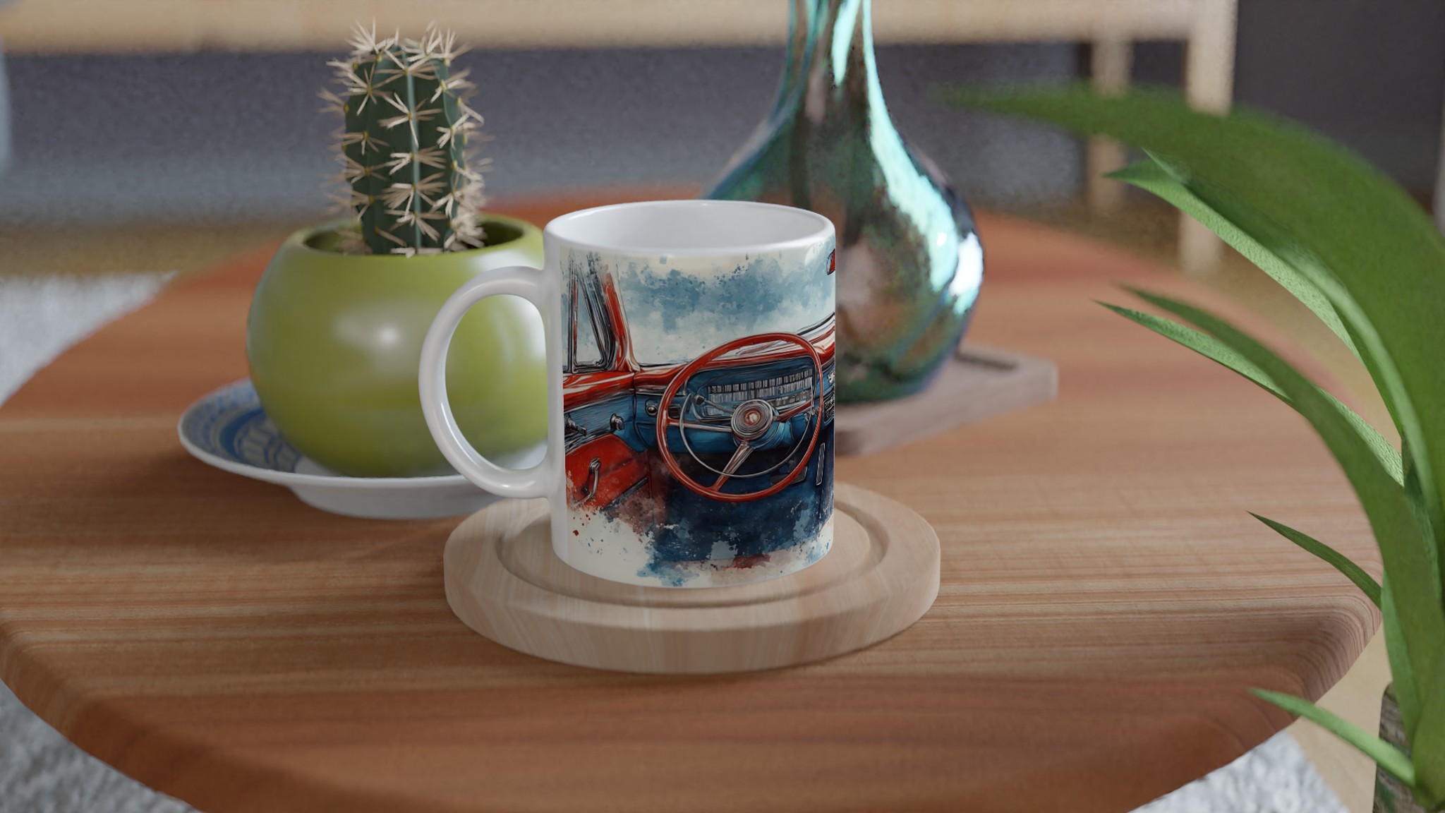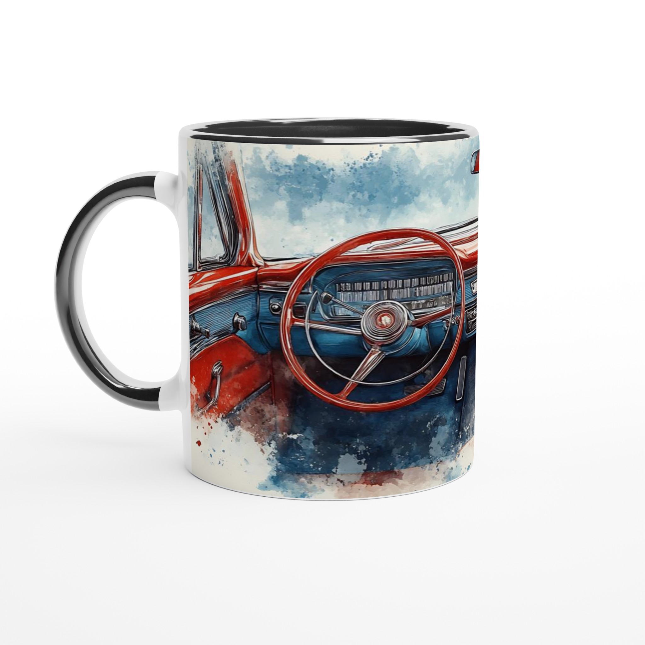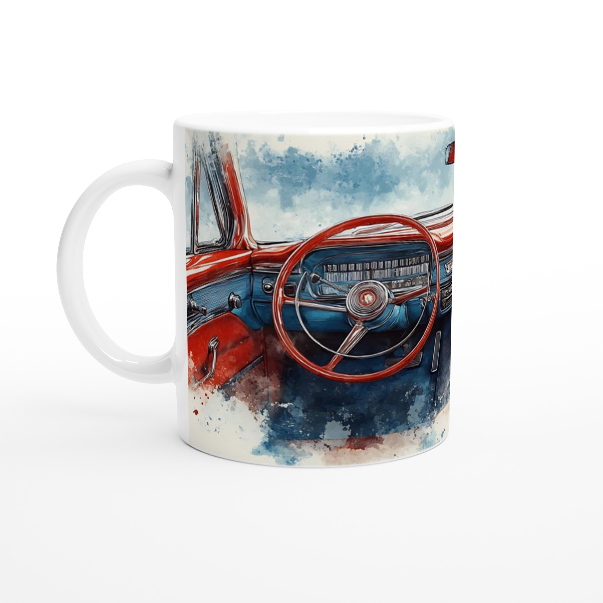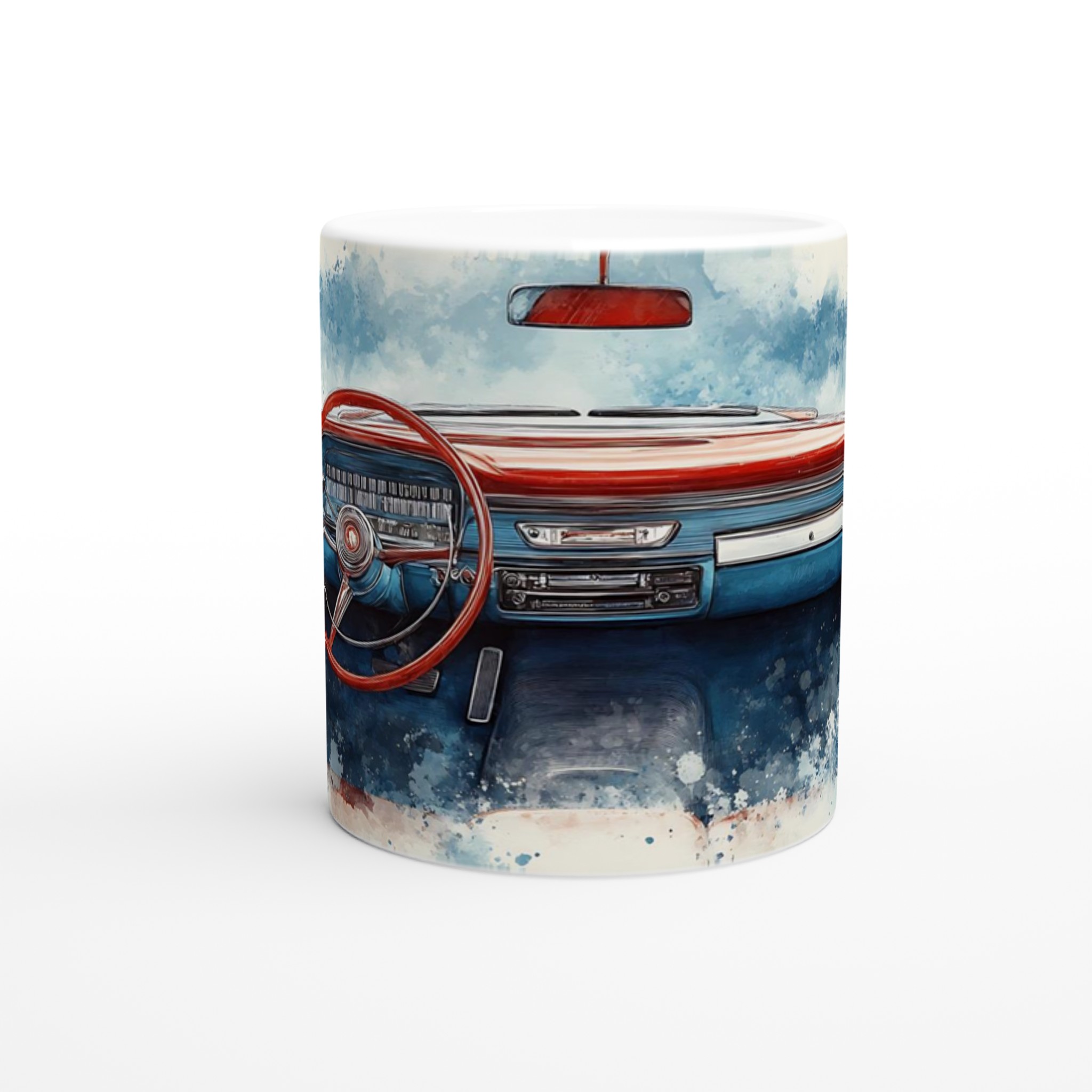 Fånga känslan av nostalgi med vår unika ”Retro Road Trip”-keramikmugg, som föreställer en konstnärlig akvarellvy av en klassisk bilinteriör i levande rött och svalt blått. Denna mugg är perfekt för alla bilentusiaster, vintageälskare eller de som uppskattar en touch av retrocharm i sin vardag. Bilden av instrumentpanelen och ratten i dess distinkta färgpalett förmedlar en känsla av äventyr och tidlös stil, vilket gör varje klunk till en resa tillbaka i tiden. Välj bland en palett av sju attraktiva keramiska färger – från klassisk vit till djärv röd och lugn blå – för att matcha din personliga stil eller din inredning, och gör denna unika mugg till din egen.