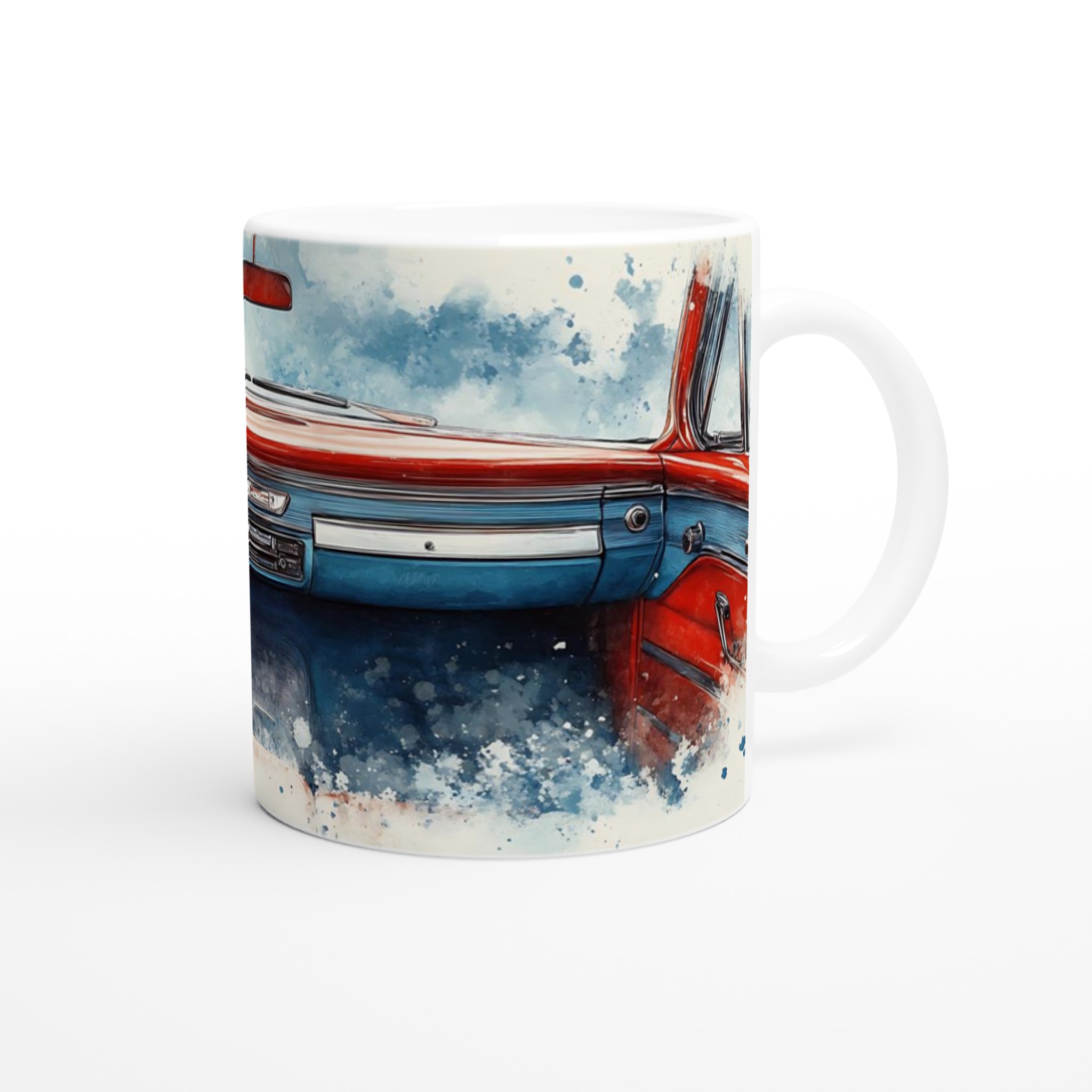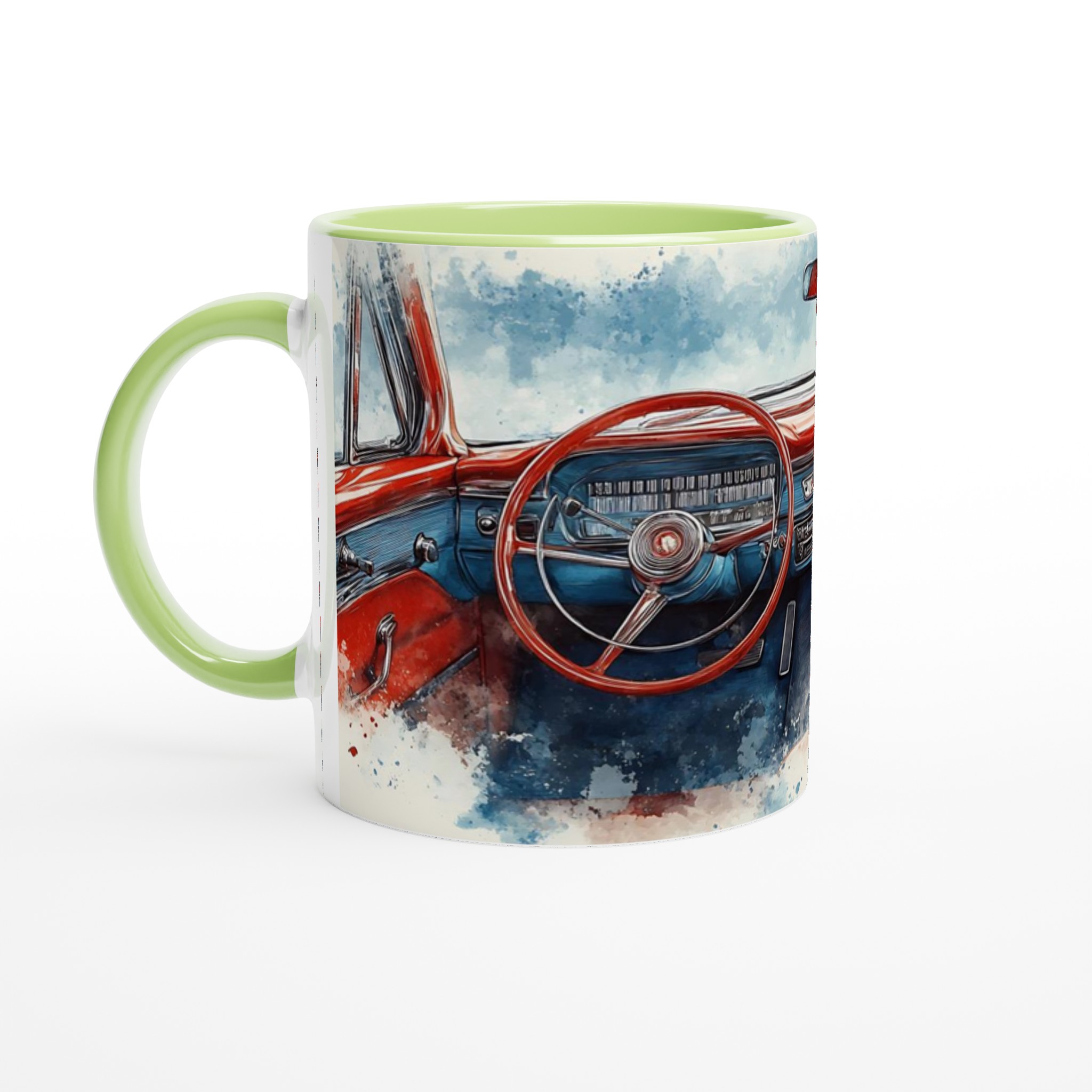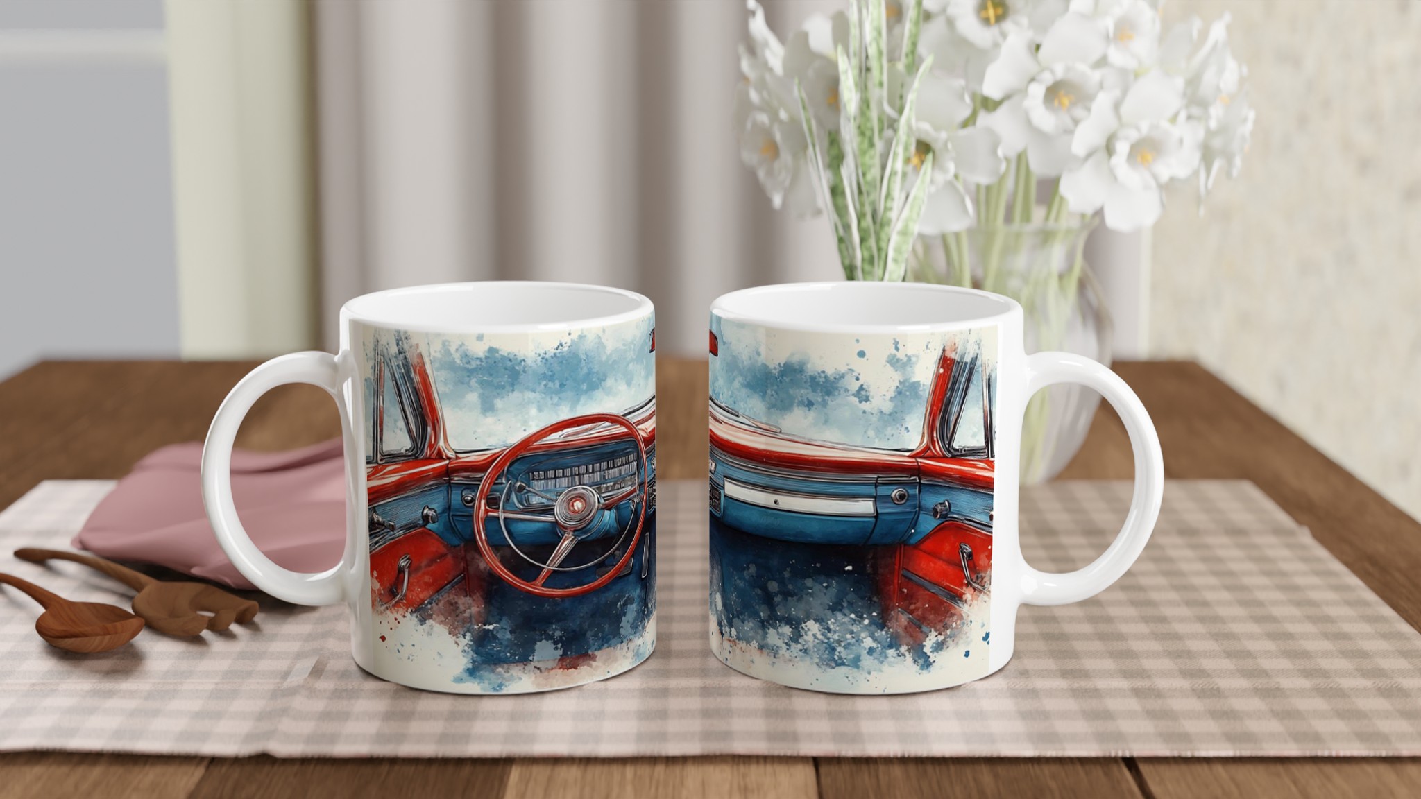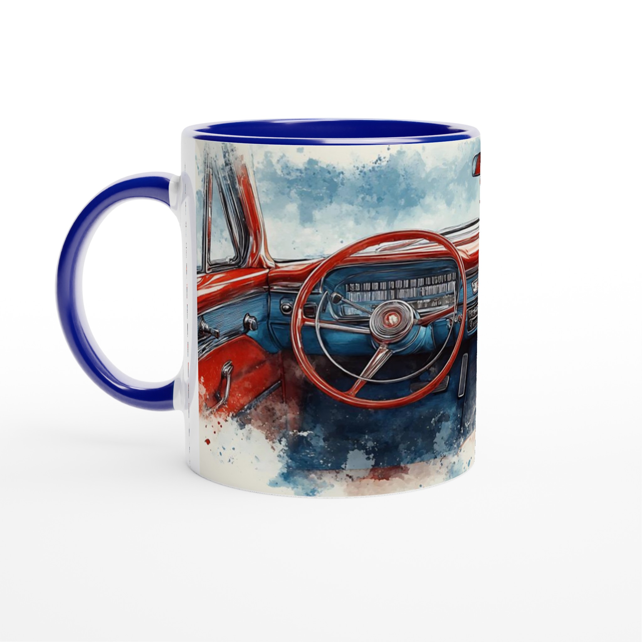 Fånga känslan av nostalgi med vår unika ”Retro Road Trip”-keramikmugg, som föreställer en konstnärlig akvarellvy av en klassisk bilinteriör i levande rött och svalt blått. Denna mugg är perfekt för alla bilentusiaster, vintageälskare eller de som uppskattar en touch av retrocharm i sin vardag. Bilden av instrumentpanelen och ratten i dess distinkta färgpalett förmedlar en känsla av äventyr och tidlös stil, vilket gör varje klunk till en resa tillbaka i tiden. Välj bland en palett av sju attraktiva keramiska färger – från klassisk vit till djärv röd och lugn blå – för att matcha din personliga stil eller din inredning, och gör denna unika mugg till din egen.