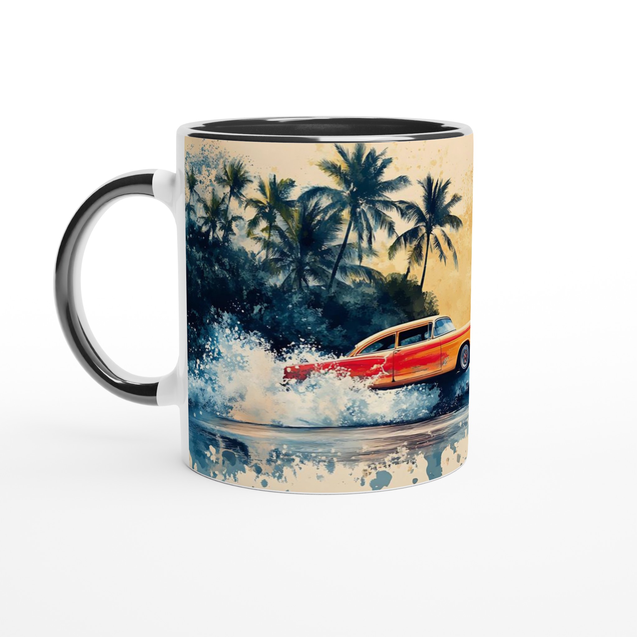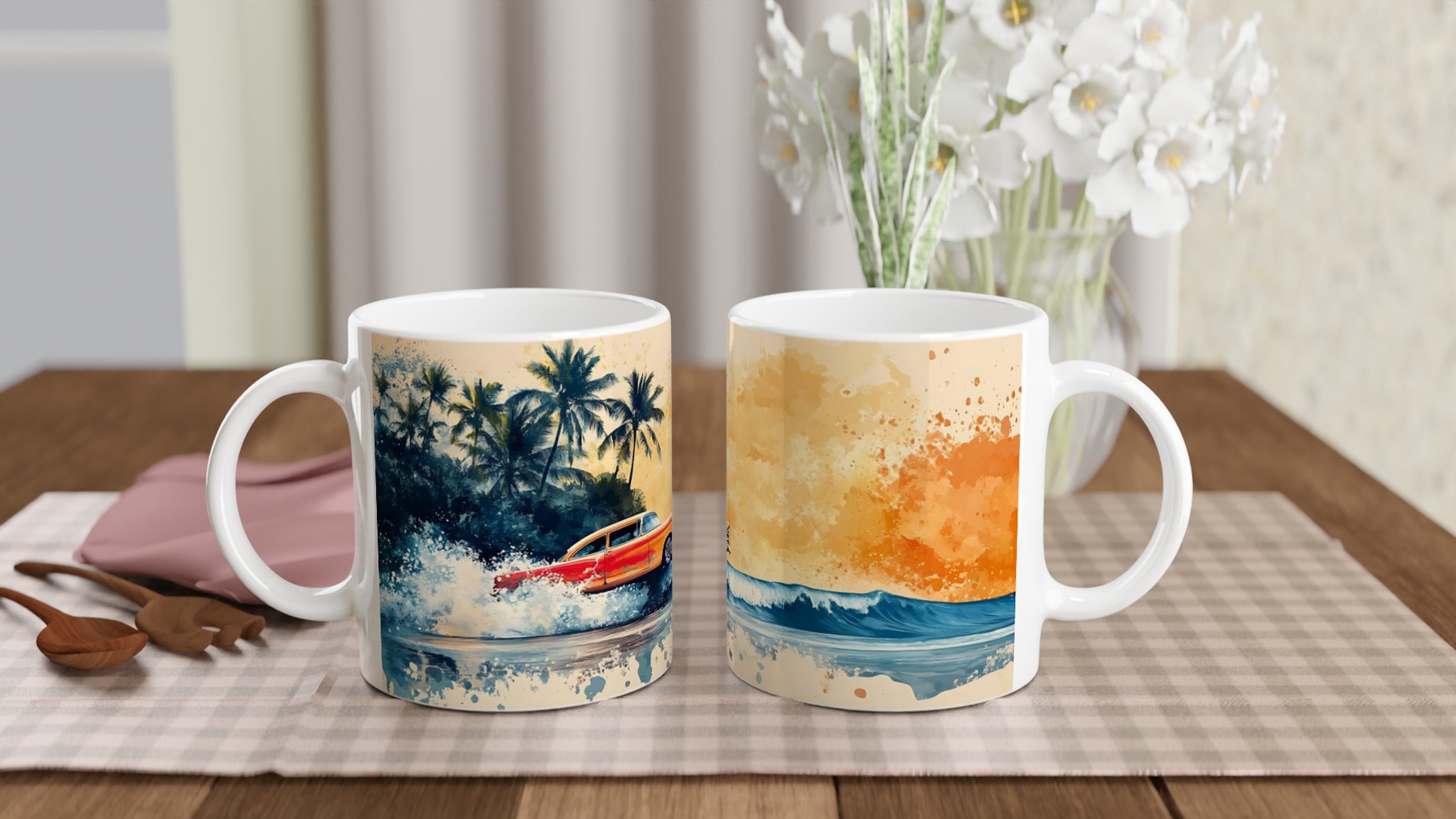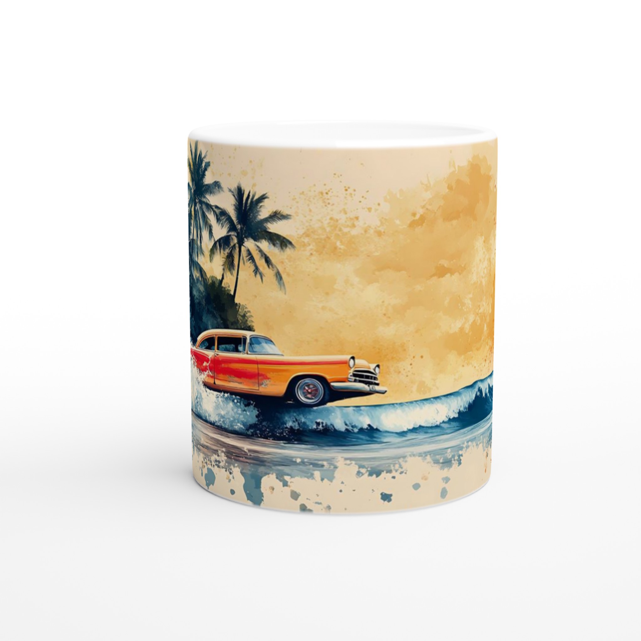 Sätt guldkant på din dag med en mugg som fångar den bekymmersfria känslan av en tropisk roadtrip! Denna unika keramiska mugg blir snabbt en favorit, perfekt för morgonkaffet, kvällens varma choklad eller när du bara vill njuta av en kopp te och drömma dig bort till soliga stränder. Det dynamiska akvarellmotivet, med en klassisk bil som surfar på vågor framför palmer och en levande orange solnedgång, framhävs med klara och levande färger på den blanka ytan, som håller sig fina även efter många turer i mikron och diskmaskinen.