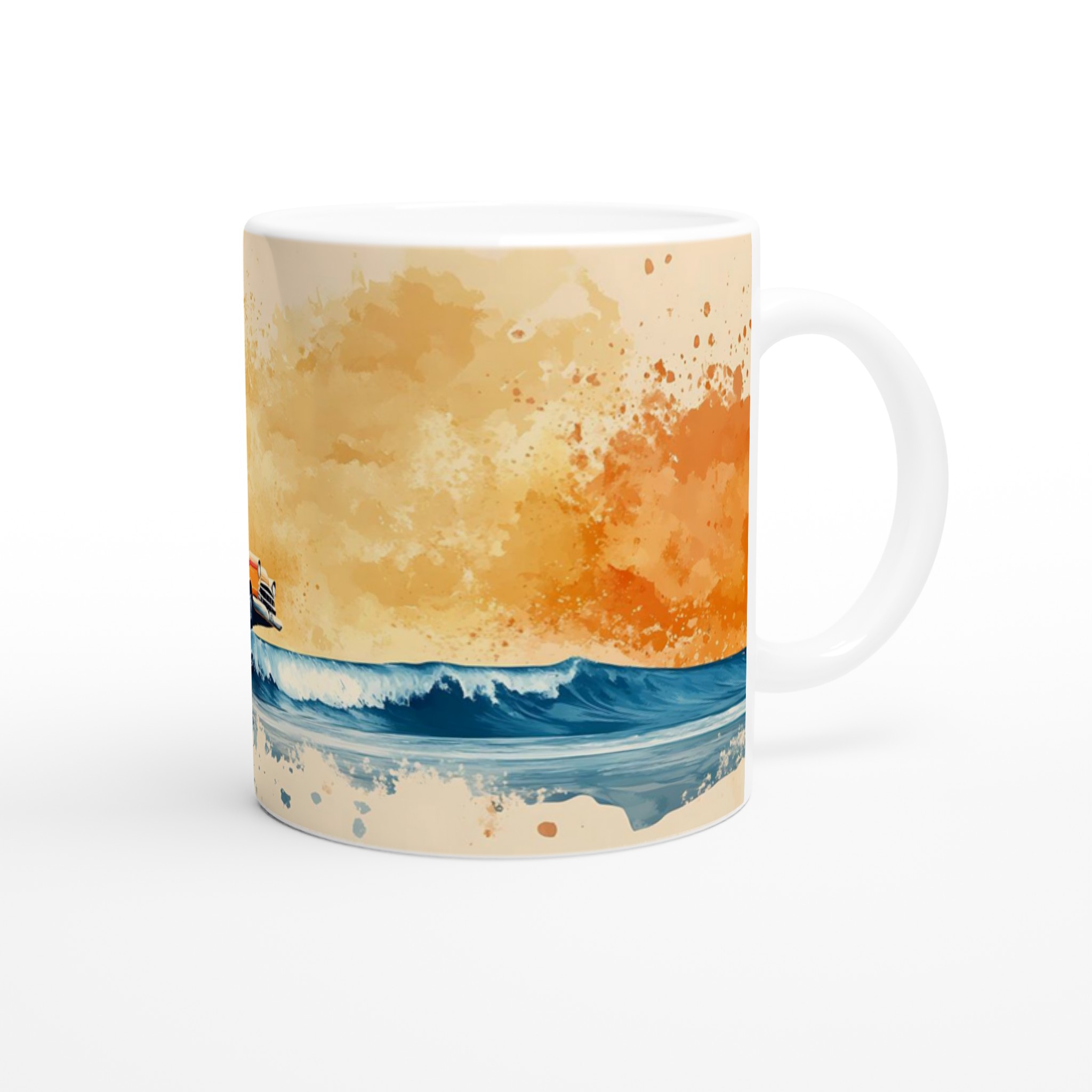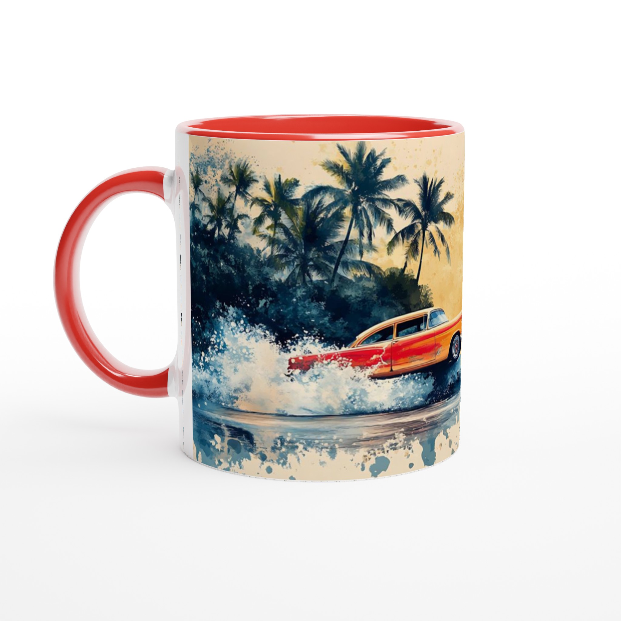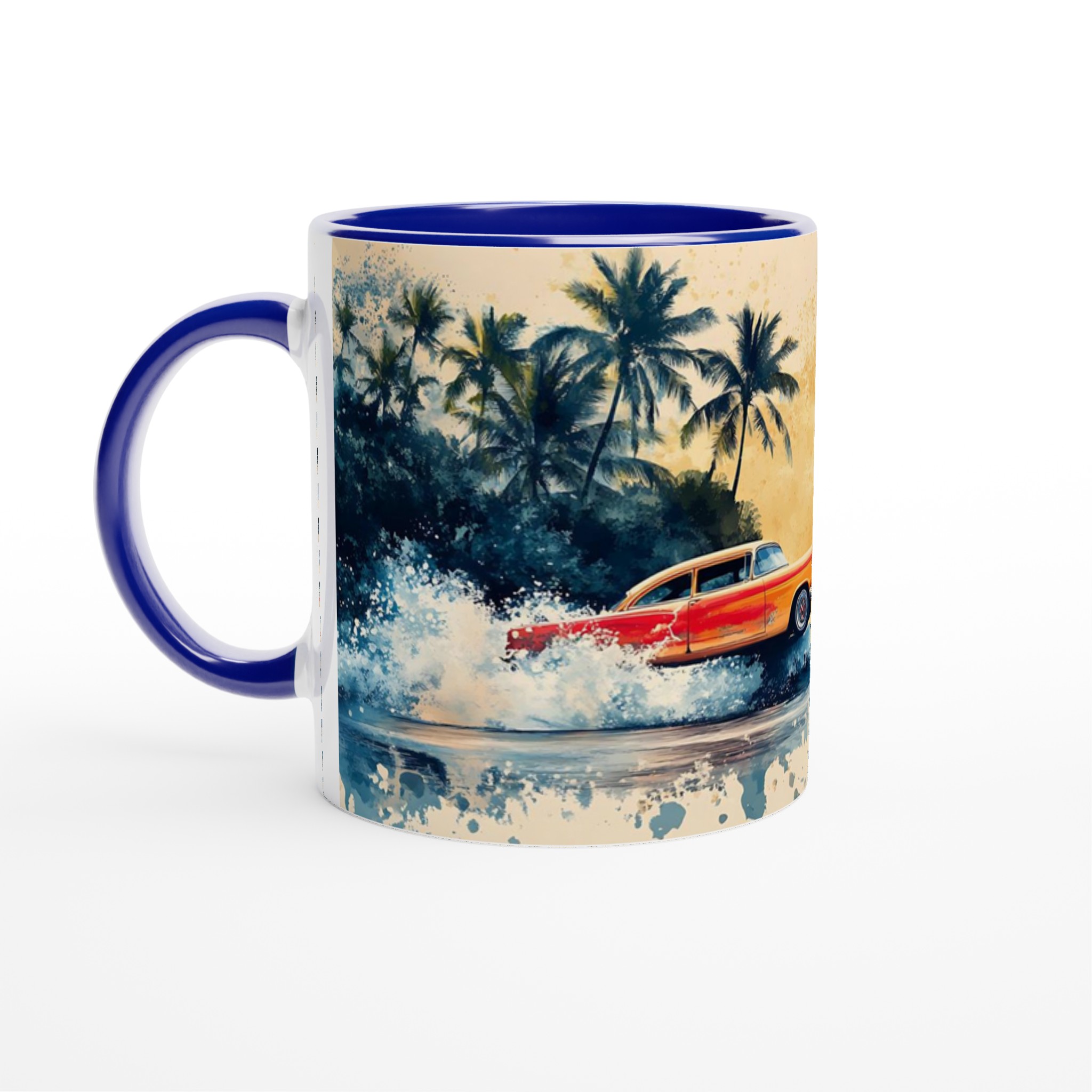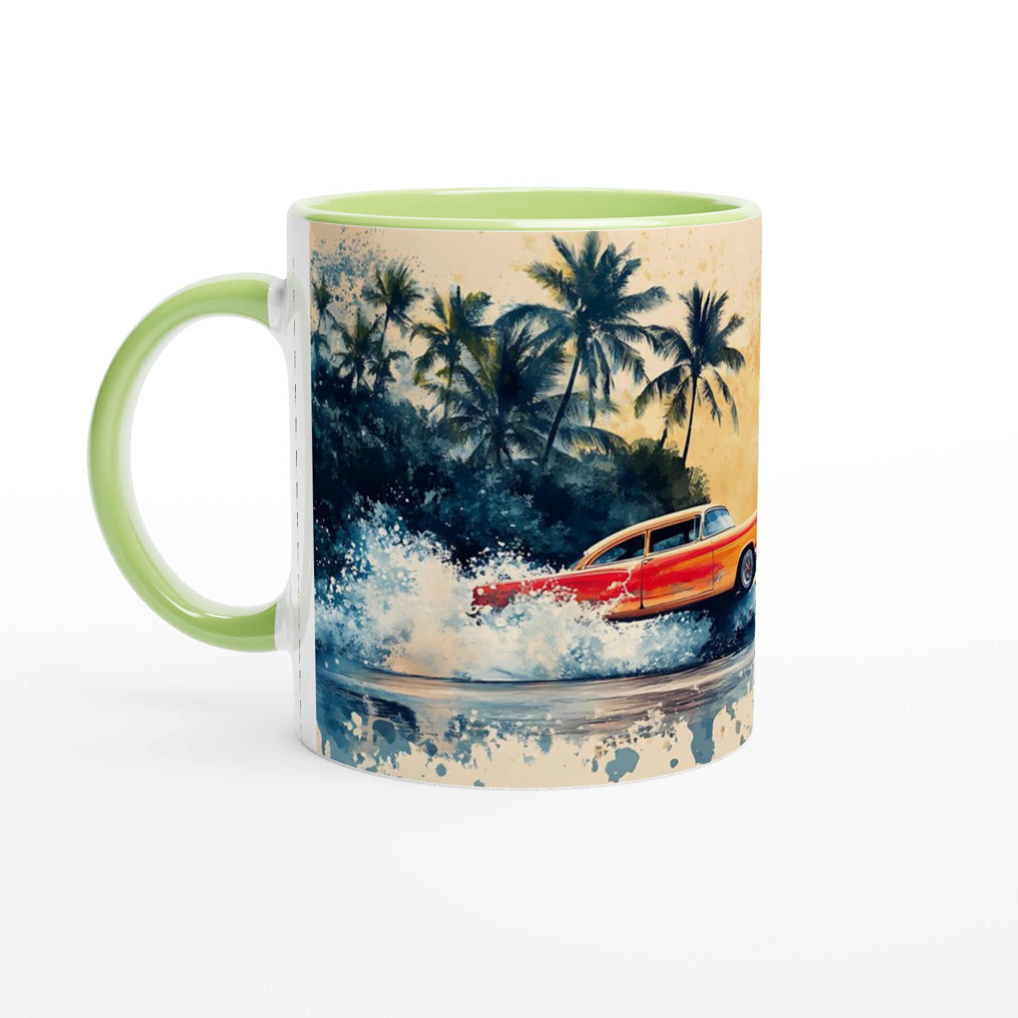 Sätt guldkant på din dag med en mugg som fångar den bekymmersfria känslan av en tropisk roadtrip! Denna unika keramiska mugg blir snabbt en favorit, perfekt för morgonkaffet, kvällens varma choklad eller när du bara vill njuta av en kopp te och drömma dig bort till soliga stränder. Det dynamiska akvarellmotivet, med en klassisk bil som surfar på vågor framför palmer och en levande orange solnedgång, framhävs med klara och levande färger på den blanka ytan, som håller sig fina även efter många turer i mikron och diskmaskinen.