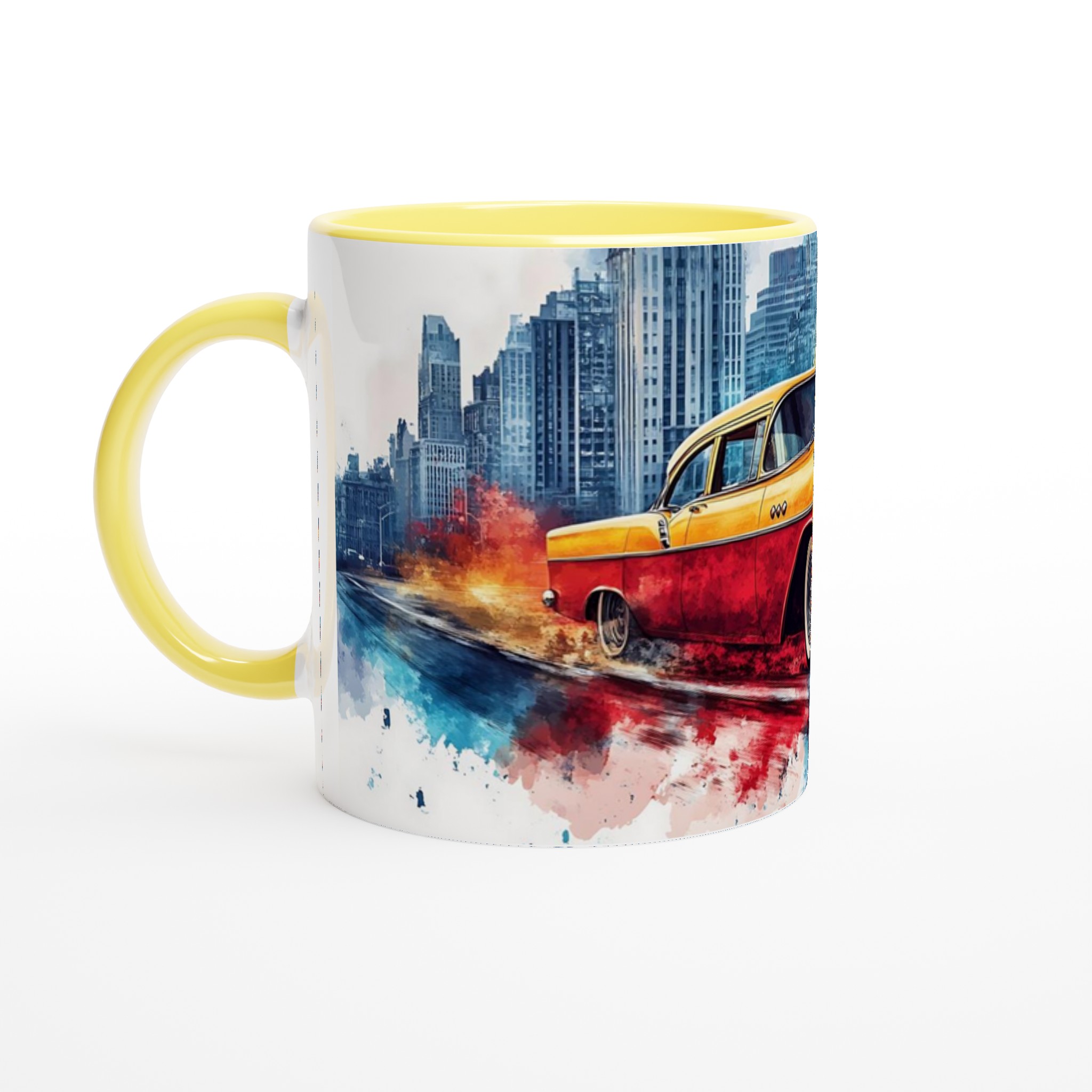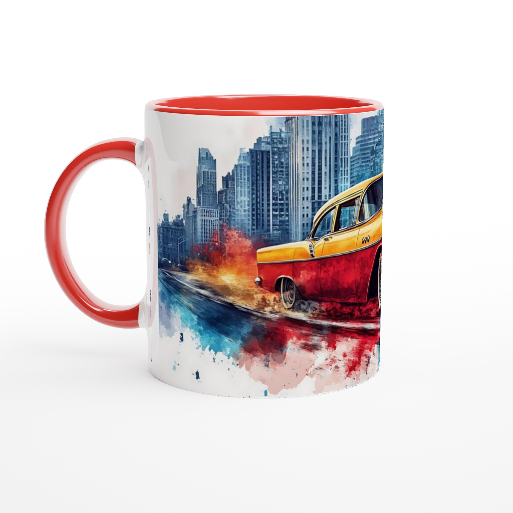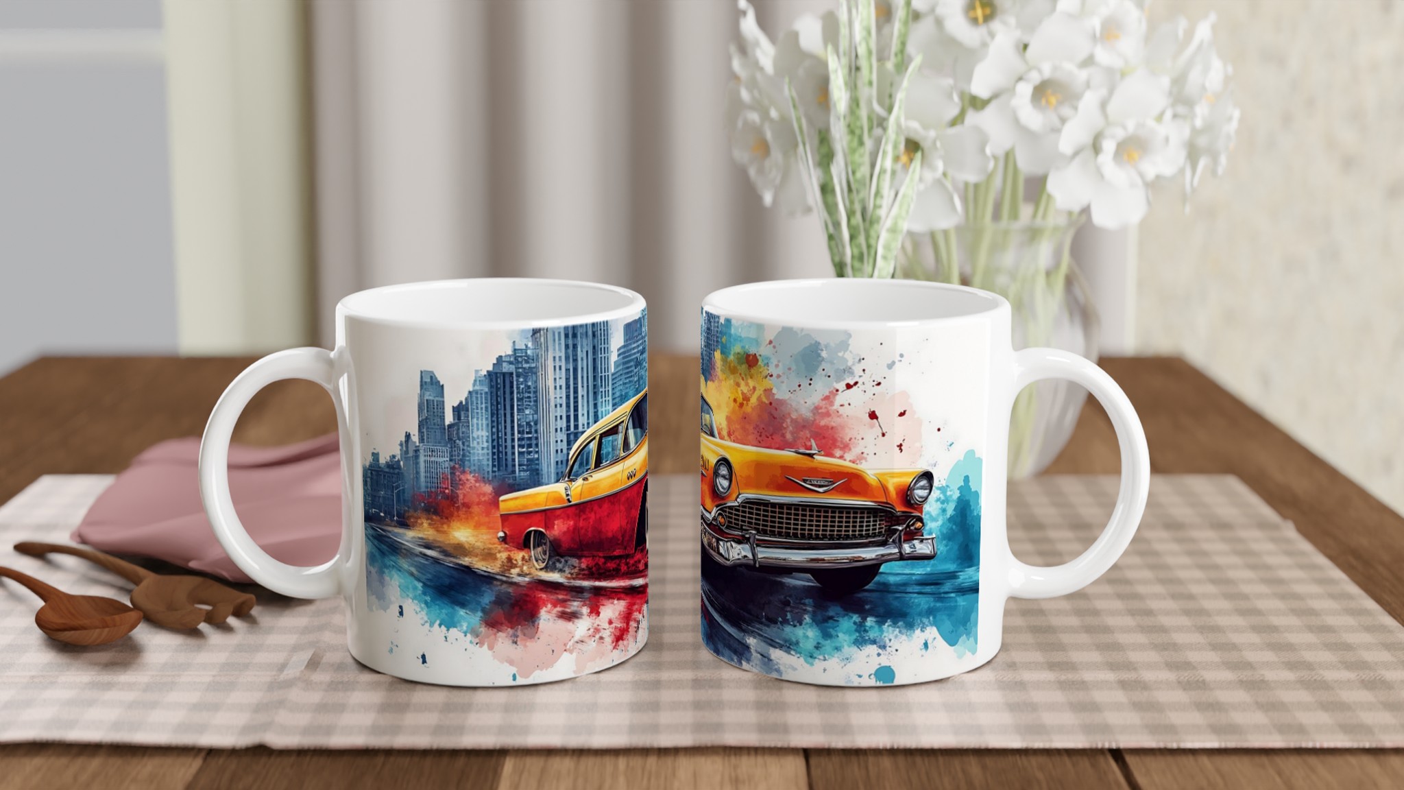 Fånga känslan av frihet och retrostil med den här unika keramiska muggen! Inspirerad av akvarellkonsten med en klassisk bil som kör genom ett färgstarkt stadslandskap, blir denna mugg snabbt en vardagsfavorit. Perfekt för morgonkaffet, kvällens varma choklad eller när du bara vill njuta av en kopp te och drömma dig bort till öppna vägar. Den blanka vita ytan gör att trycken framhävs med klara och levande färger, som håller sig fina även efter många turer i mikron och diskmaskinen.