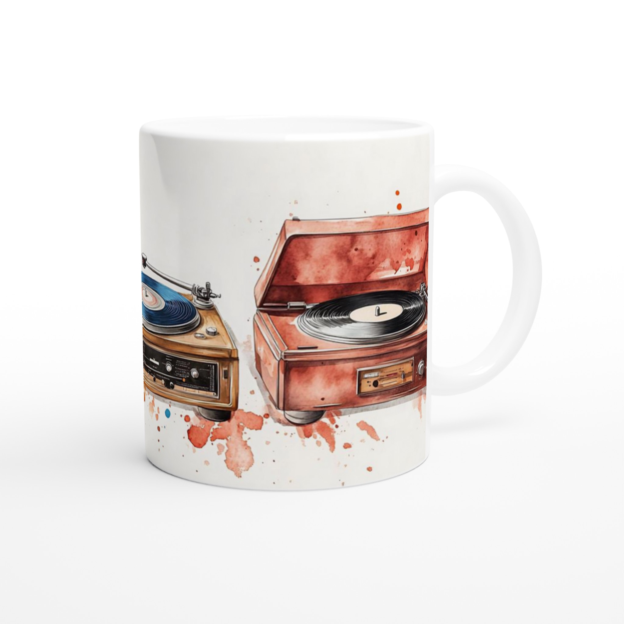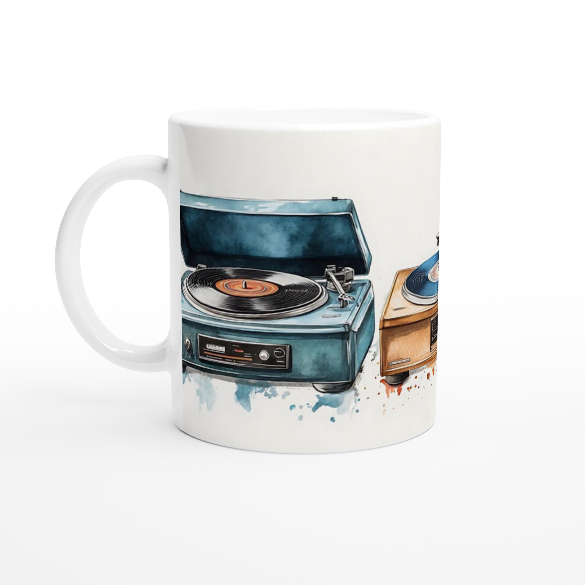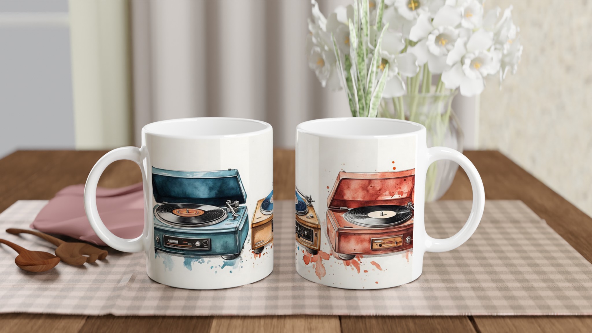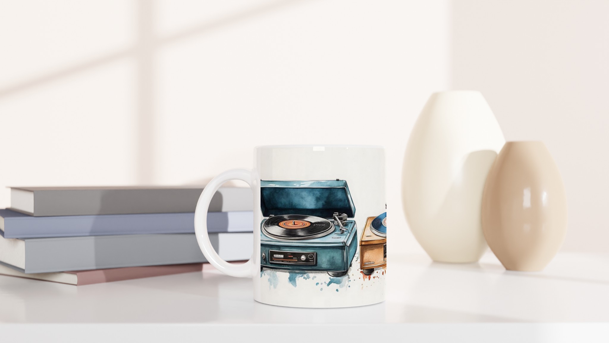 Kliv tillbaka i tiden och njut av din favoritdryck med vår charmiga Retro Skivspelare Mugg. Inspirerad av klassiska vinylspelare i vackra akvarelltoner av turkos, rödbrunt och sandgult, är denna mugg en hyllning till den tidlösa musiken. Den blanka vita ytan ger ett skarpt och levande tryck som verkligen sticker ut, oavsett om det är en personlig design, ett roligt citat eller en present till någon du tycker om.