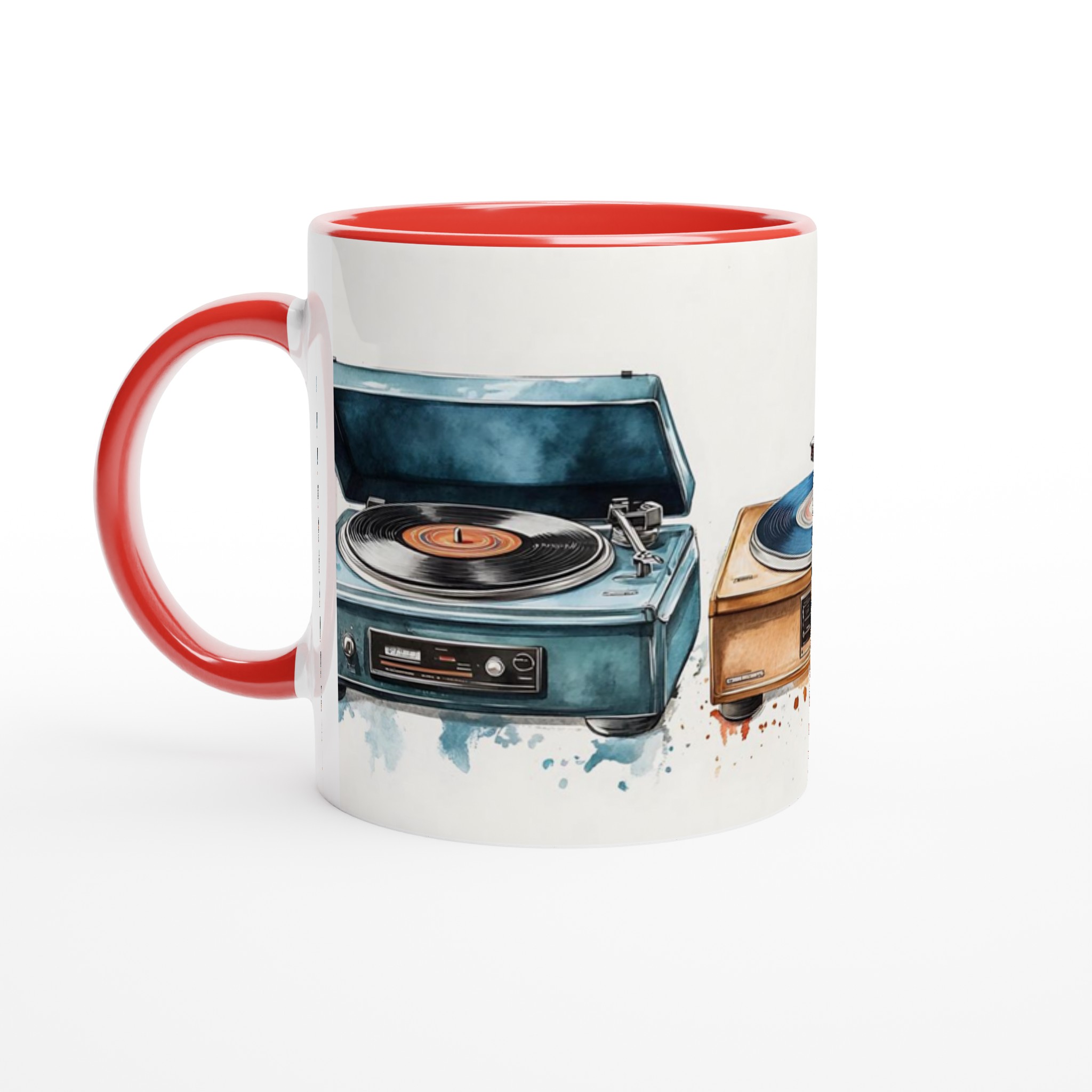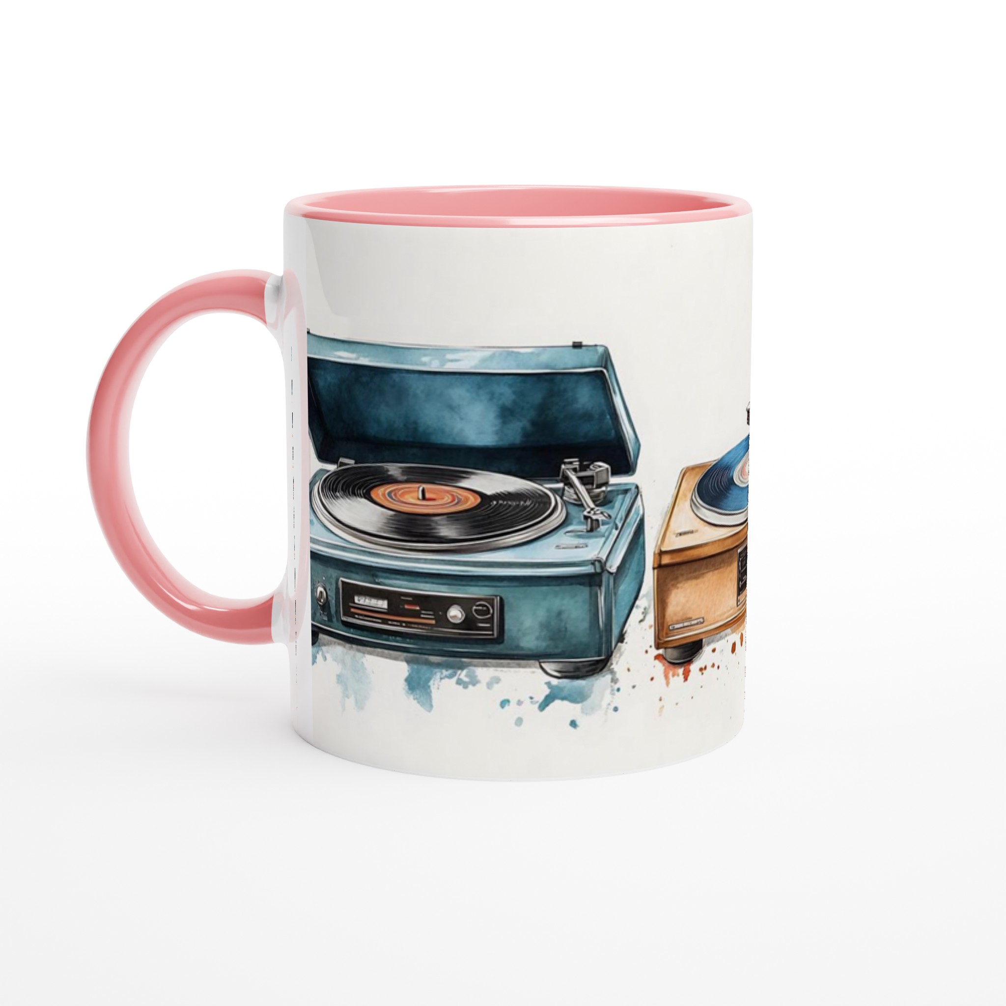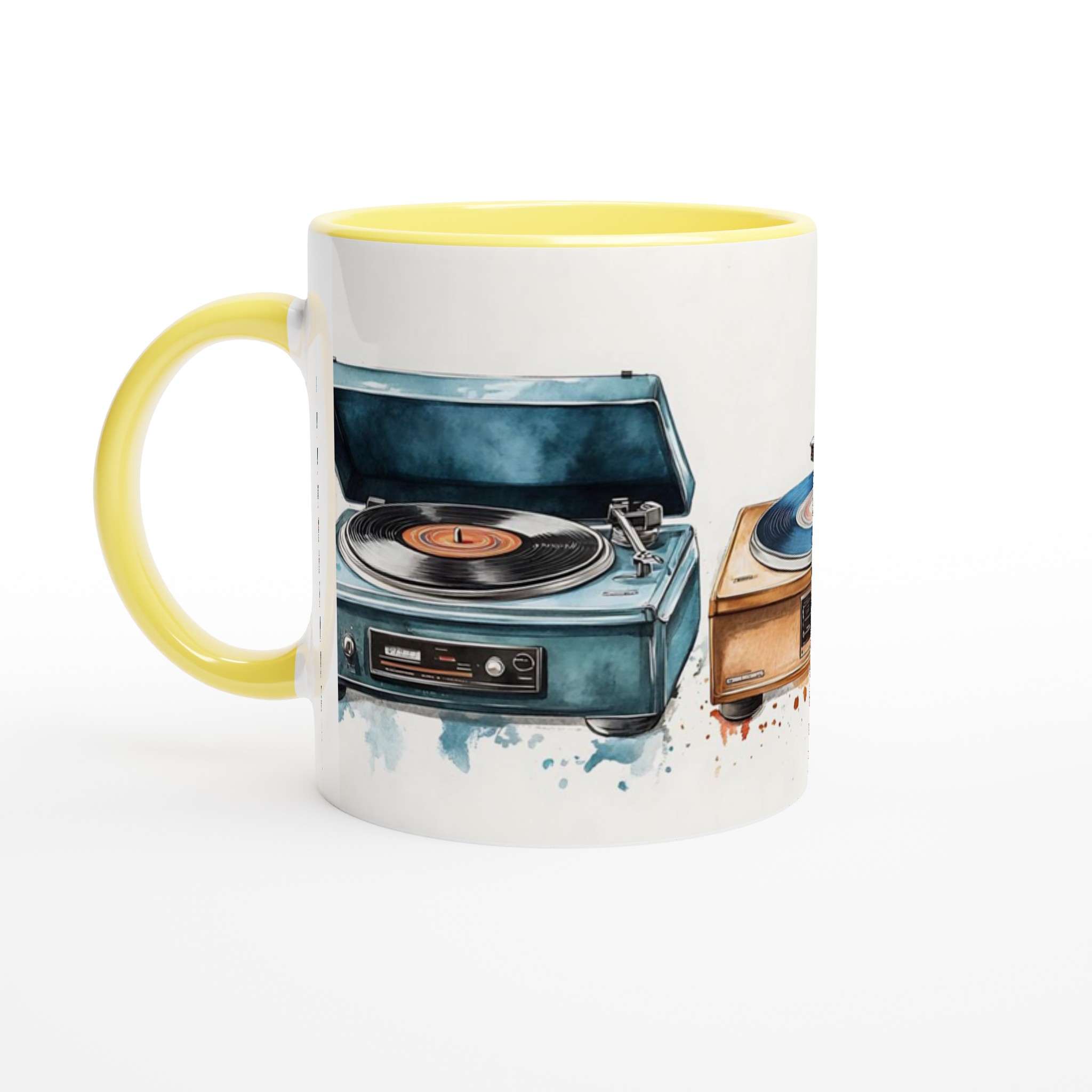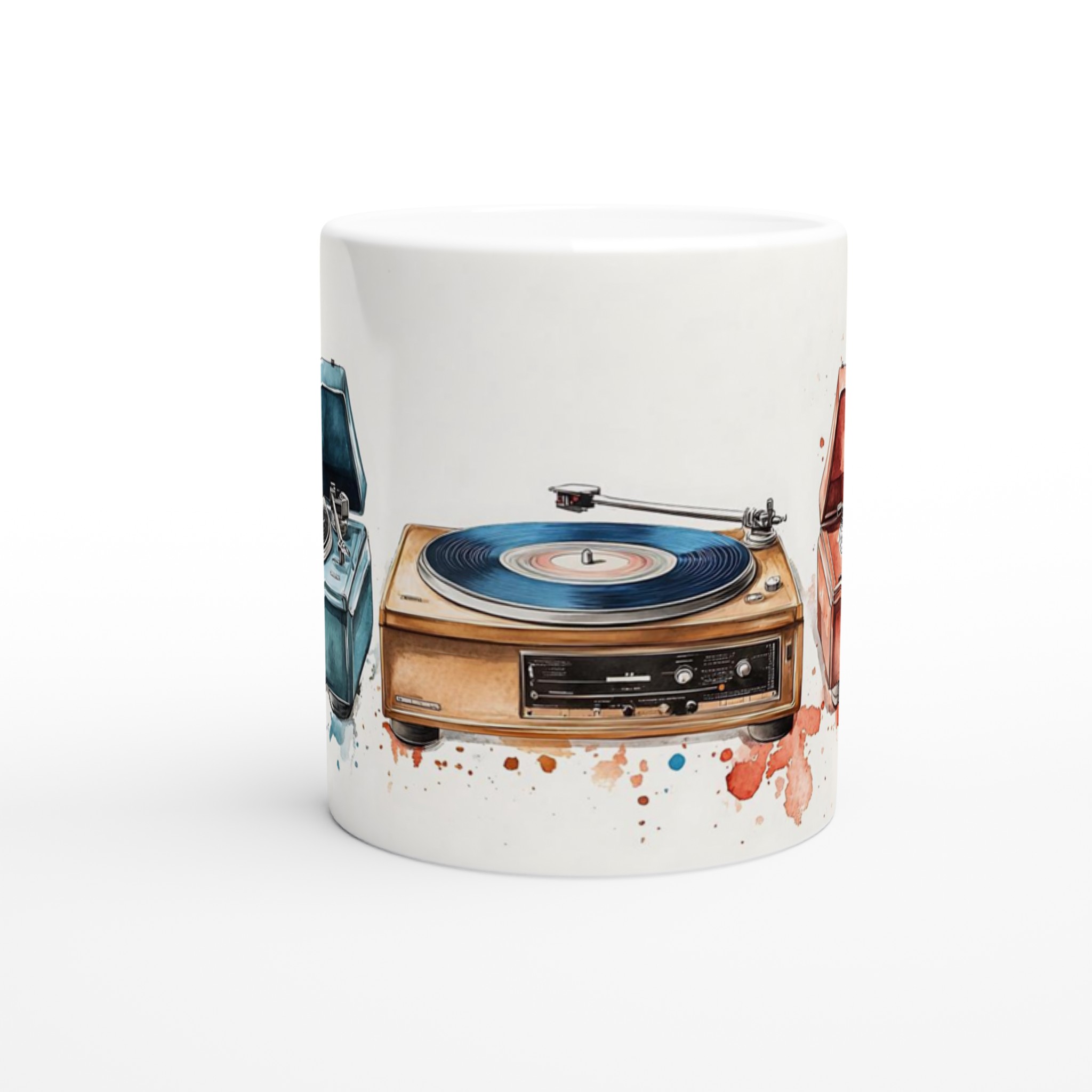 Kliv tillbaka i tiden och njut av din favoritdryck med vår charmiga Retro Skivspelare Mugg. Inspirerad av klassiska vinylspelare i vackra akvarelltoner av turkos, rödbrunt och sandgult, är denna mugg en hyllning till den tidlösa musiken. Den blanka vita ytan ger ett skarpt och levande tryck som verkligen sticker ut, oavsett om det är en personlig design, ett roligt citat eller en present till någon du tycker om.