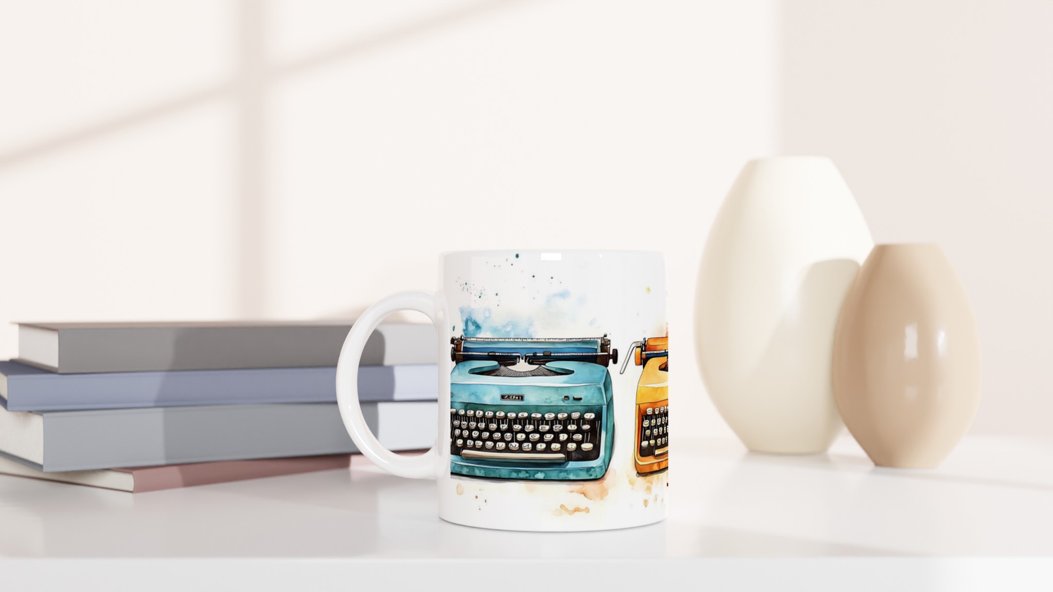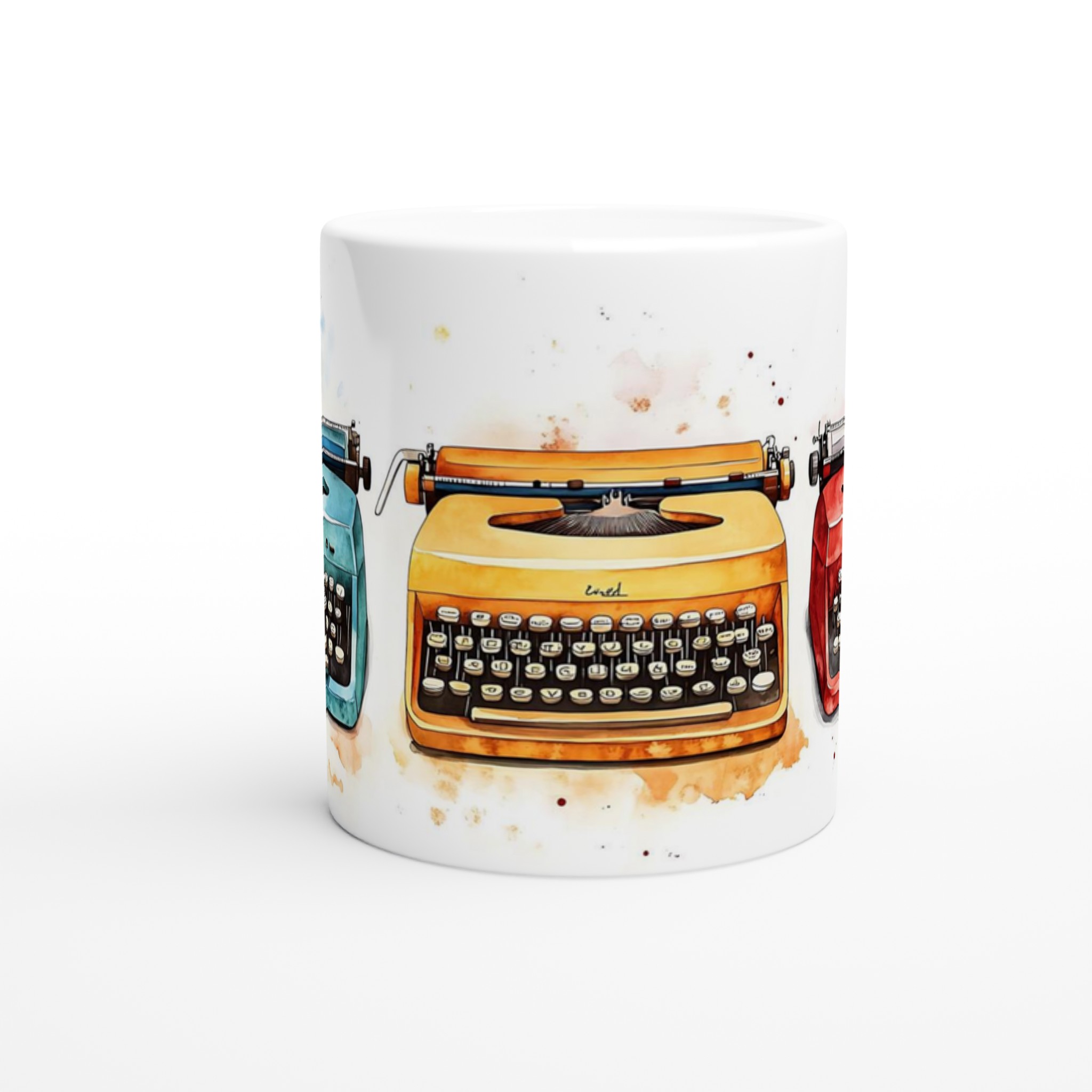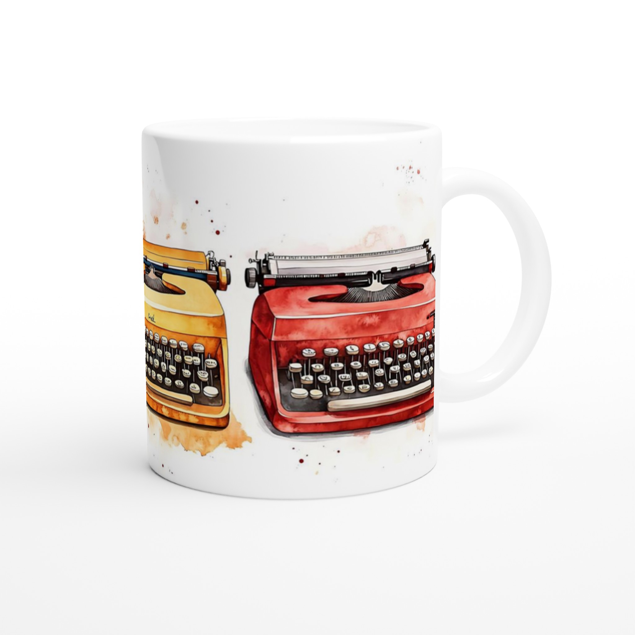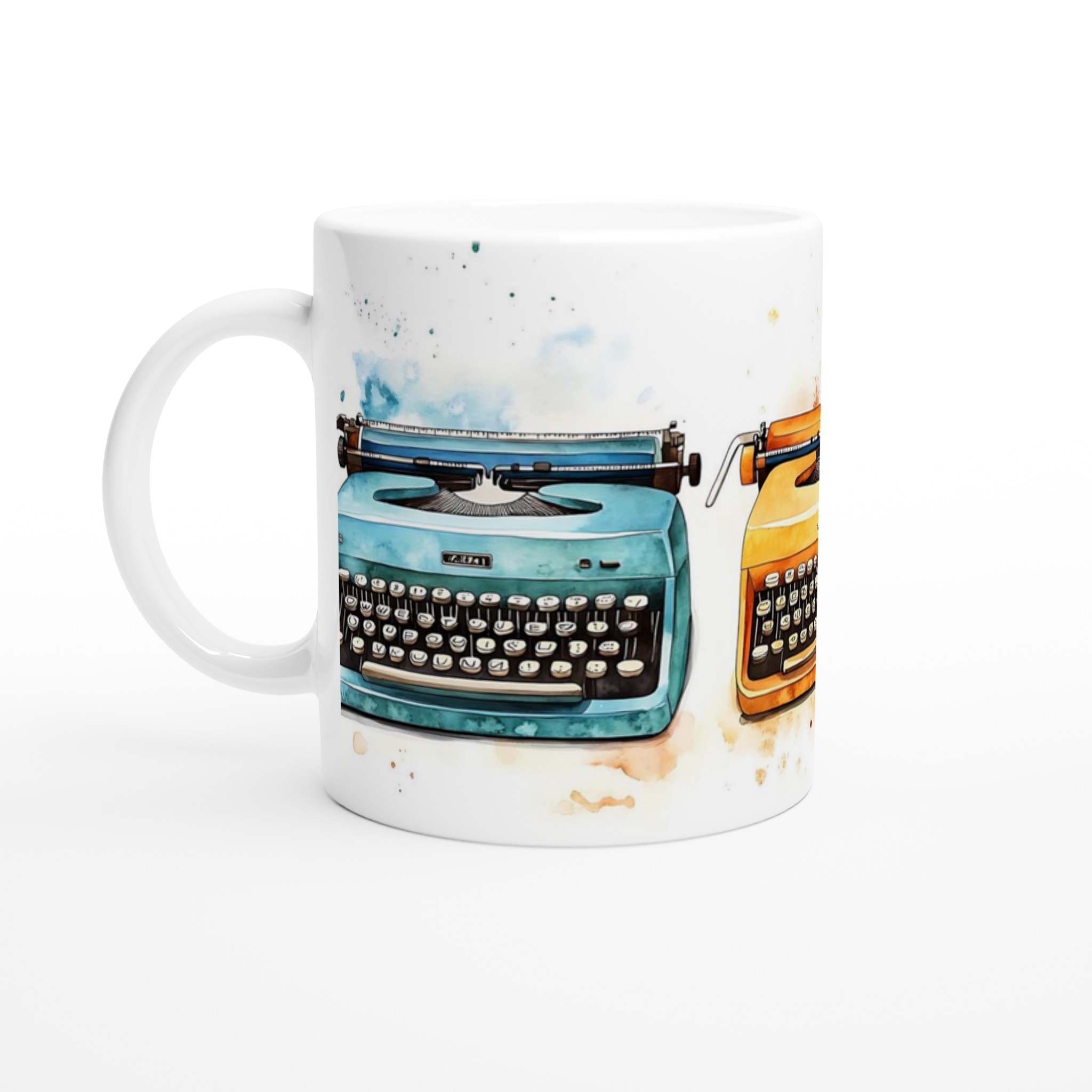 Kliv tillbaka i tiden med en touch av färg med denna charmiga keramiska mugg, som hyllar den klassiska skrivmaskinens tidlösa design. Den här stilrena muggen blir snabbt en vardagsfavorit, perfekt för morgonkaffet, kvällens varma choklad eller när du bara vill njuta av en kopp te. Med sitt unika, akvarellinspirerade tryck av retro skrivmaskiner i livfulla toner blir varje klunk en liten konstupplevelse.