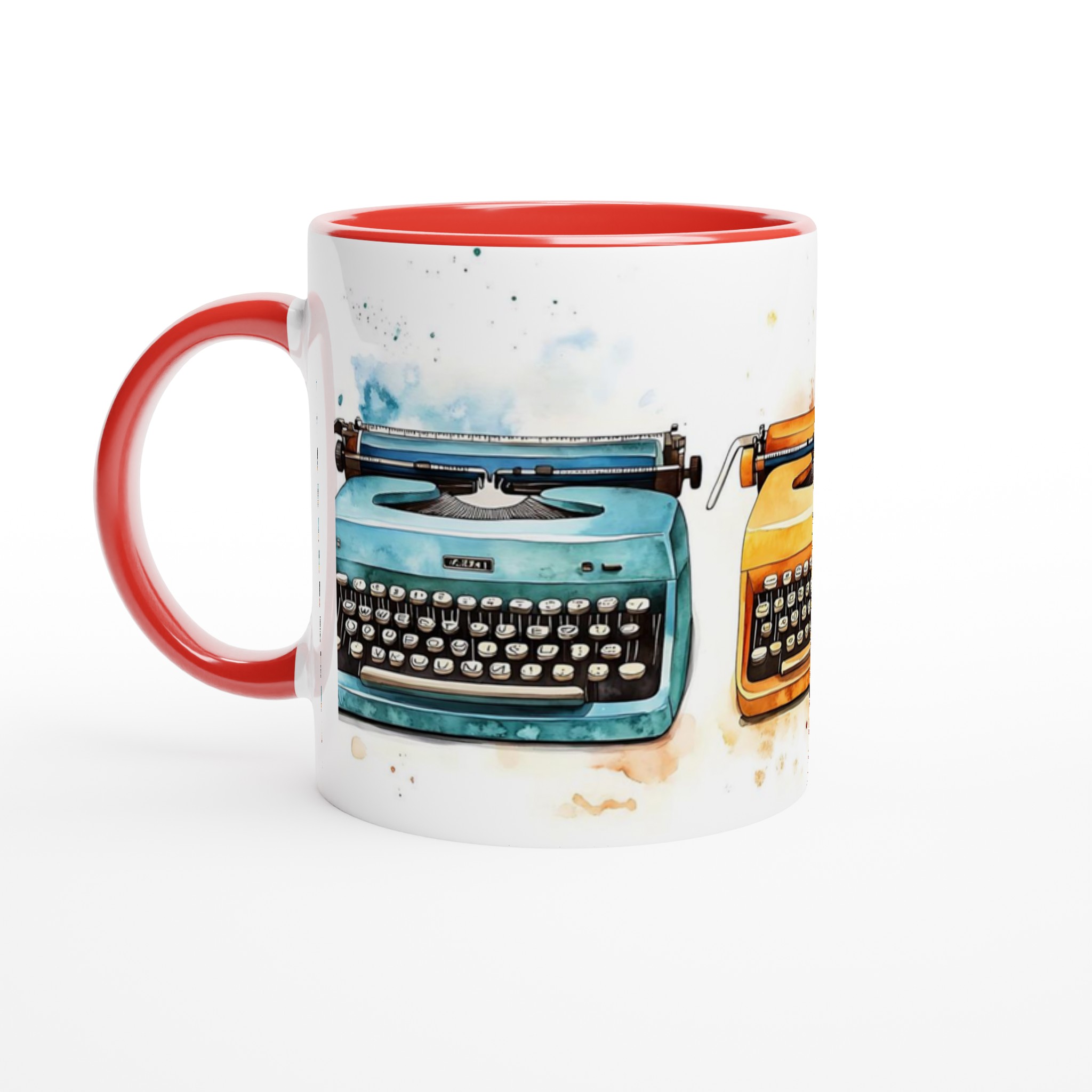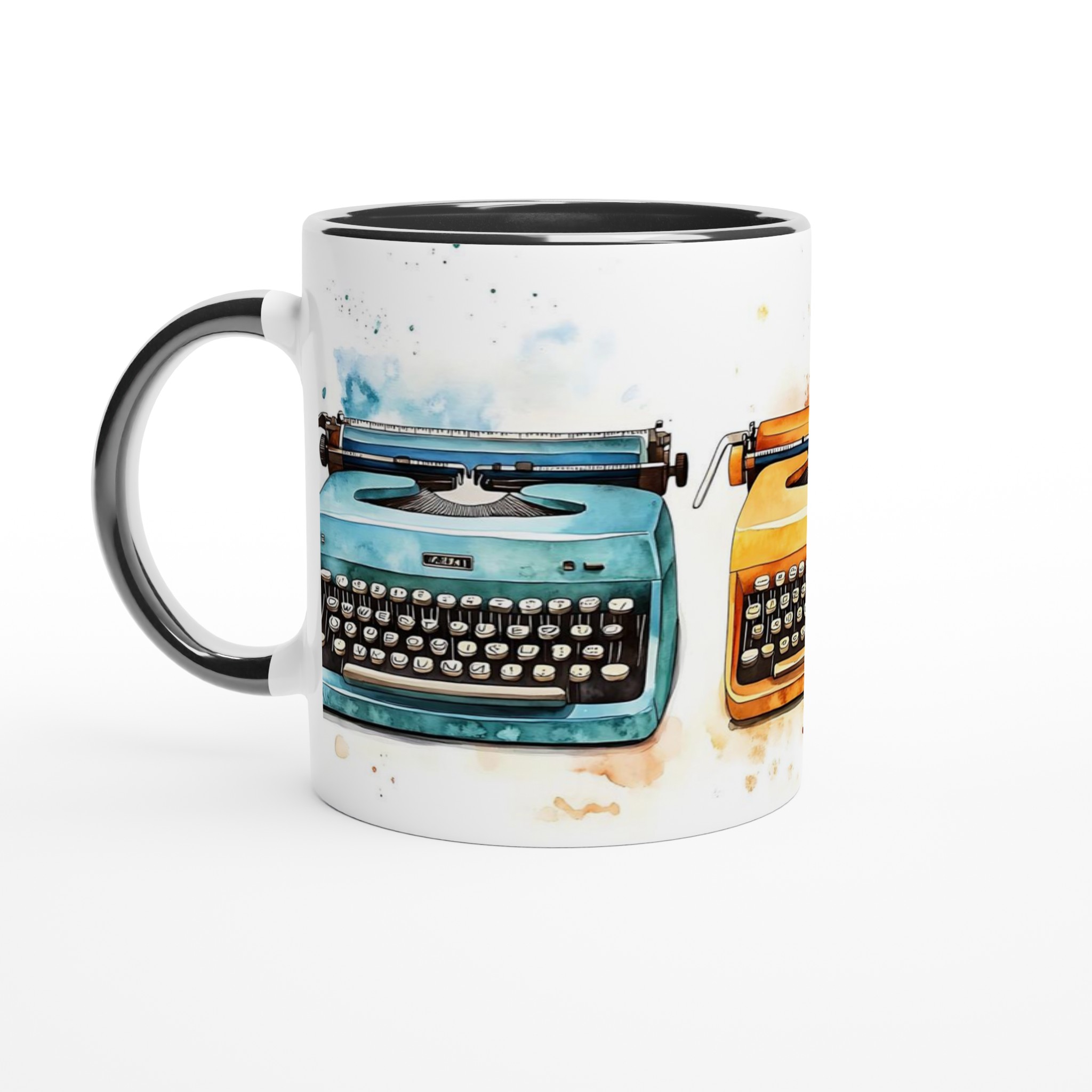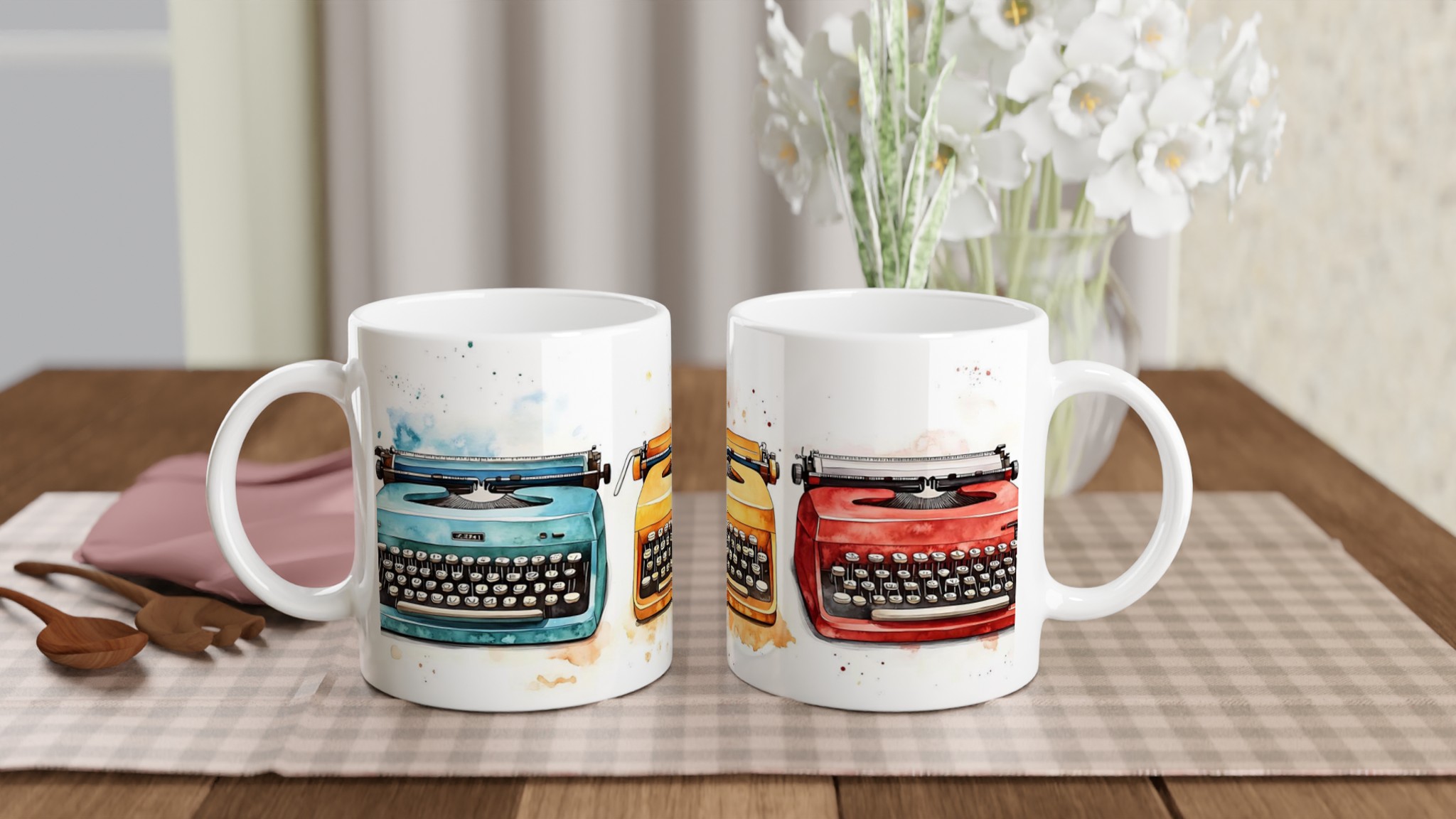 Kliv tillbaka i tiden med en touch av färg med denna charmiga keramiska mugg, som hyllar den klassiska skrivmaskinens tidlösa design. Den här stilrena muggen blir snabbt en vardagsfavorit, perfekt för morgonkaffet, kvällens varma choklad eller när du bara vill njuta av en kopp te. Med sitt unika, akvarellinspirerade tryck av retro skrivmaskiner i livfulla toner blir varje klunk en liten konstupplevelse.