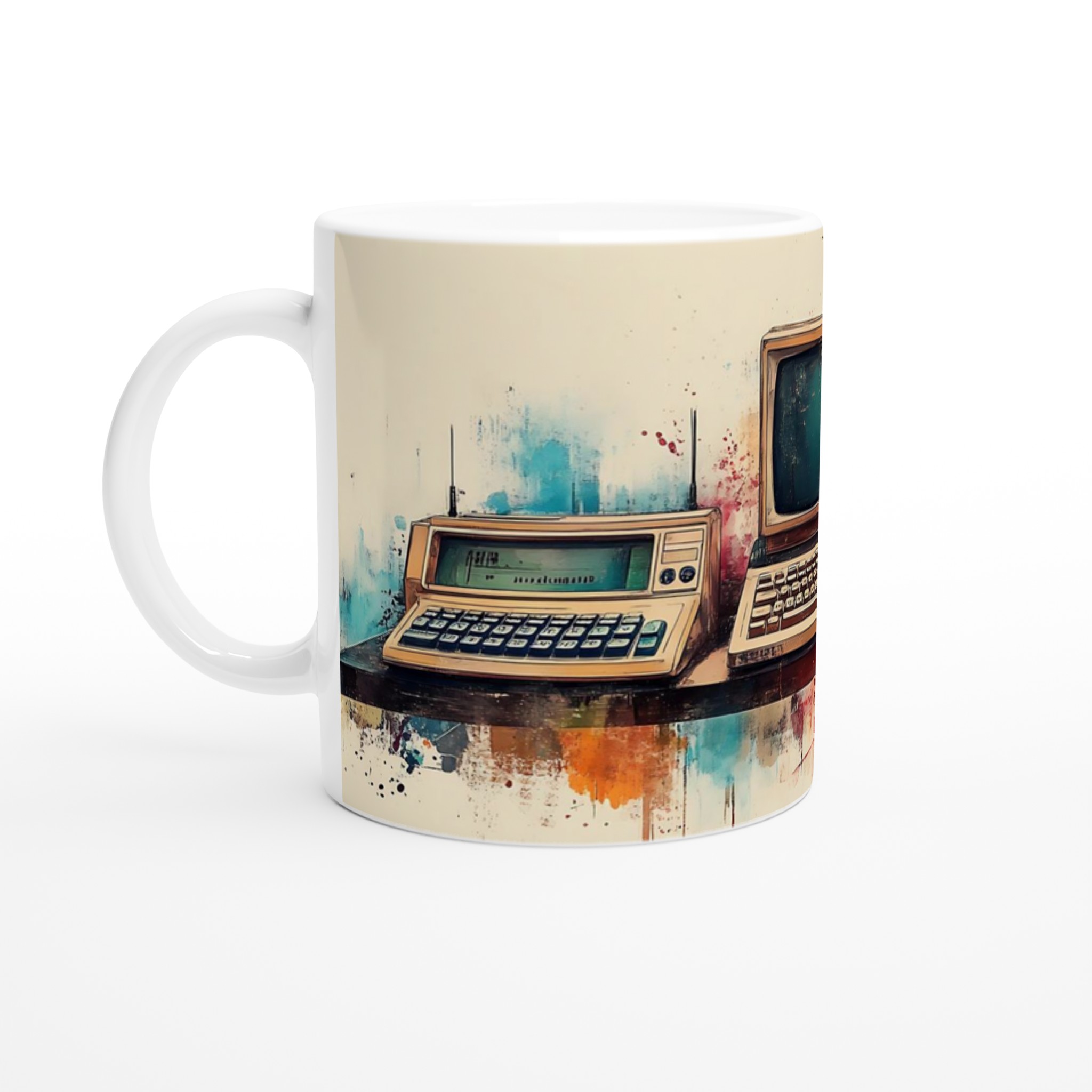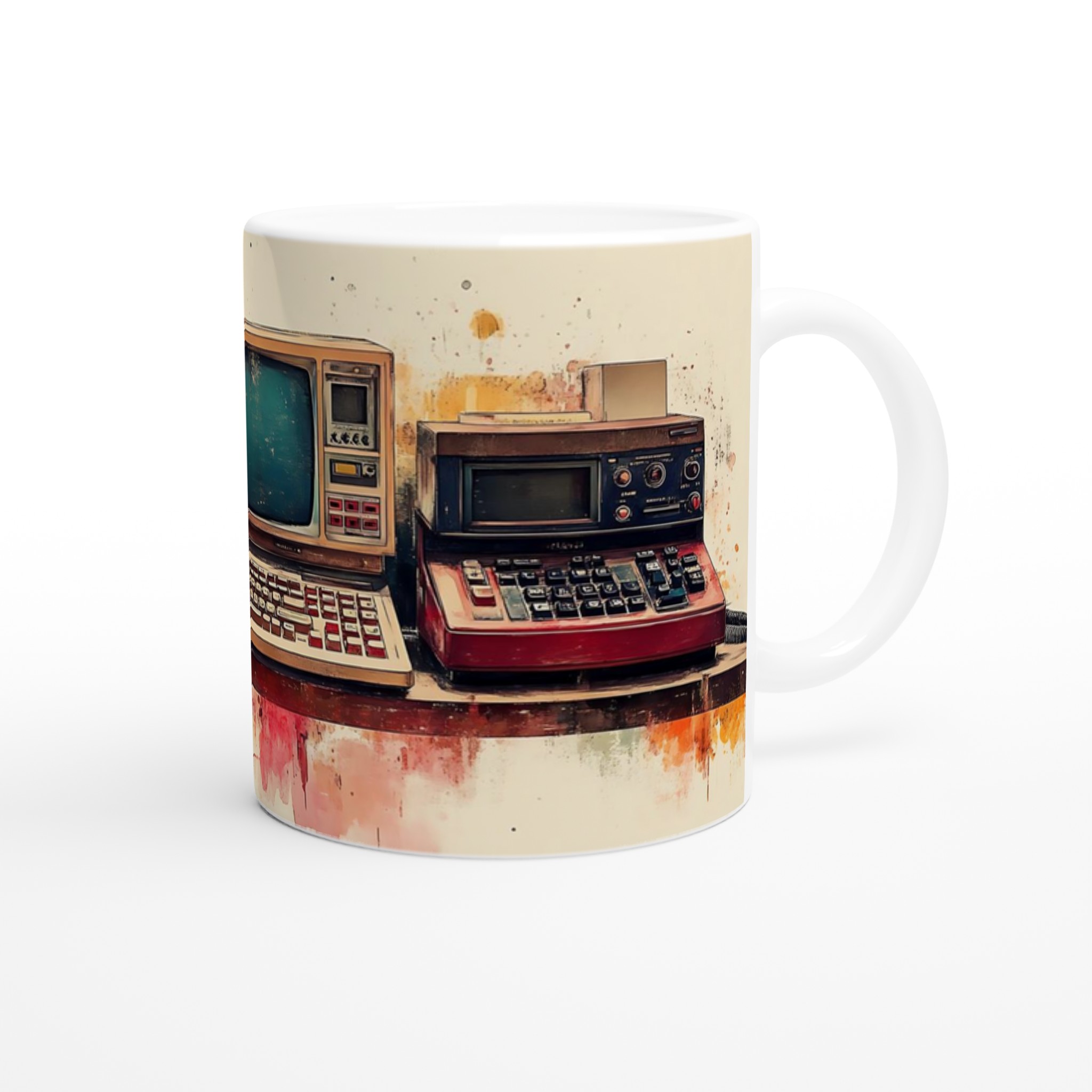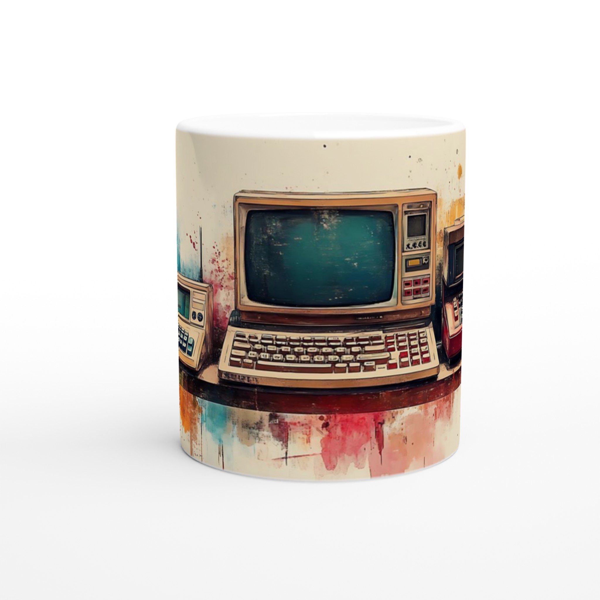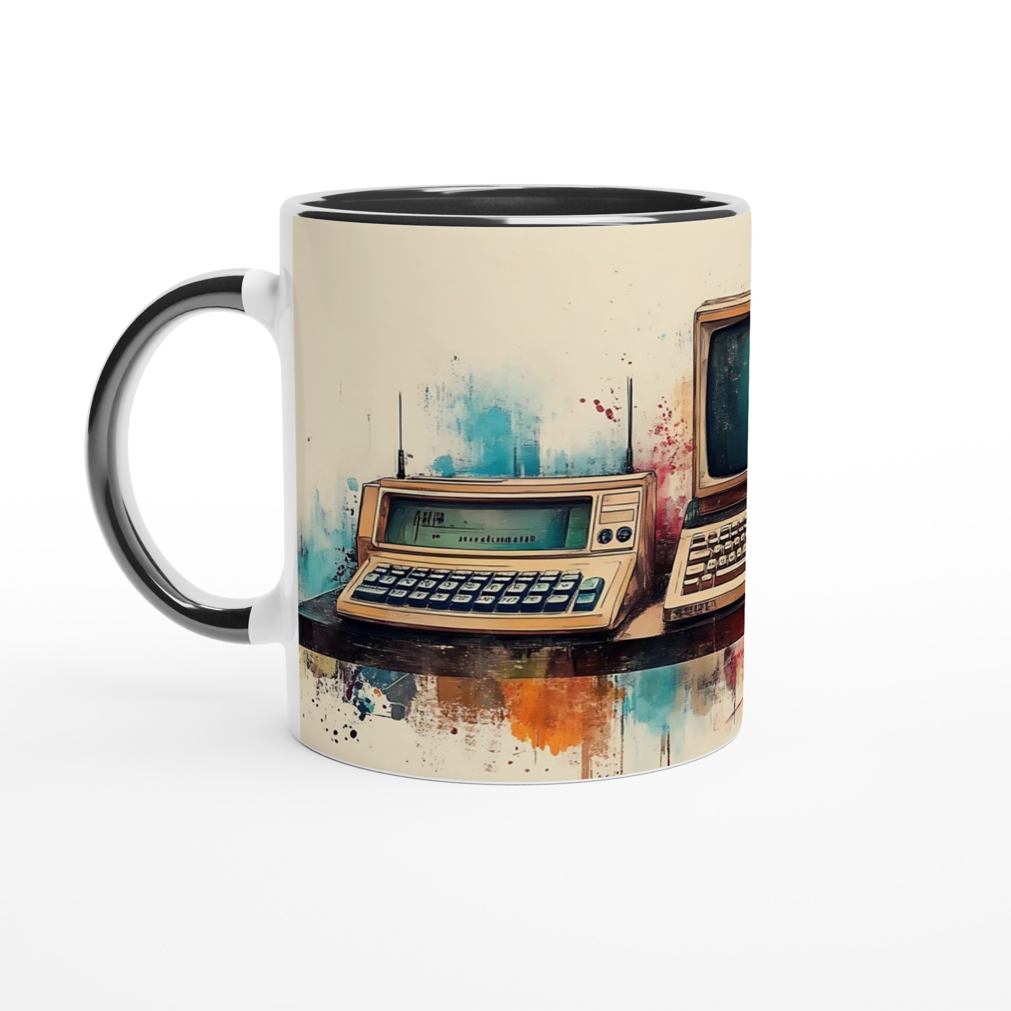 Ta en resa tillbaka i tiden med denna unika keramiska mugg, som fångar den nostalgiska charmen hos retro-teknik i en levande akvarellstil. Perfekt för morgonkaffet, kvällens varma choklad eller när du bara vill njuta av en kopp te medan du drömmer dig bort till svunna tider.