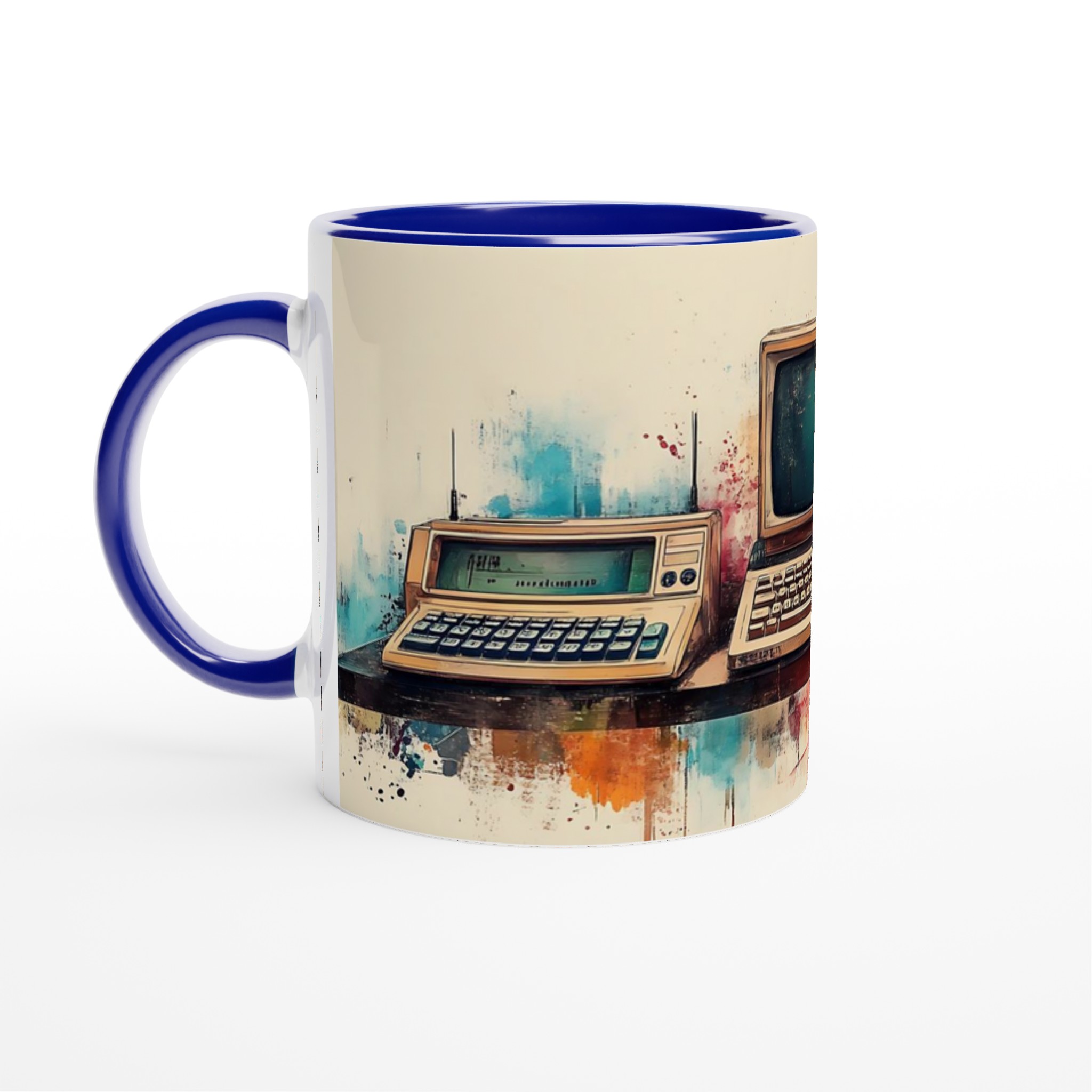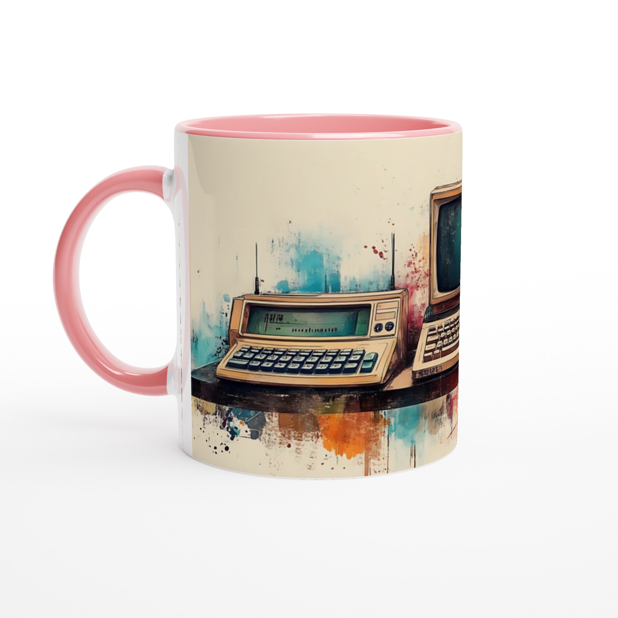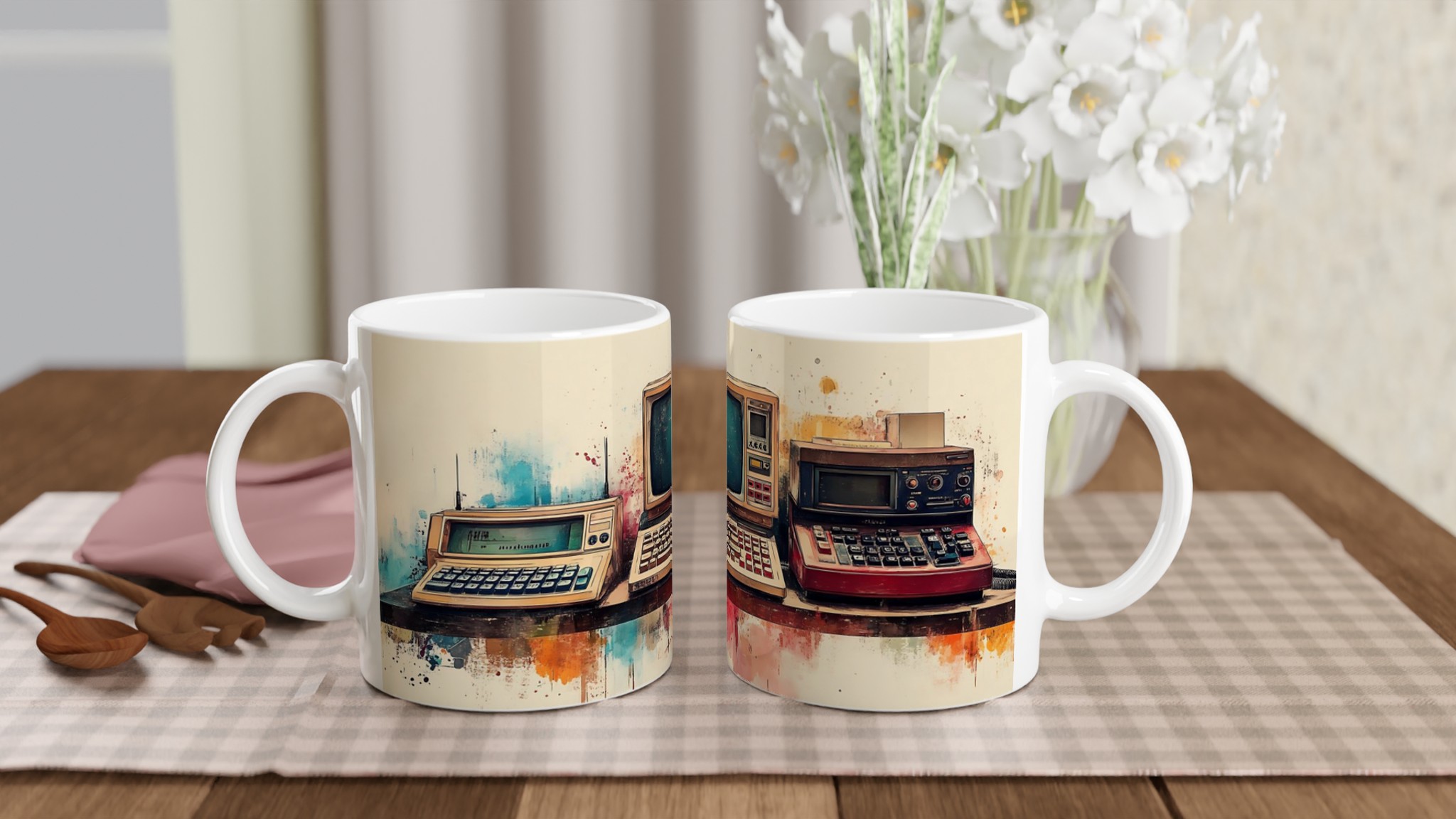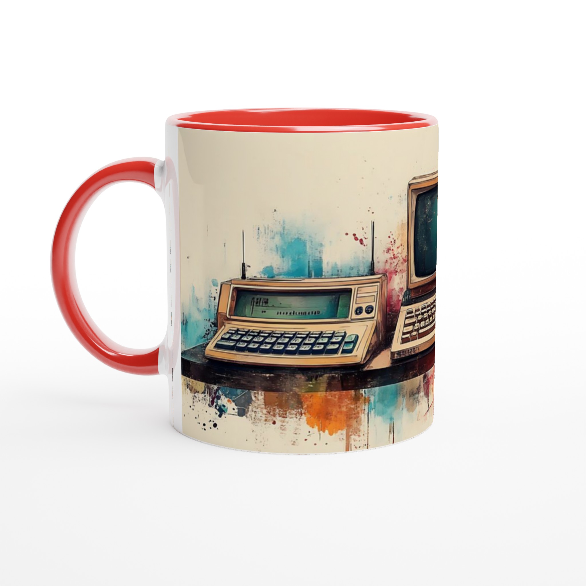 Ta en resa tillbaka i tiden med denna unika keramiska mugg, som fångar den nostalgiska charmen hos retro-teknik i en levande akvarellstil. Perfekt för morgonkaffet, kvällens varma choklad eller när du bara vill njuta av en kopp te medan du drömmer dig bort till svunna tider.