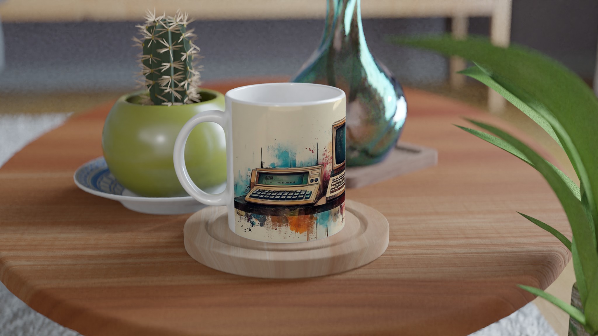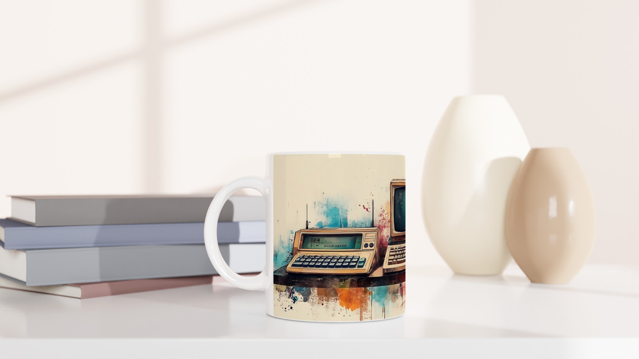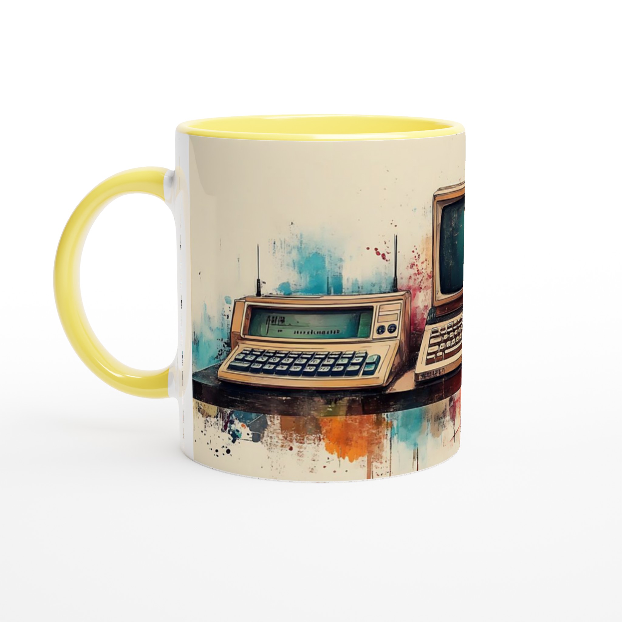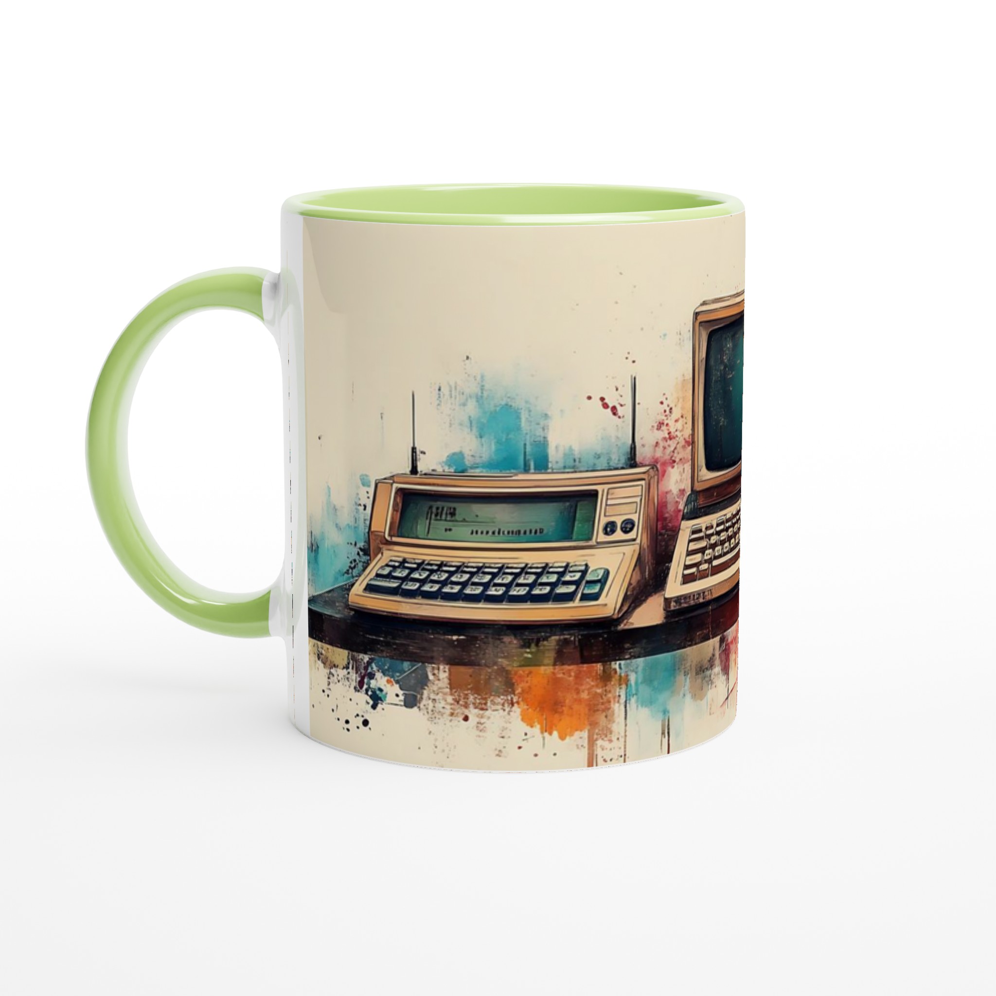 Ta en resa tillbaka i tiden med denna unika keramiska mugg, som fångar den nostalgiska charmen hos retro-teknik i en levande akvarellstil. Perfekt för morgonkaffet, kvällens varma choklad eller när du bara vill njuta av en kopp te medan du drömmer dig bort till svunna tider.