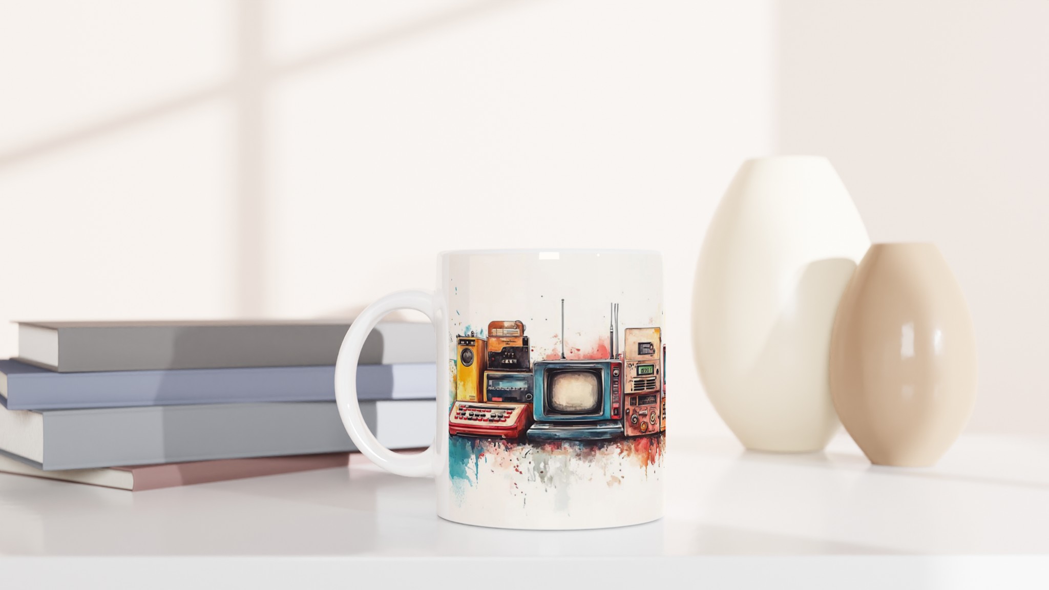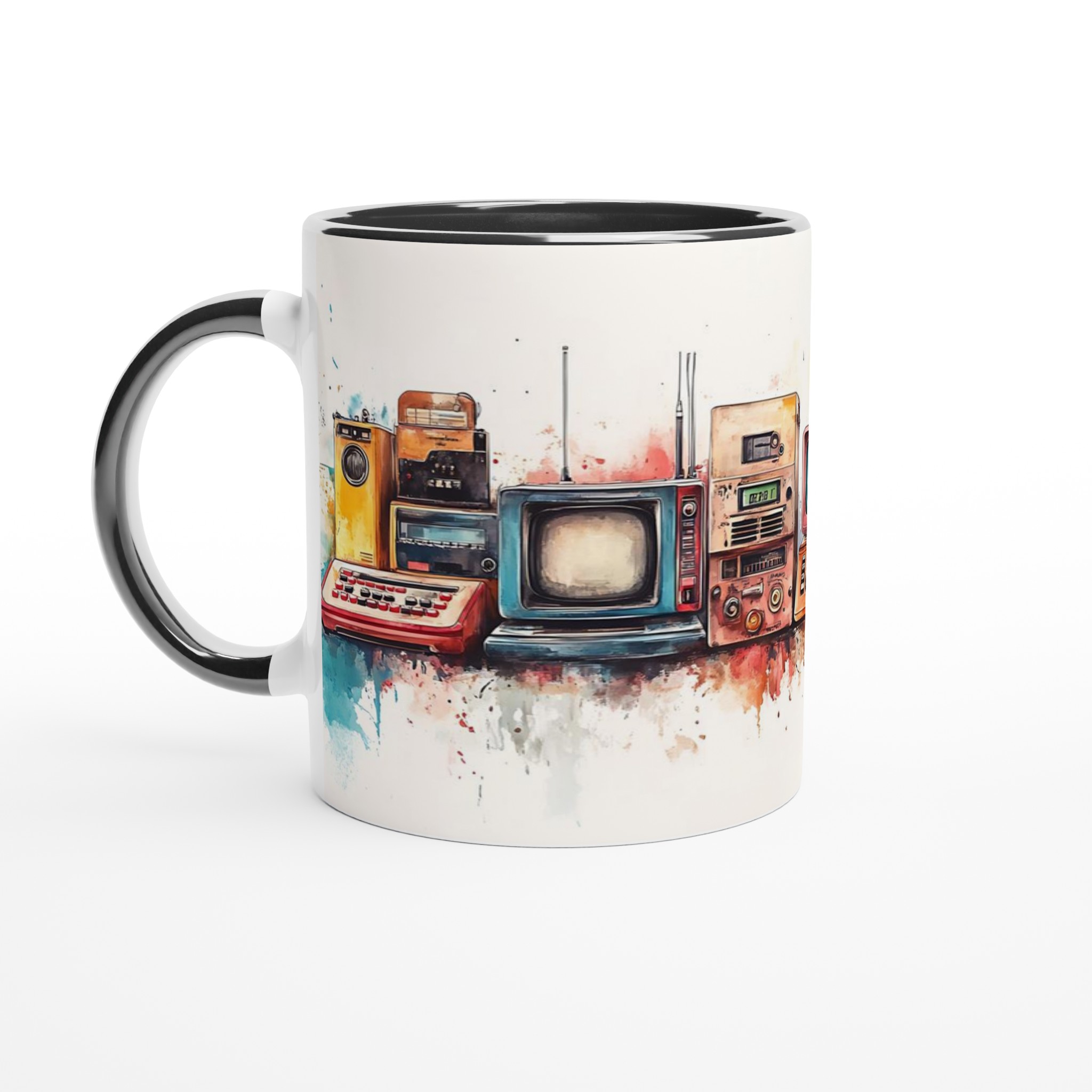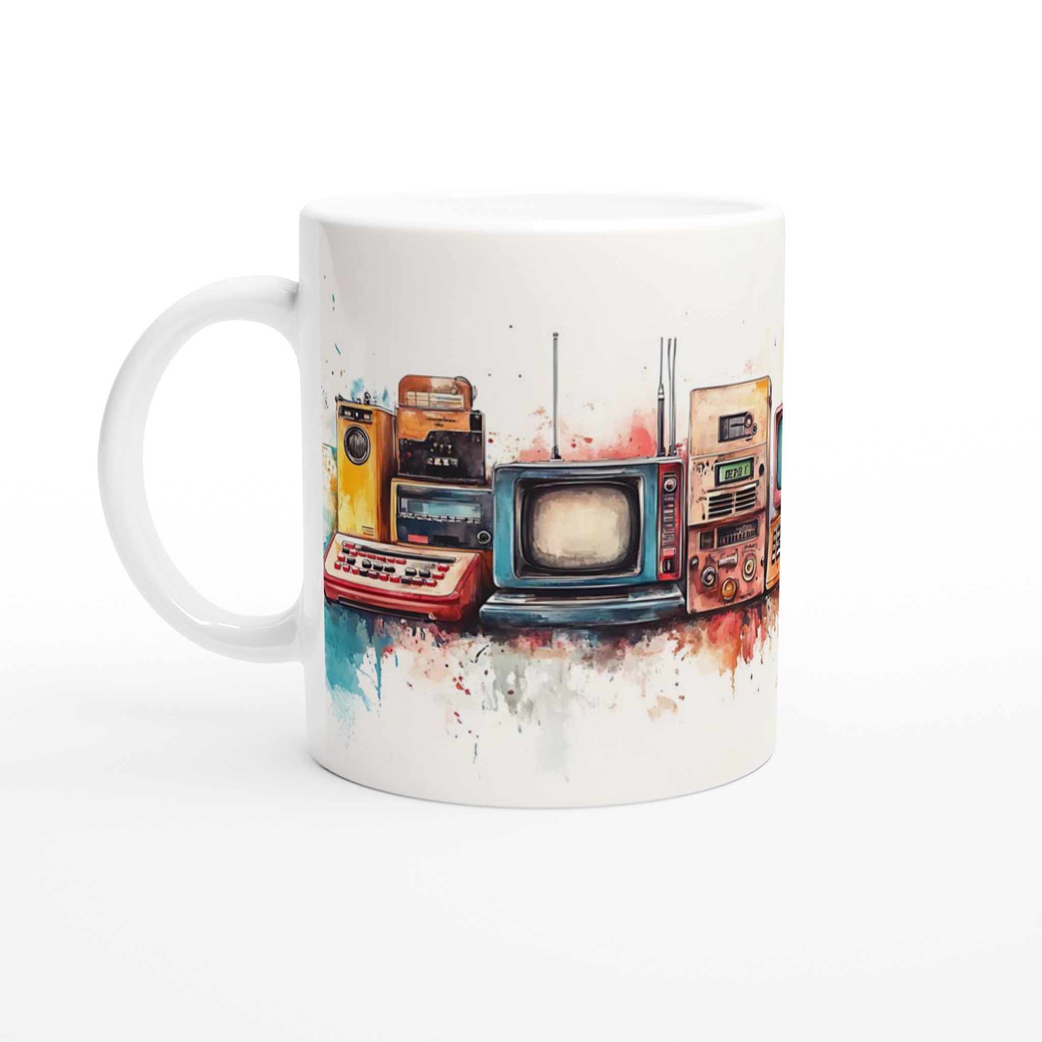 Ta en resa tillbaka i tiden med vår ”Retro Tech Chic” keramiska mugg! Denna mugg fångar den lekfulla charmen från vintage elektronik med en modern, konstnärlig twist. Tänk dig att starta dagen med en kopp kaffe i denna unika mugg, där trycket av klassiska apparater i varma, akvarellinspirerade toner möter den blanka, rena ytan. Det är en perfekt konversationsstartare och en hyllning till design från förr.